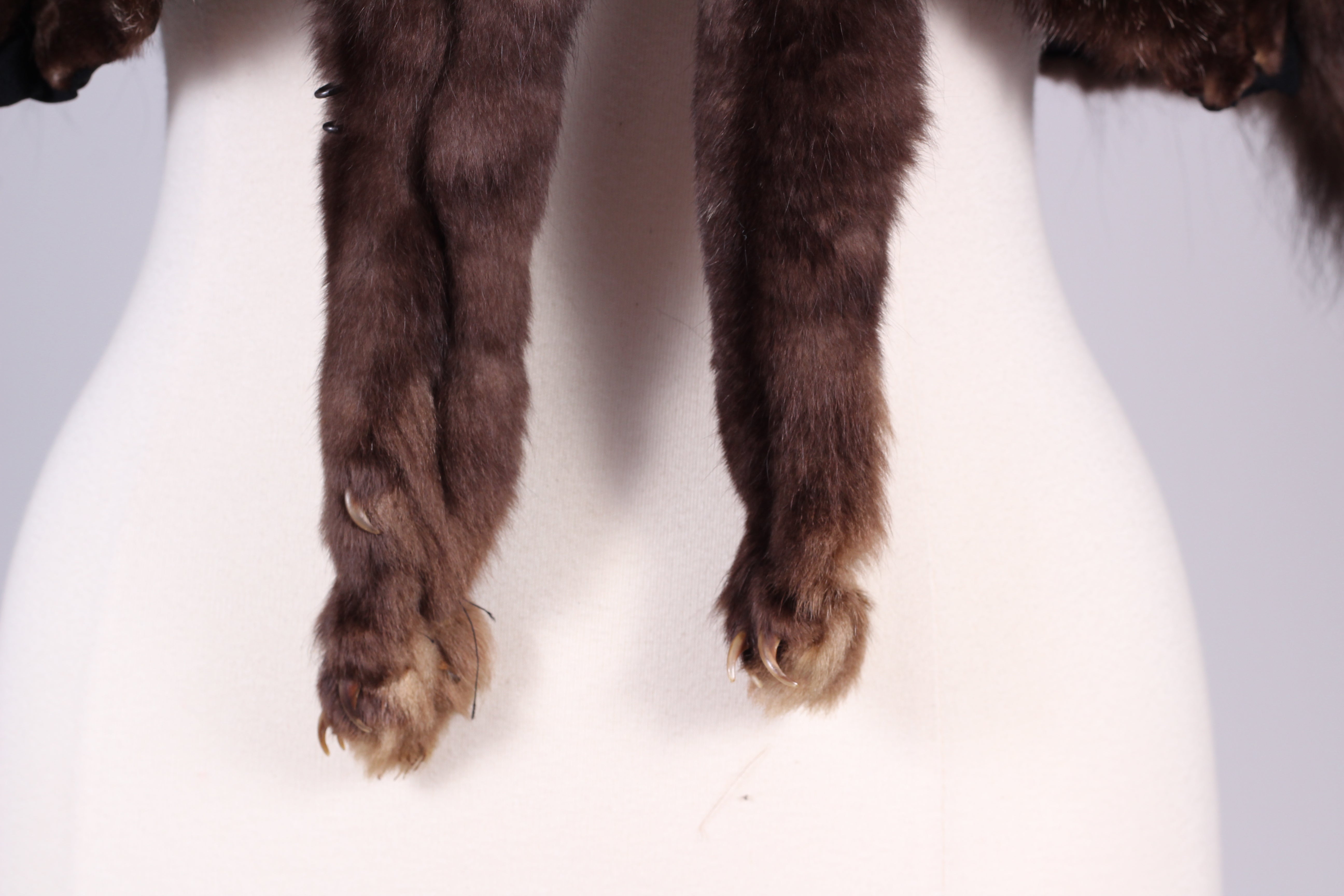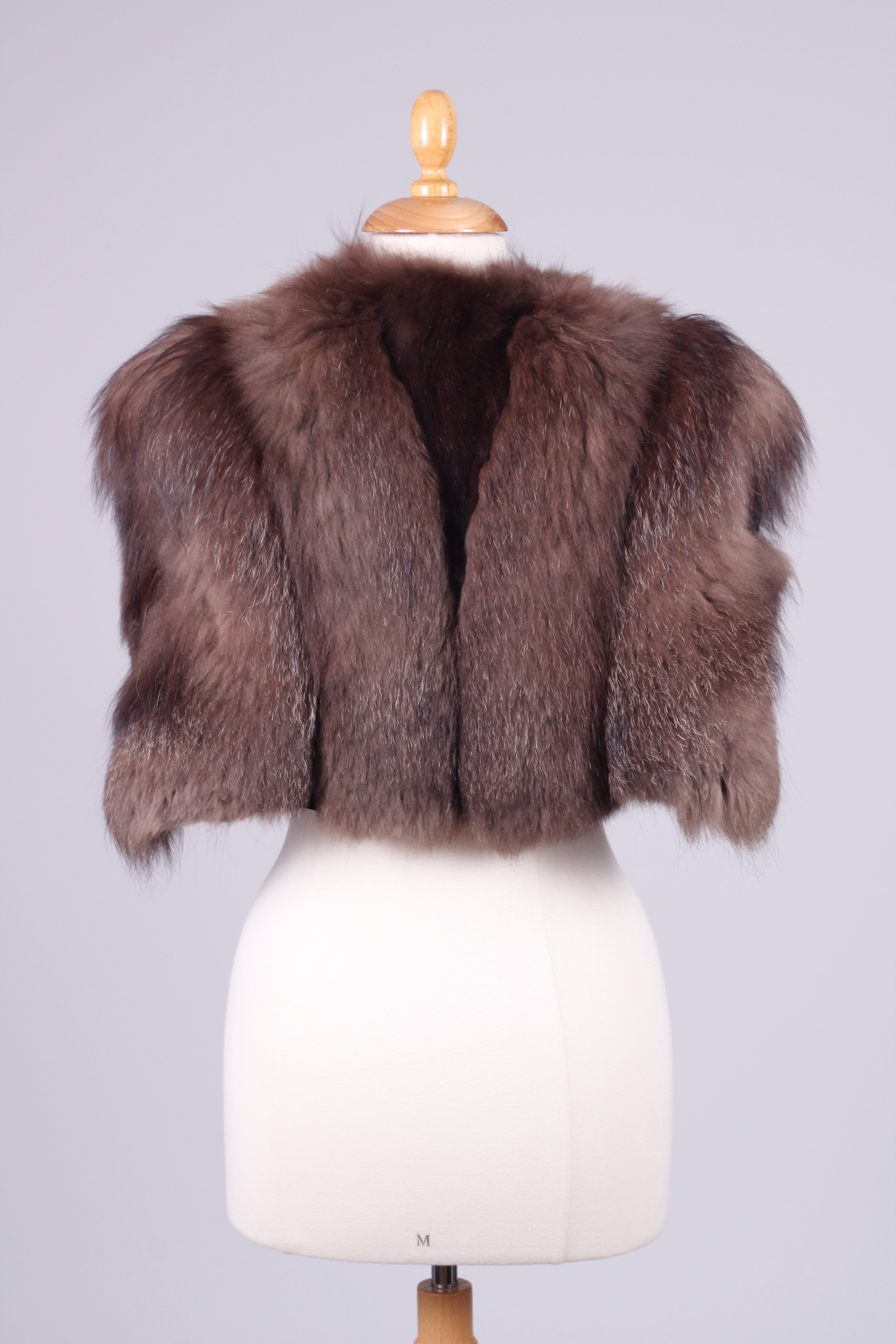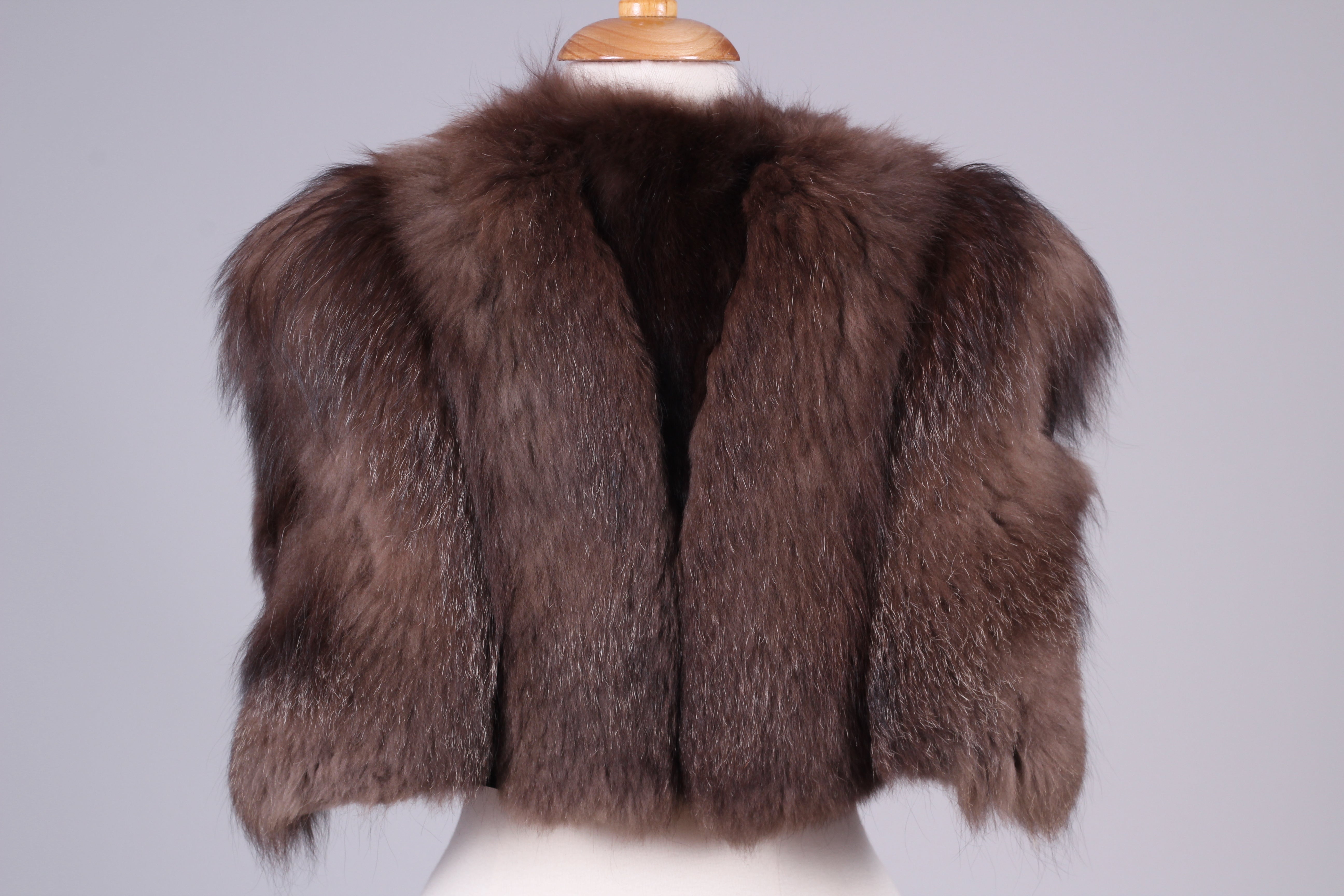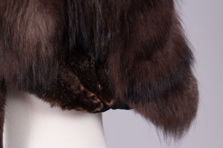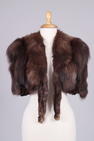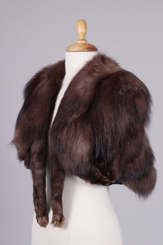 Smuk brun vintage pelscape fra 1940'erne i sølvræv. Capen har foer af silke og to ben med poter fortil. Typisk for 1940'erne med brede skuldre.
