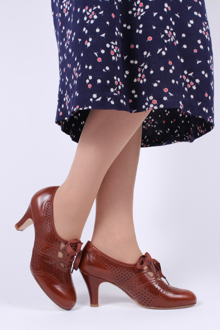 Skoene er lavet af læder i høj kvalitet og har spanske hæle, der giver et stilfuldt løft. Snørebåndene i grosgrain bånd giver et flot, vintage look.