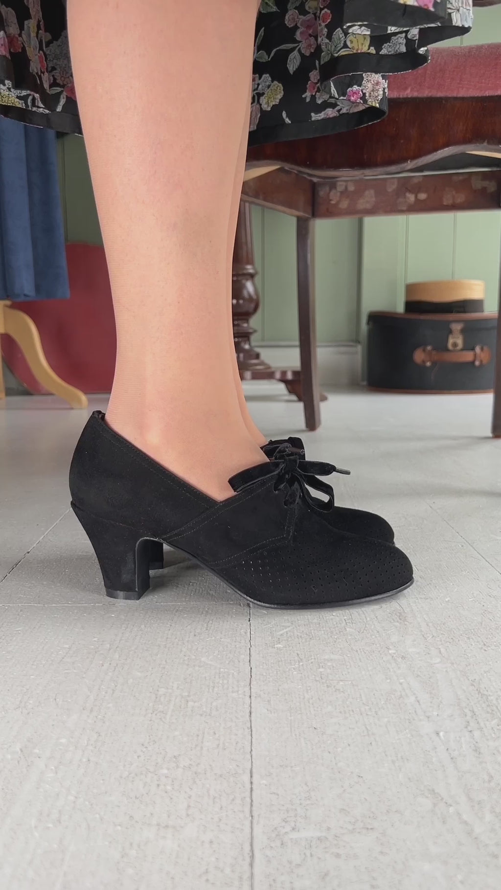 Esther er en stilfuld pumps med snøre, inspireret af mode fra 1940’erne og begyndelsen af 1950’erne. Skoene er lavet i blødt ruskind med fine, perforerede detaljer og elegante veloursnørebånd.