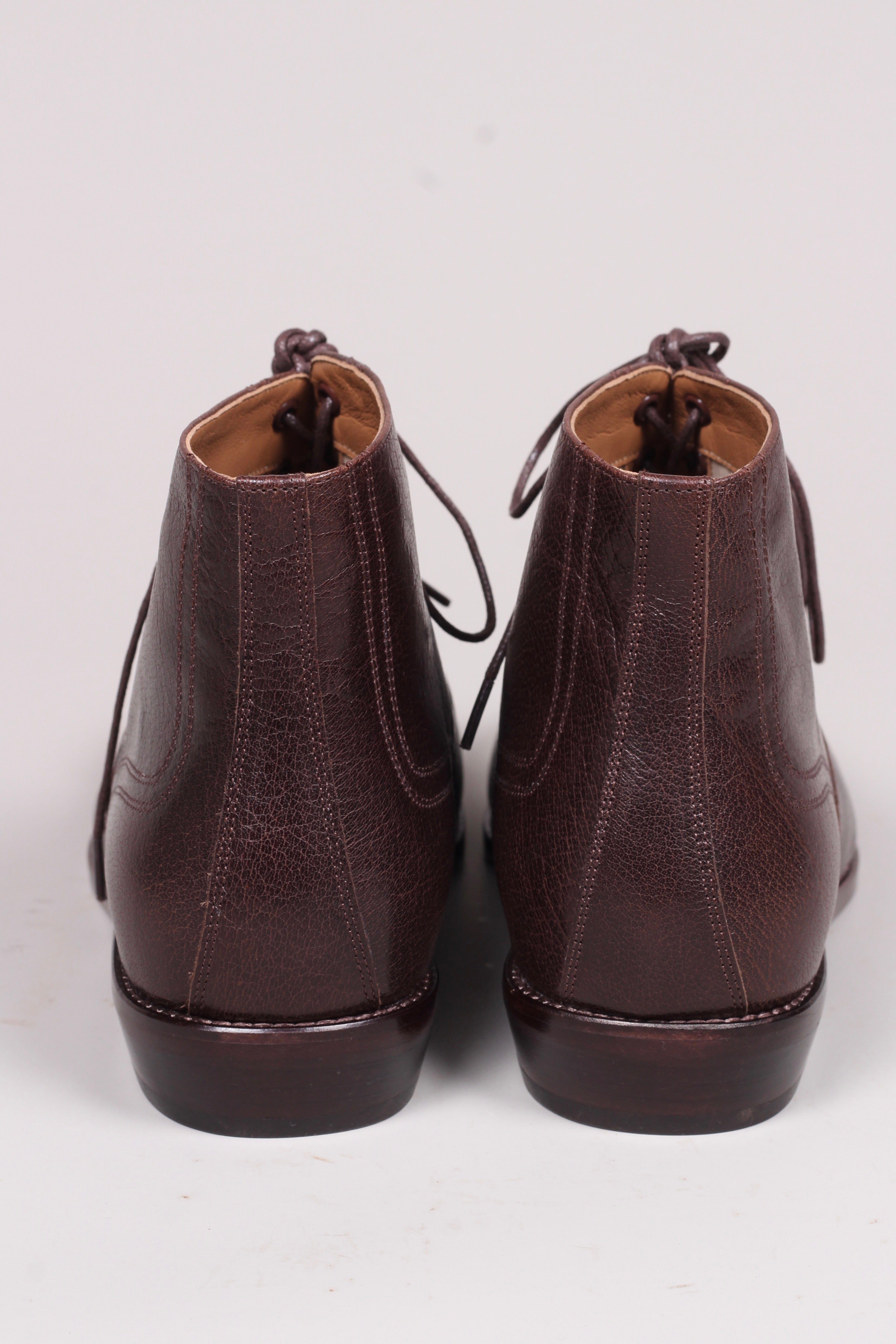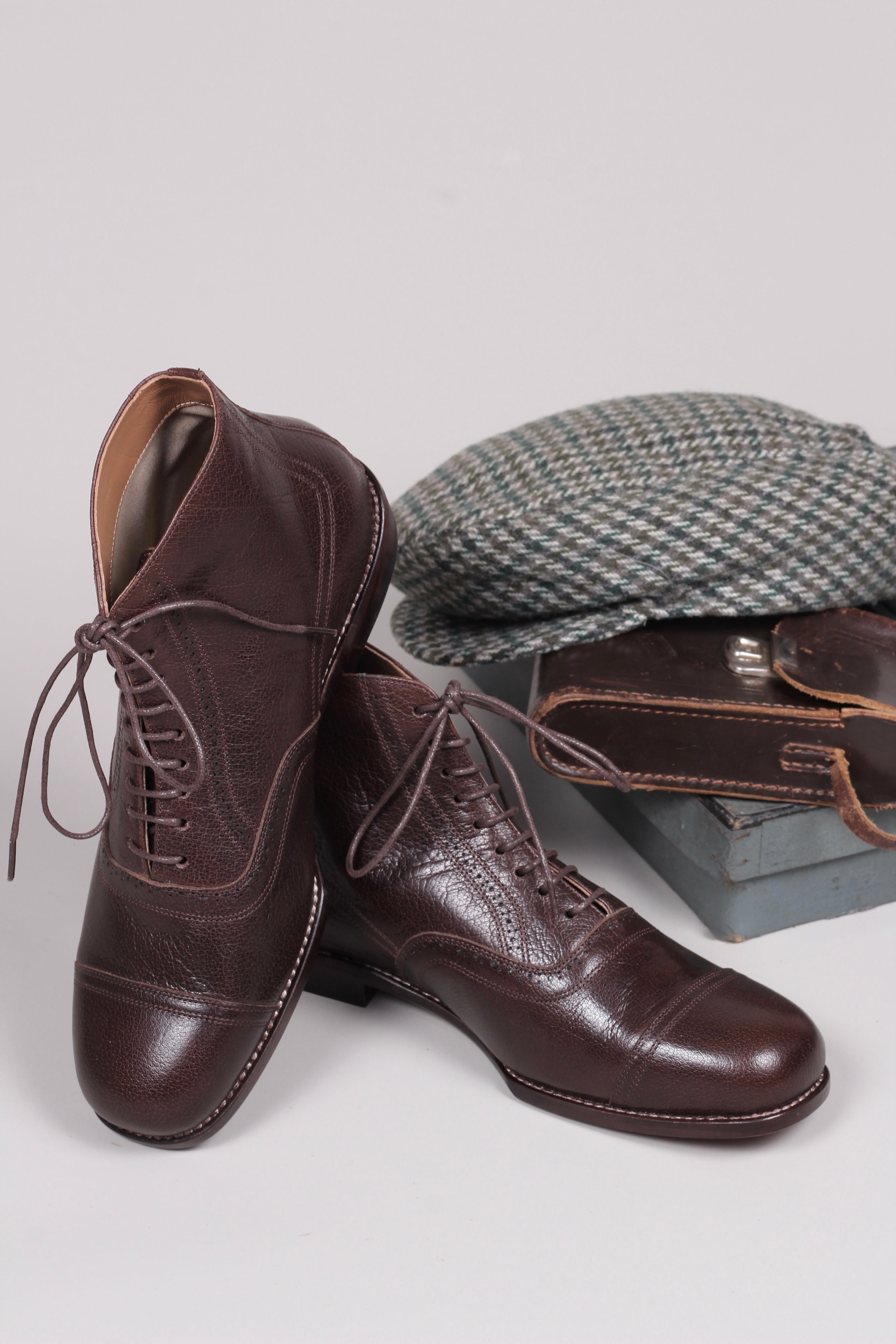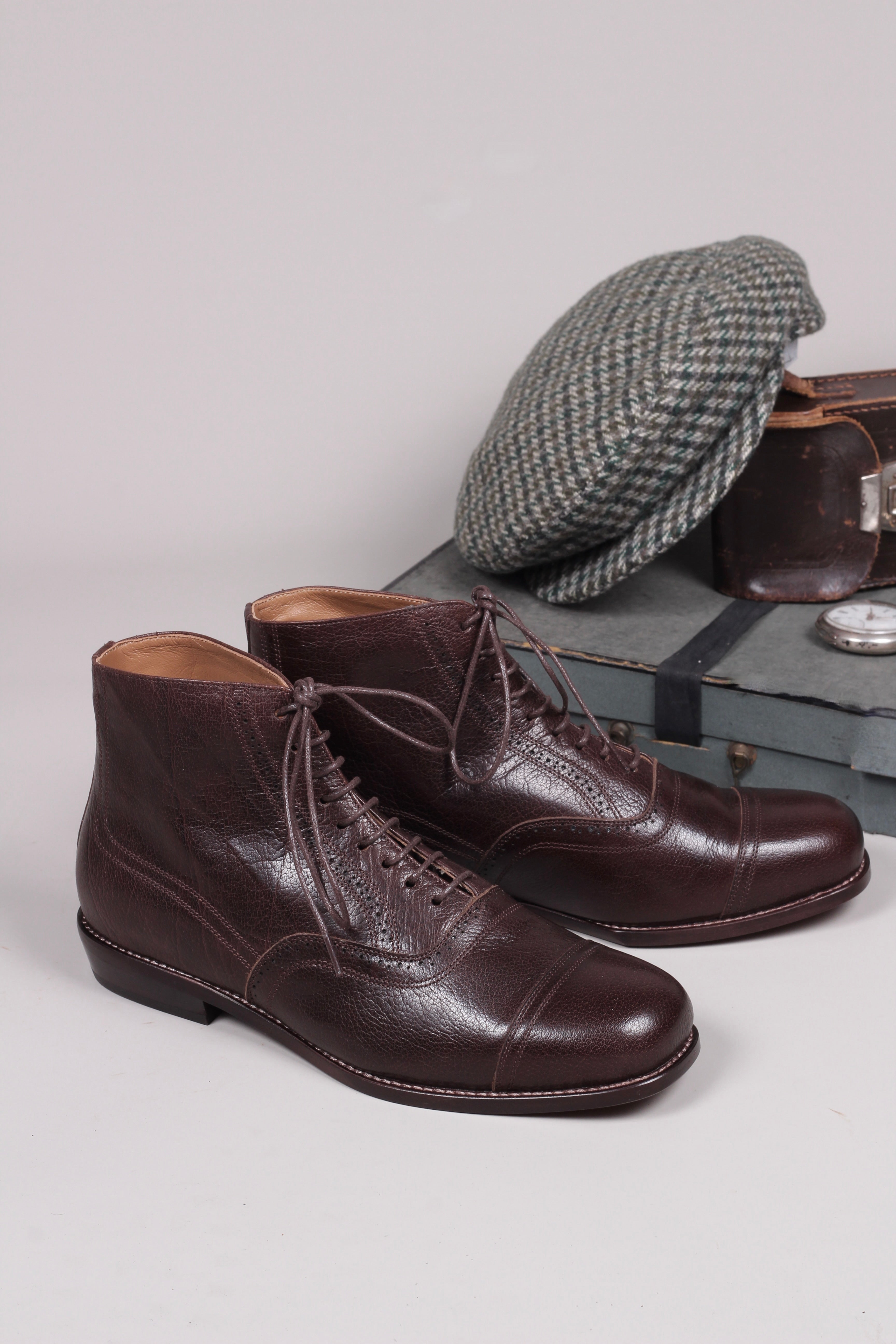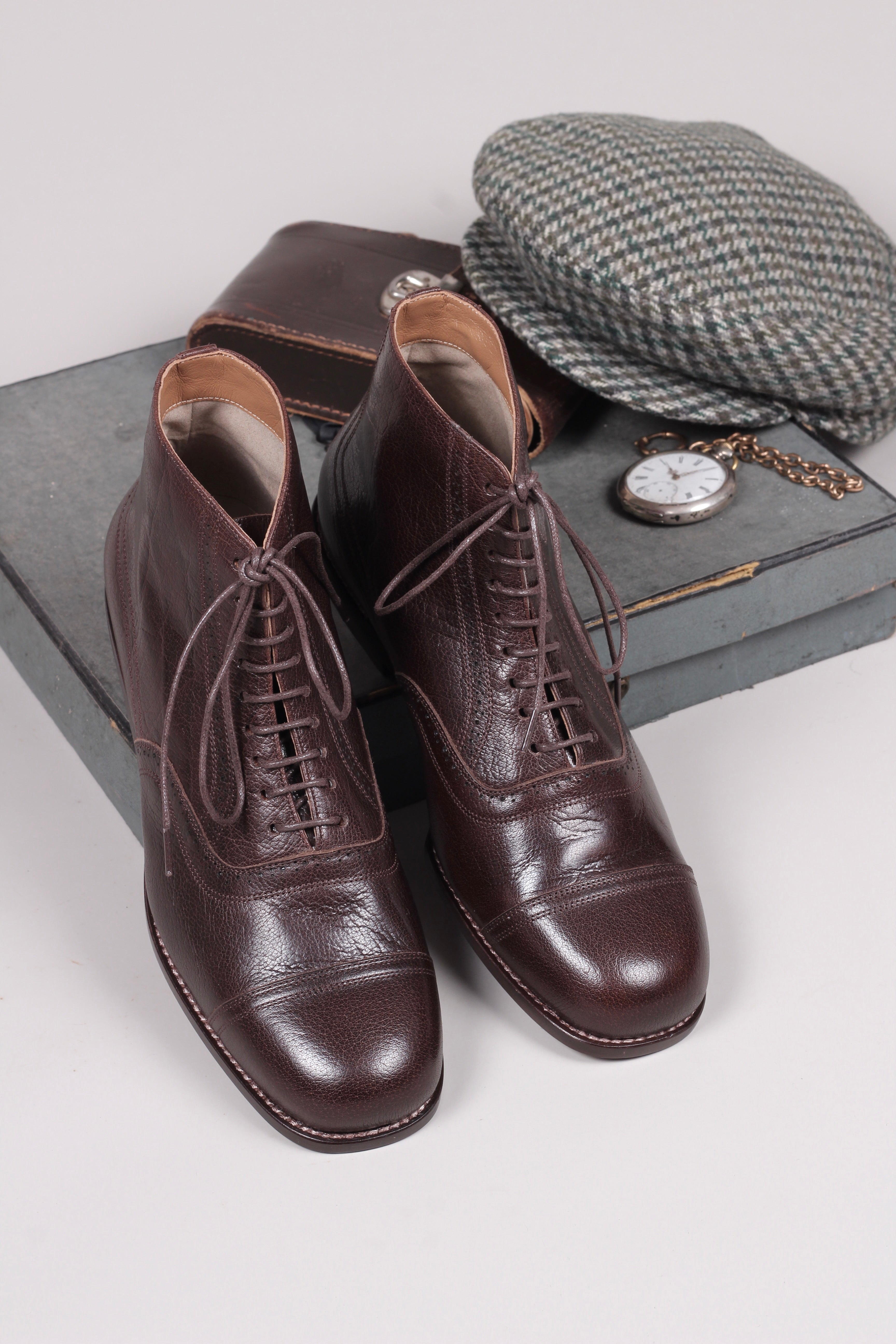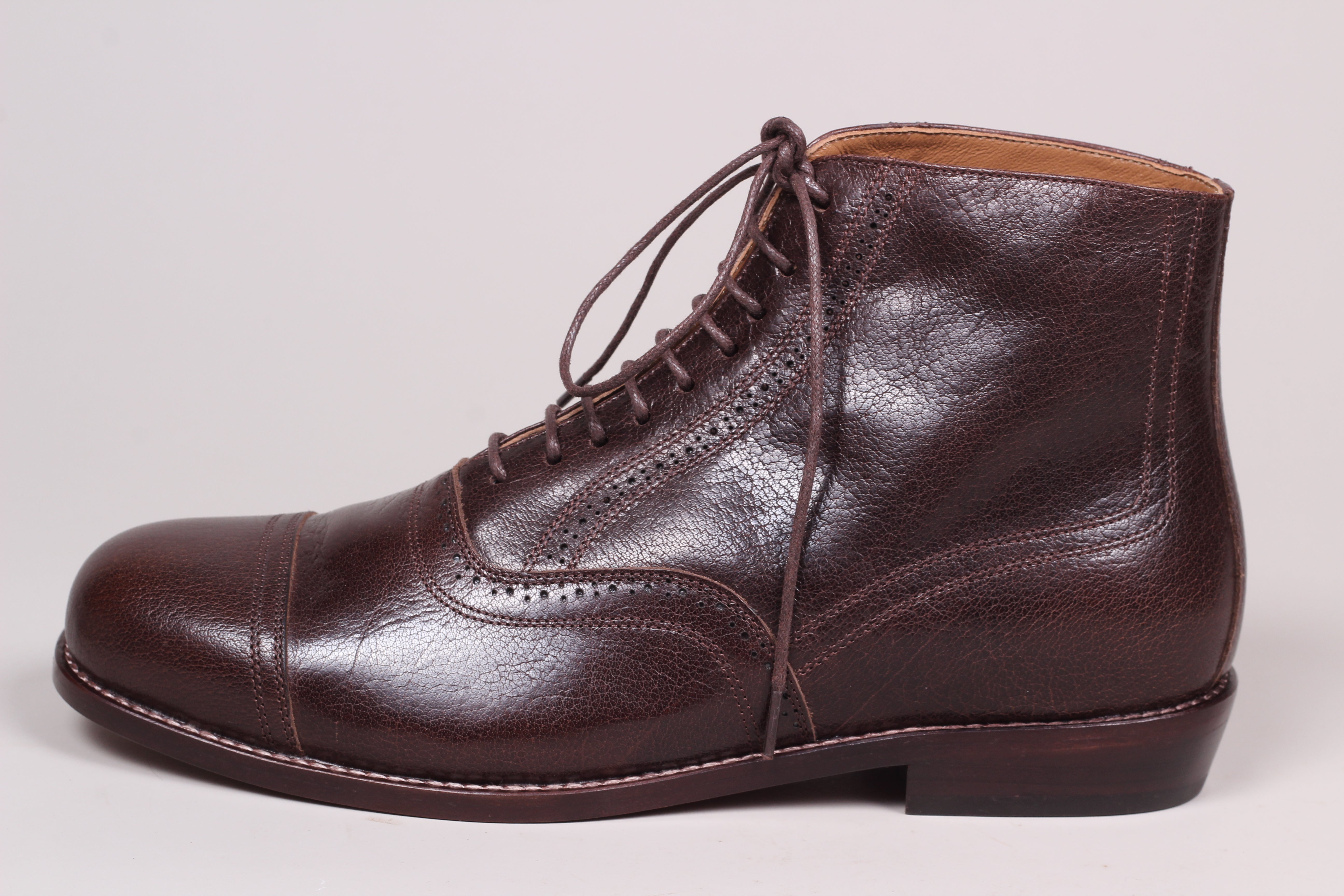 Flot, klassisk herre ankel snørestøvler med lædersål og hulmønster inspireret af perioden 1920’erne til beg. af 1930’erne.