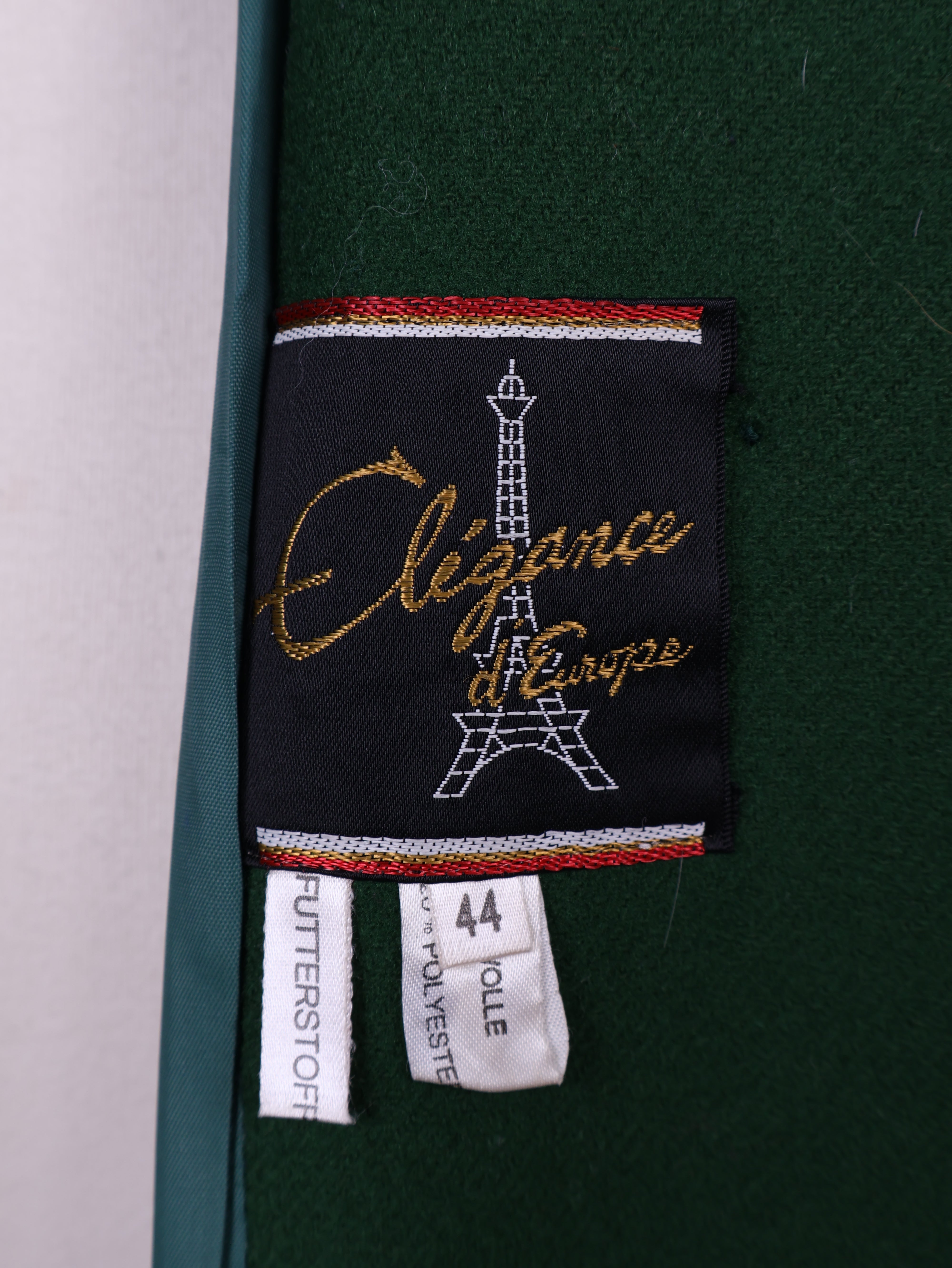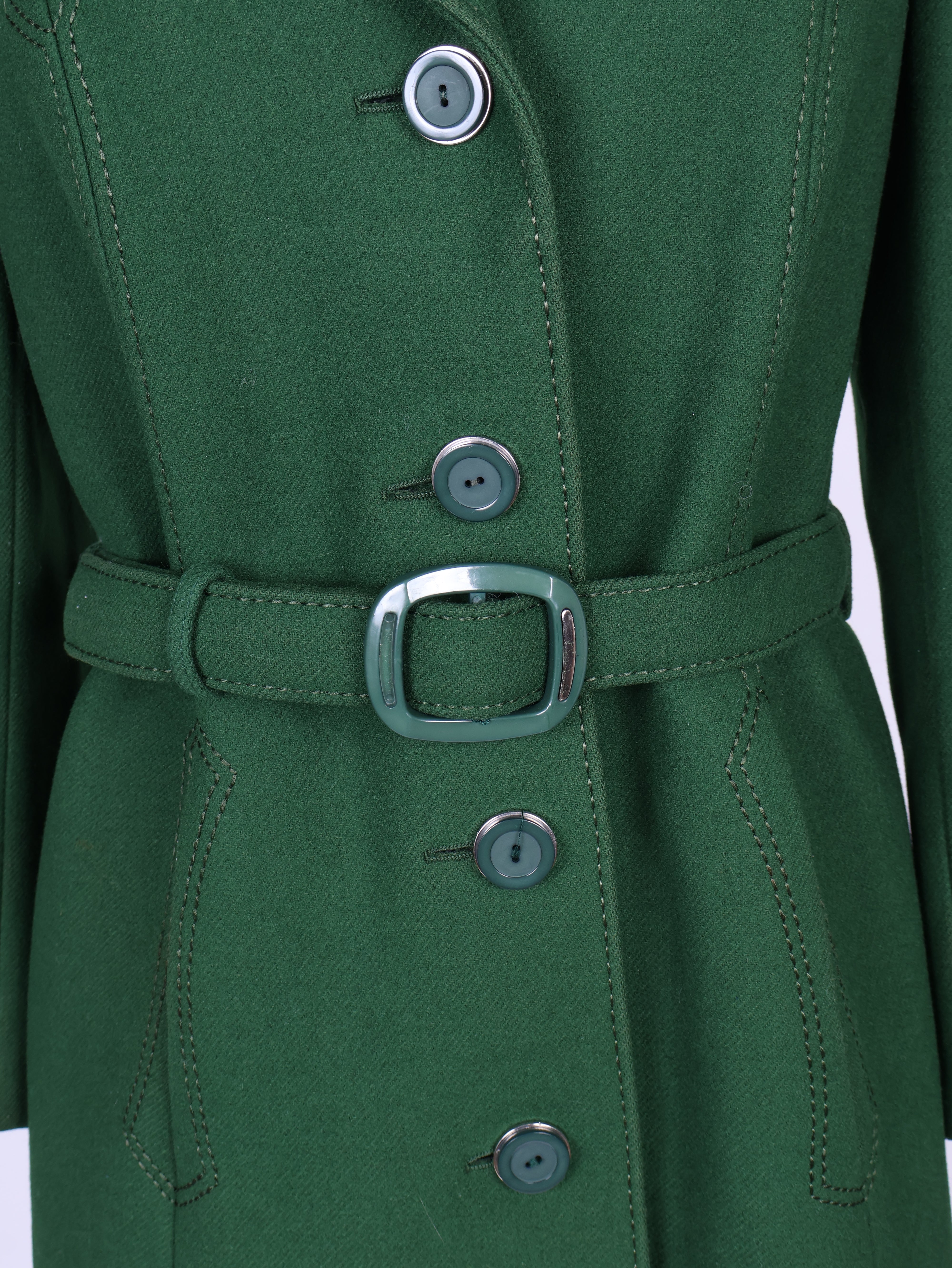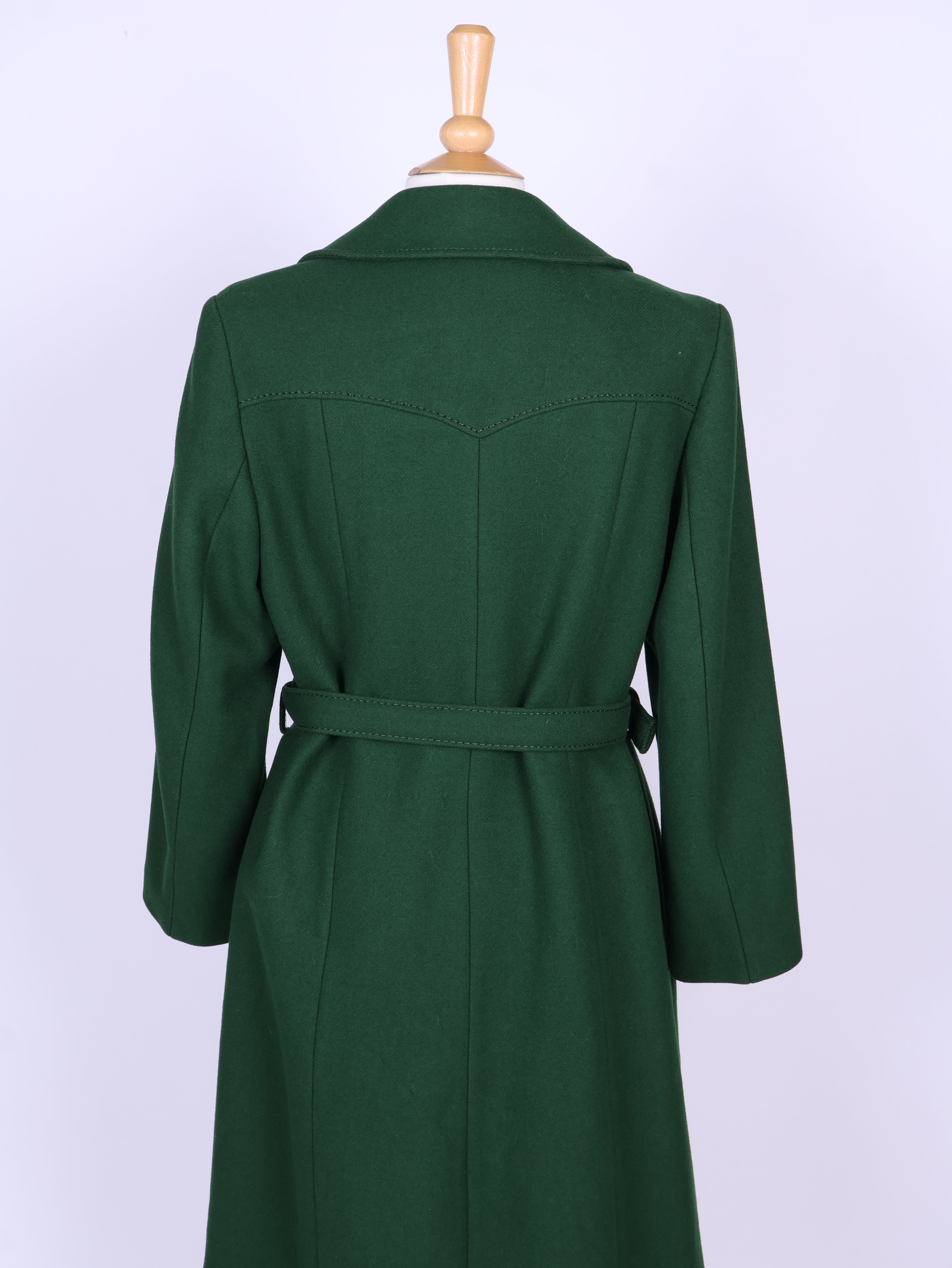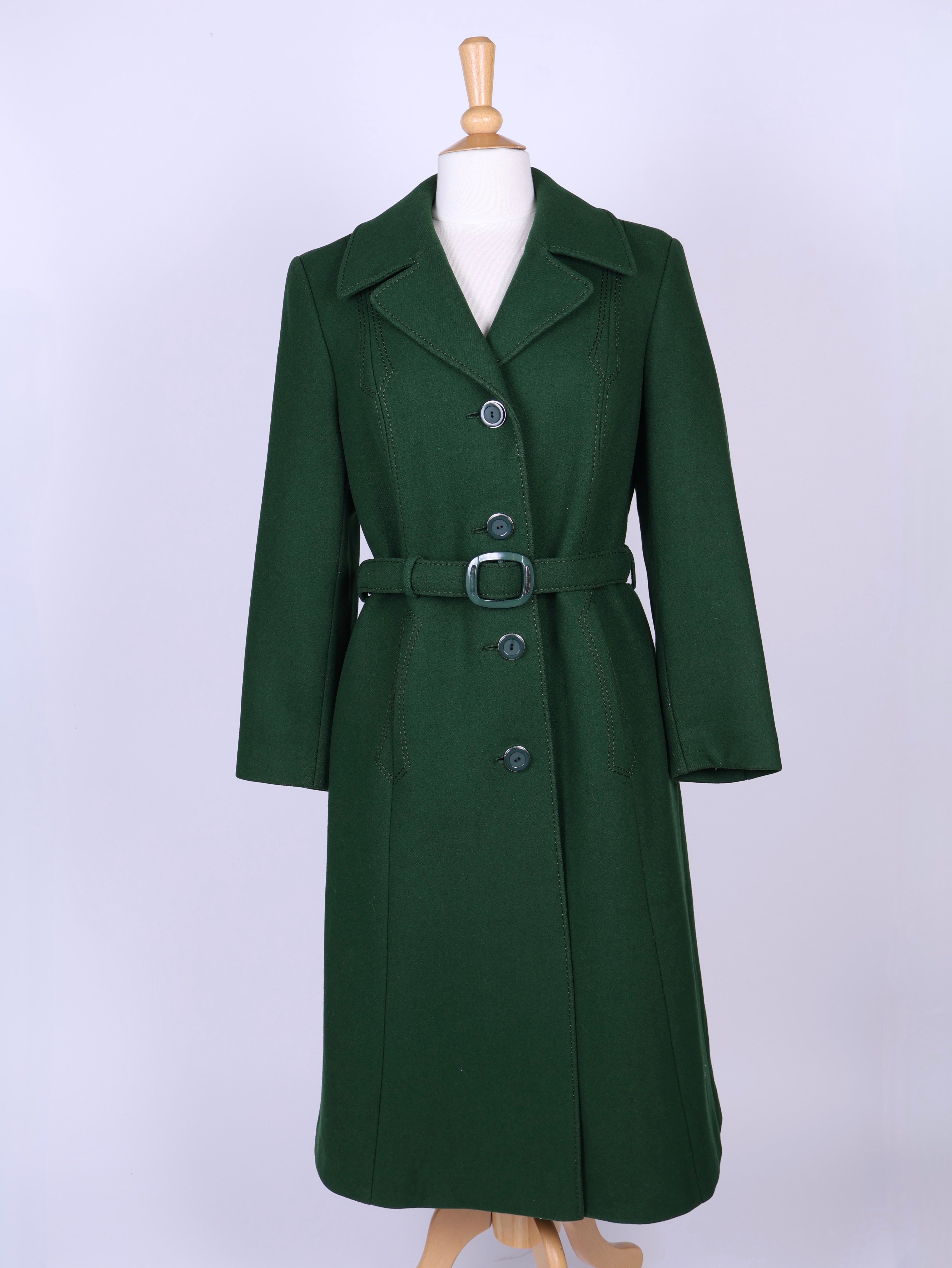 Flot vintage frakke fra 1970'erne syet i grønt uldstof. Frakken er med bælte og flotte knapper. Der er foer indvendig.