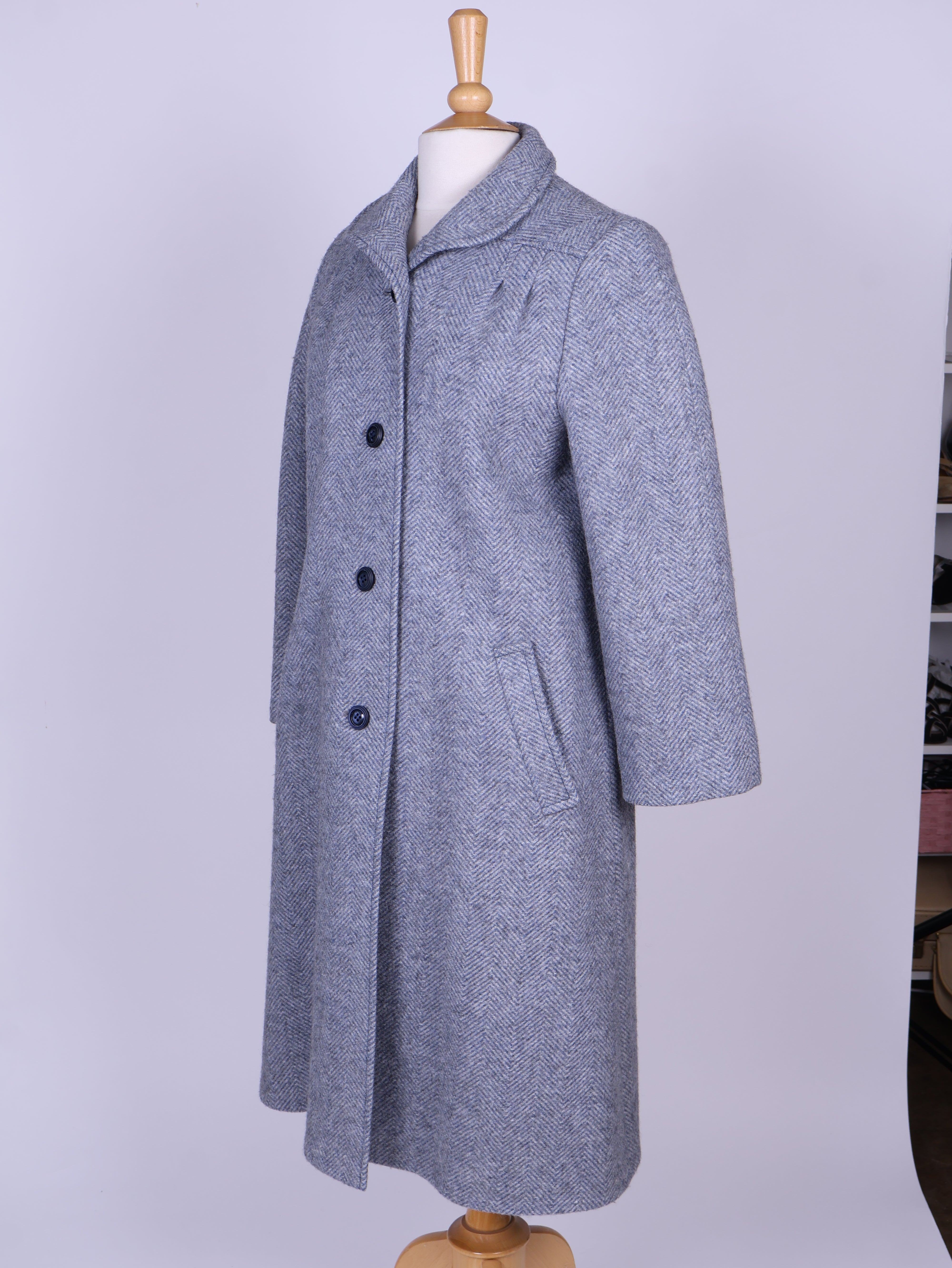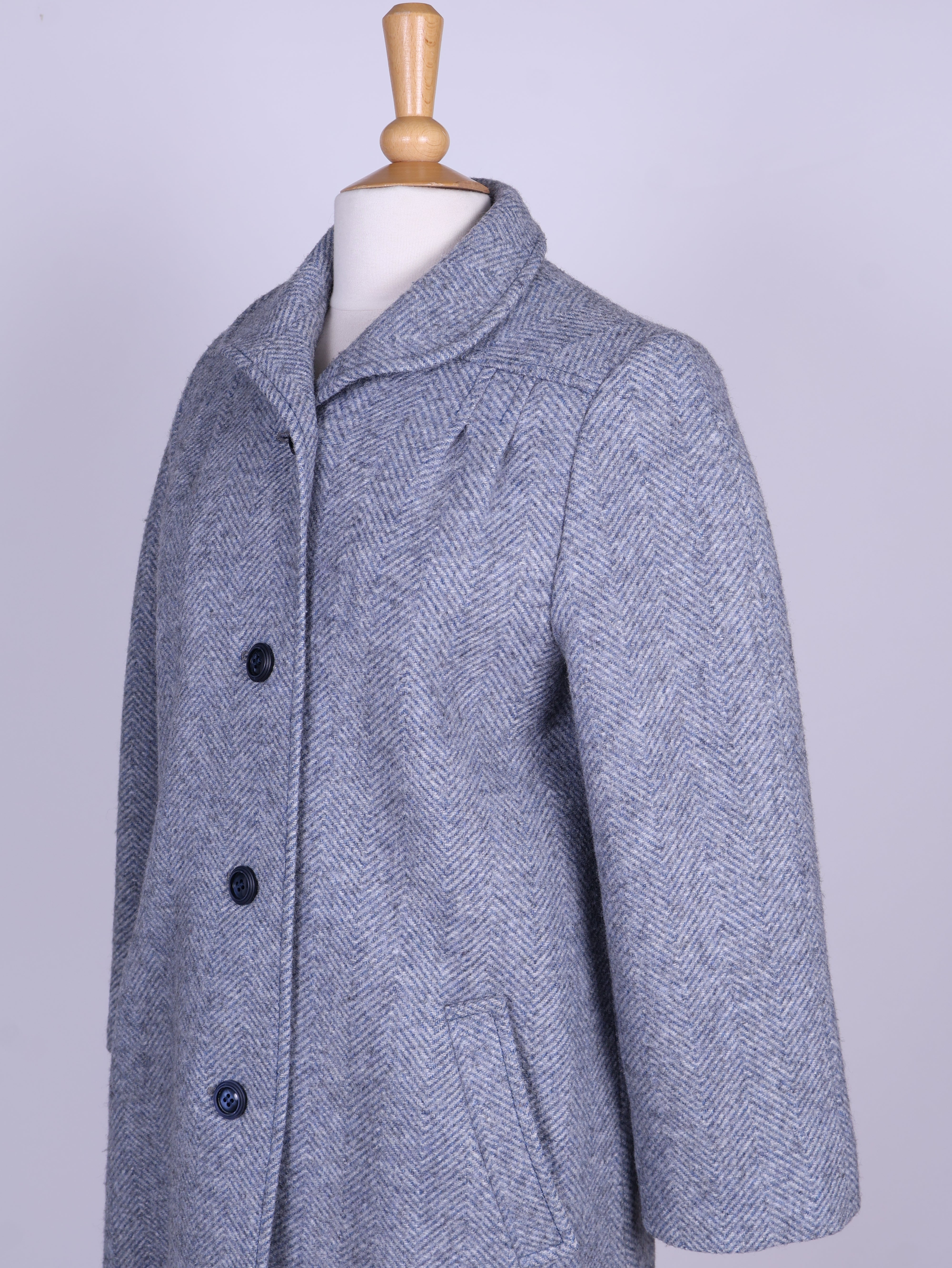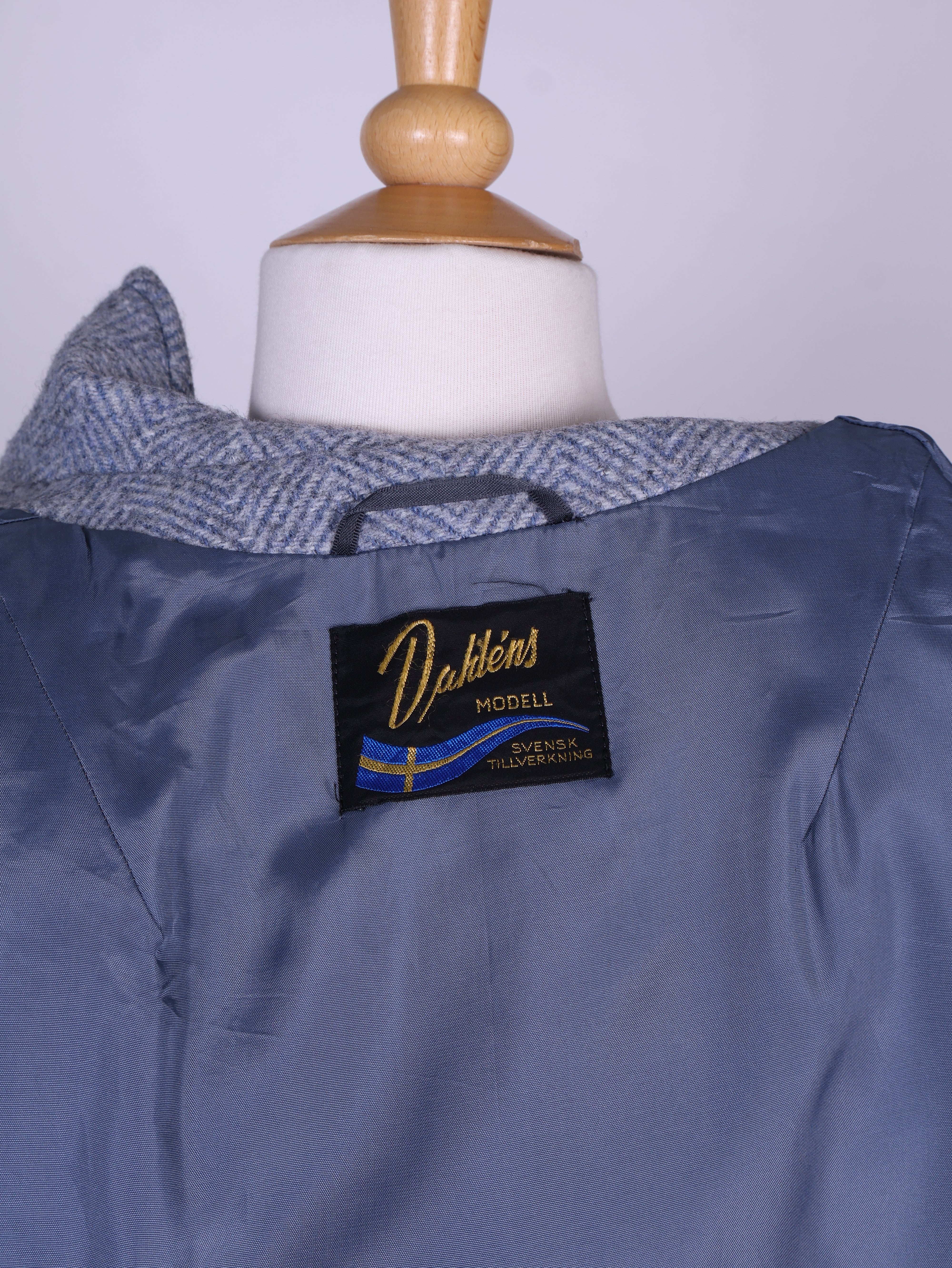 Flot vintage vintagefrakke fra 1970'erne syet i ren ulden tweed med sildebensmønster i grå og lyseblå. Frakken er med et lille bærestykke, sød krave, fine læg fortil og originale knapper. Der er foer indvendig.