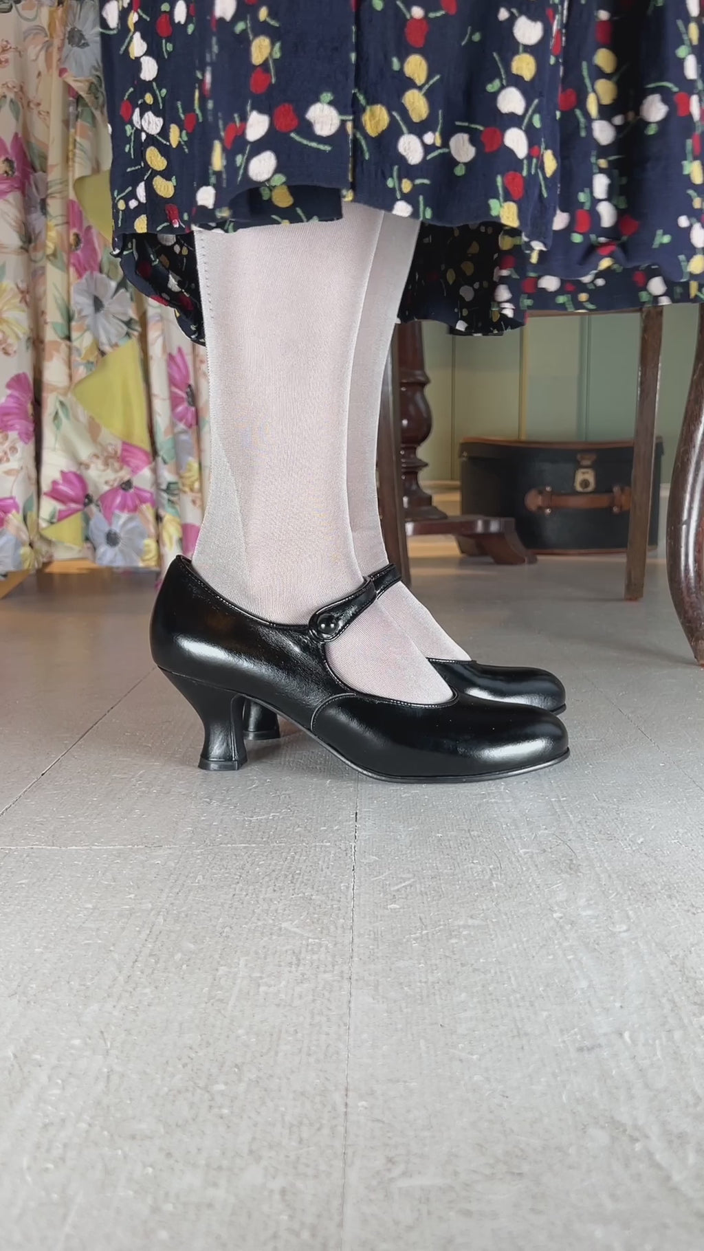 Asta er en 1920'er inspireret pump inspireret af 1920'erne, fremstillet i poleret kvalitetslæder. Skoen har en fransk hæl og en elegant ankelrem med en knap fastgjort til en elastik for nem lukning. Den mandelformede snude giver både plads og komfort.