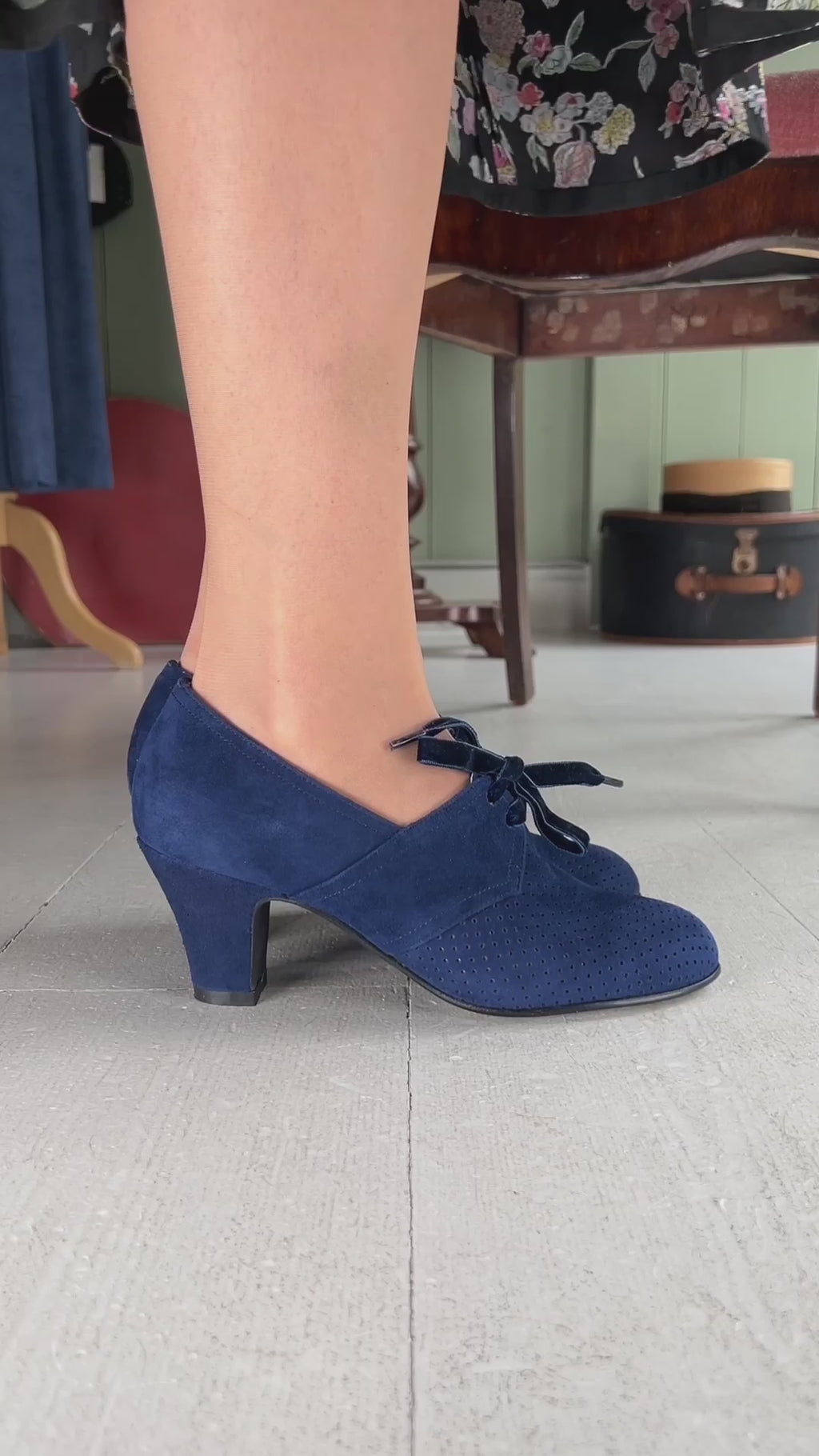 Esther er en stilfuld pumps med snøre, inspireret af mode fra 1940’erne og begyndelsen af 1950’erne. Skoene er lavet i blødt ruskind med fine, perforerede detaljer og elegante veloursnørebånd.