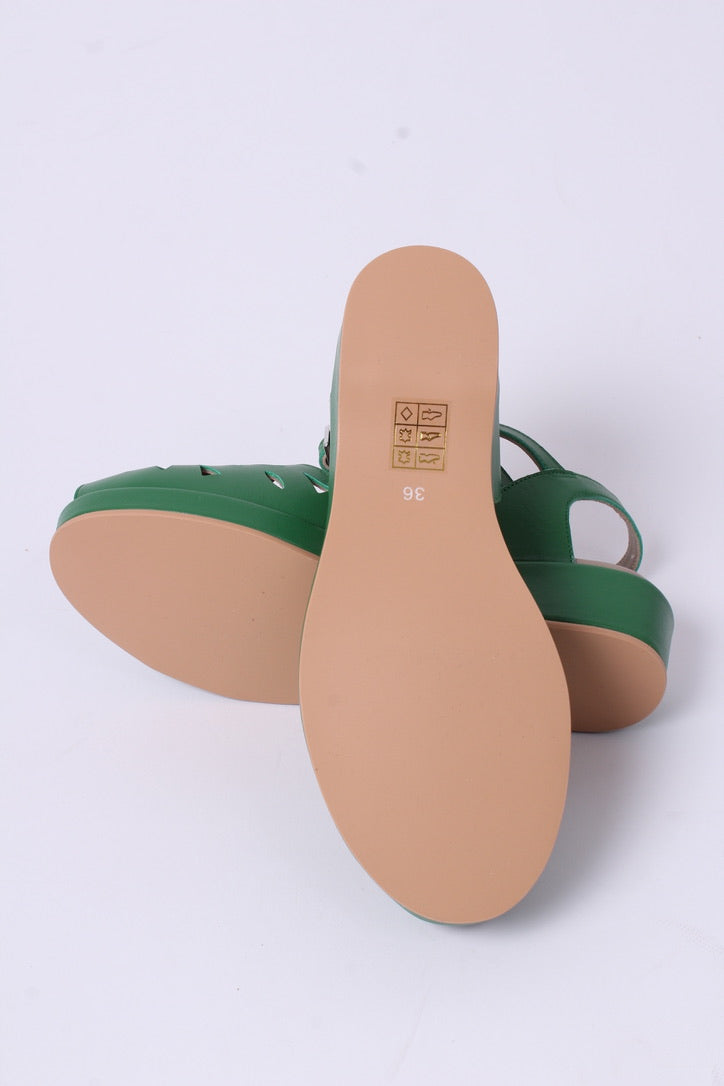 De er fremstillet af læder med et elegant udskåret hulmønster og har plateau-såler, en åben tå (peep toe) og en justerbar ankelrem med metalspænde.