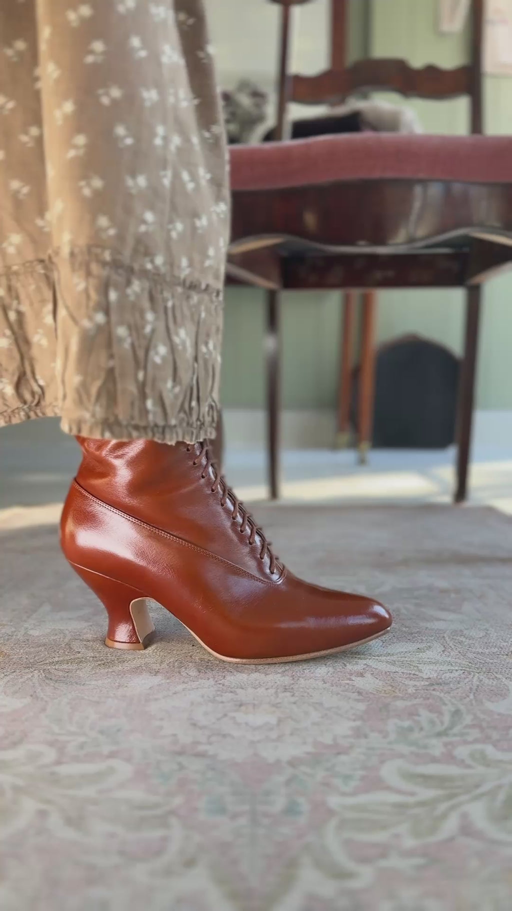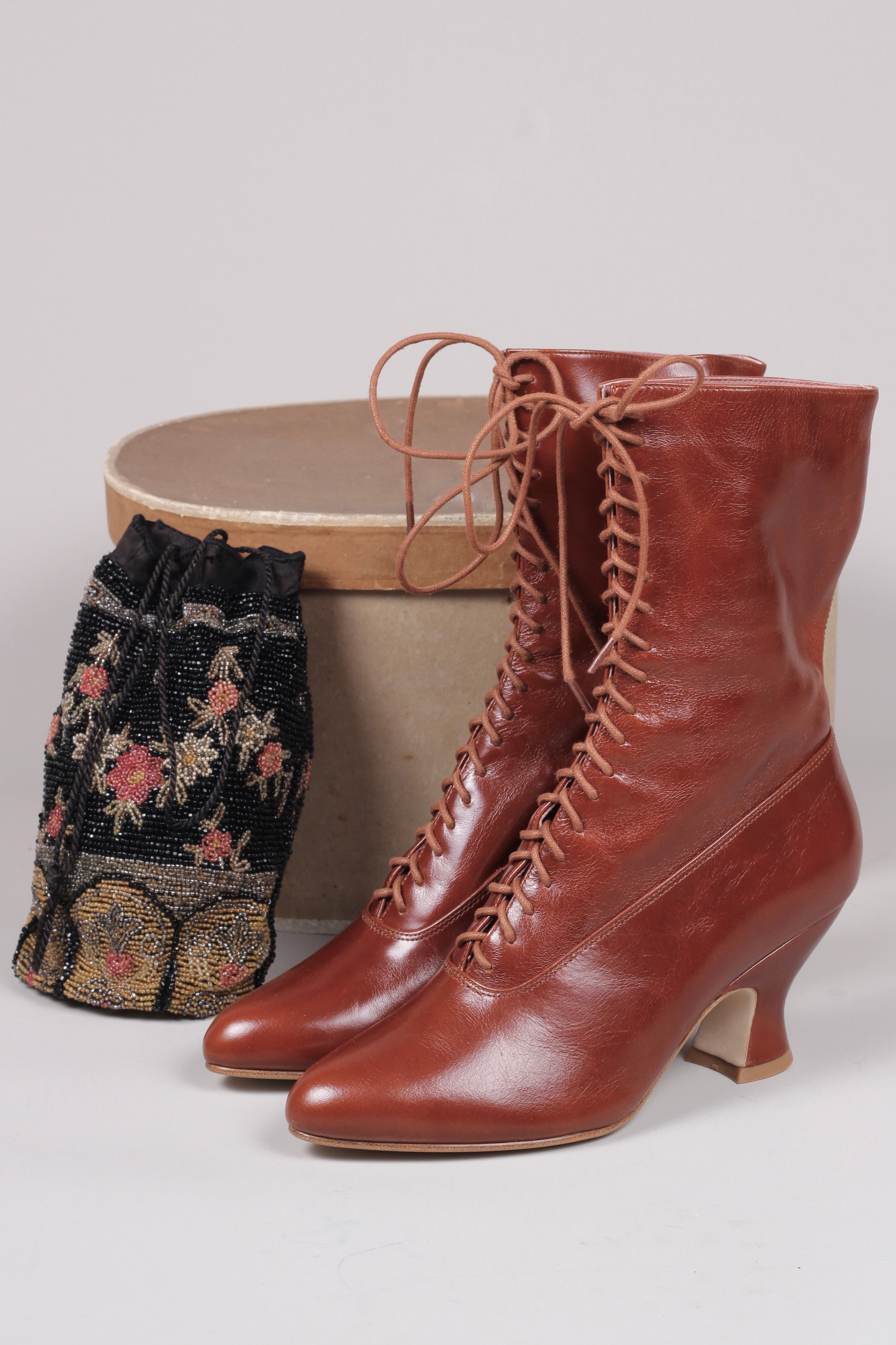 Støvlerne er tætsiddende, med spids snude og med buttede franske pompadour hæle. Hælenes facon er 100 % tro overfor perioden og med hælhøjde på 7 cm.