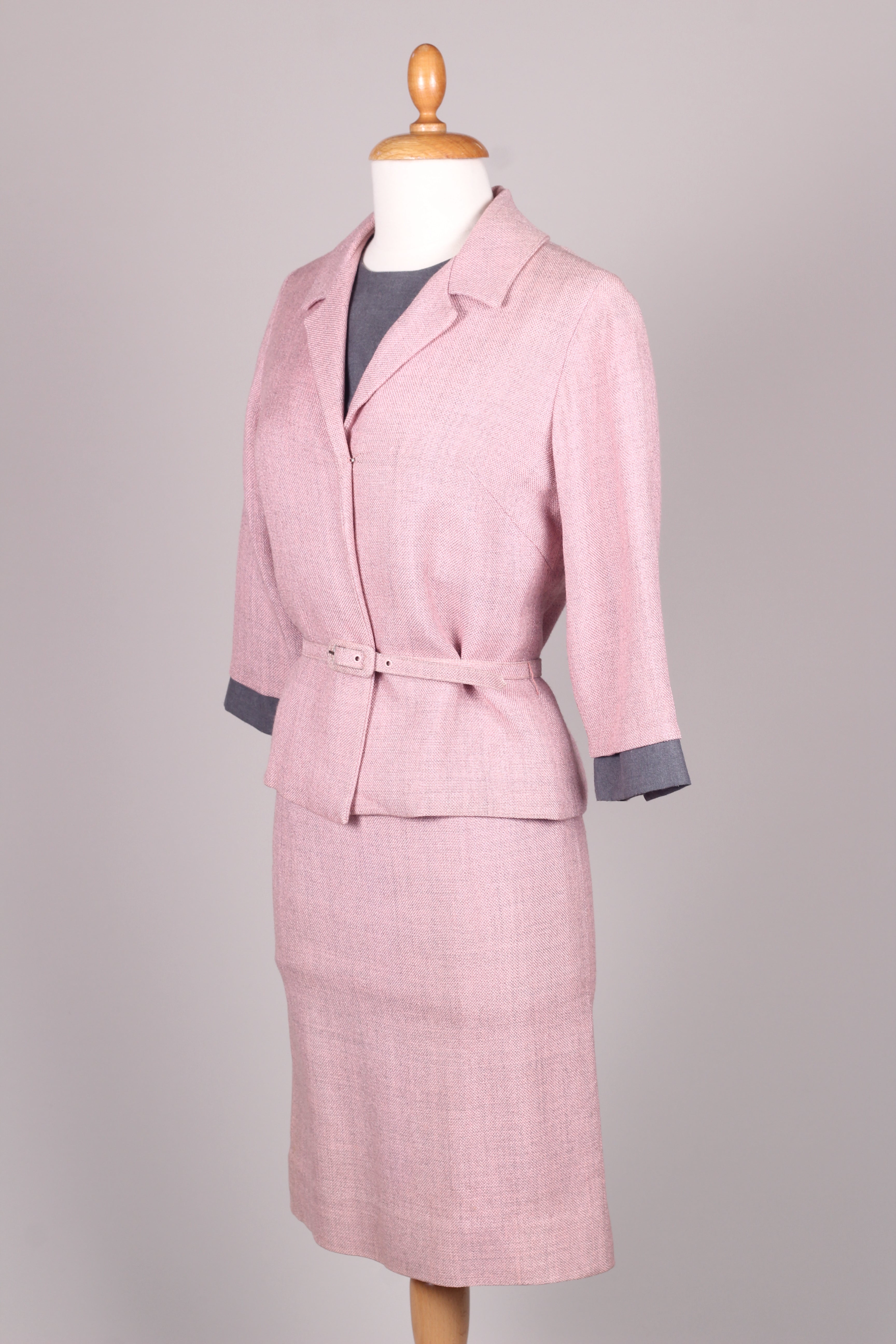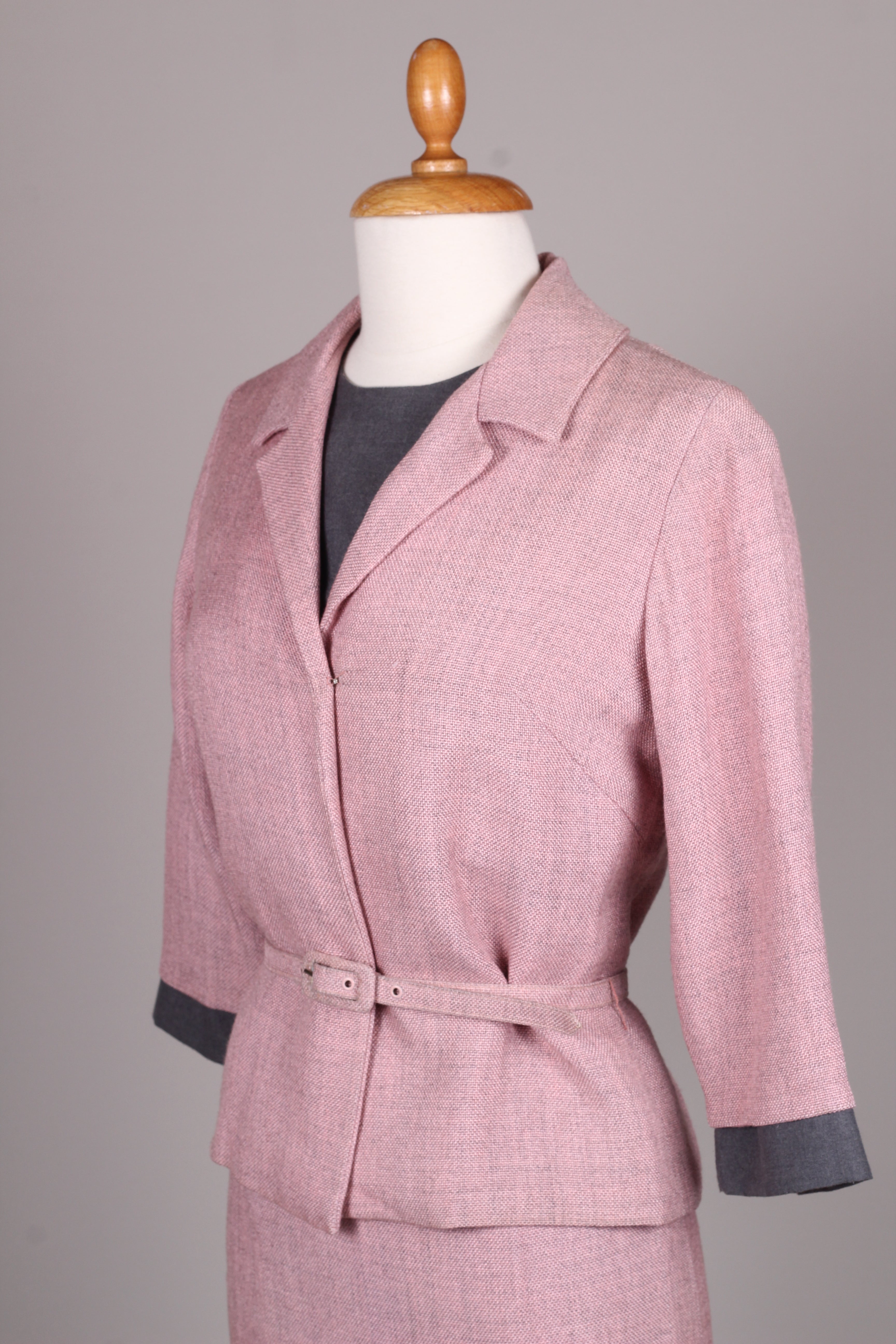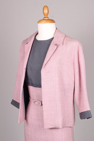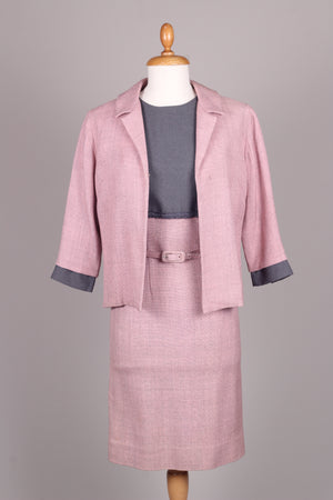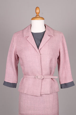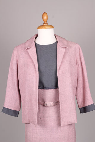 Flot sæt fra 1960'erne bestående kjole og jakke. Kjolen er med grå overdel syet i terylene (uld / polyester mix) og med rosa skørt og jakke syet i kraftig vævet stof (viskose / hør agtig materiale der falder tungt.) Kjolen er figursyet med lynlås i ryggen og jakken går lige op og ned men med bælte ved taljen.