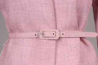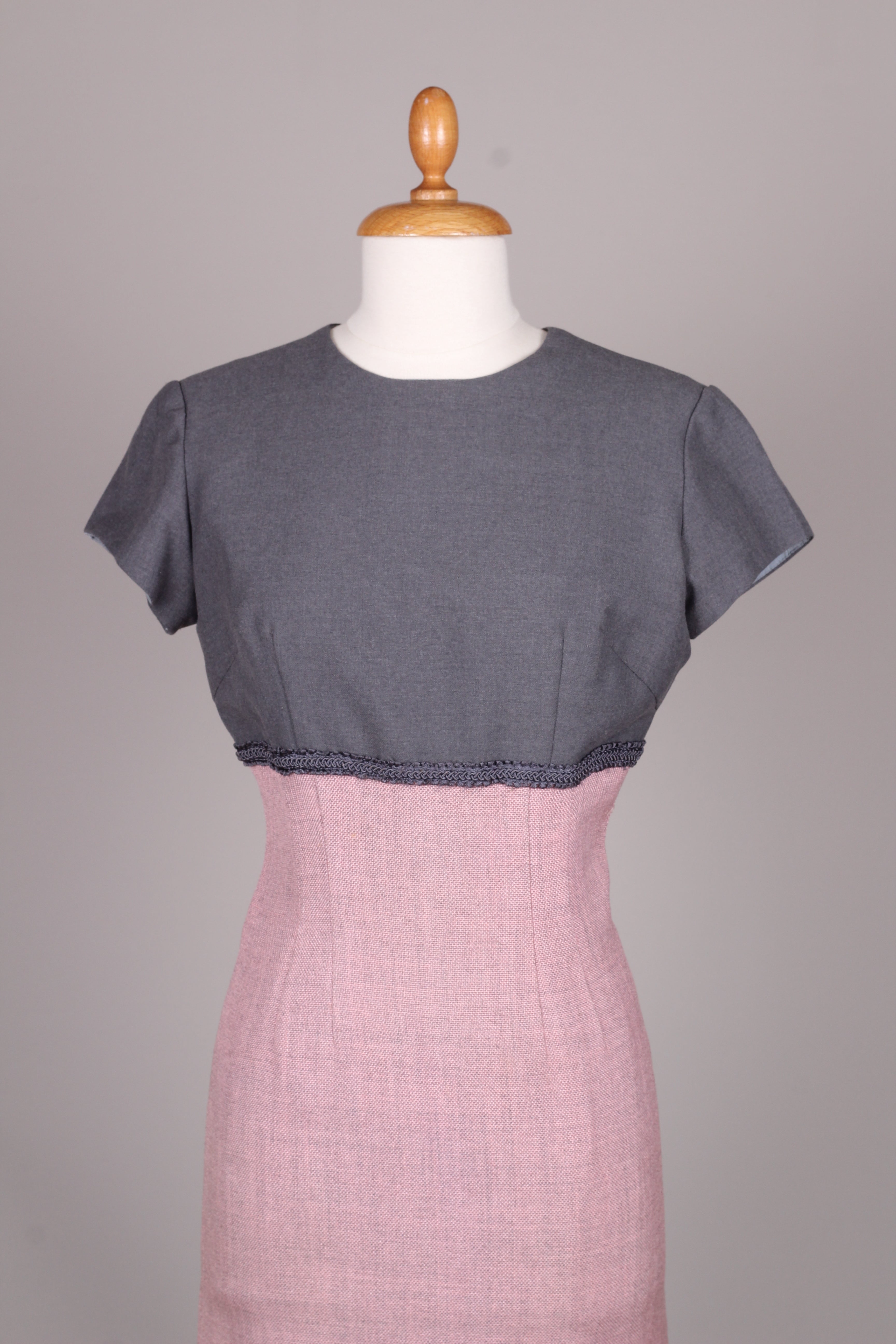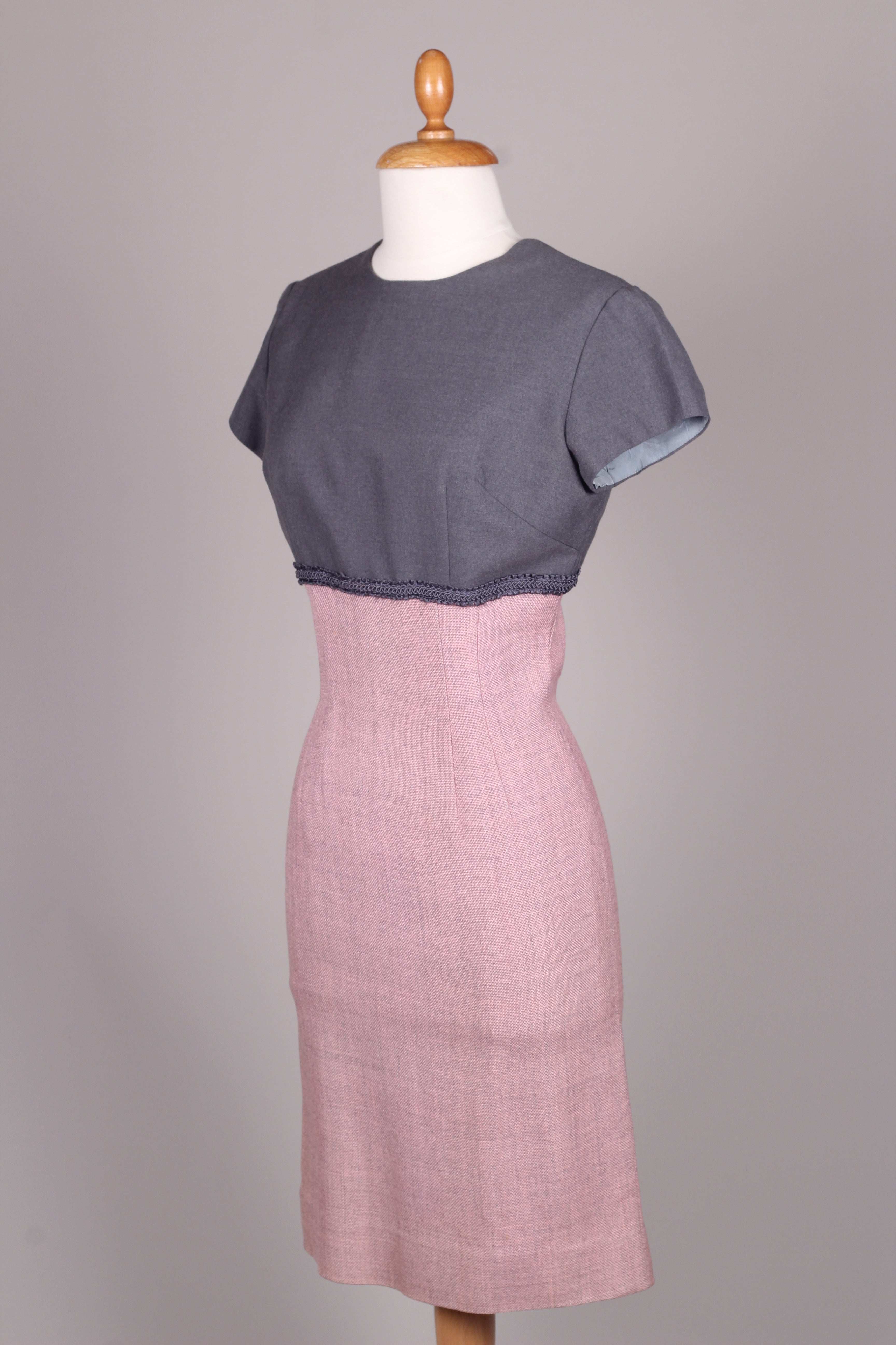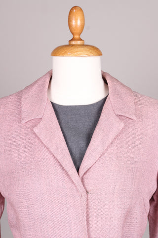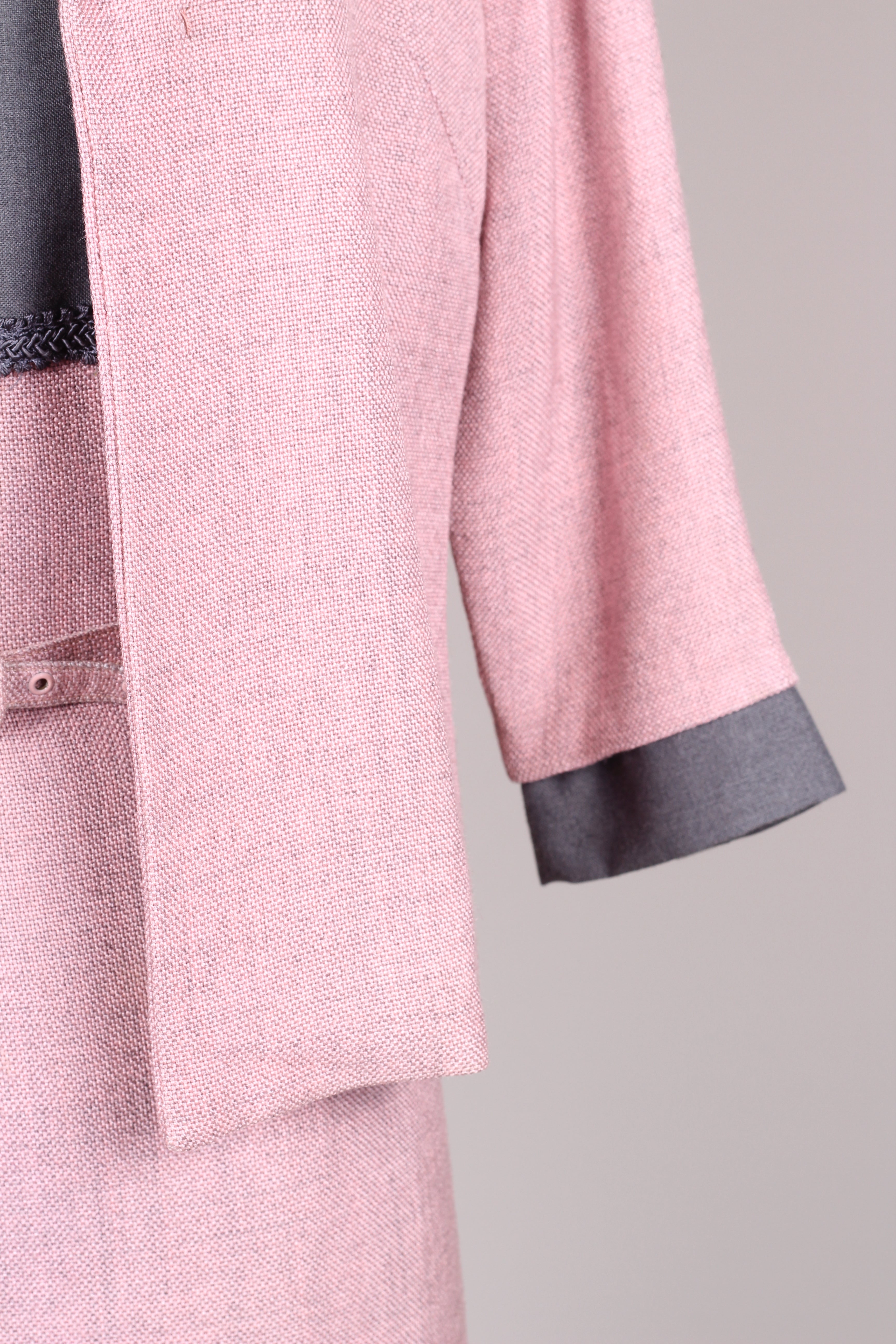 Flot sæt fra 1960'erne bestående kjole og jakke. Kjolen er med grå overdel syet i terylene (uld / polyester mix) og med rosa skørt og jakke syet i kraftig vævet stof (viskose / hør agtig materiale der falder tungt.) Kjolen er figursyet med lynlås i ryggen og jakken går lige op og ned men med bælte ved taljen.