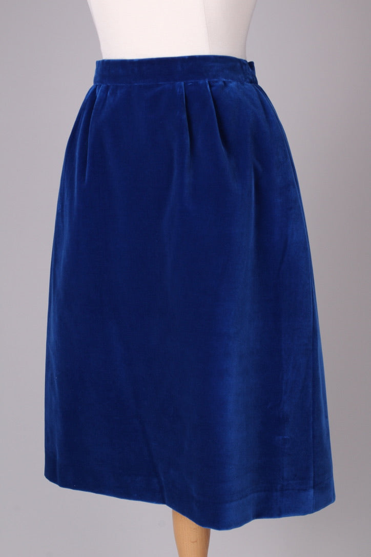 Blå skræddersyet 1960'er vintage nederdel syet blødt velour. Foer indvendig af acetat samt lukning i ryggen med knap og tryklås.