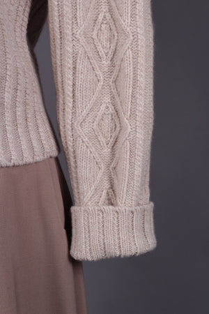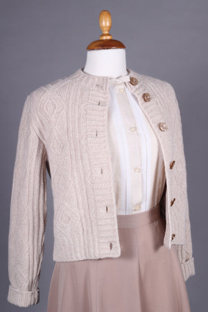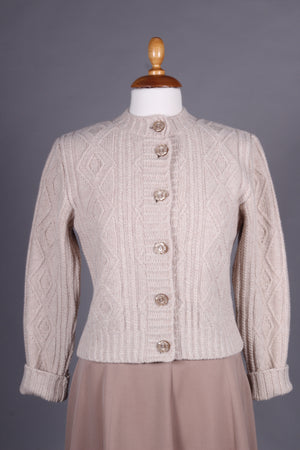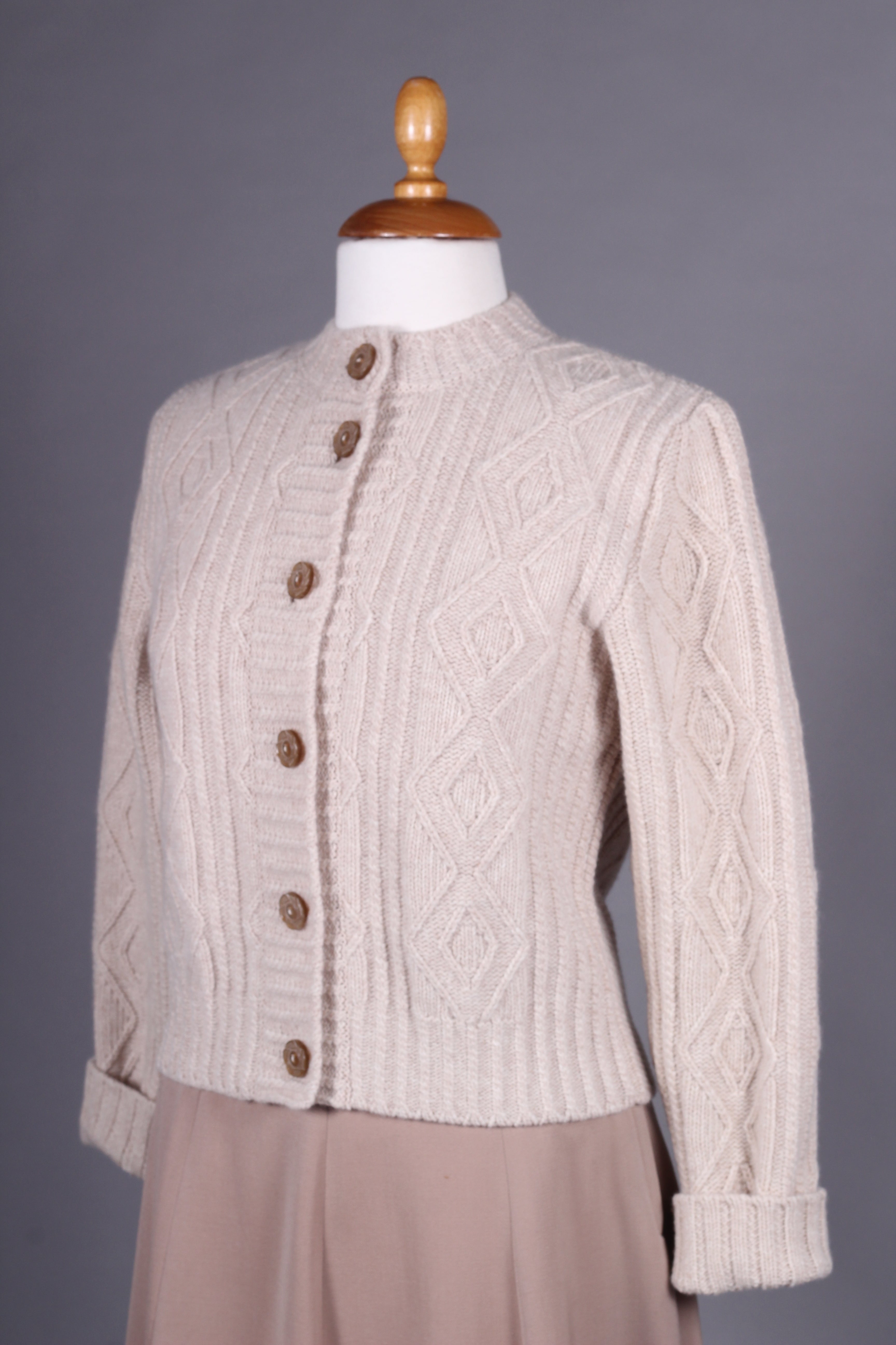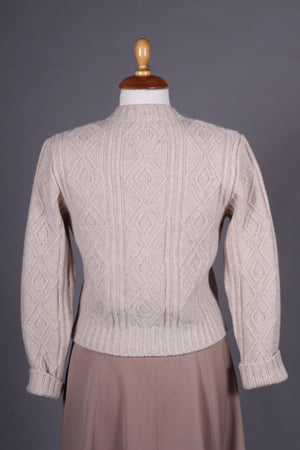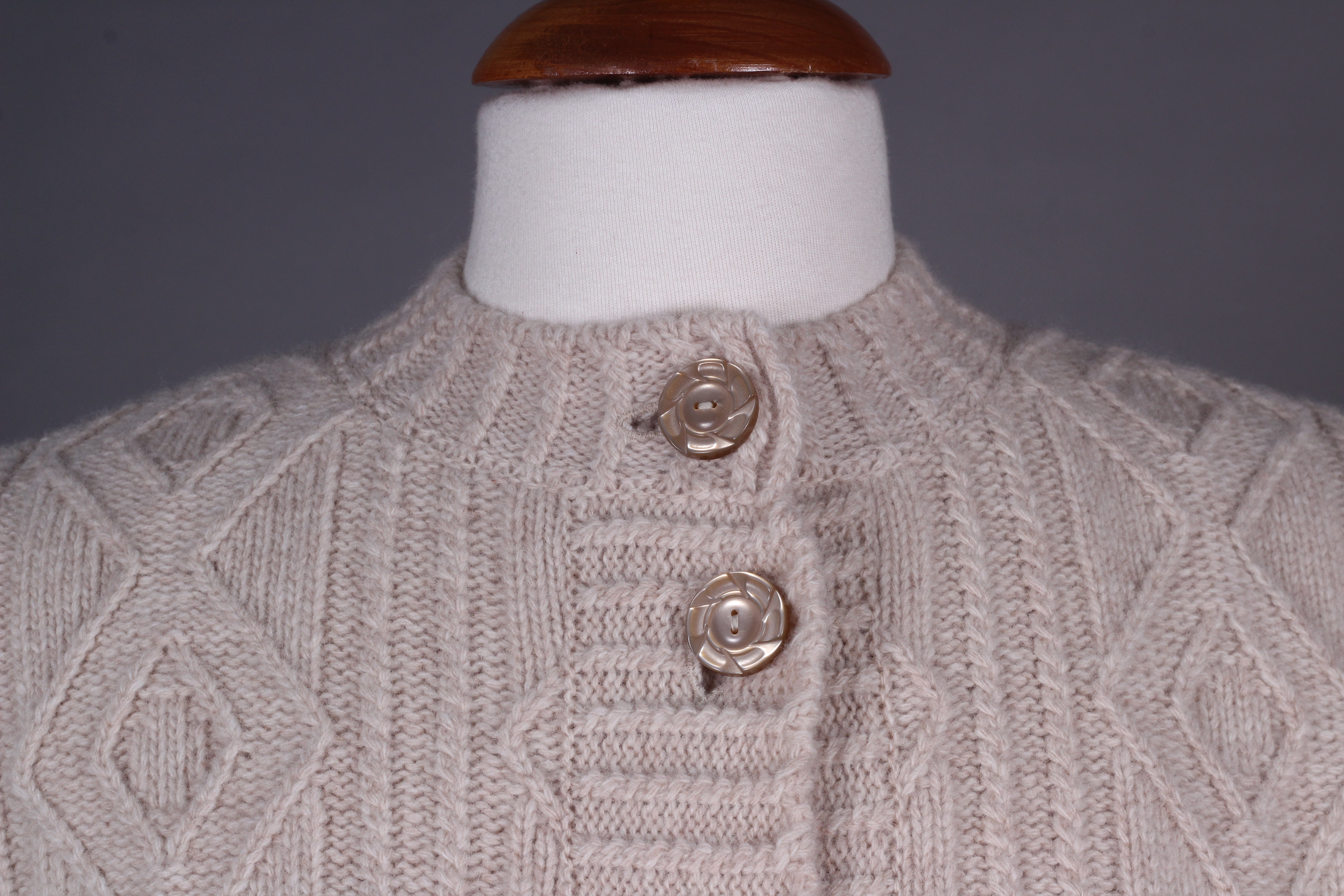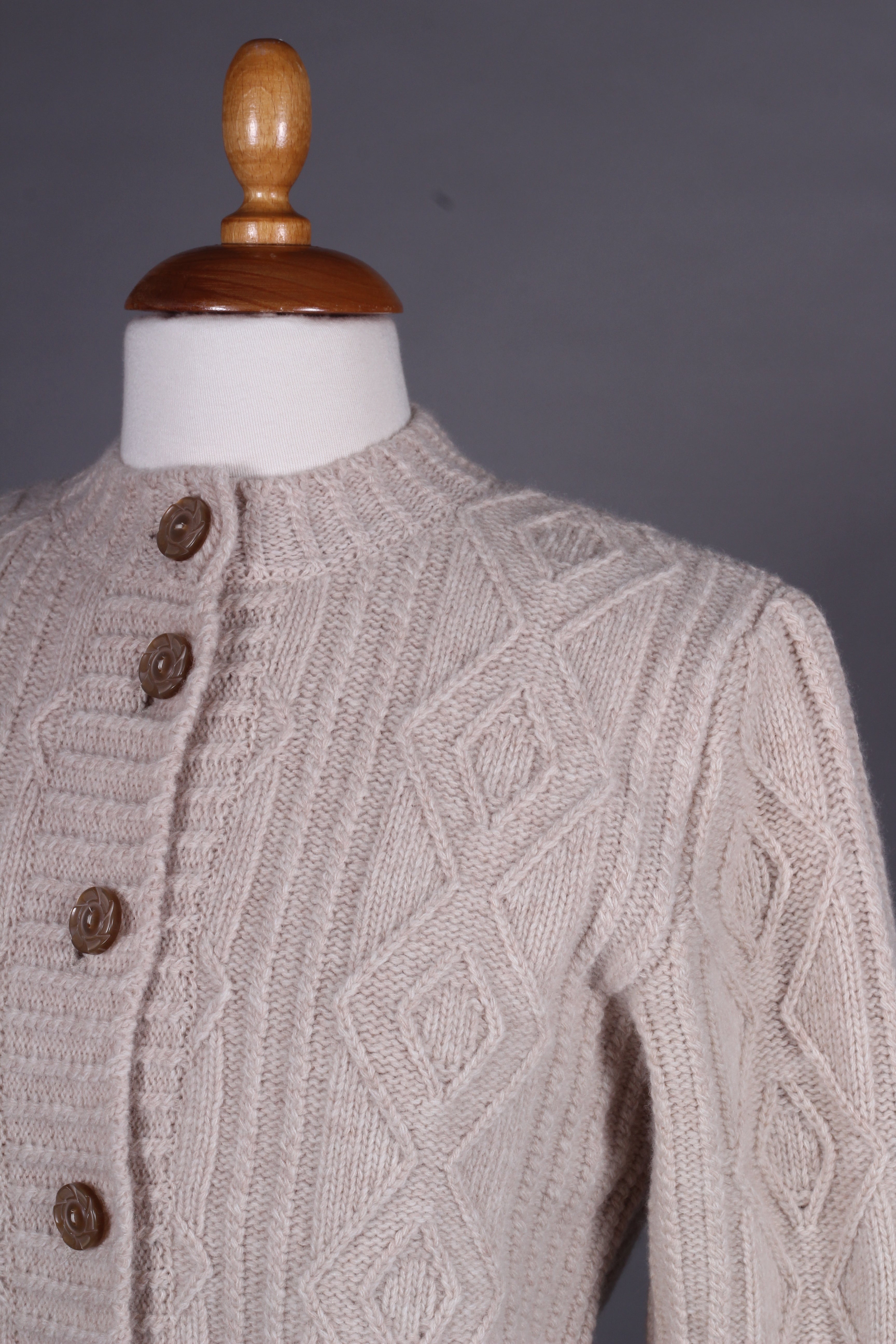Blød og ekstra varm 1940'er-inspireret cardigan, fremstillet af 100 % ren merinould med et smukt kabelstrikmønster. Cardiganen har et klassisk, lige snit, en rund halsudskæring og en længde, der går til lige under taljen. Ærmelængden kan justeres med den brede ribkant forneden.