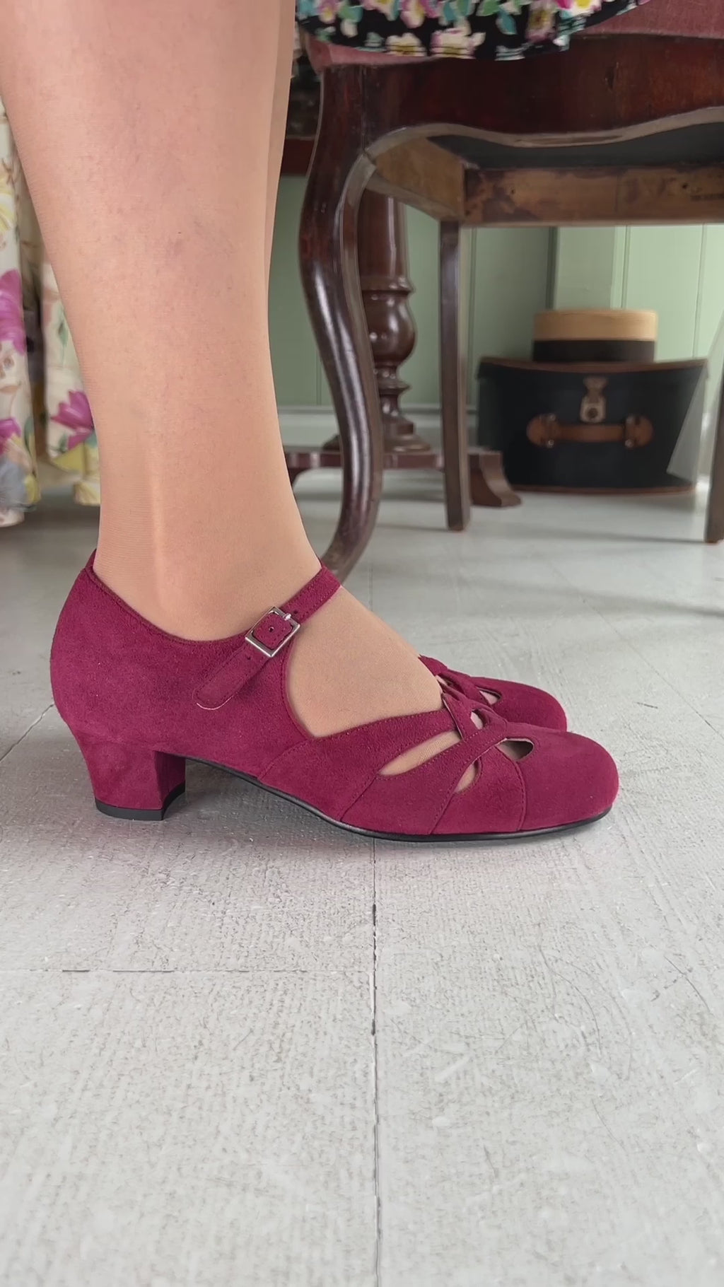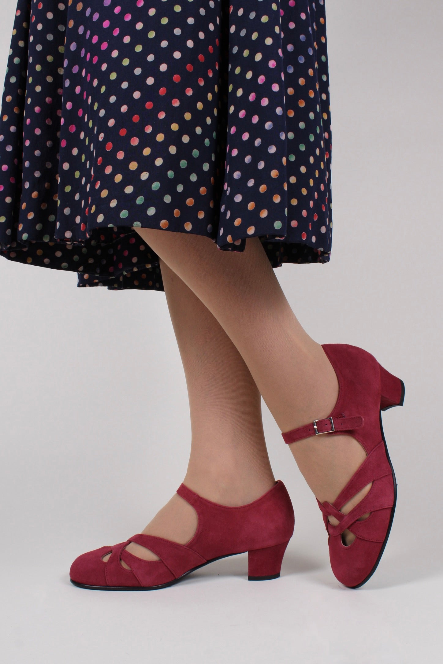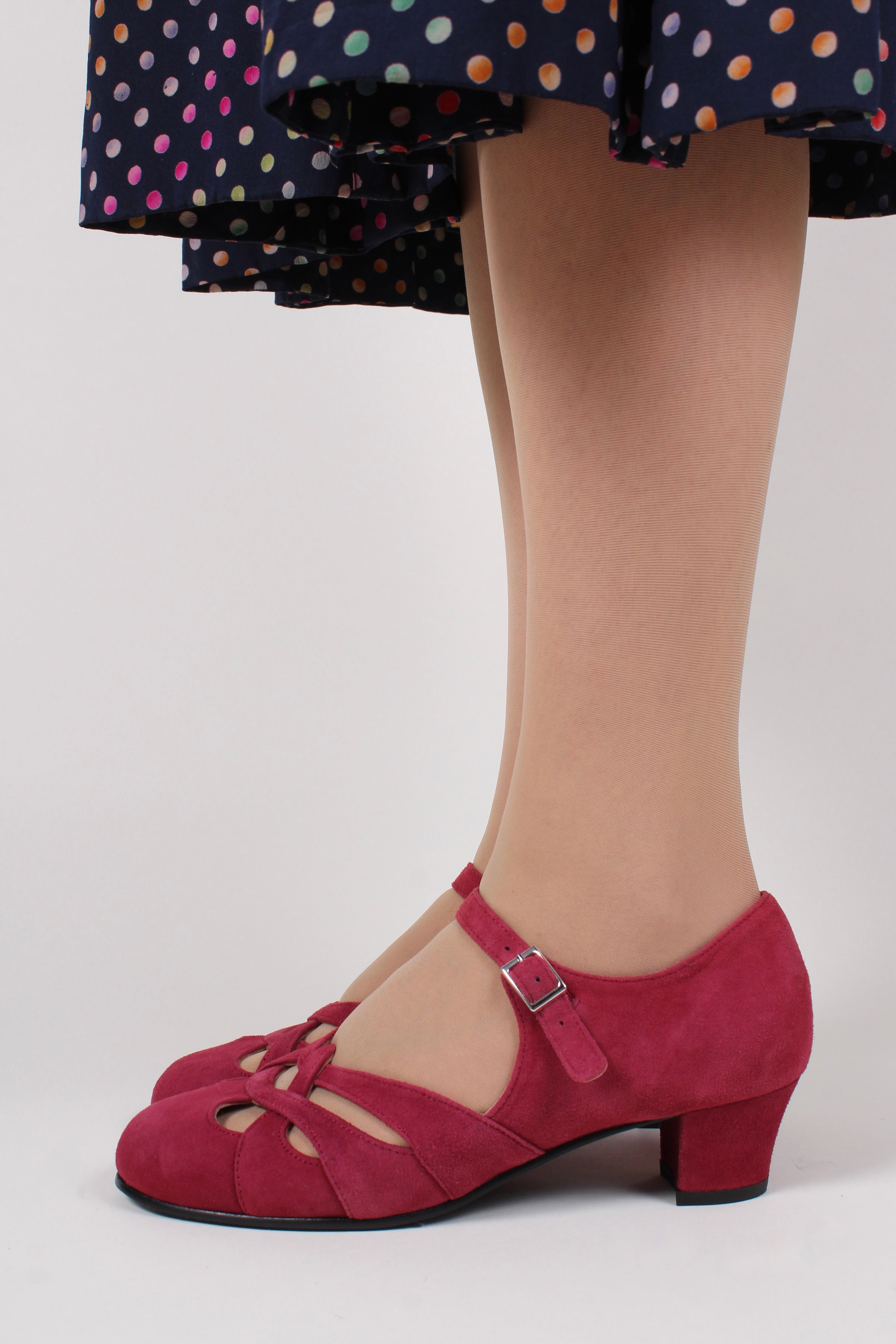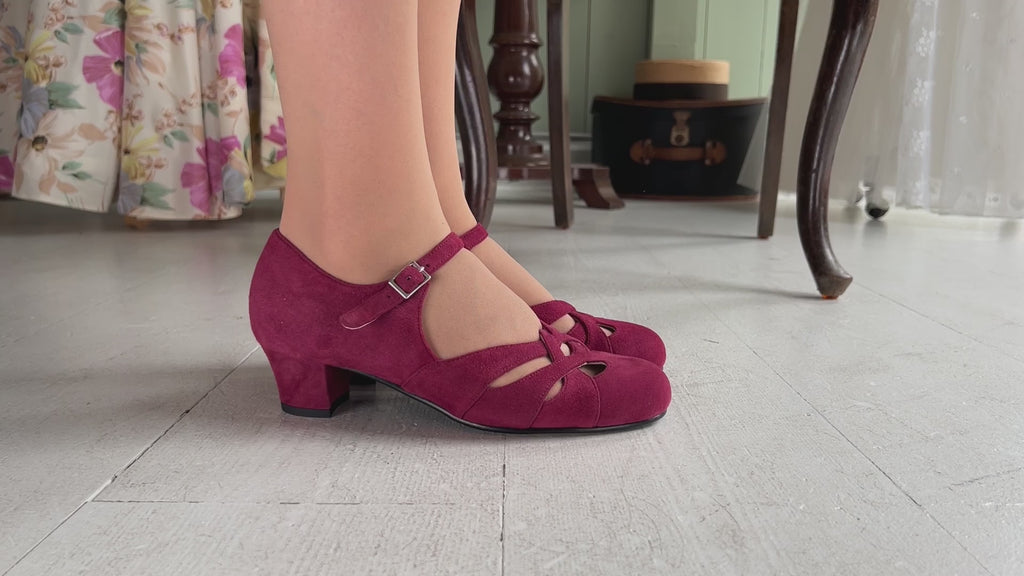 Ida-skoene er fremstillet i blødt, ægte ruskind og prydet med et smukt flettet mønster. Hælen er let kurvet, velafbalanceret og har en medium højde. Denne type hæl kaldes en militærhæl og er typisk for 1930'erne og 1940'erne.