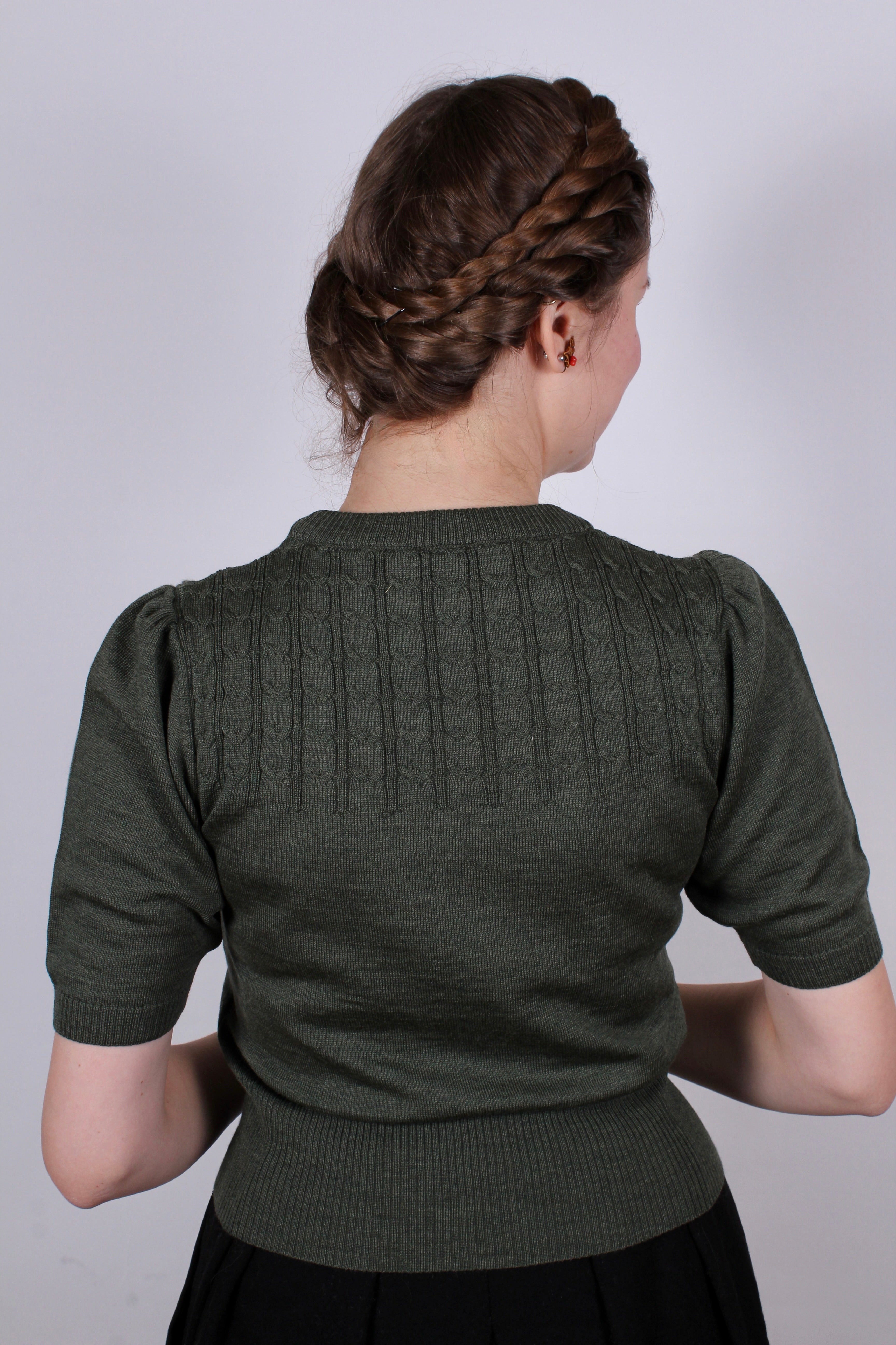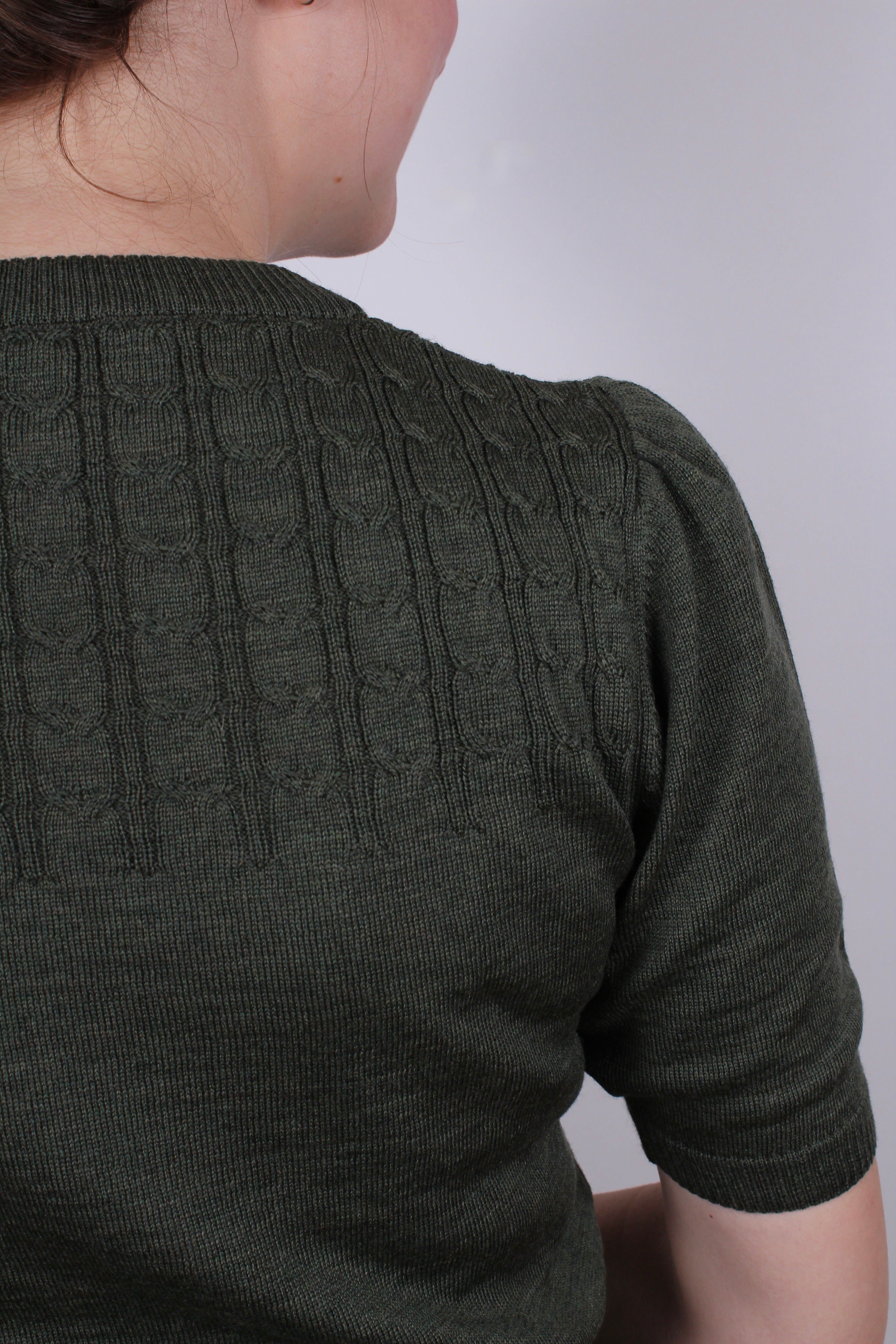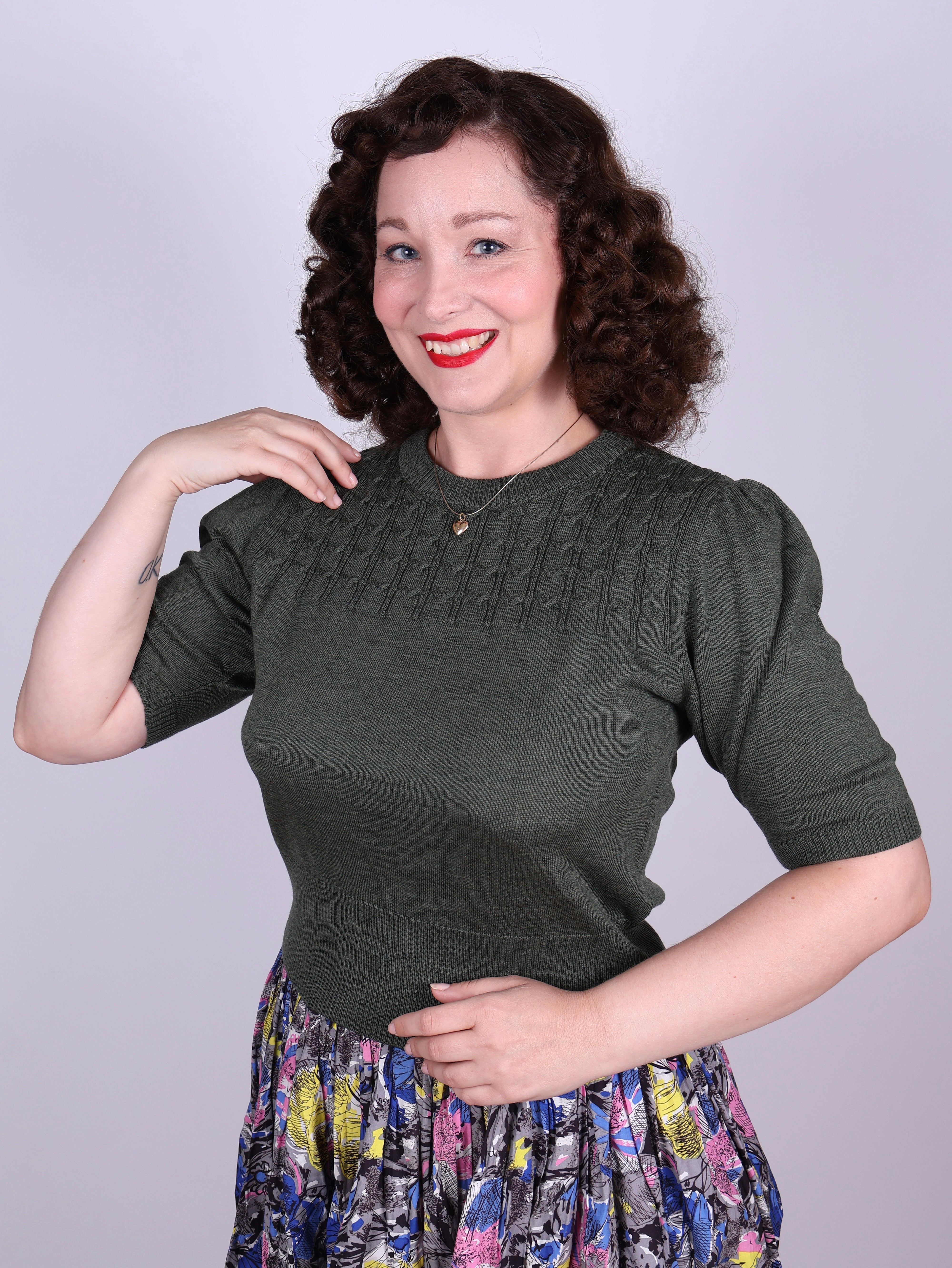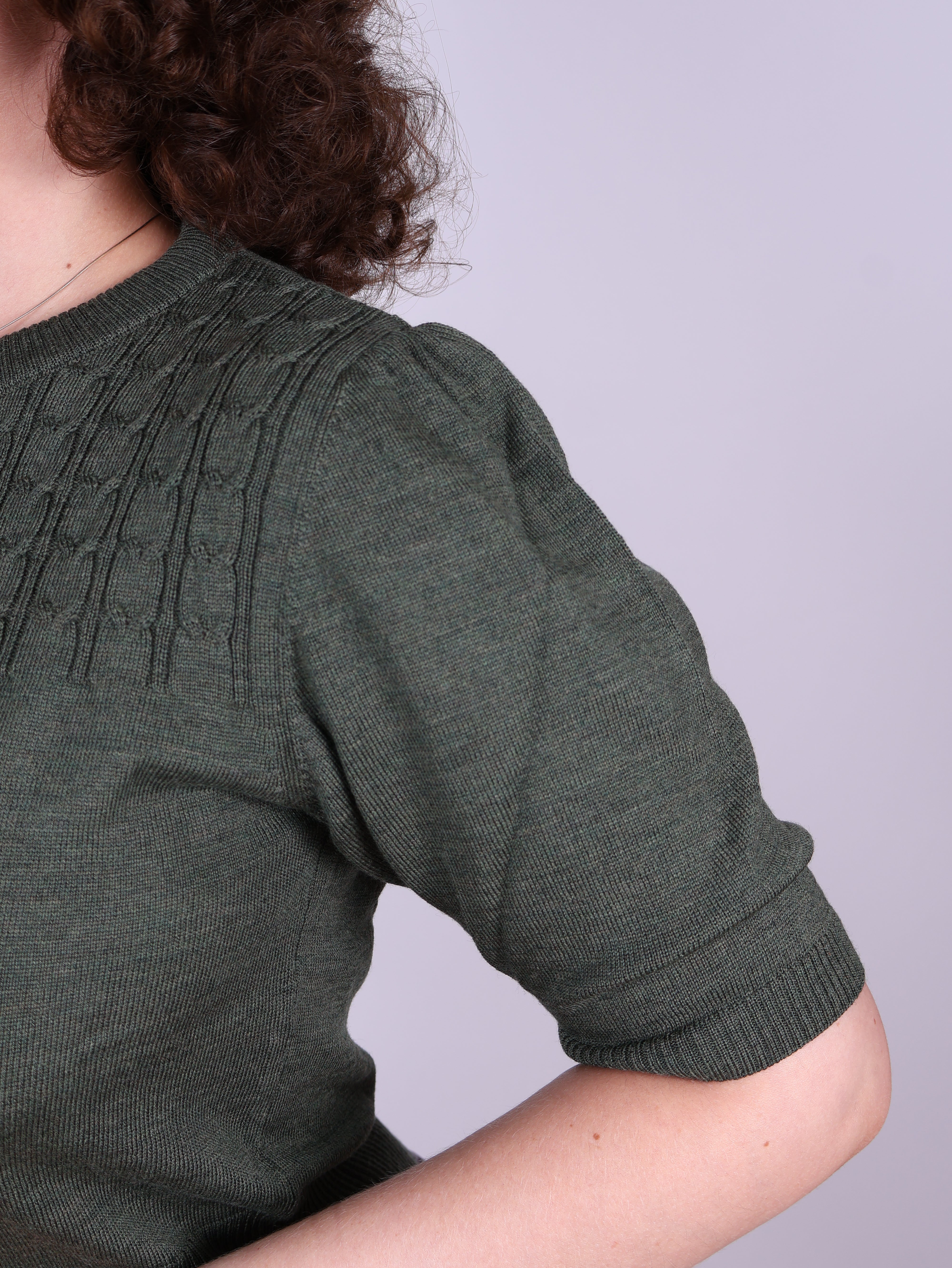 Sally er en 1940’er/1950’er-inspireret, tyndstrikket pullover fremstillet i 100 % blød og luksuriøs merinould. De elegante, korte pufærmer og det dekorative kabelmønster emmer af tidløs charme. Med sin runde halsudskæring og enkle udtryk er blusen både praktisk og stilfuld.
