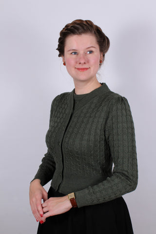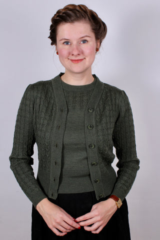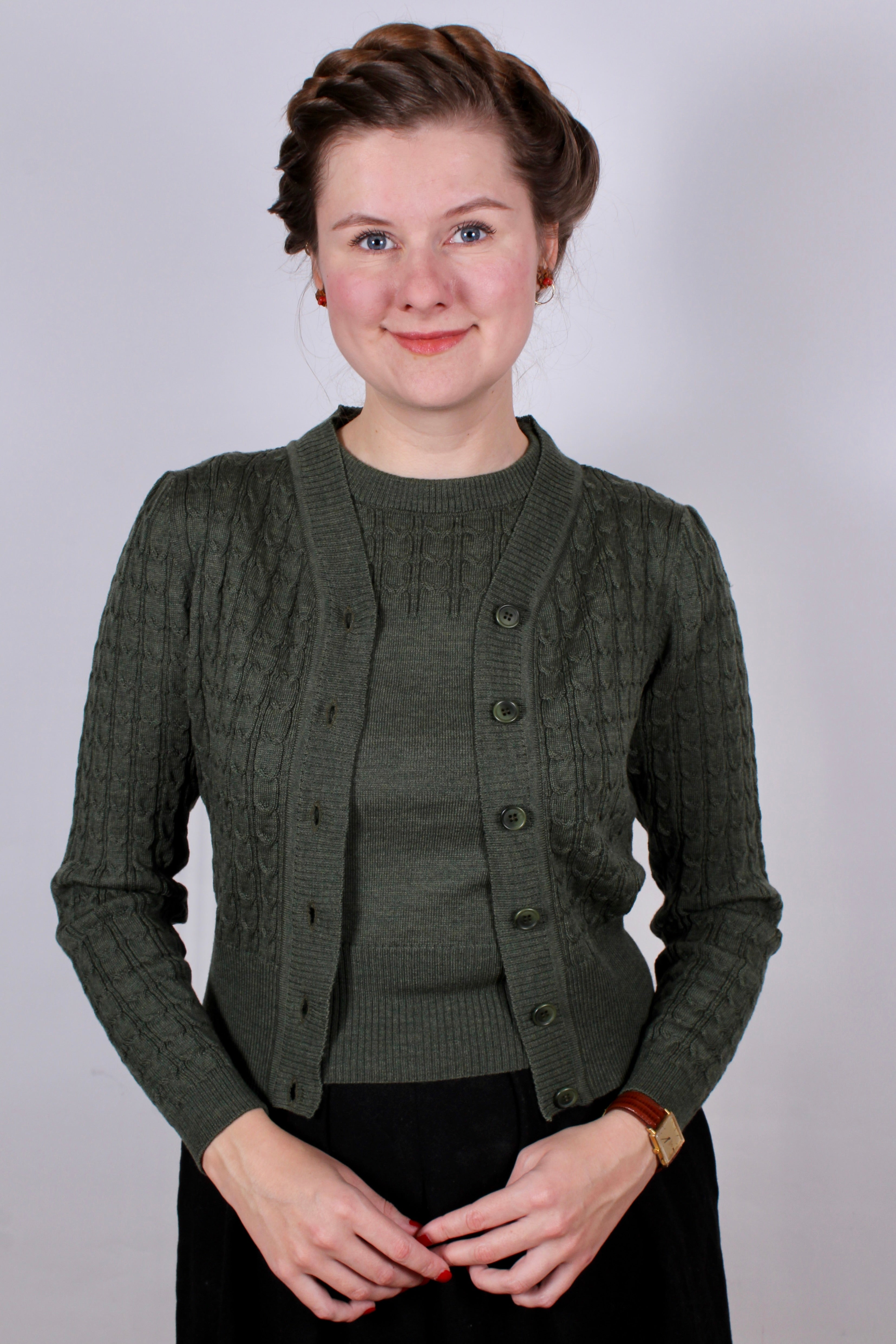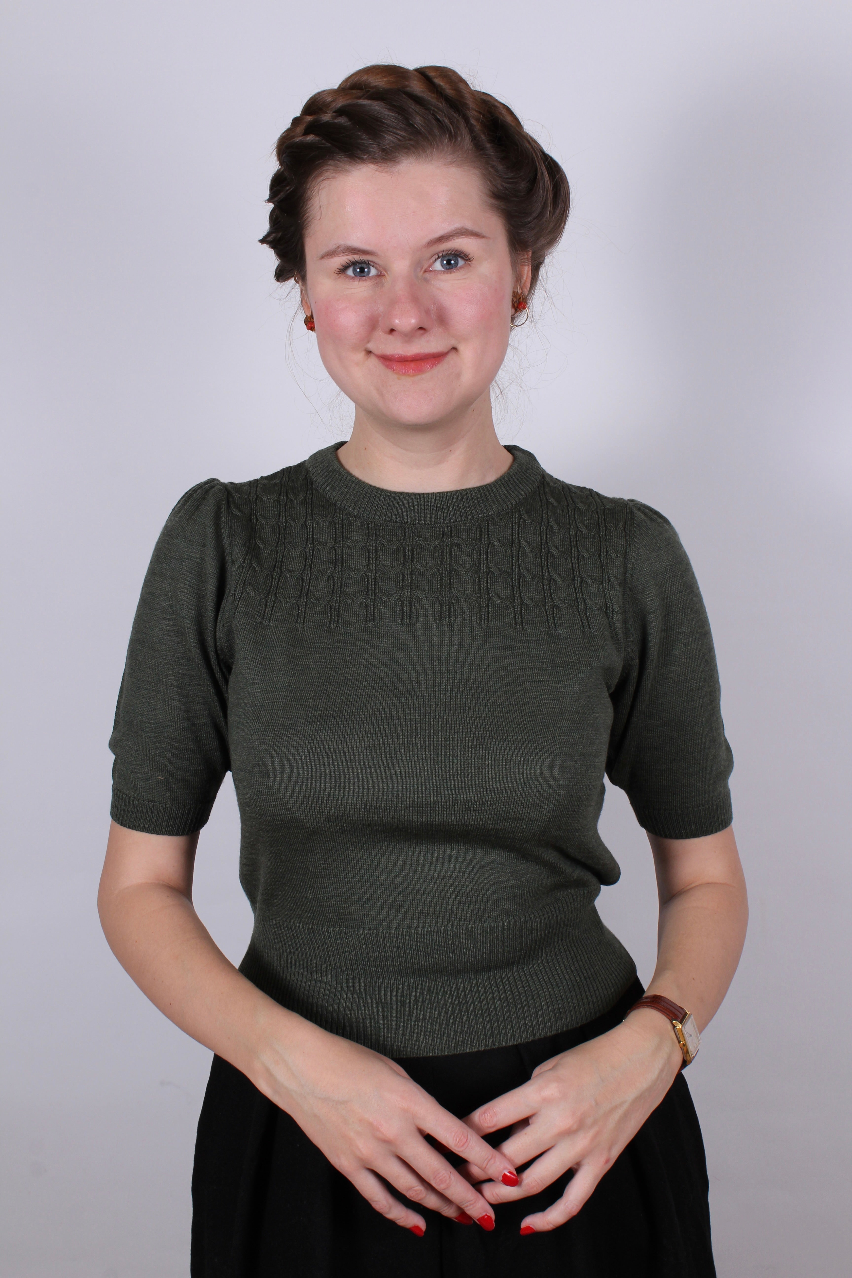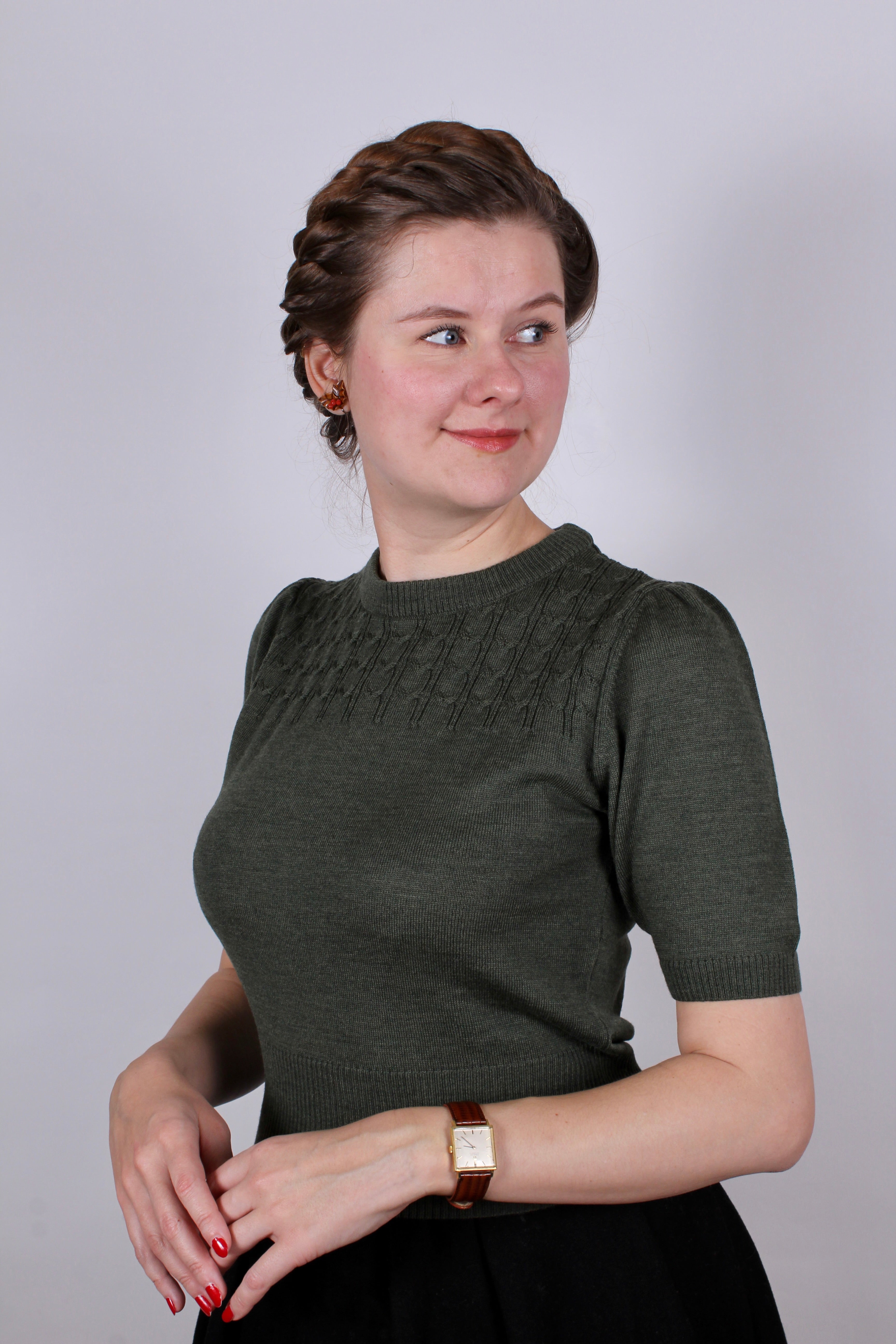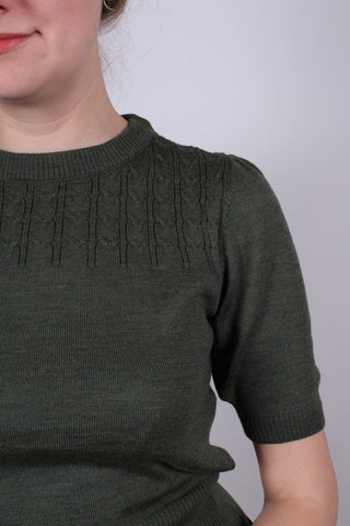 Sally er en 1940’er/1950’er-inspireret, tyndstrikket pullover fremstillet i 100 % blød og luksuriøs merinould. De elegante, korte pufærmer og det dekorative kabelmønster emmer af tidløs charme. Med sin runde halsudskæring og enkle udtryk er blusen både praktisk og stilfuld.