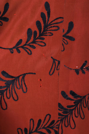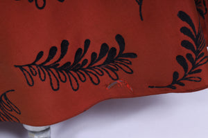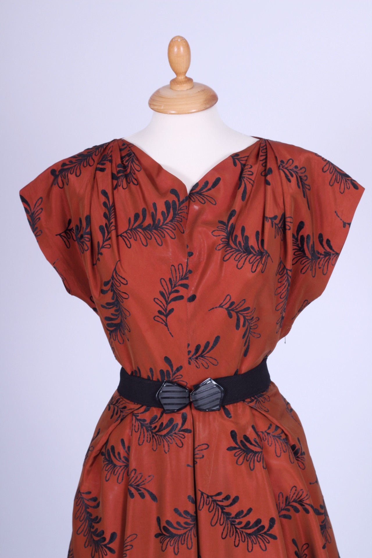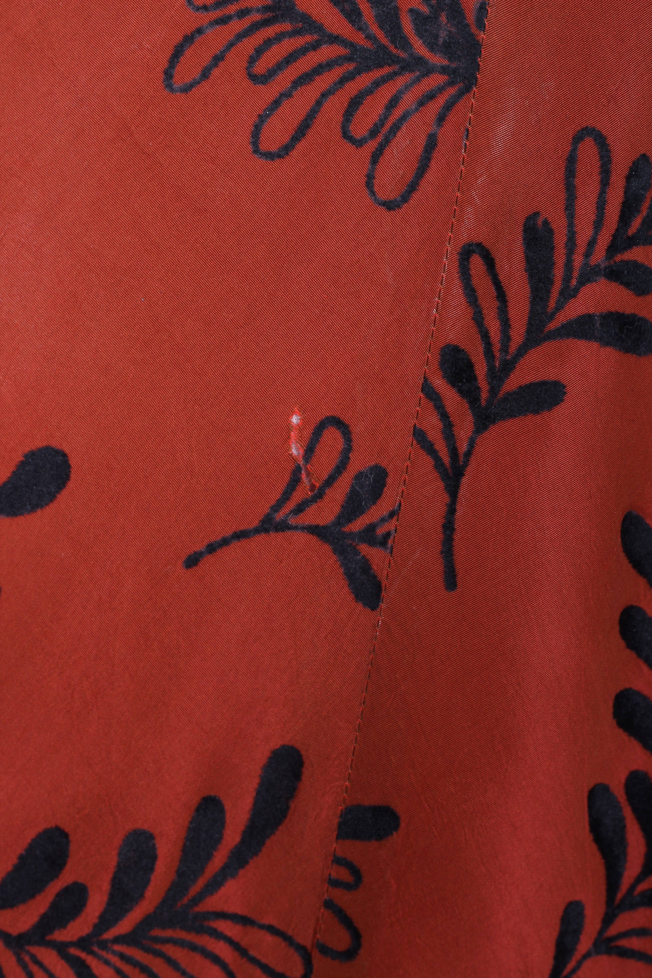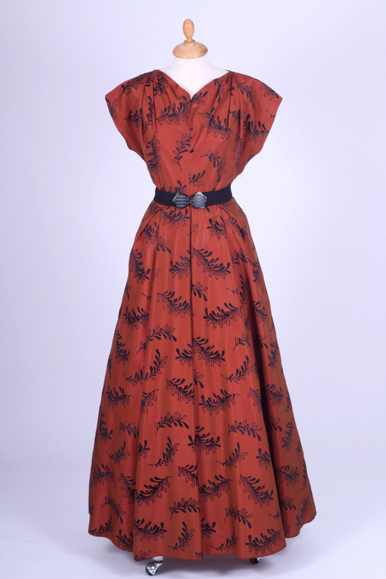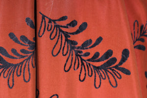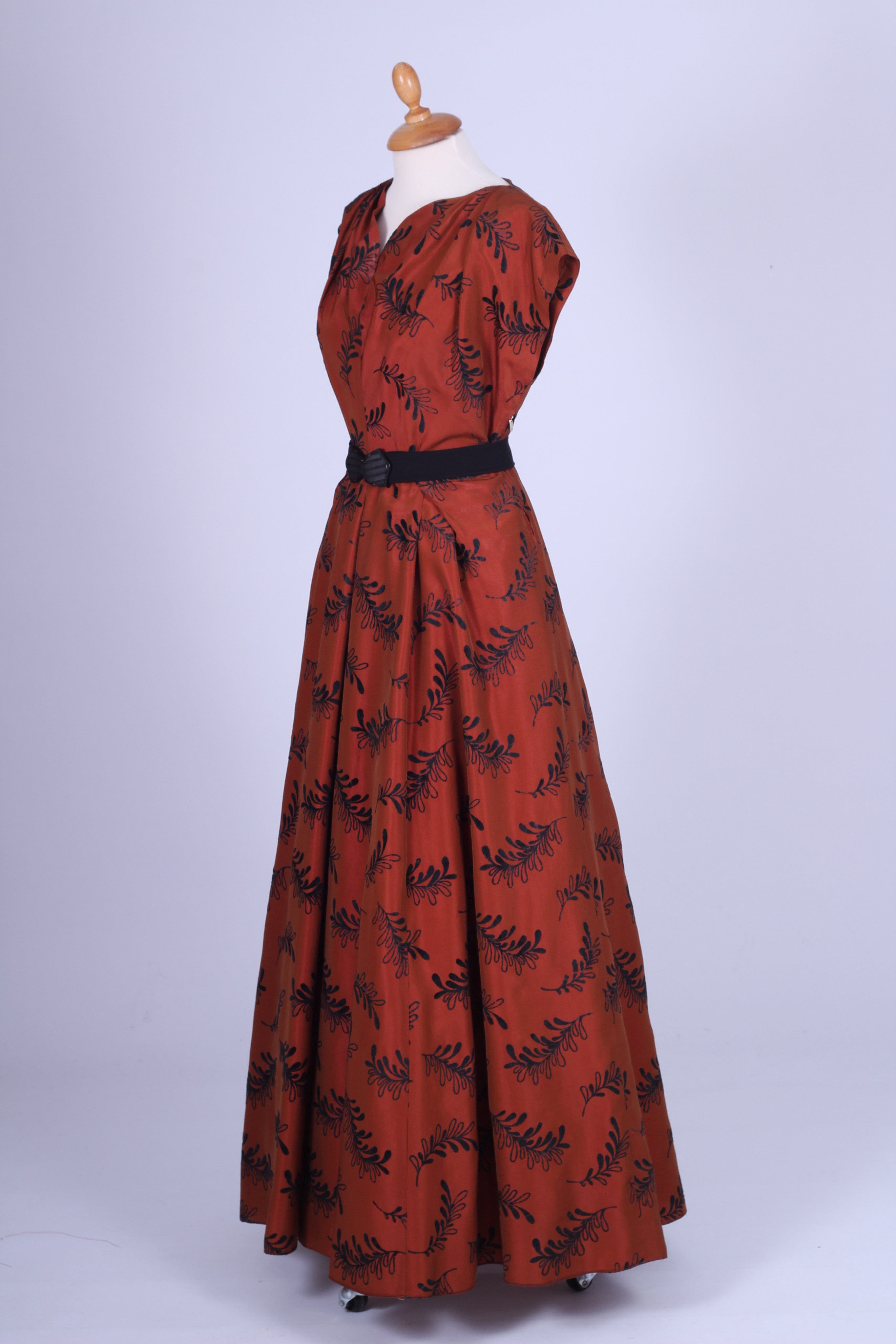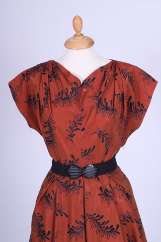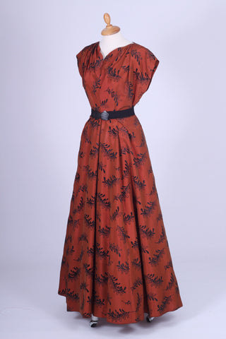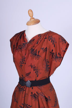 Flot vintage aftenkjole fra 1950'erne syet i rødbrun silketaft med sort mønster (velouragtigt). Kjolen har kimonoærmer, er skåret ved taljen, lukkes i siden med lynlås og har hellangt skørt med enkelte brede læg. Fra Danmark.