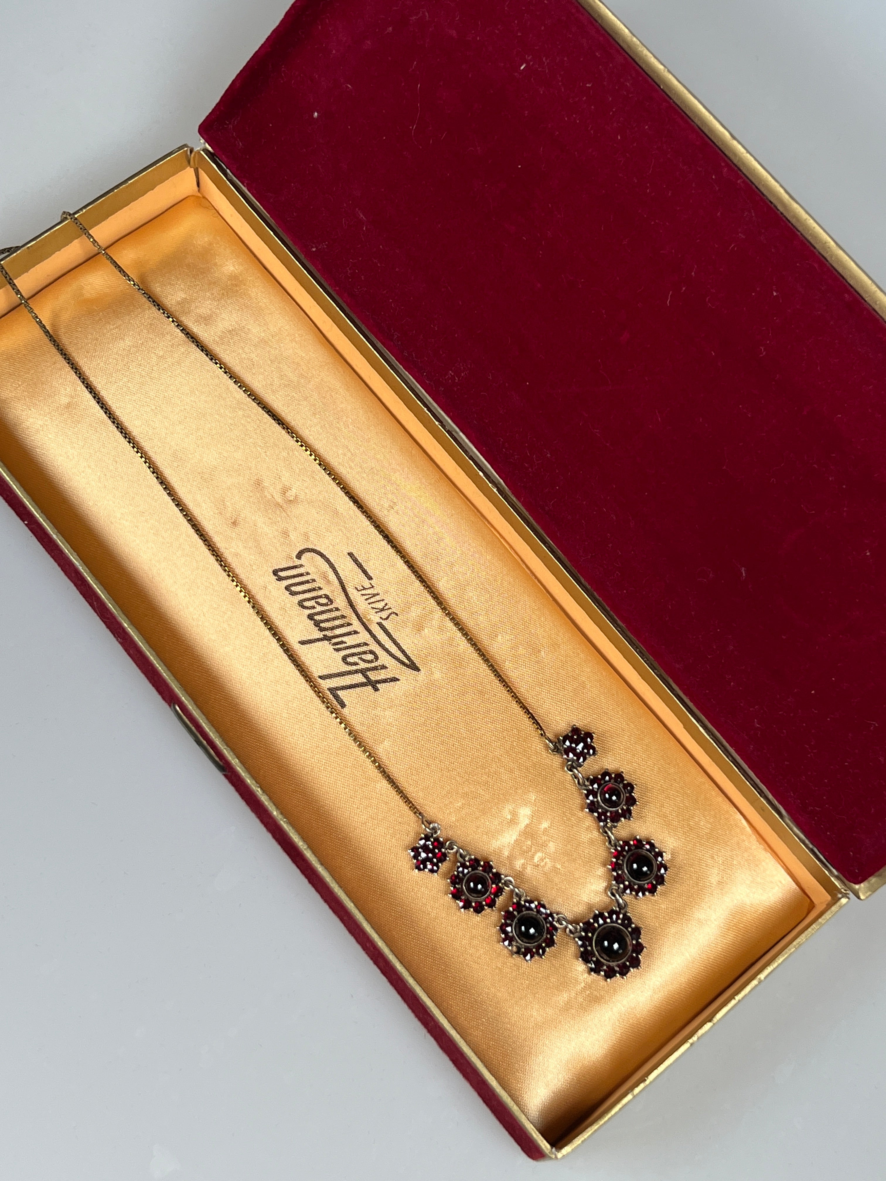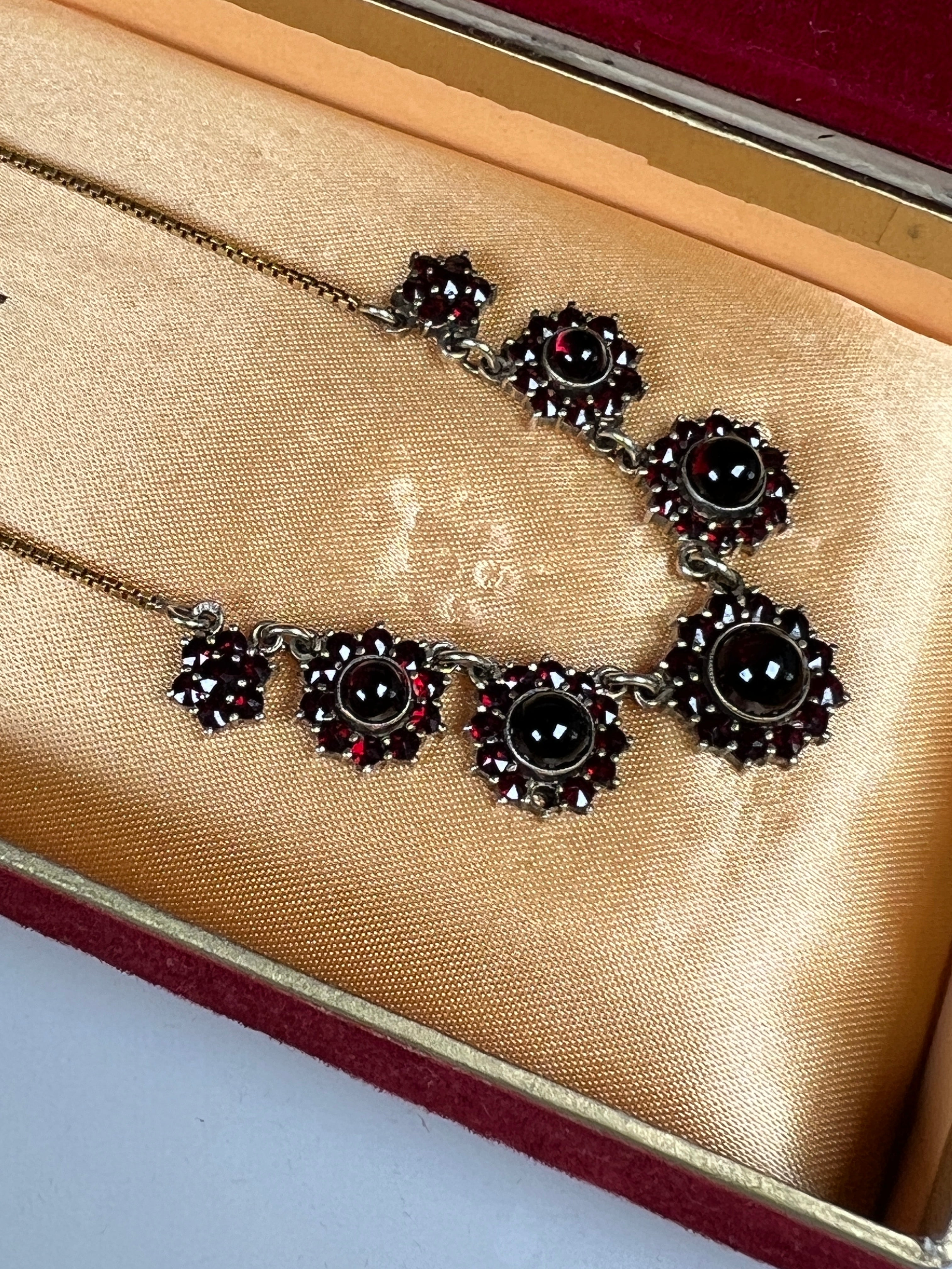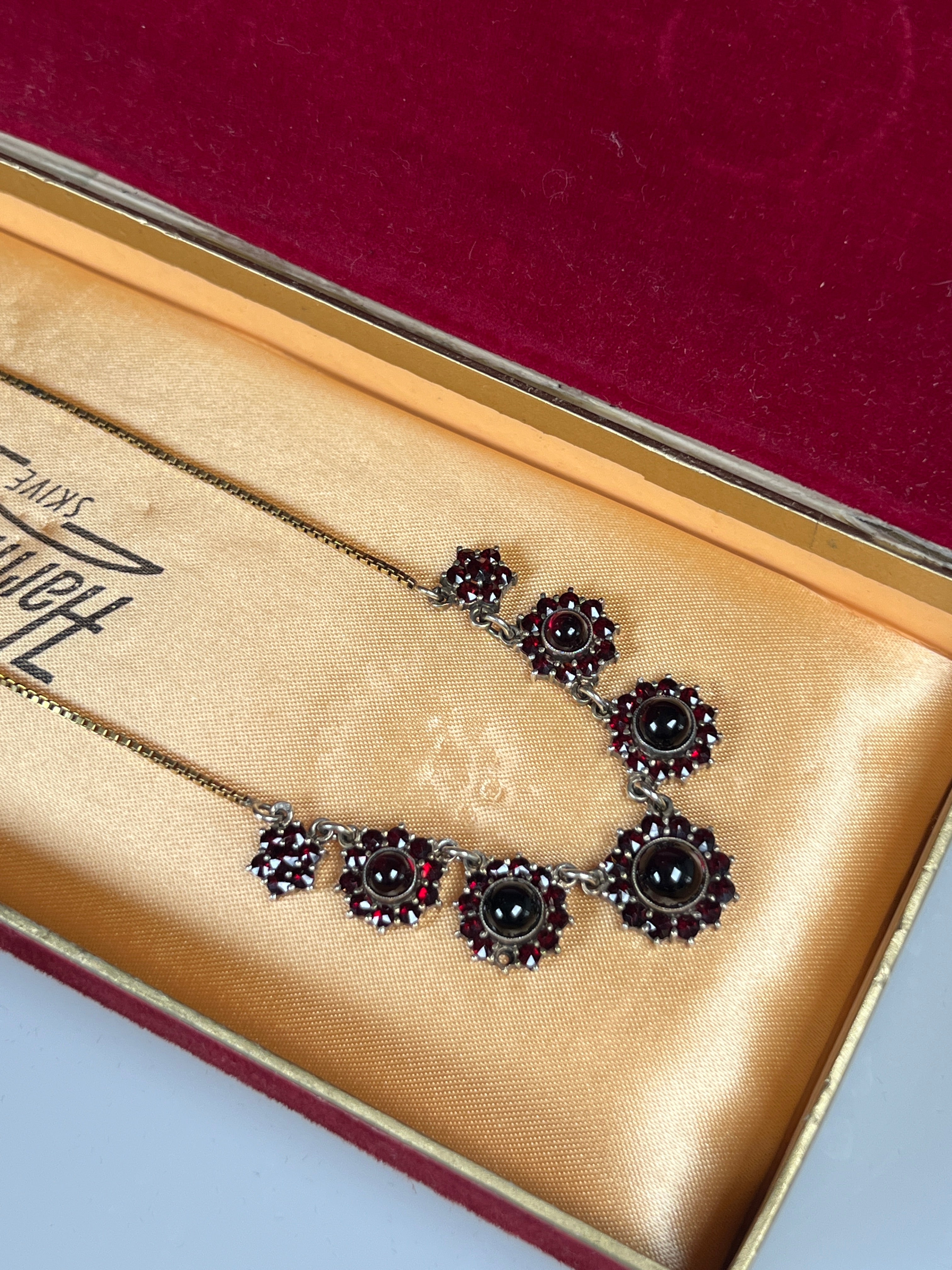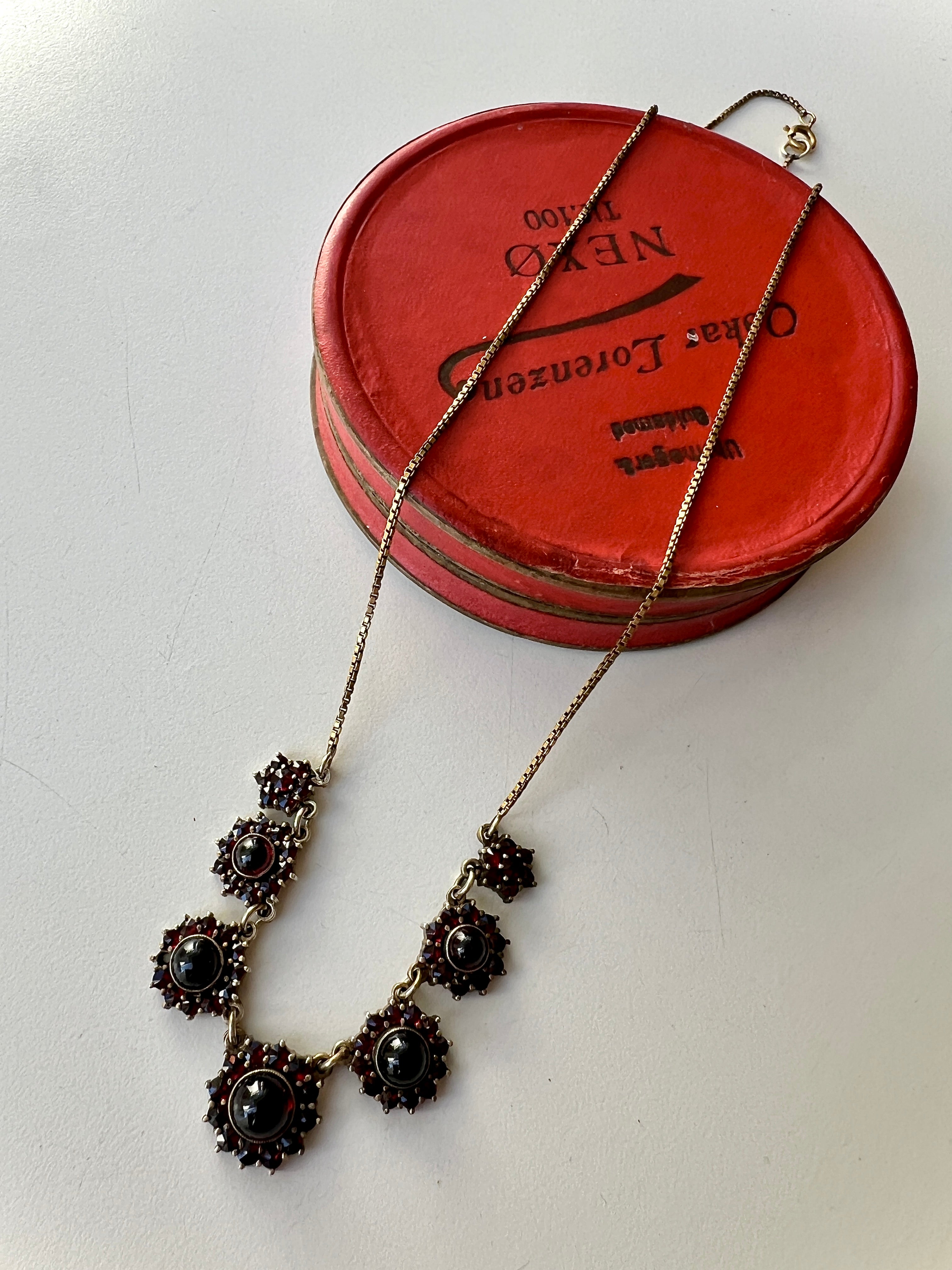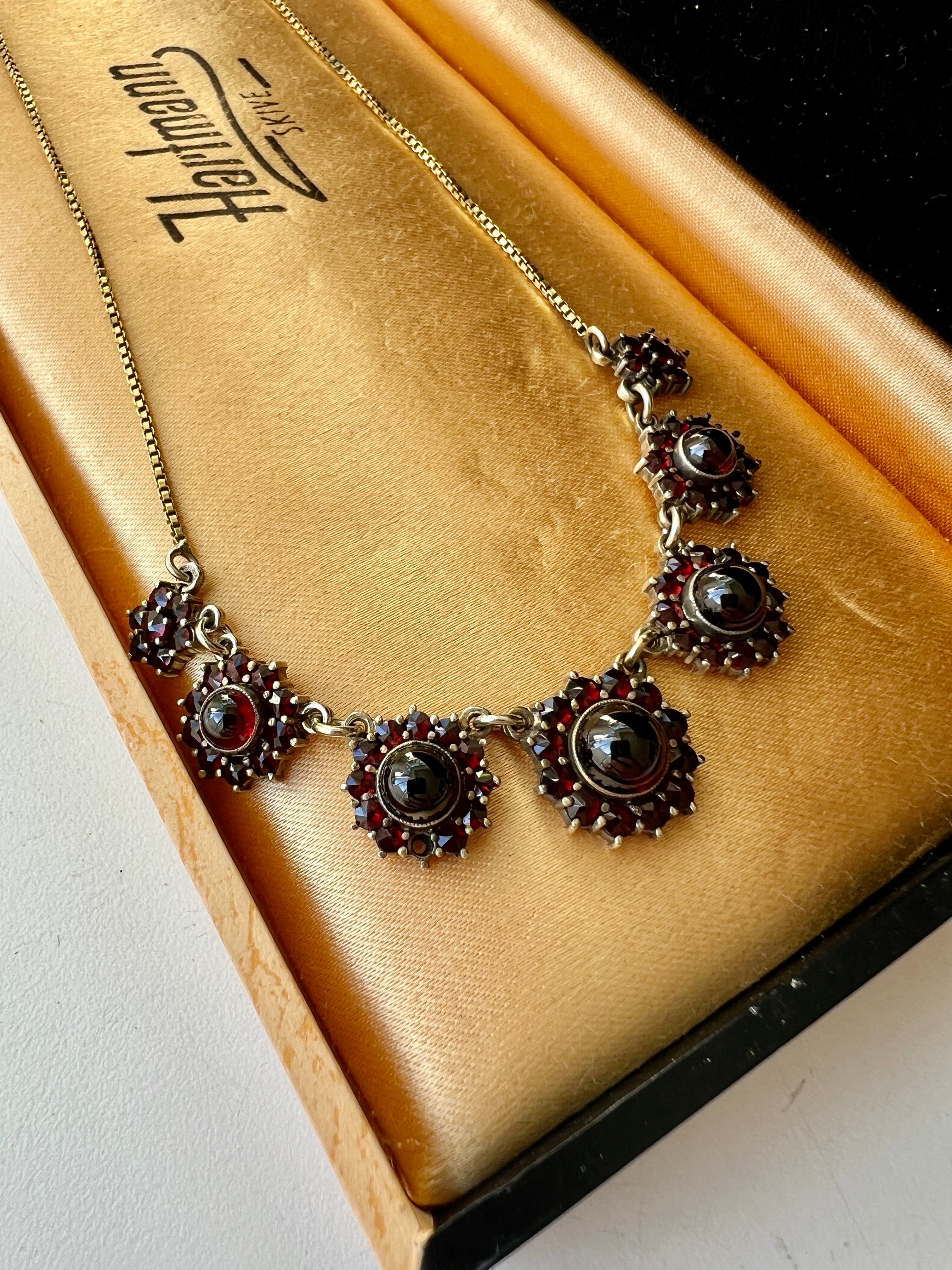 Smuk vintage halskæde med granater. Ny ring i lås - ellers flot.