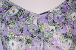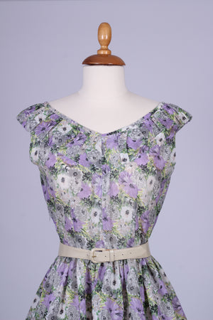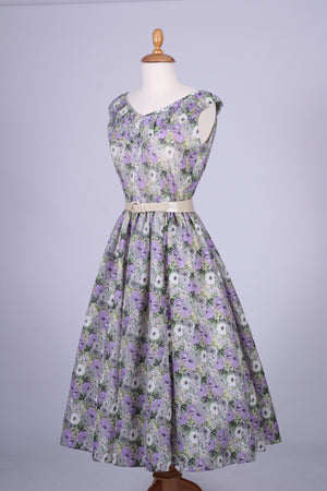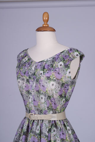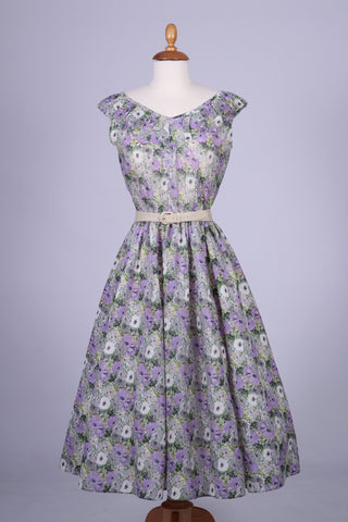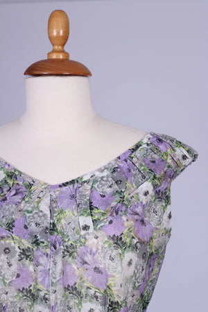 Vintage sommerkjole fra 1950'erne syet i tyndt nylon med blomsterprint i pastelfarver. Kjolen har fin 50'er udskæring, er skåret ved taljen og har skørt med vidde.. Lukkes i siden med lynlås.