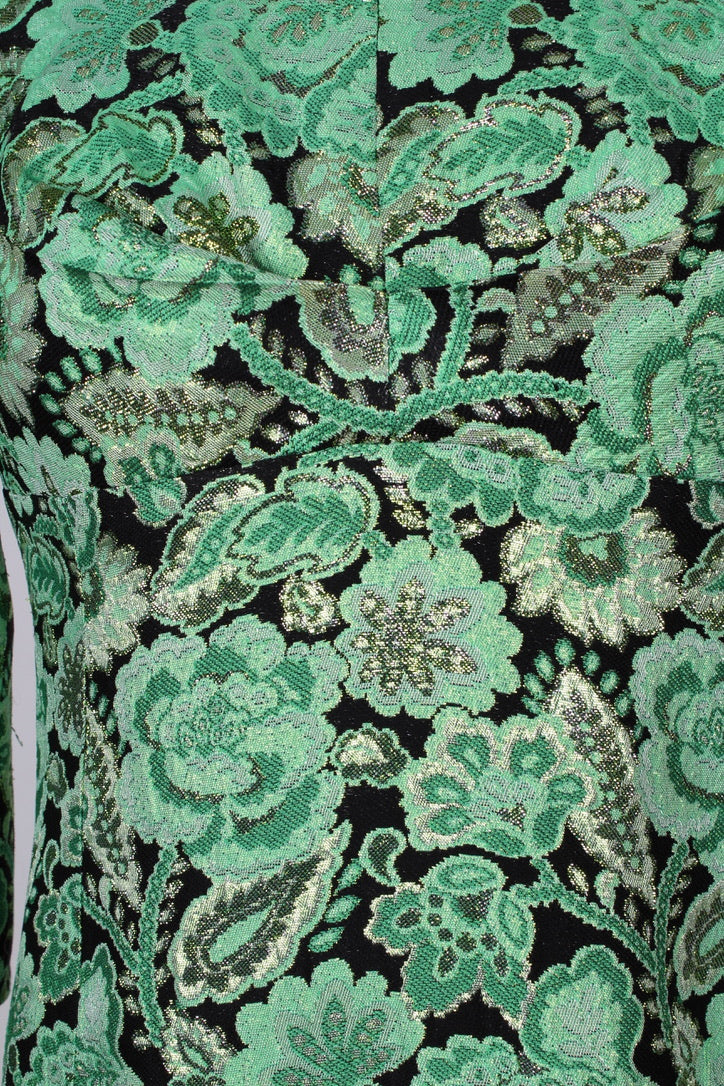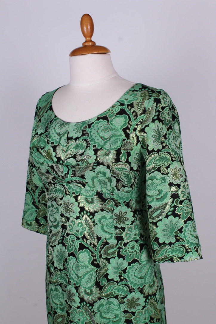 Festkjole / cocktailkjole fra 1960'erne syet i brokadestof med farverne guld, grøn og sort. Kjolen er figursyet, har tre-kvart lange trompetærmer og a-facon skørt. Kjolen er oprindelig købt ved Høltzer, der holdt til i Aarhus.