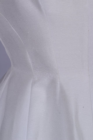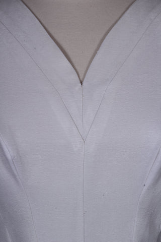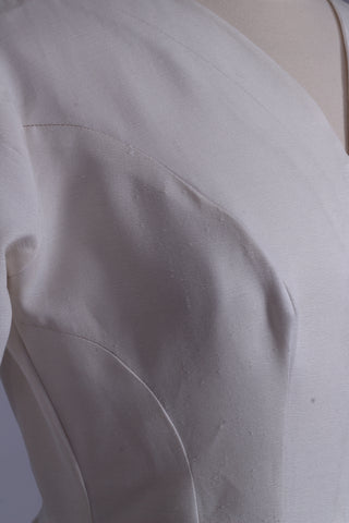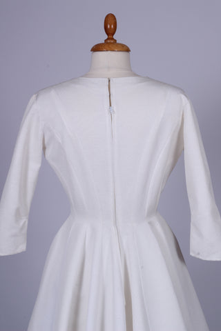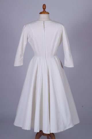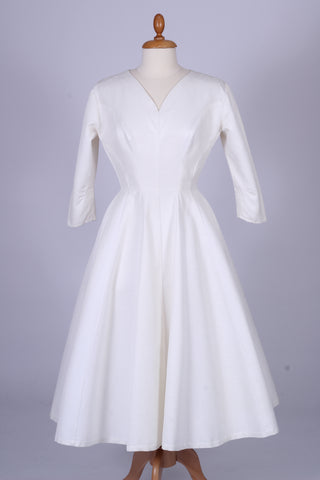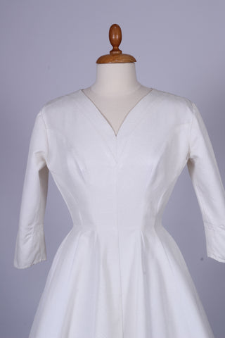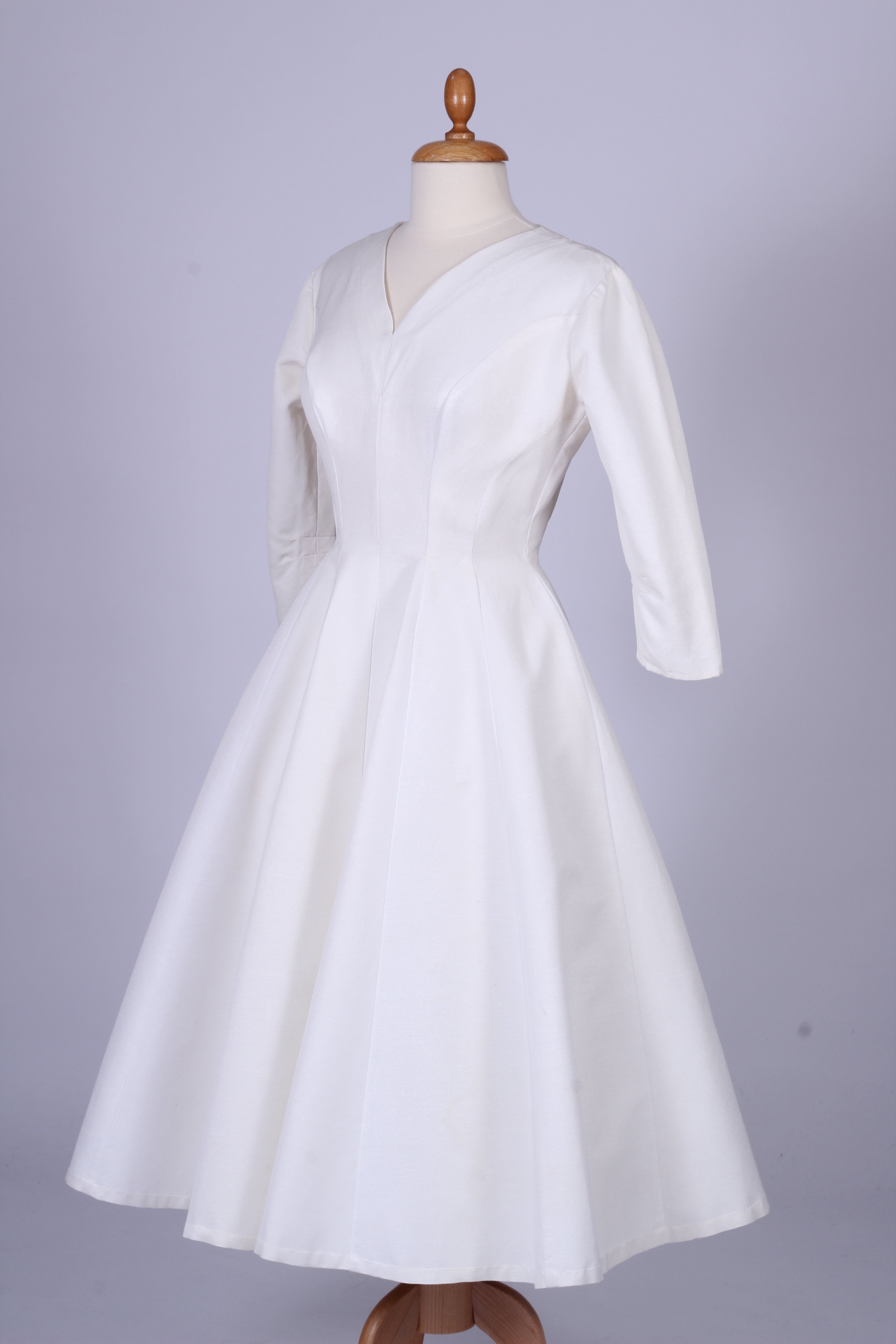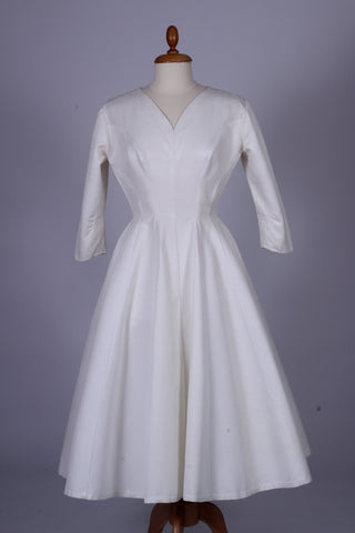 Smuk og helt enkel vintage brudekjole fra 1950'erne syet i kraftigt silkerebs. Kjolen har tre-kvart lange smalle ærmer, er syet i mange baner, har skørt med vidde og den mest elegante halsudskæring. Kjolen lukkes i ryggen med lynlås. Fra DK