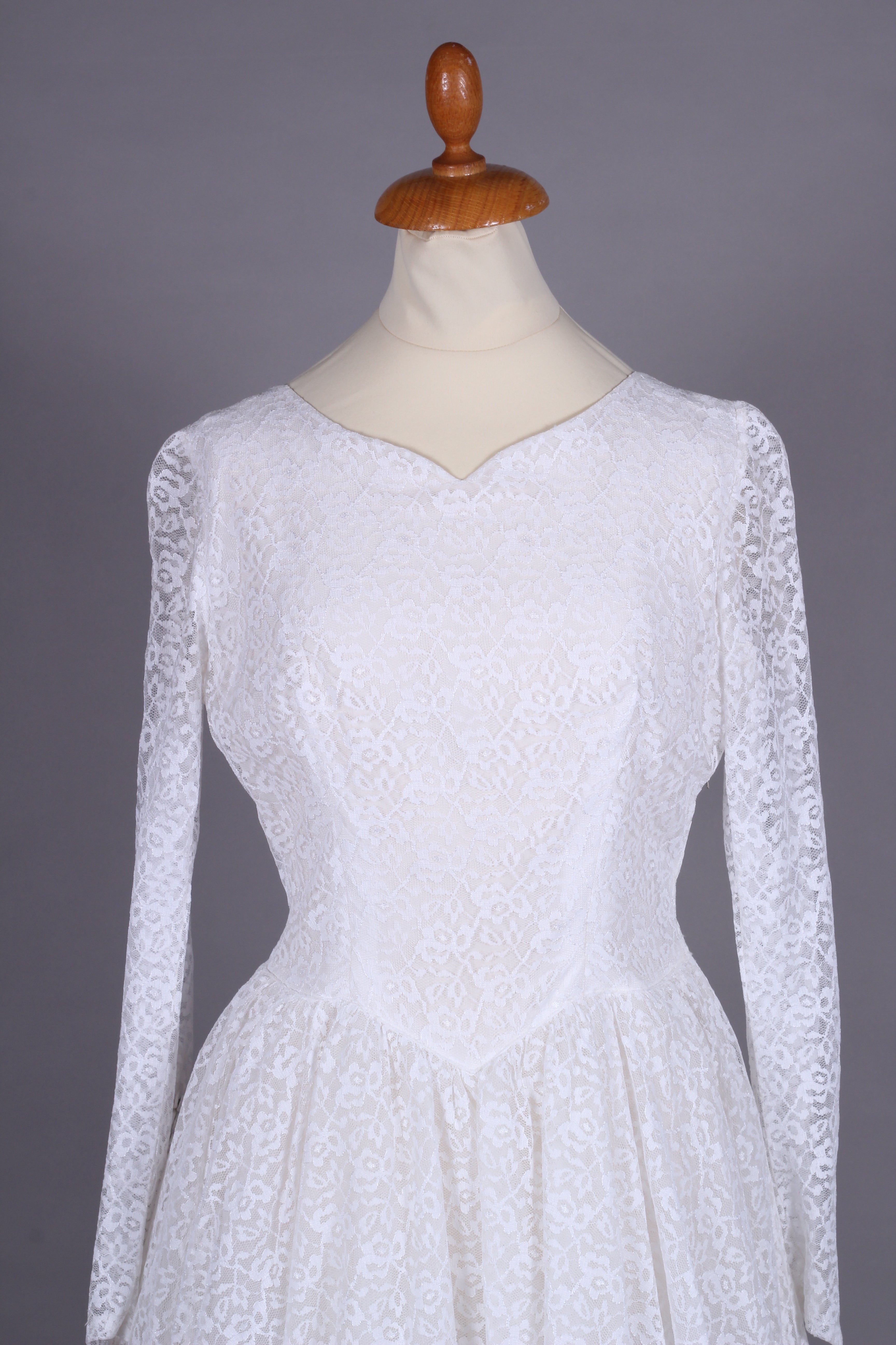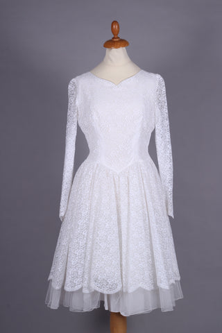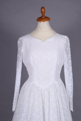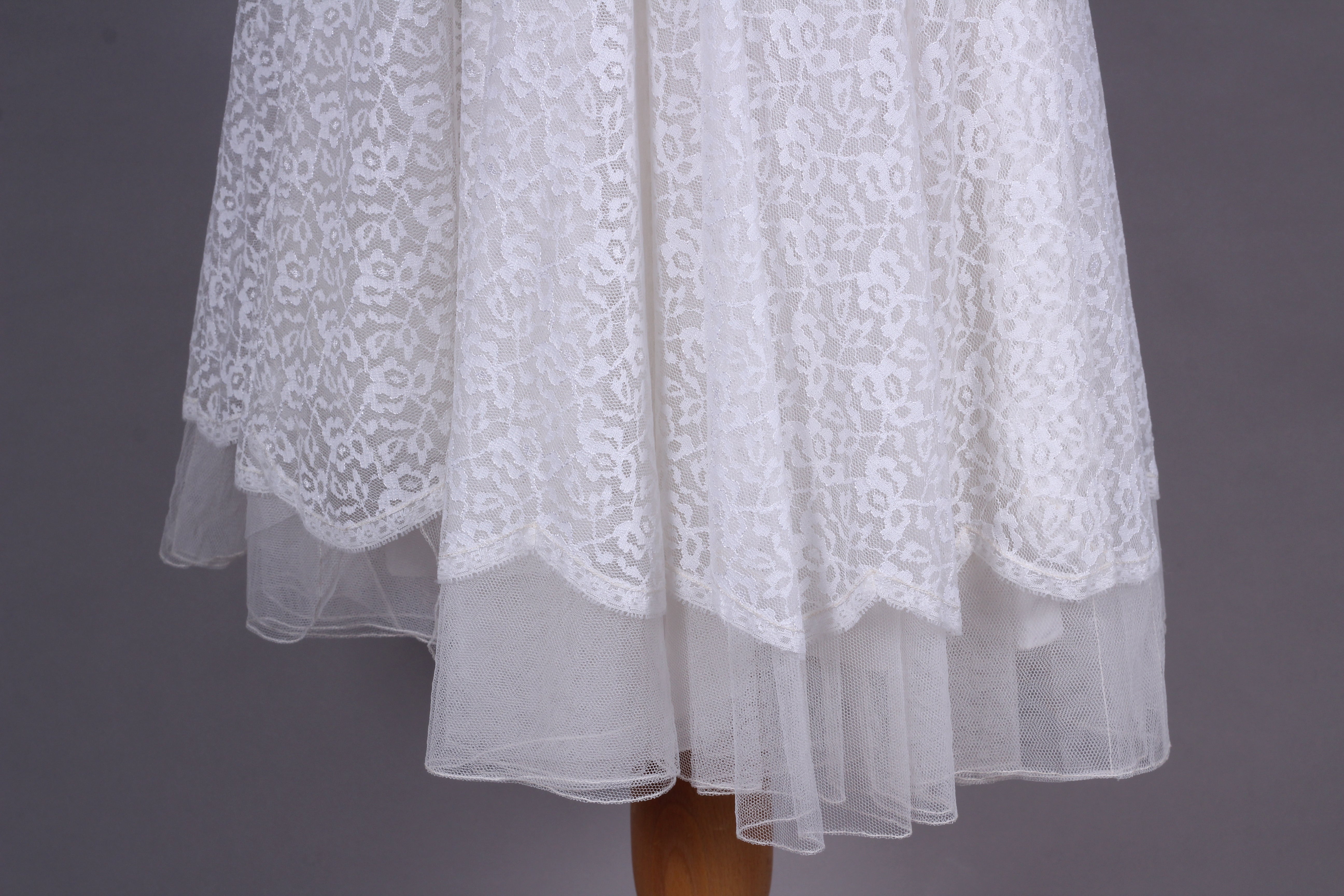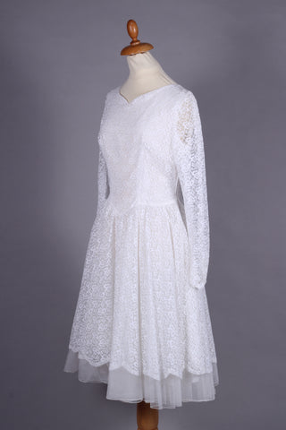 Fin vintage brudekjole fra ca. 1960 syet i hvid blondestof og med tyl forneden af skørtet (kunstfiber af en slags). Kjolen har yndig halsudskæring, er skårte ved taljen med lynås i siden, har lange smalle ærmer der lukkes ved håndled med mange stofbetrukne knapper. Skørtet er med strut og består af satin inderst, et lag ren tyl og yderst blondestof med tyl forneden.