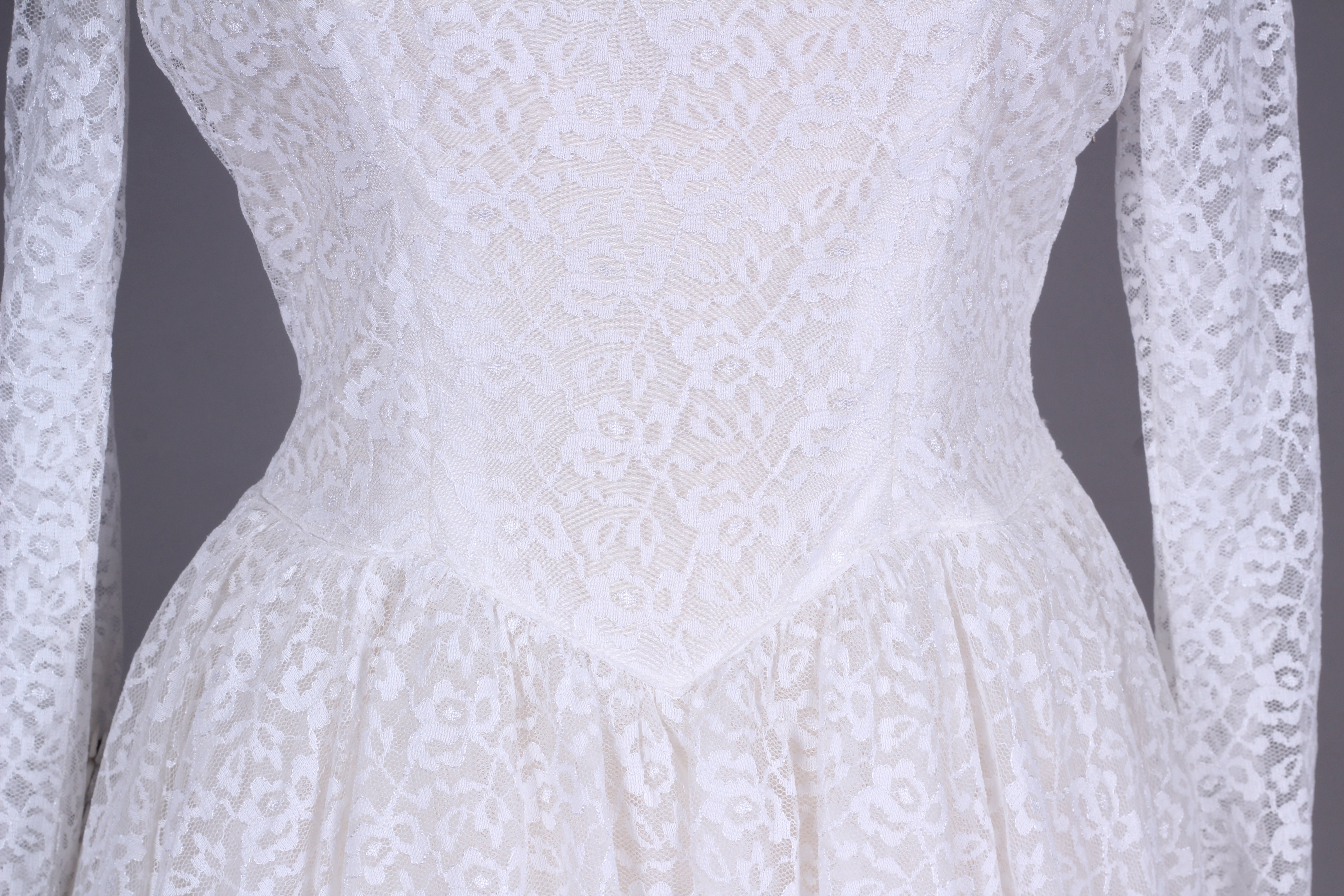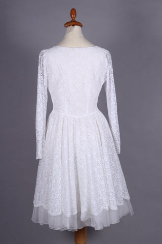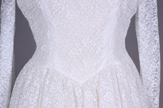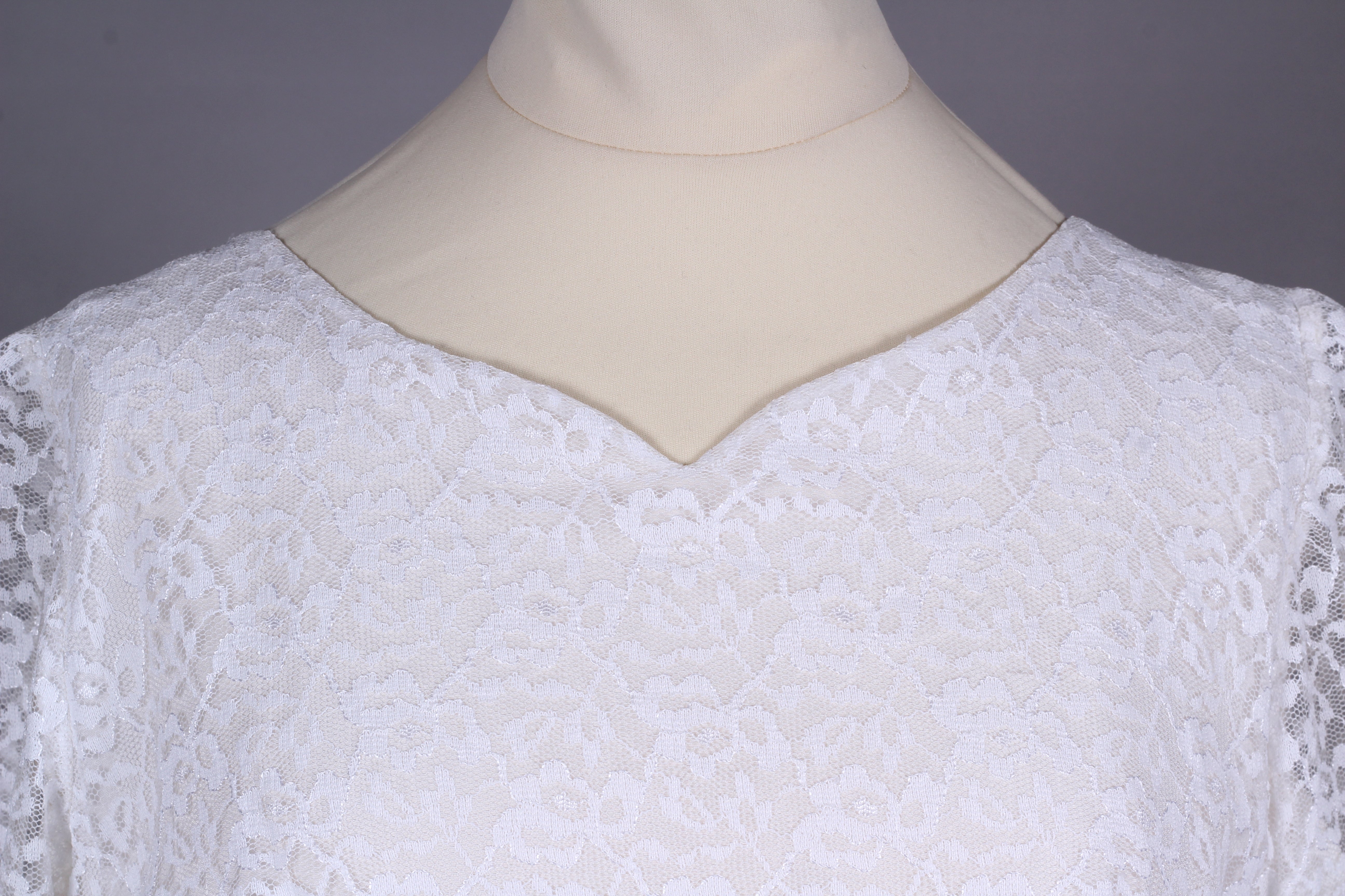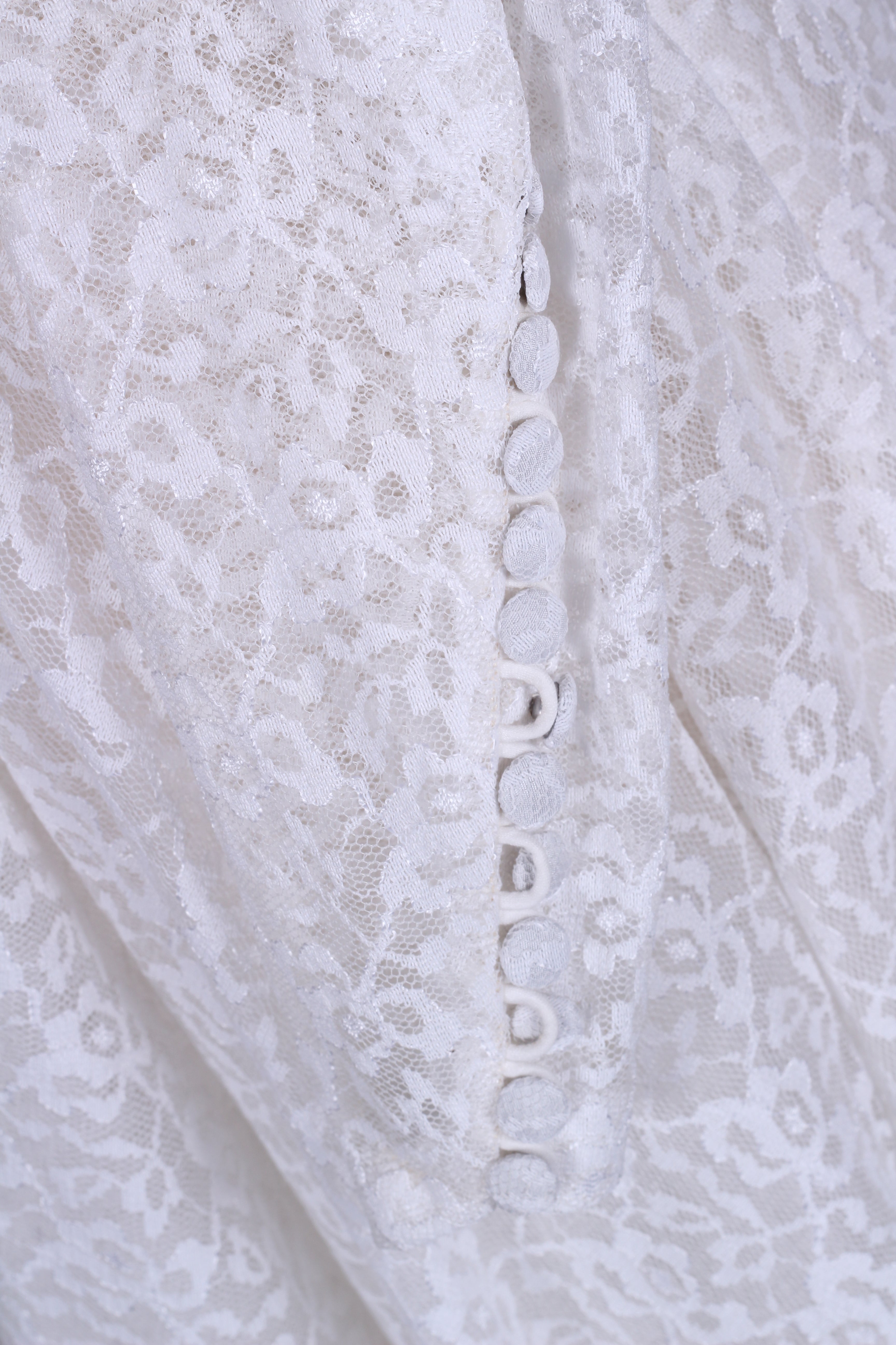 Fin vintage brudekjole fra ca. 1960 syet i hvid blondestof og med tyl forneden af skørtet (kunstfiber af en slags). Kjolen har yndig halsudskæring, er skårte ved taljen med lynås i siden, har lange smalle ærmer der lukkes ved håndled med mange stofbetrukne knapper. Skørtet er med strut og består af satin inderst, et lag ren tyl og yderst blondestof med tyl forneden.