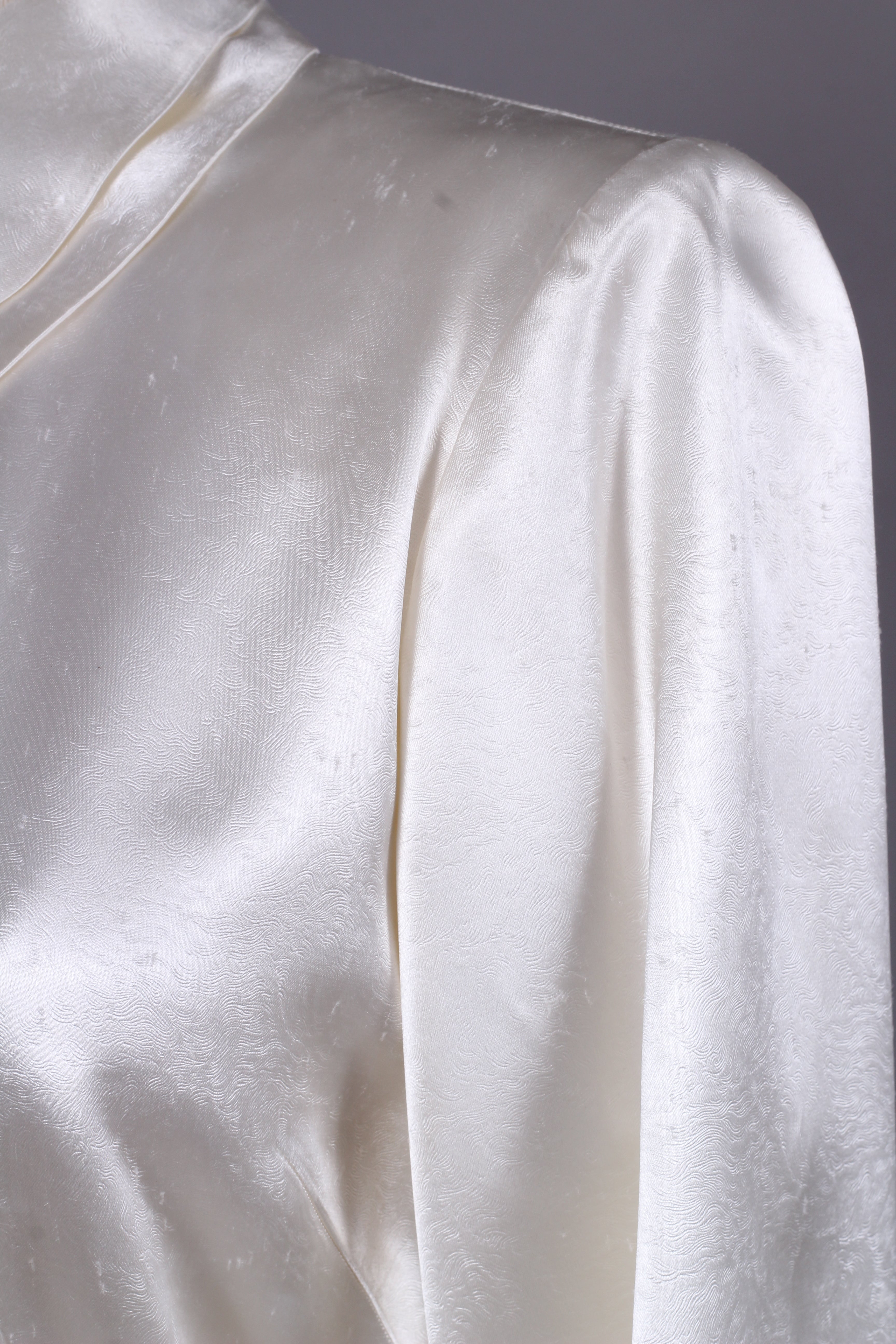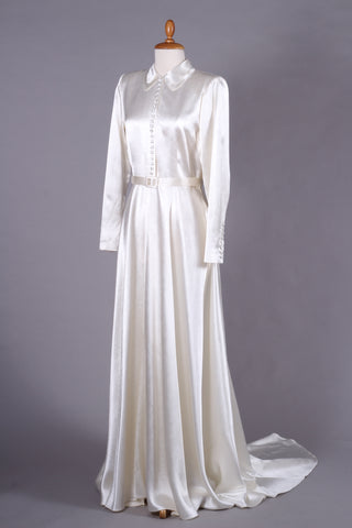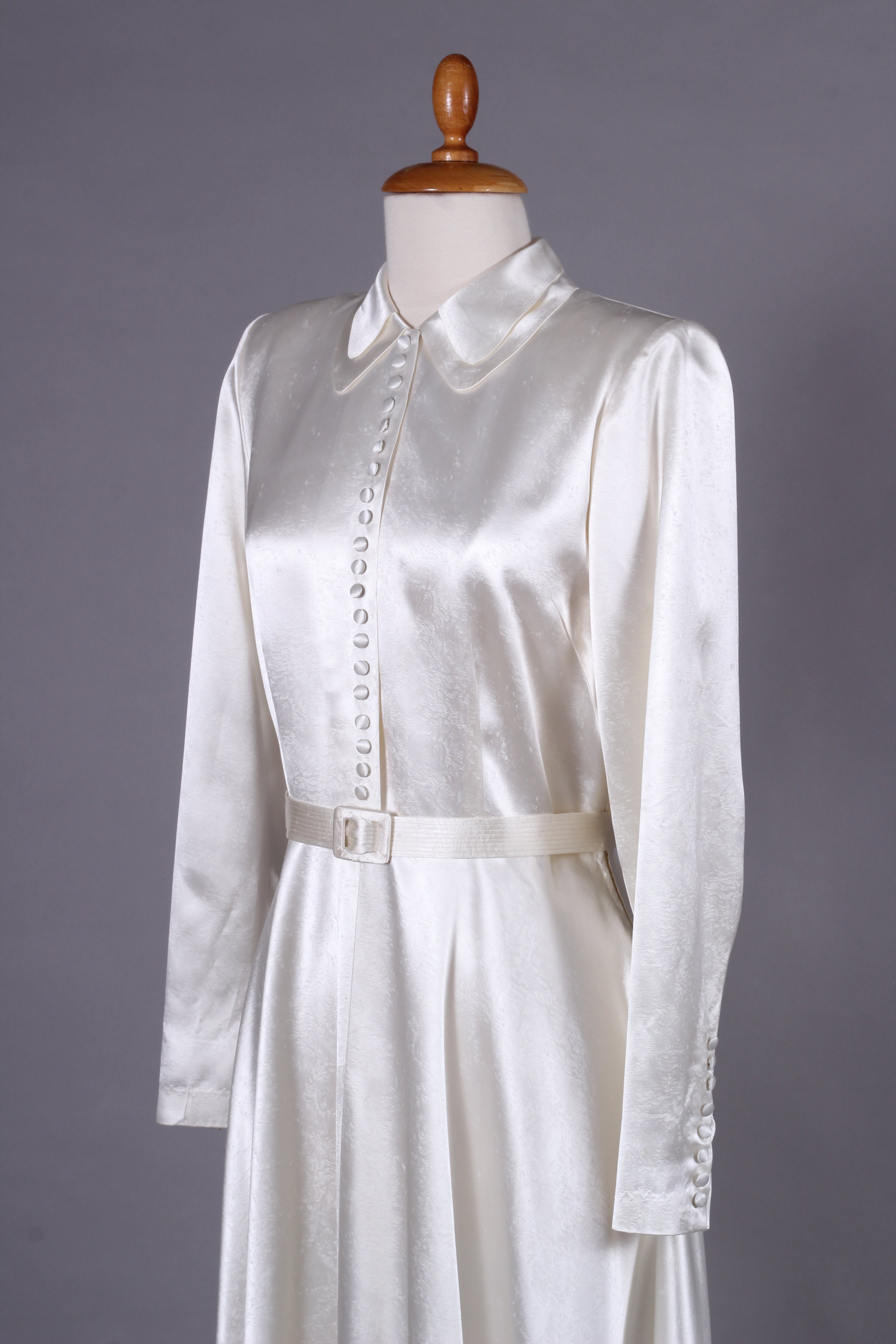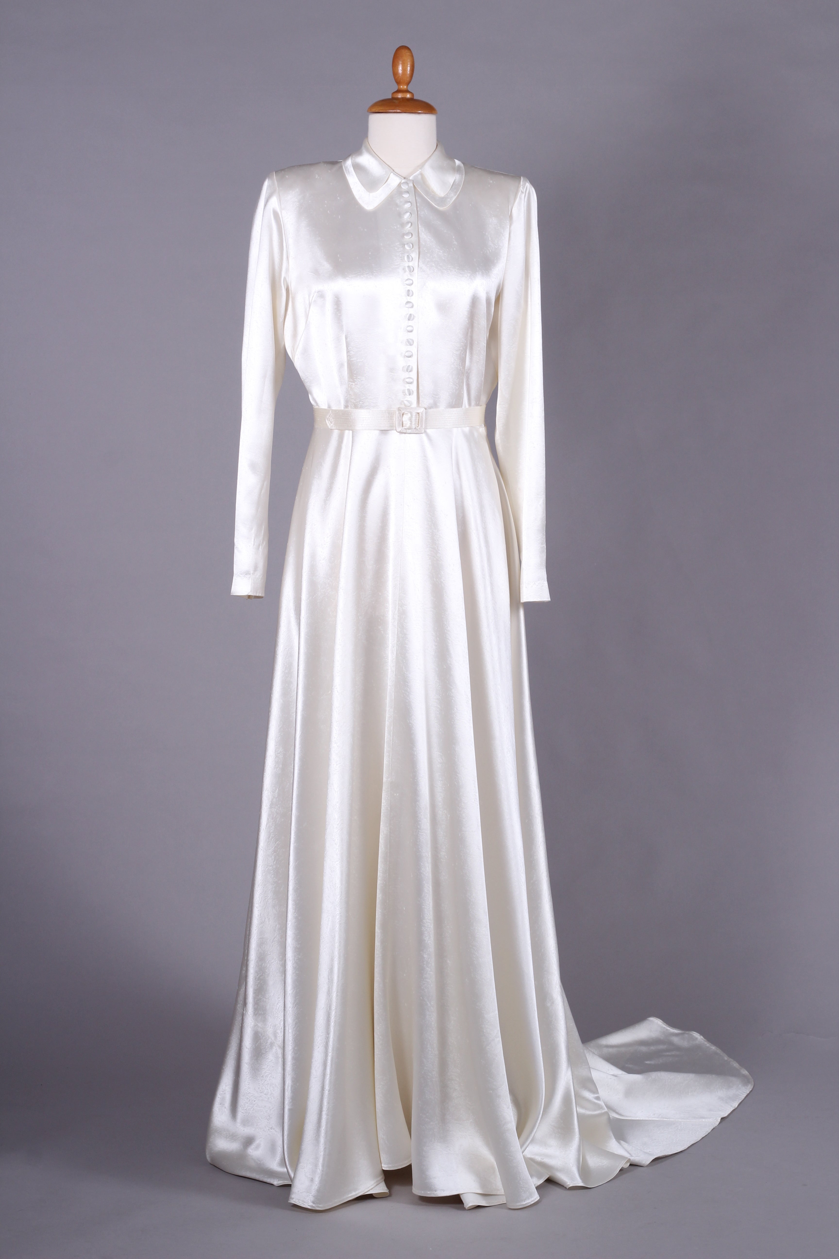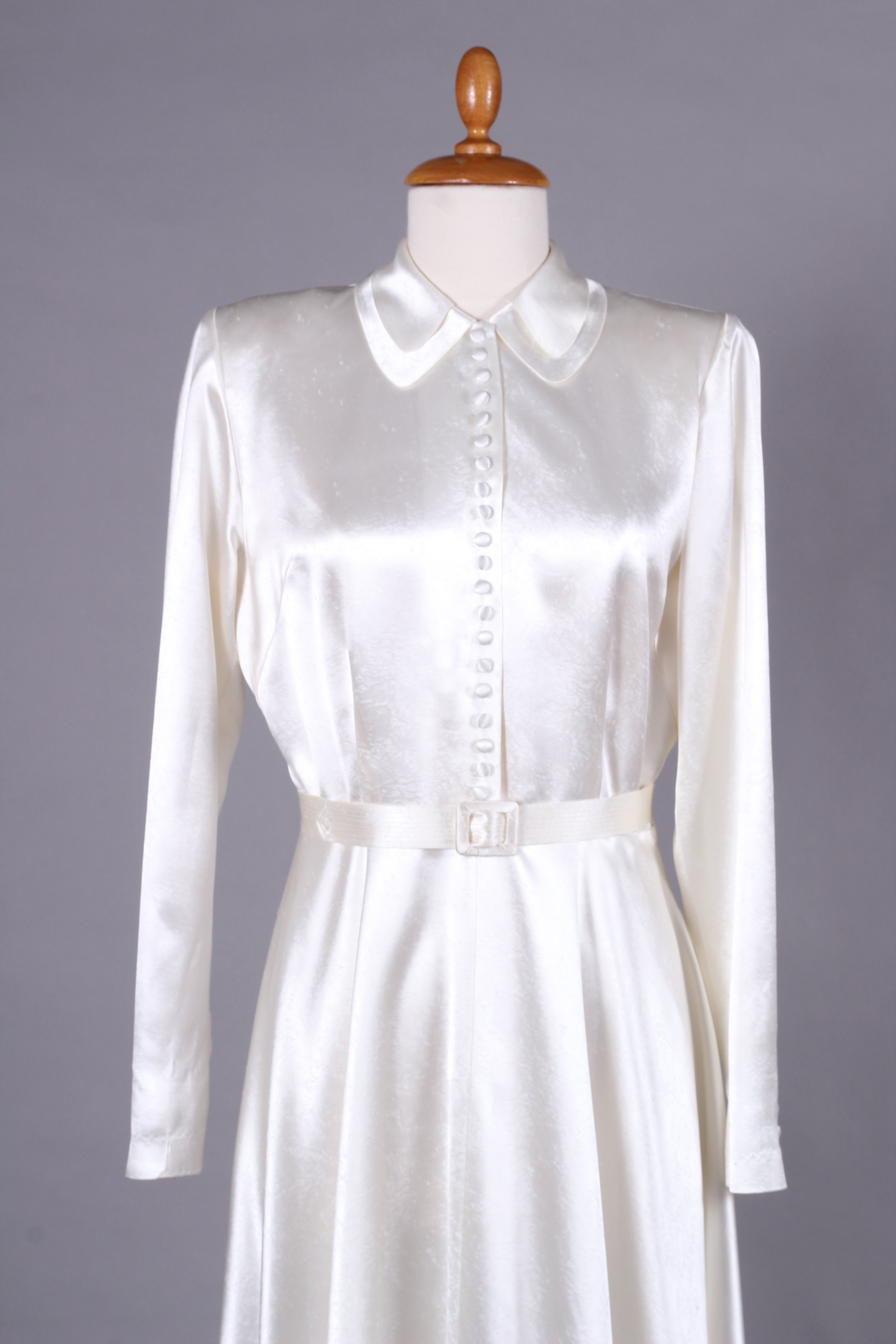Meget flot vintage brudekjole fra ca. slut 40'erne / beg. 50'erne syet i silkeduchesse med præget mønster. Kjolen har markerede skuldre med små skulderpuder, knapper ned fortil (uniformsagtig) dobbelt krave, bælte ved taljen og skørt med masser af vidder der falder tungt.