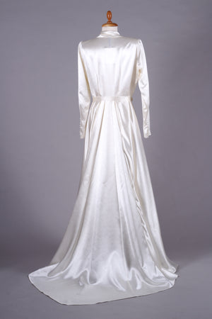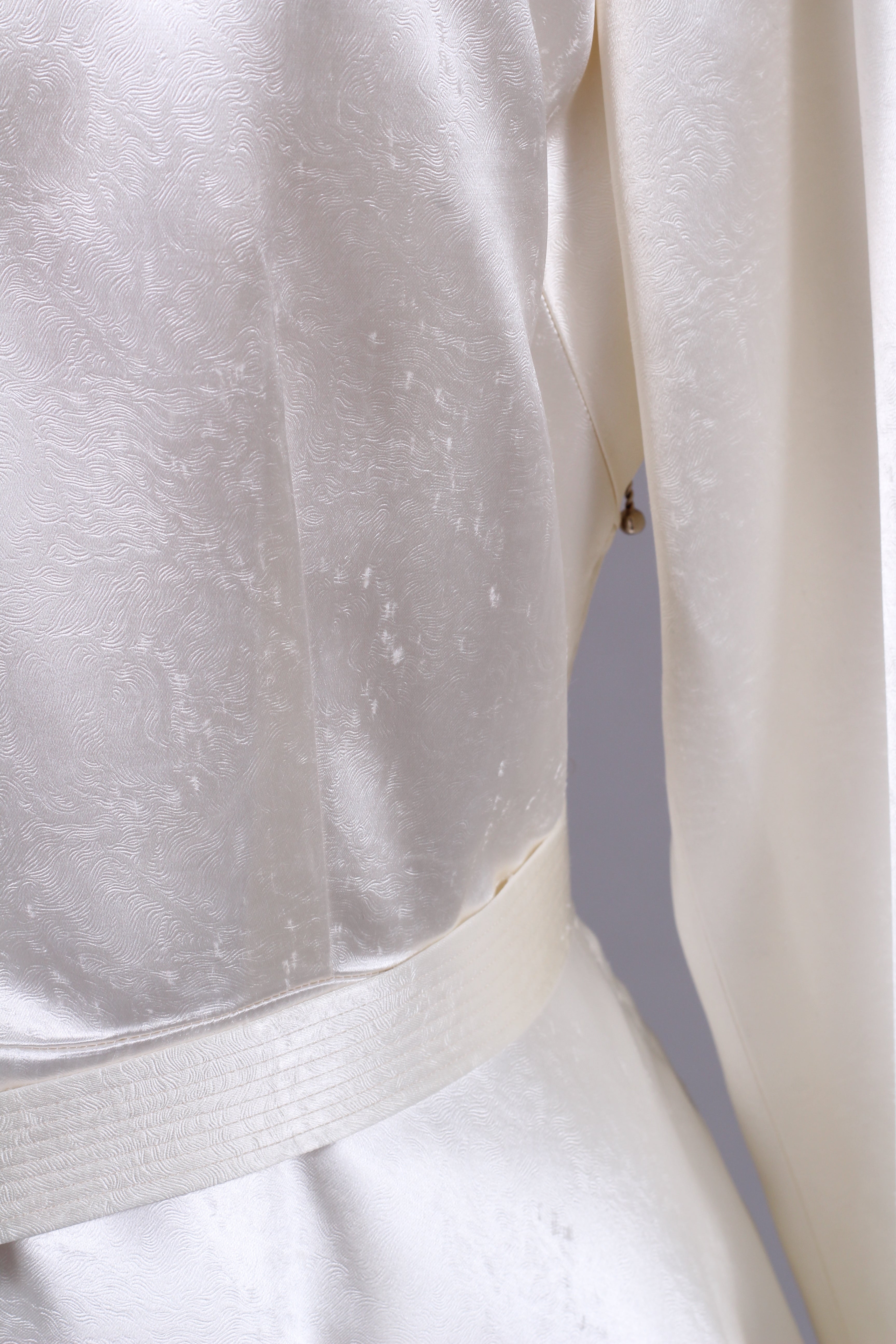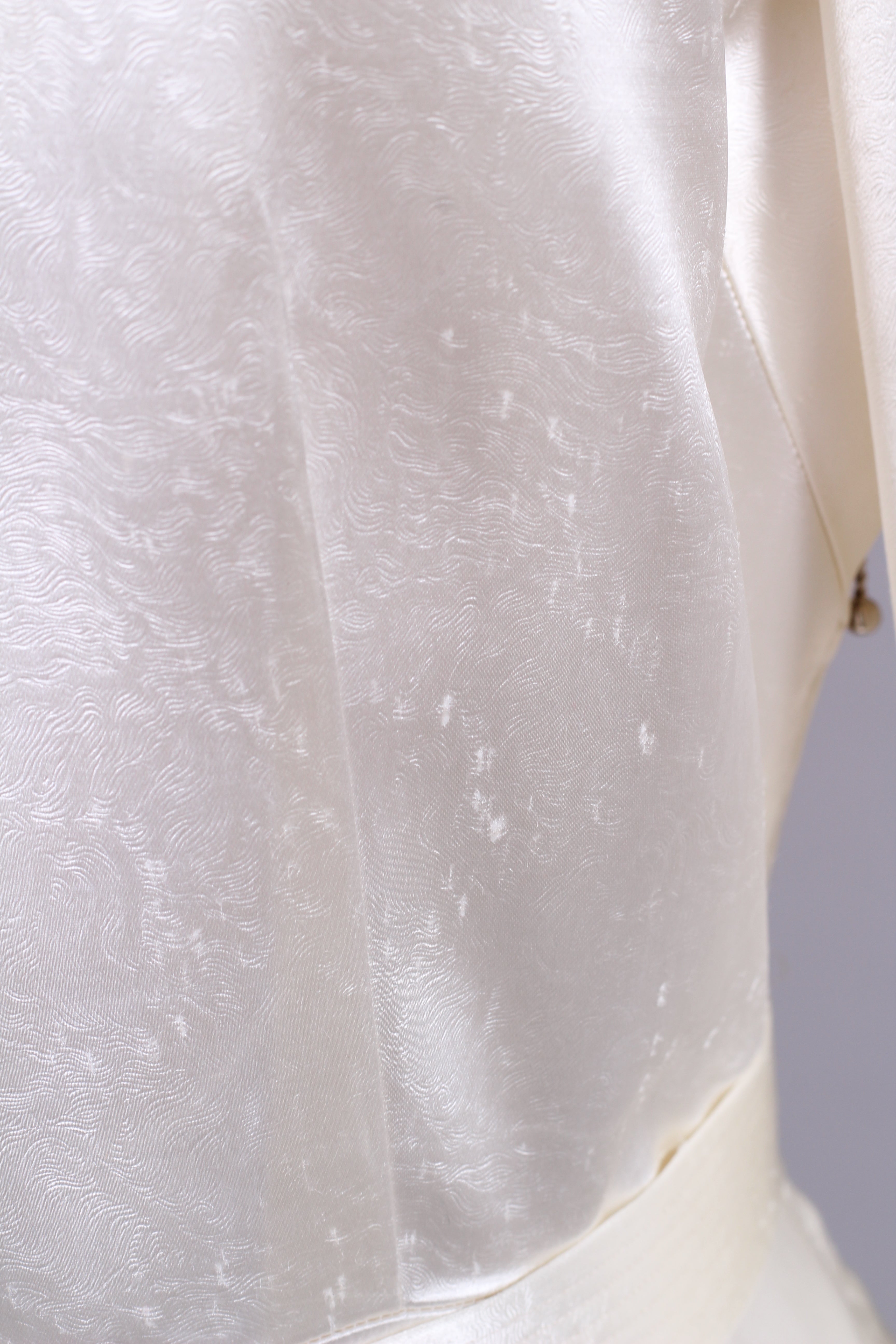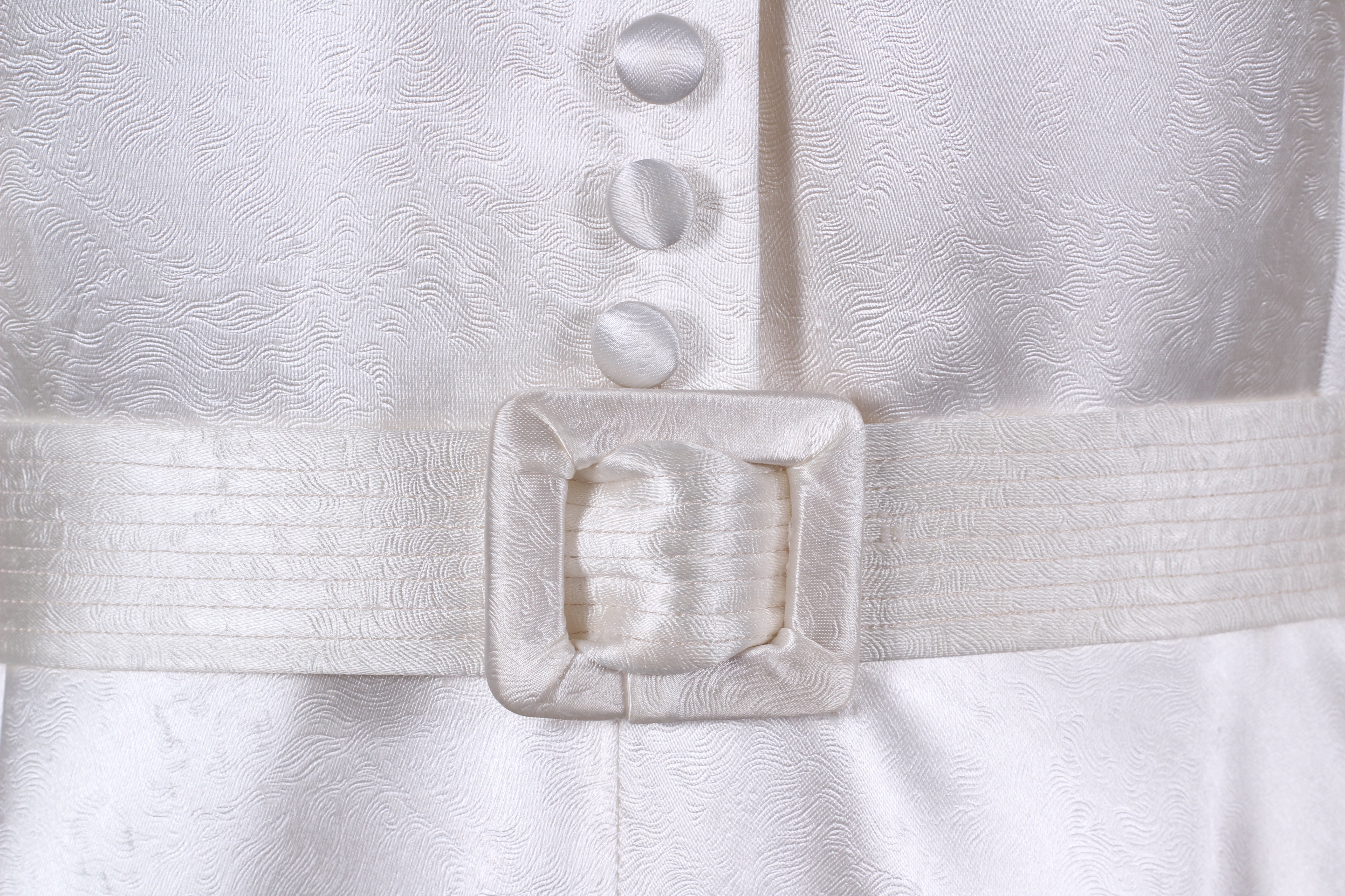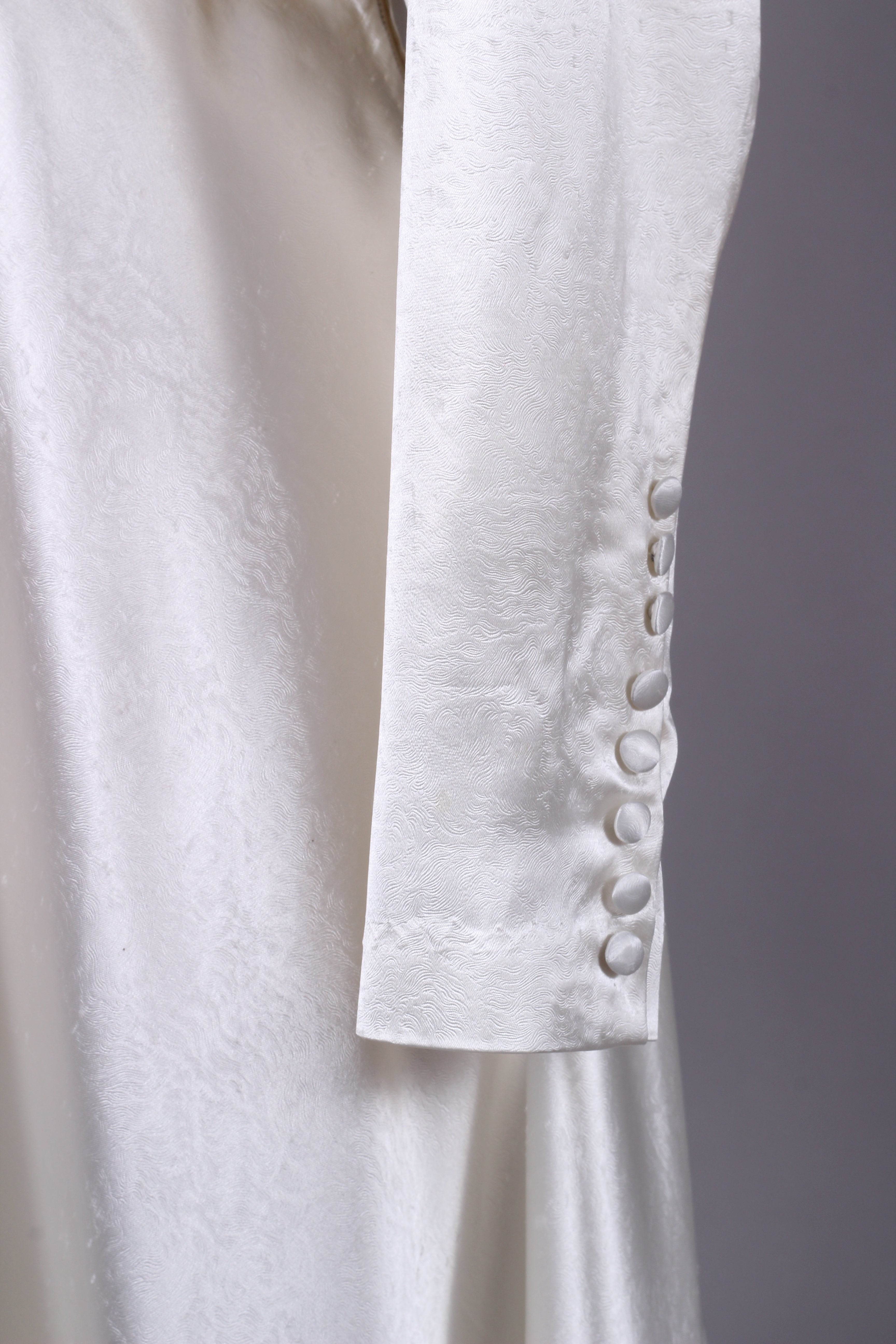 Meget flot vintage brudekjole fra ca. slut 40'erne / beg. 50'erne syet i silkeduchesse med præget mønster. Kjolen har markerede skuldre med små skulderpuder, knapper ned fortil (uniformsagtig) dobbelt krave, bælte ved taljen og skørt med masser af vidder der falder tungt.