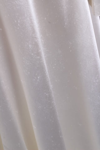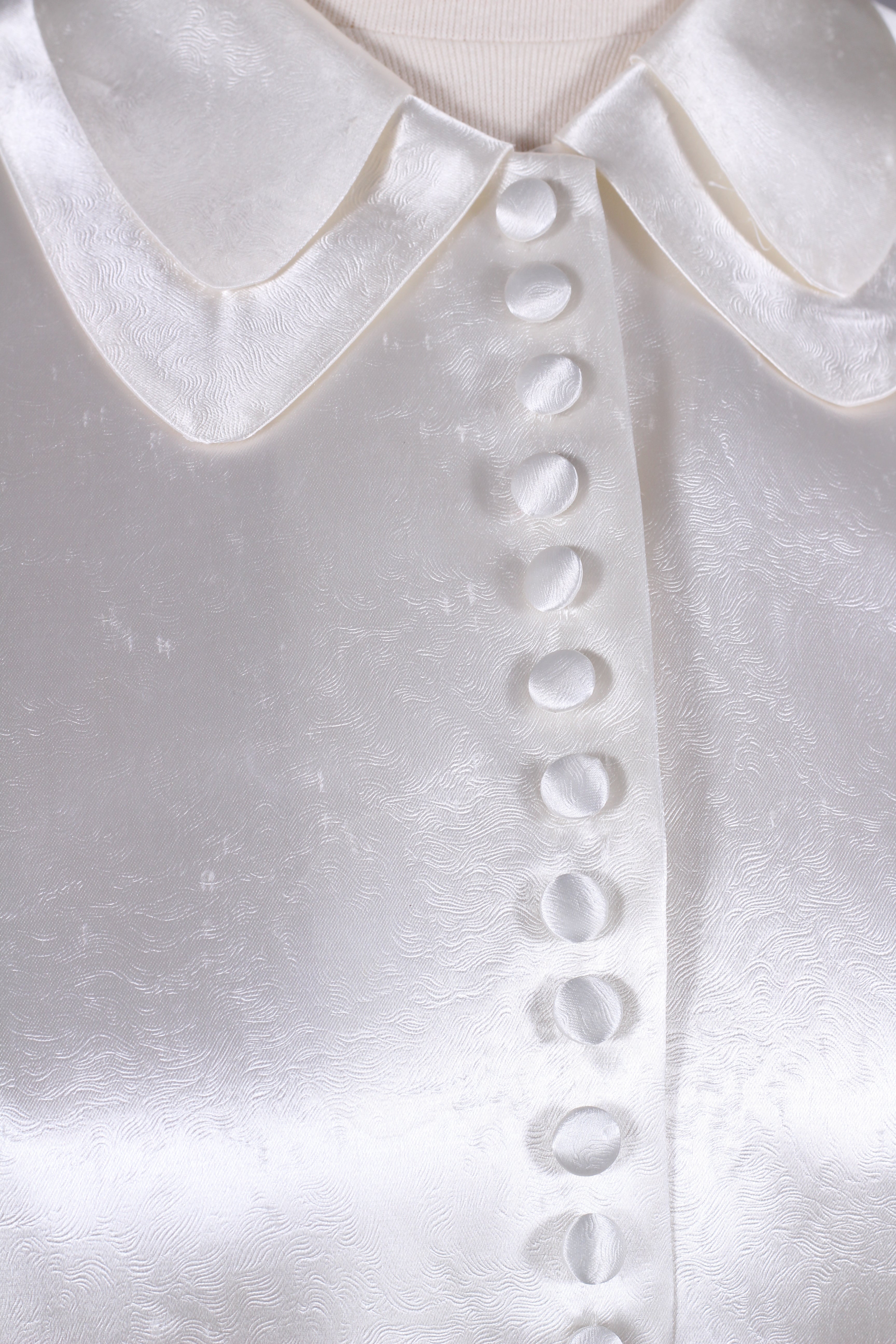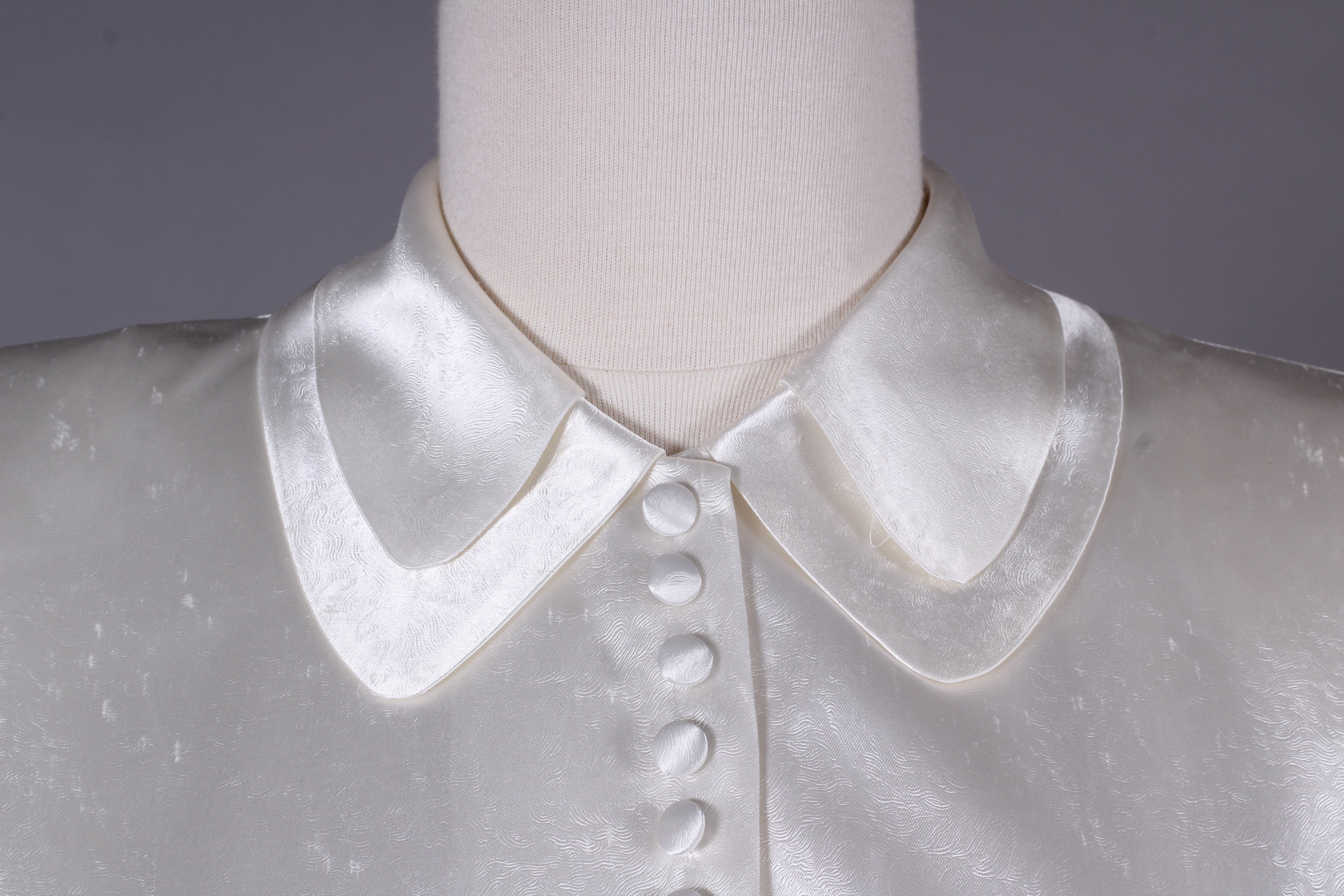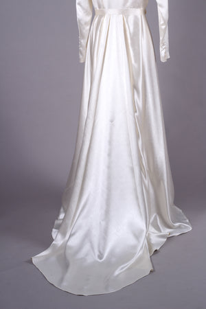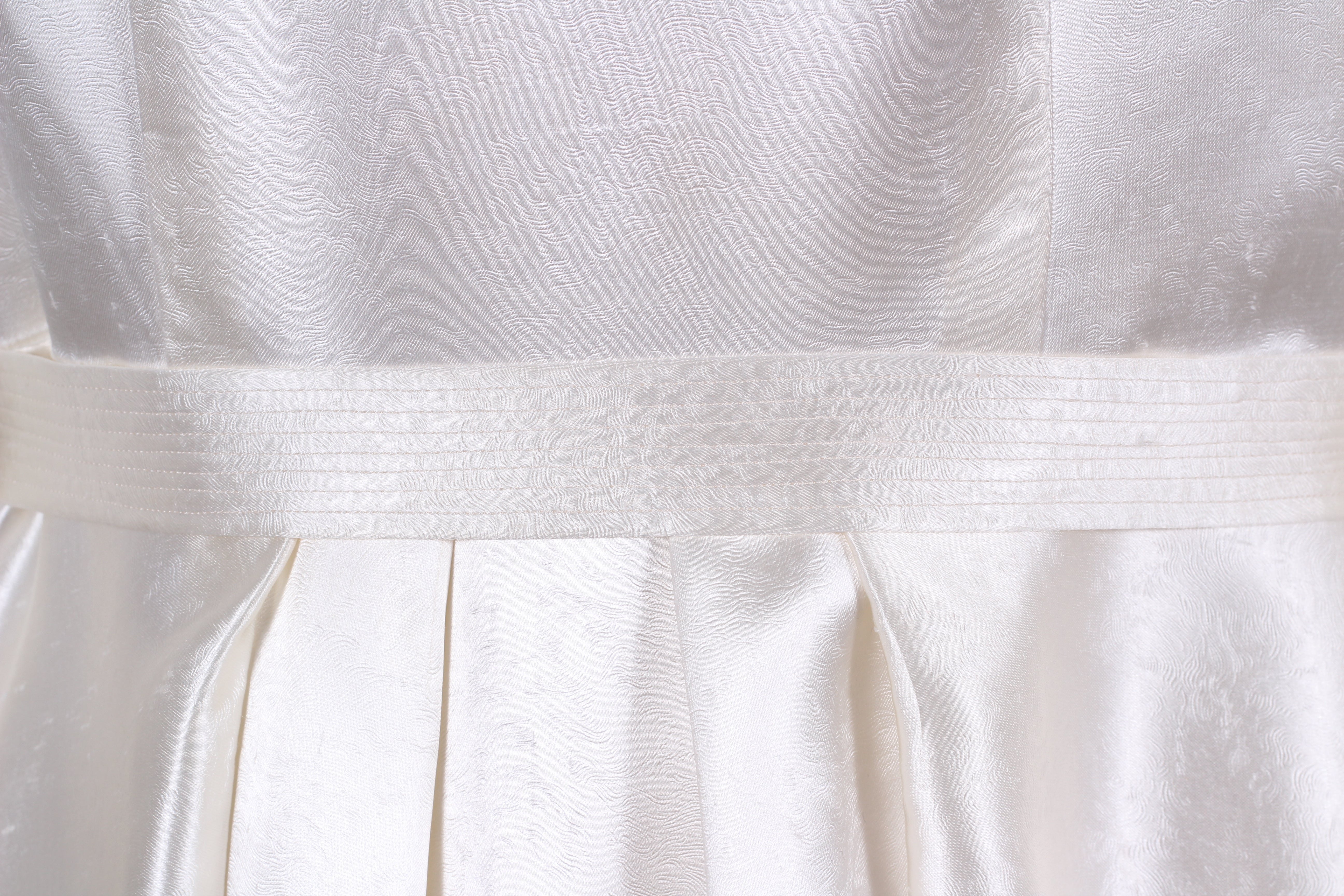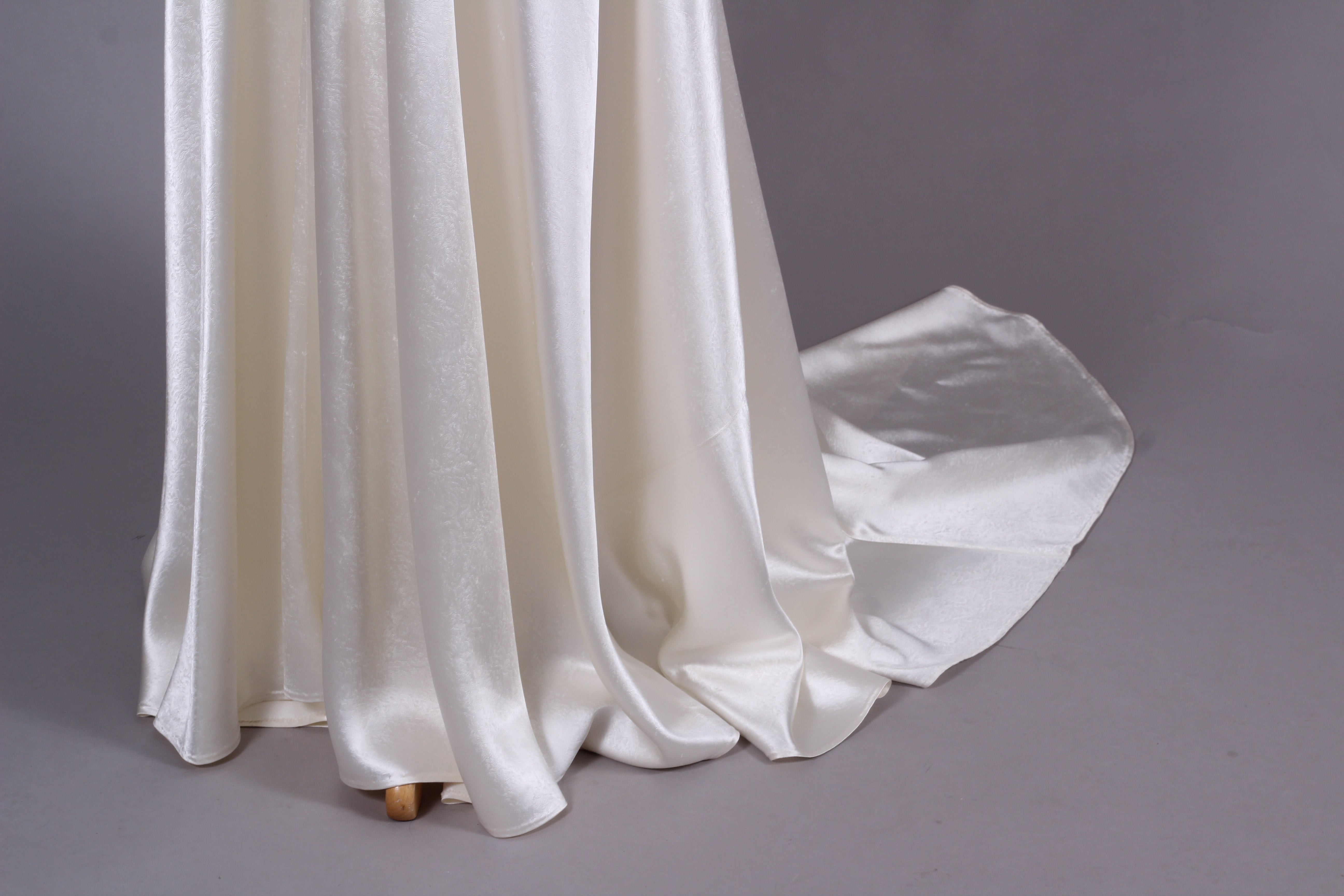Meget flot vintage brudekjole fra ca. slut 40'erne / beg. 50'erne syet i silkeduchesse med præget mønster. Kjolen har markerede skuldre med små skulderpuder, knapper ned fortil (uniformsagtig) dobbelt krave, bælte ved taljen og skørt med masser af vidder der falder tungt.