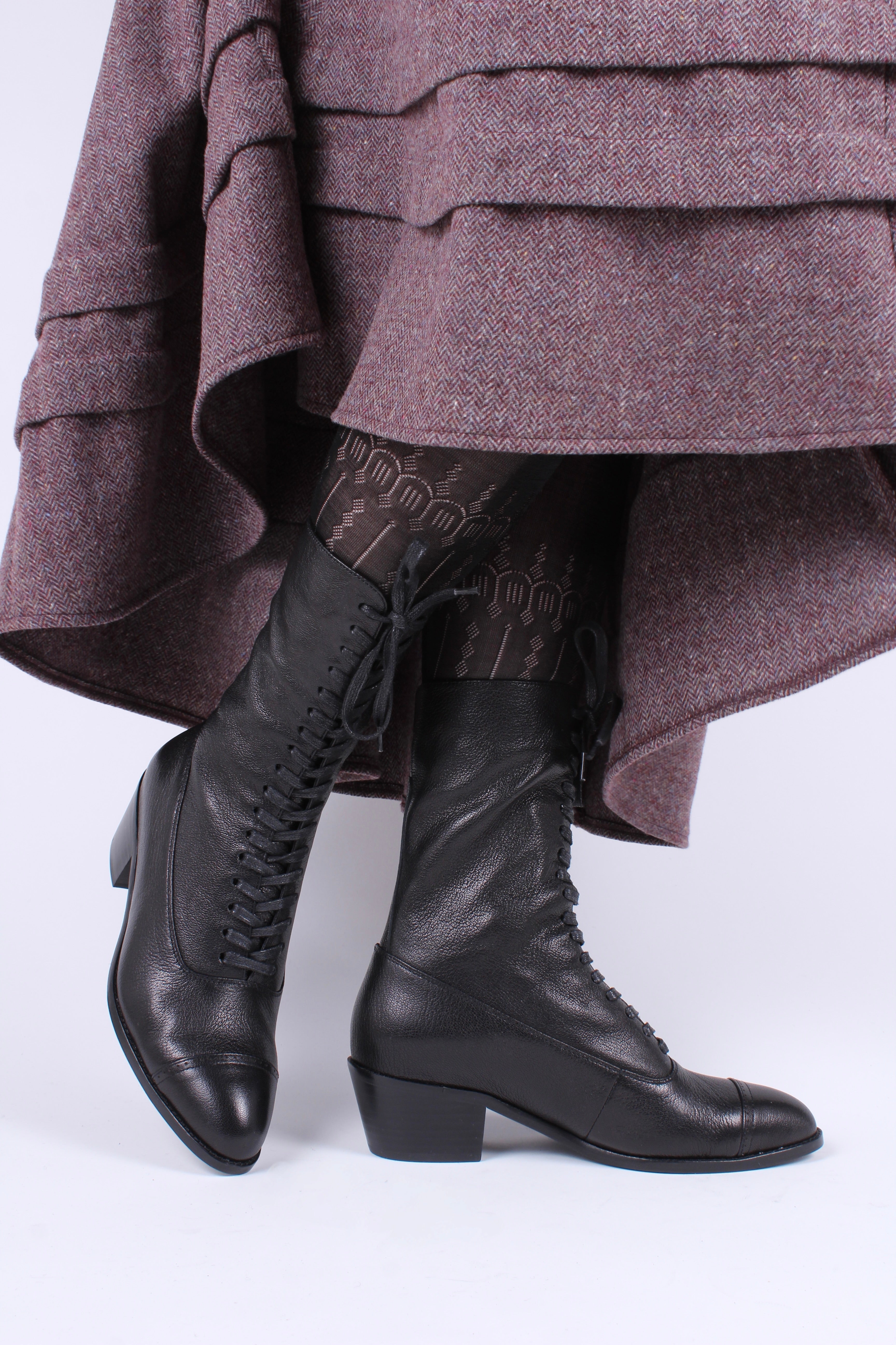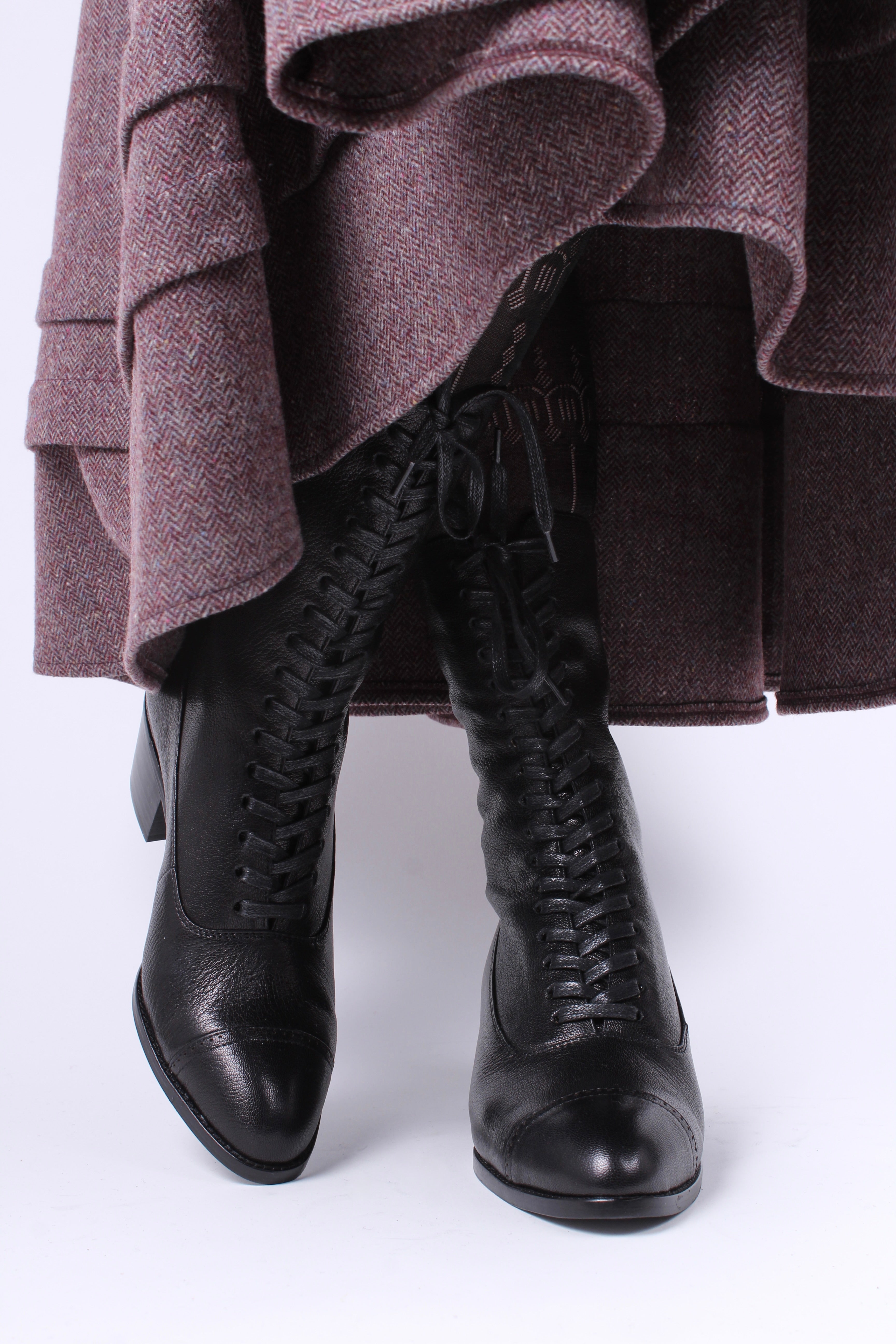 Støvlerne er typiske for for den Edwardianske periode (1890-1920) med langt tætsiddende snøret støvleskaft og spids snude. Støvlen har en 5,3 cm medium høj praktisk hæl. Indvendig er der foer af lærred og lædersåler - ligesom ved originale støvler fra denne periode.