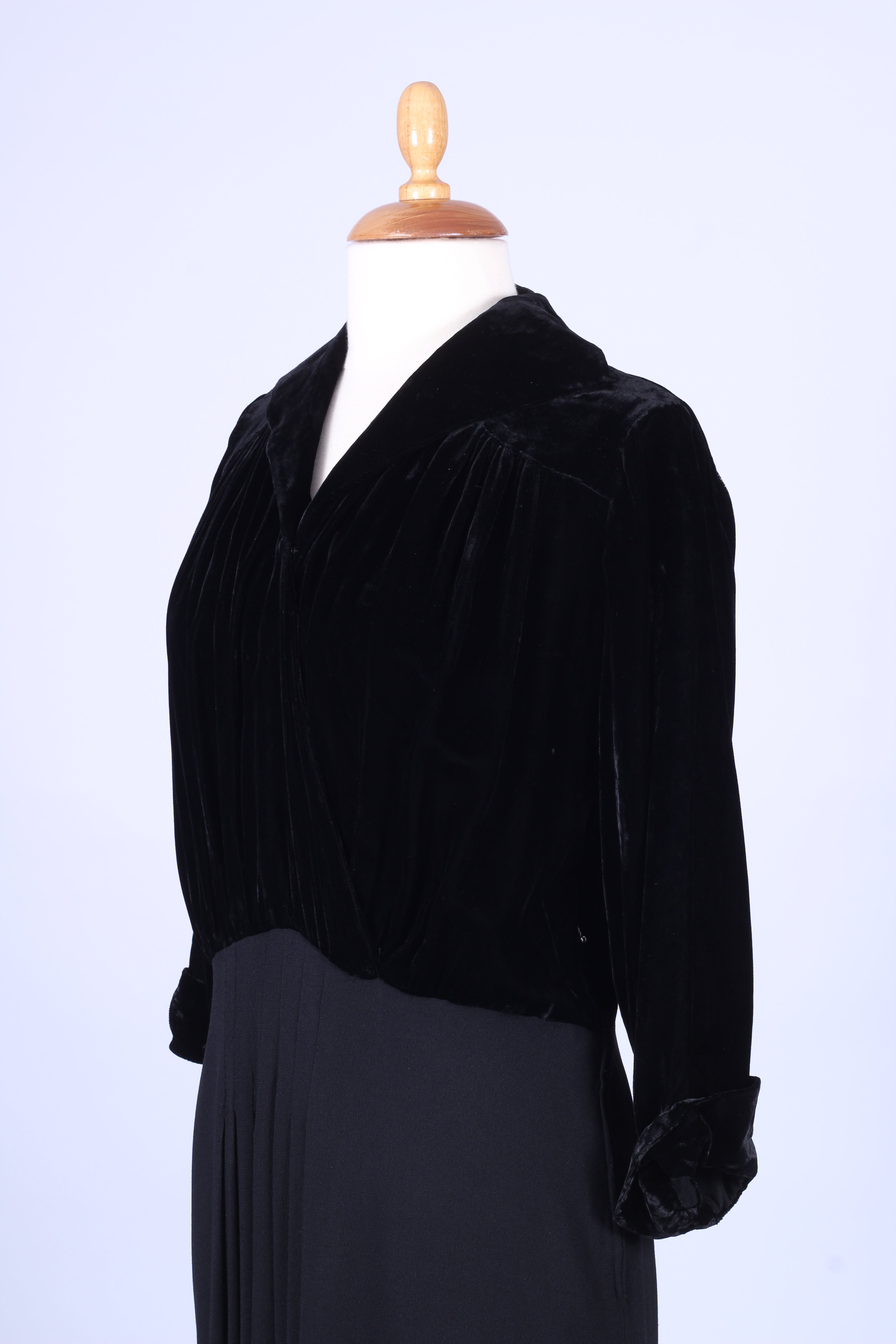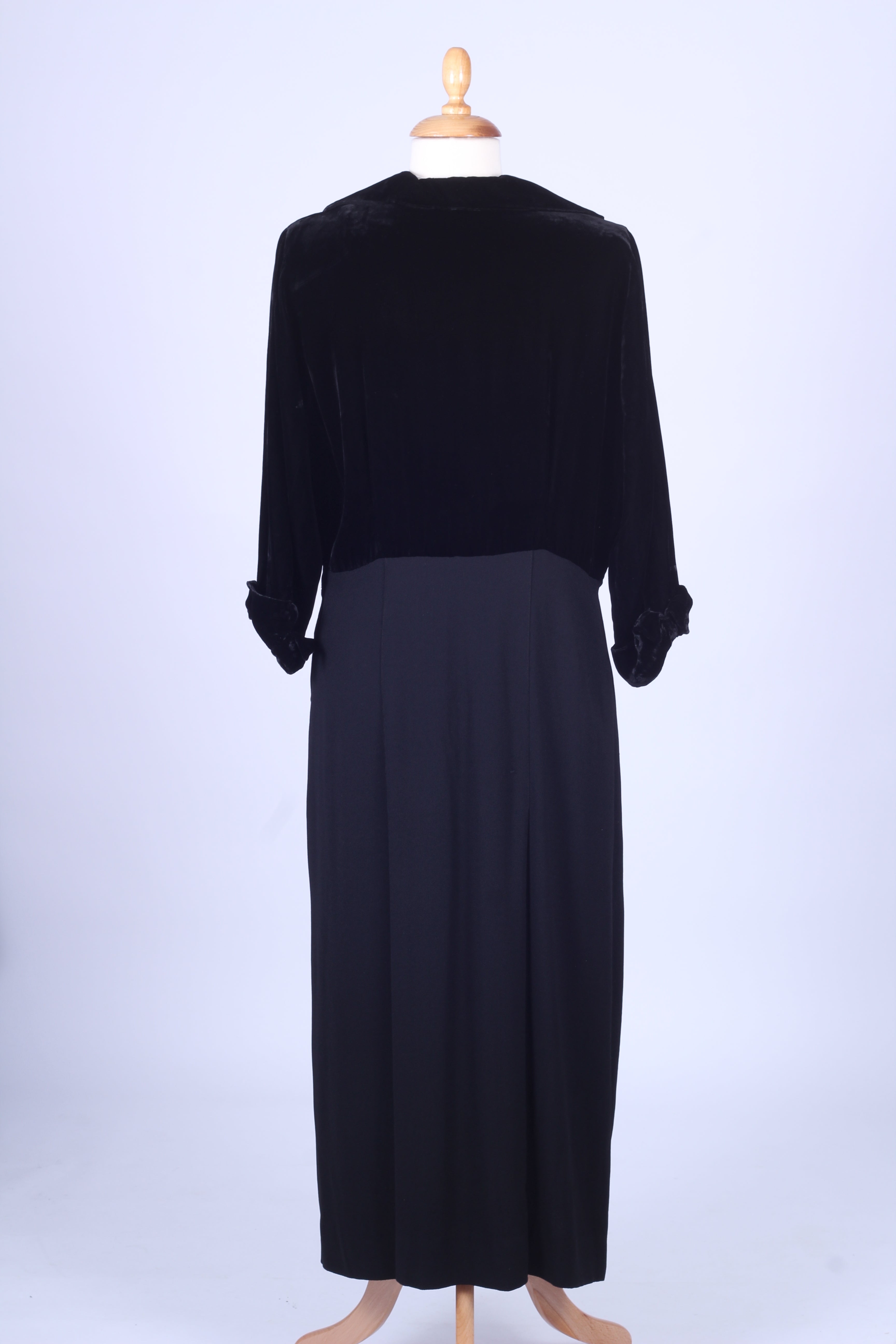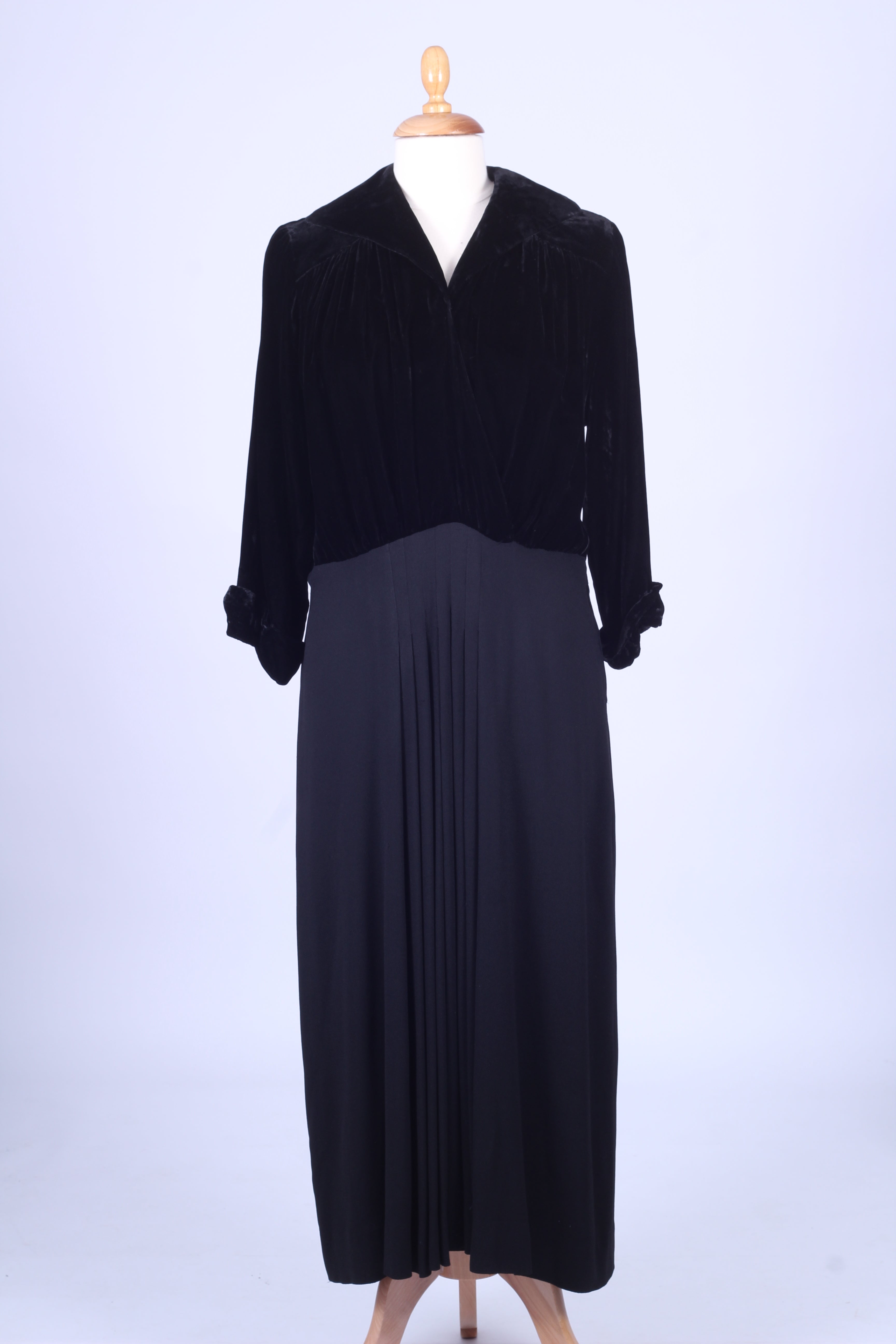 Smuk vintage hverdagskjole fra 1940'erne syet i silke georgette og silkevelour (overdel). Kjolen er skåret ved taljen, har lange ærmer med ombuk, krave og lukkes i siden med lynlås. Kjolen er fra Danmark