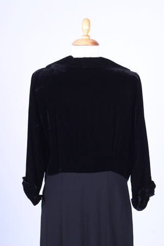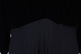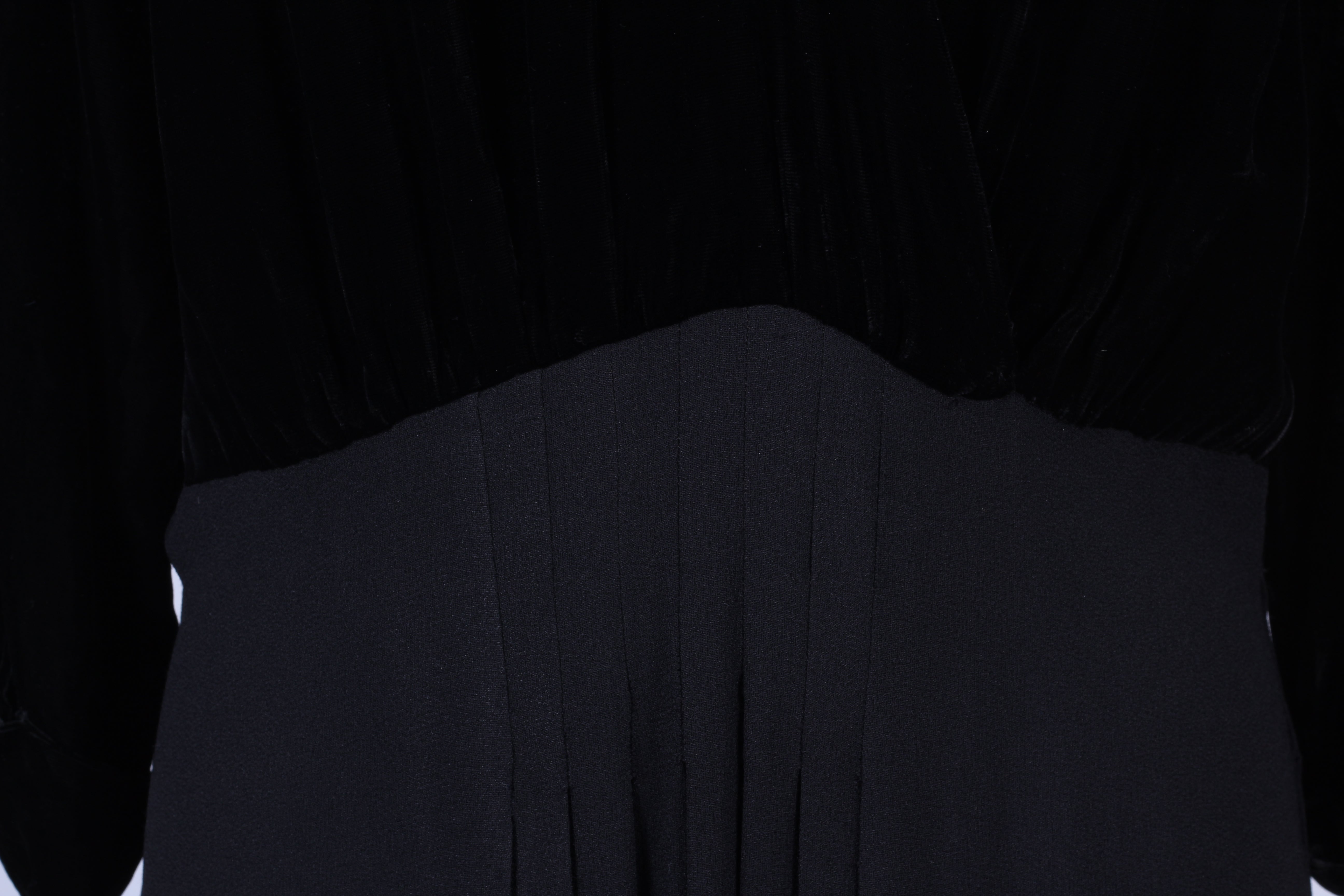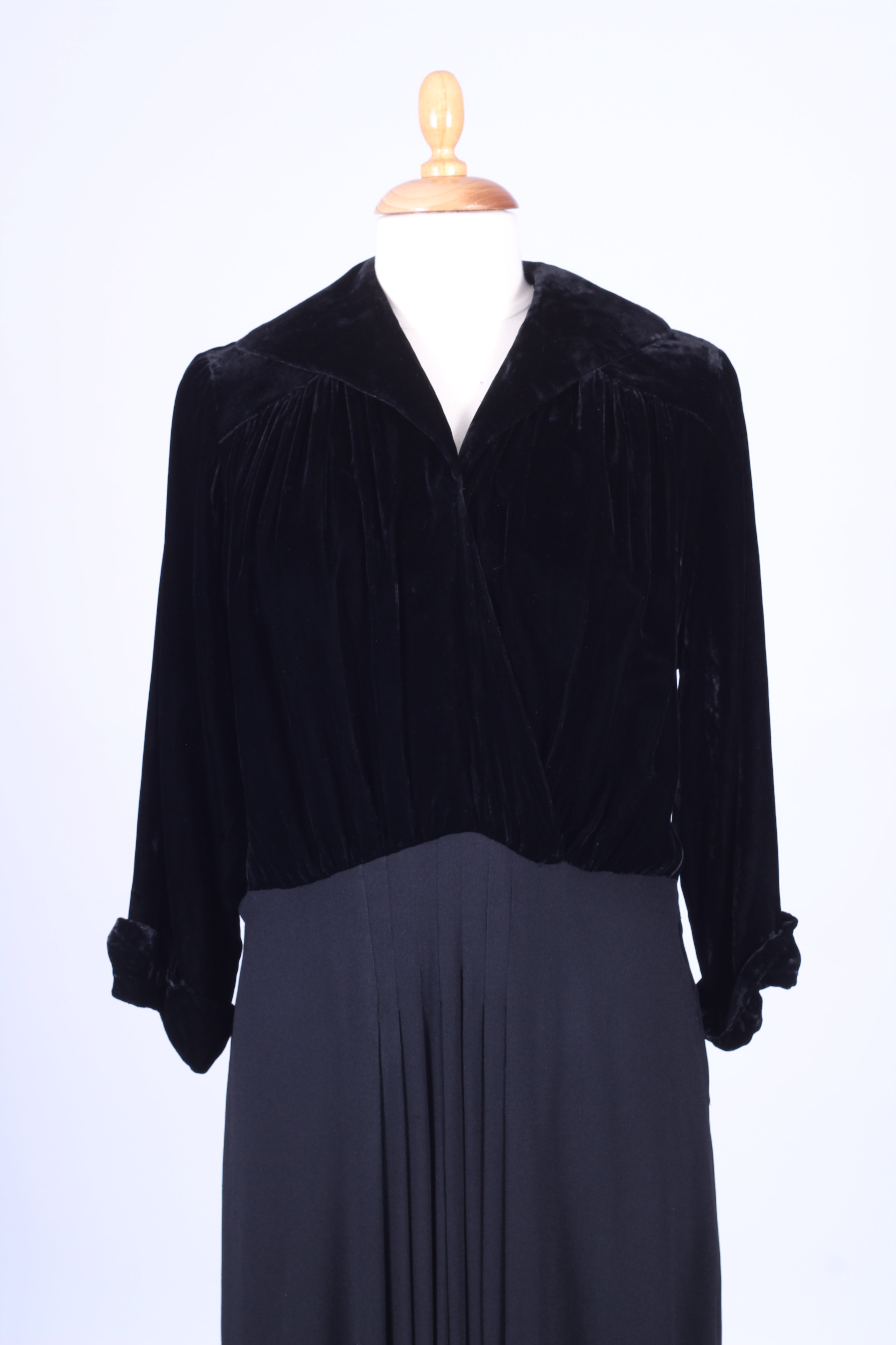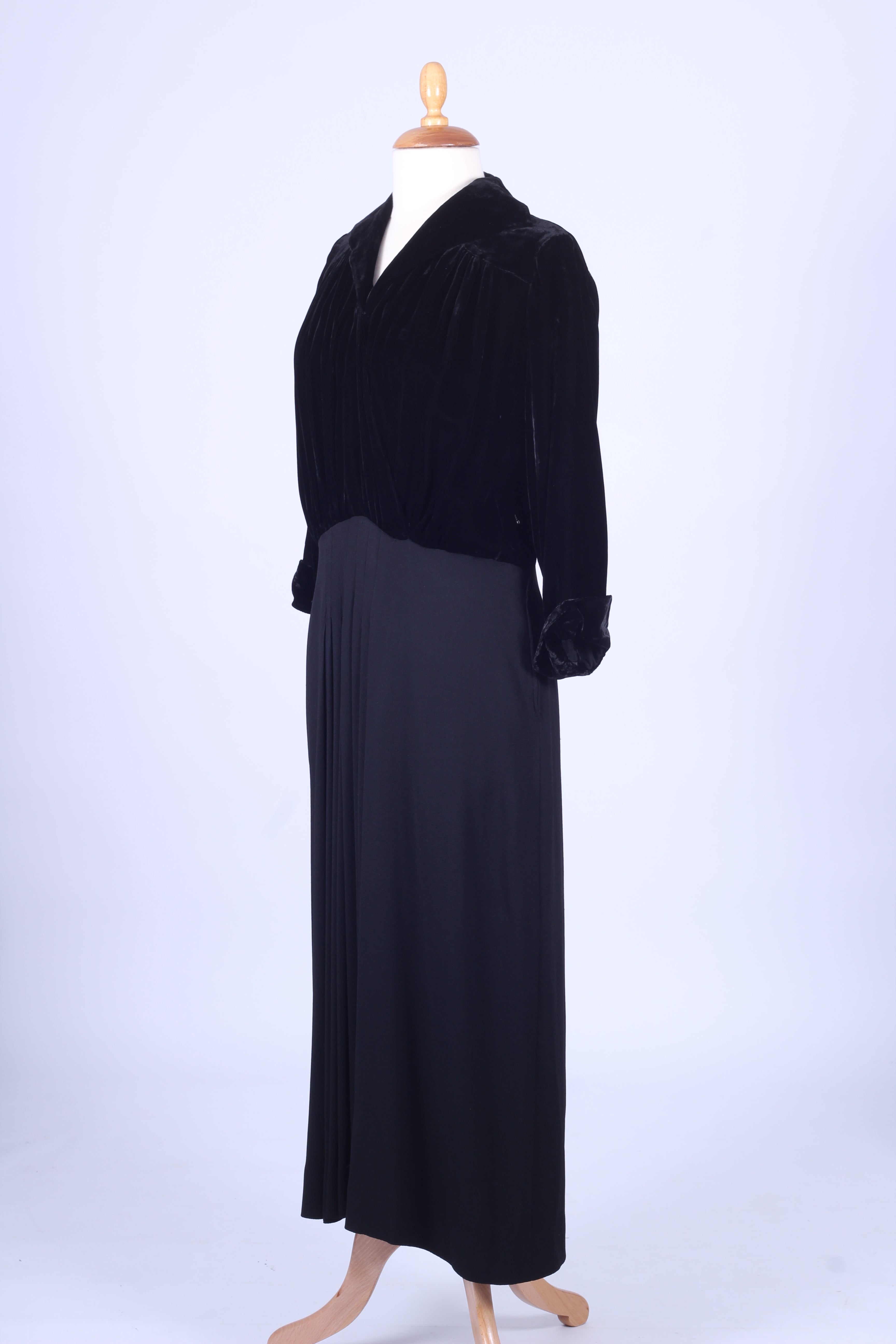 Smuk vintage hverdagskjole fra 1940'erne syet i silke georgette og silkevelour (overdel). Kjolen er skåret ved taljen, har lange ærmer med ombuk, krave og lukkes i siden med lynlås. Kjolen er fra Danmark