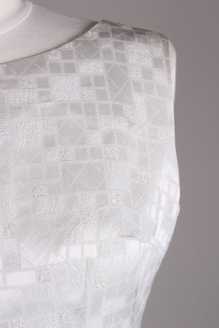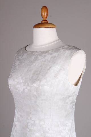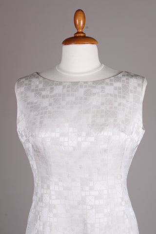 Flot og enkel cocktailkjole fra 1960'erne syet i hvidt sølvbrokadestof. Kjolen er med brede skulderstropper og lynlås i ryggen. Med foer indvendig af satin / acetat.