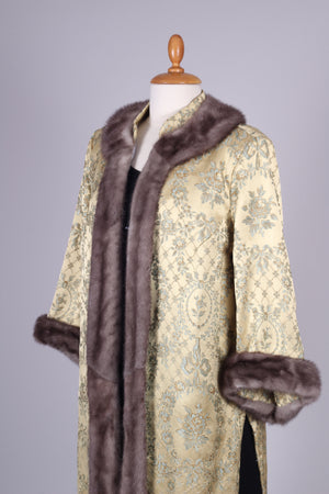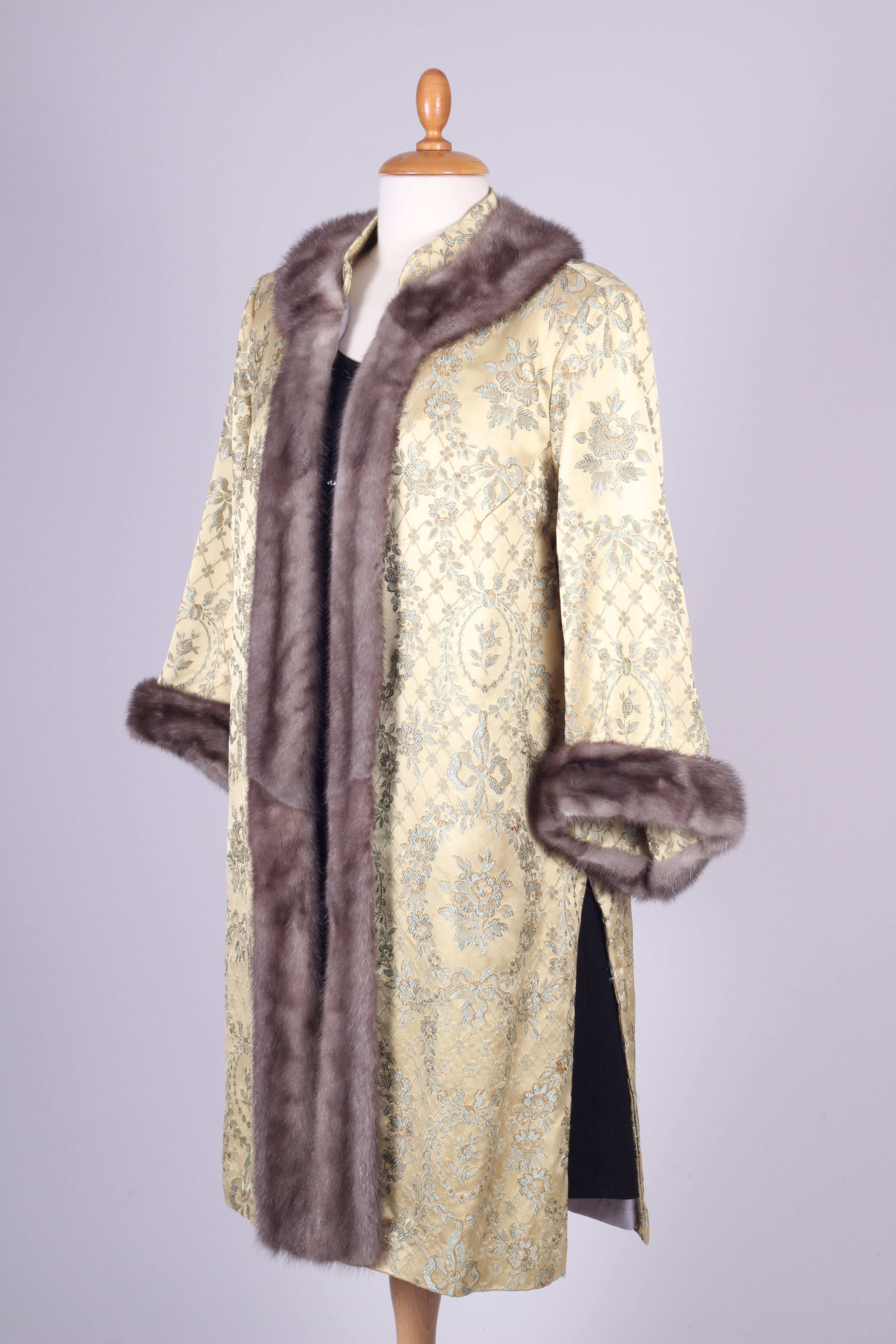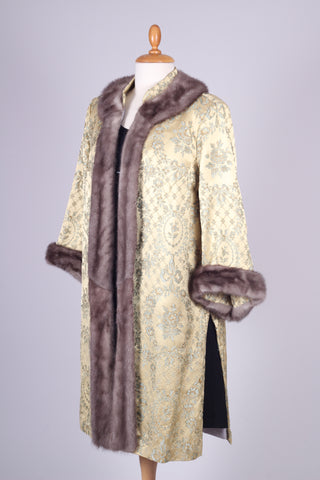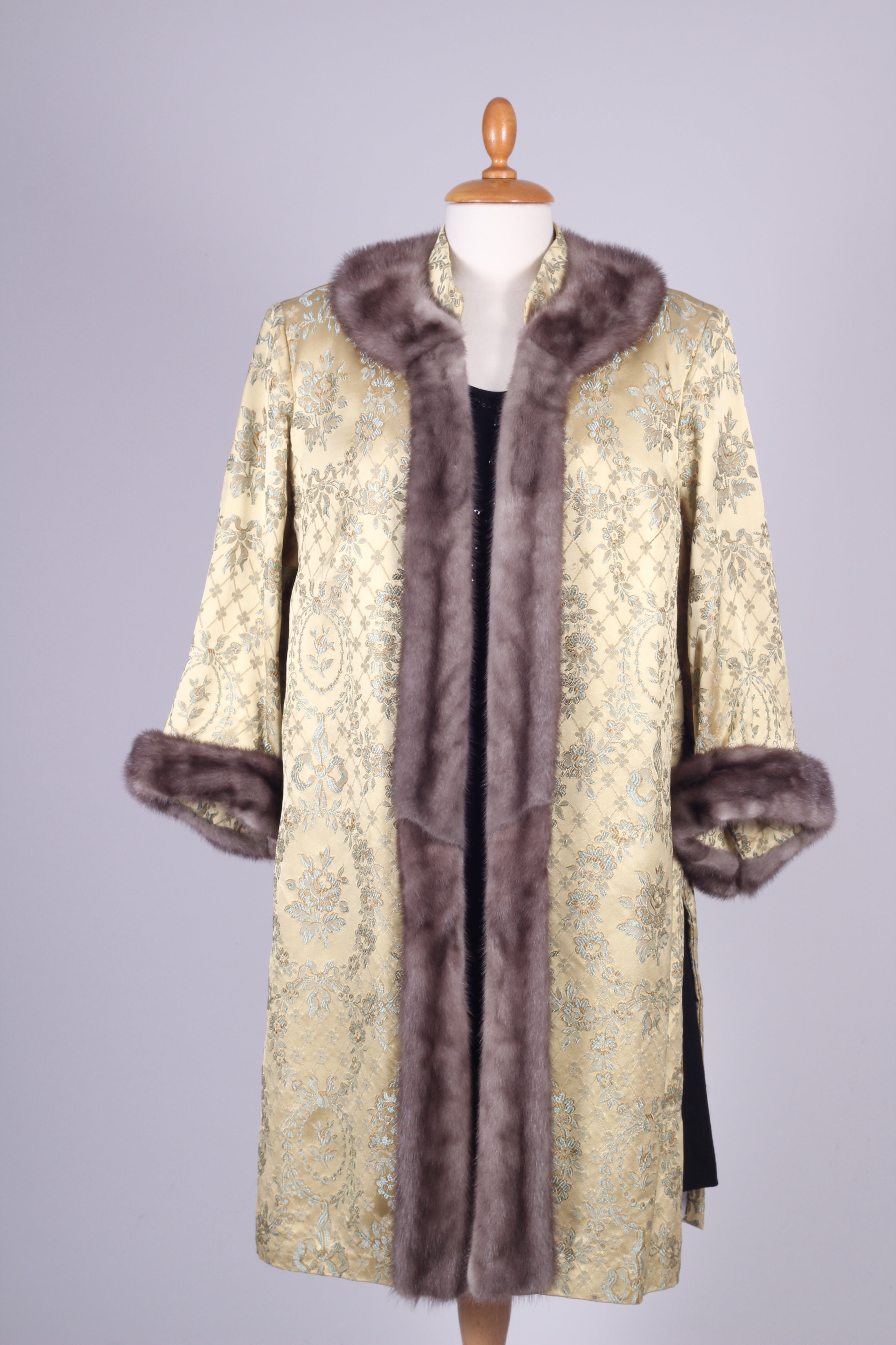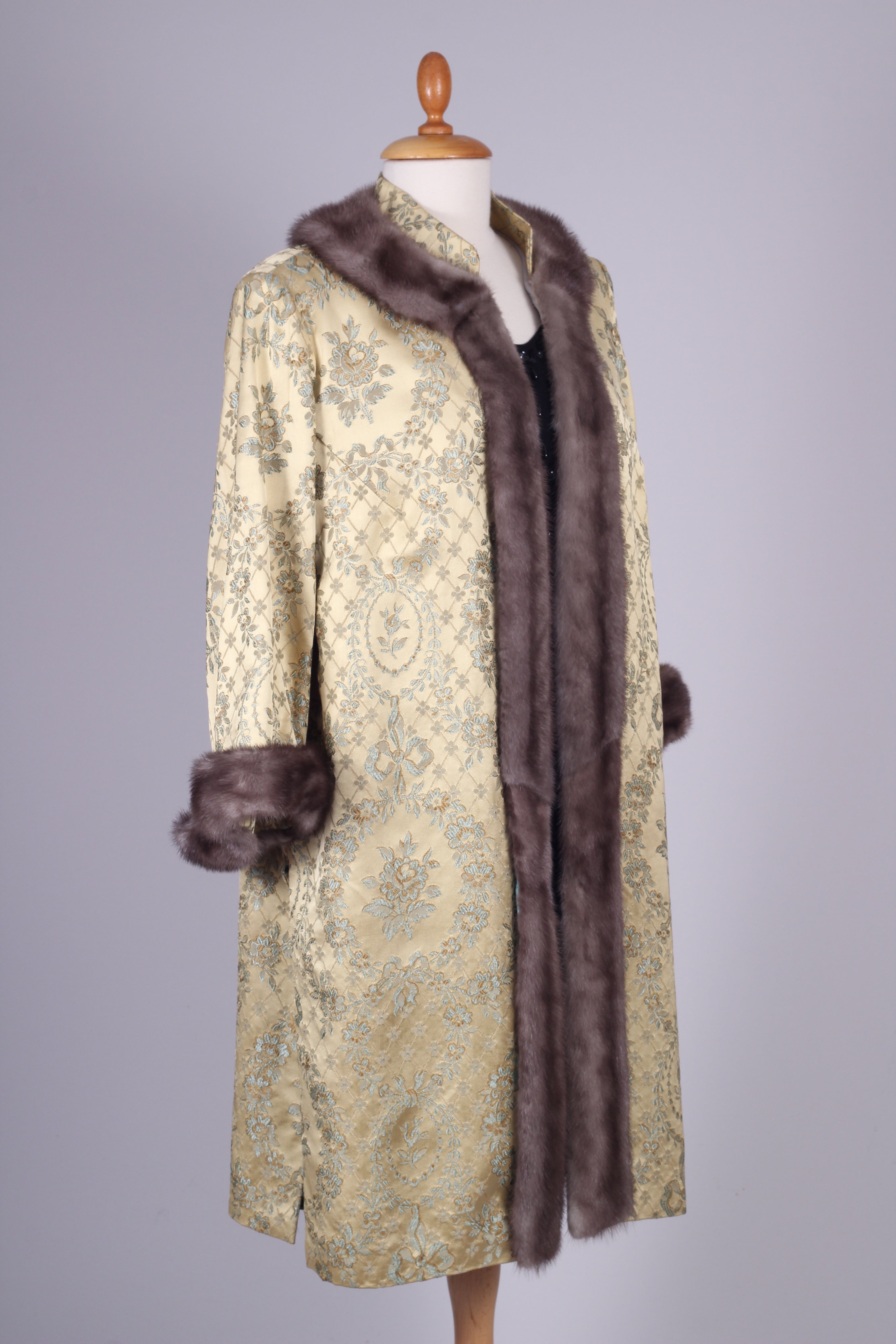 Virkelig smuk kåbe fra beg. af 1960'ene syet i gylden brokade og med påsatte kanter af mink. Kåben er foret med acetat. Oprindelig syet af bundtmager fra Grenaa.