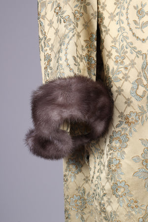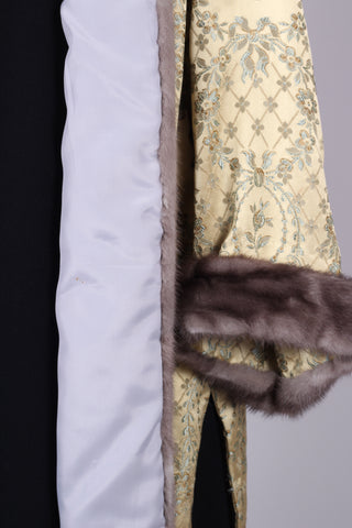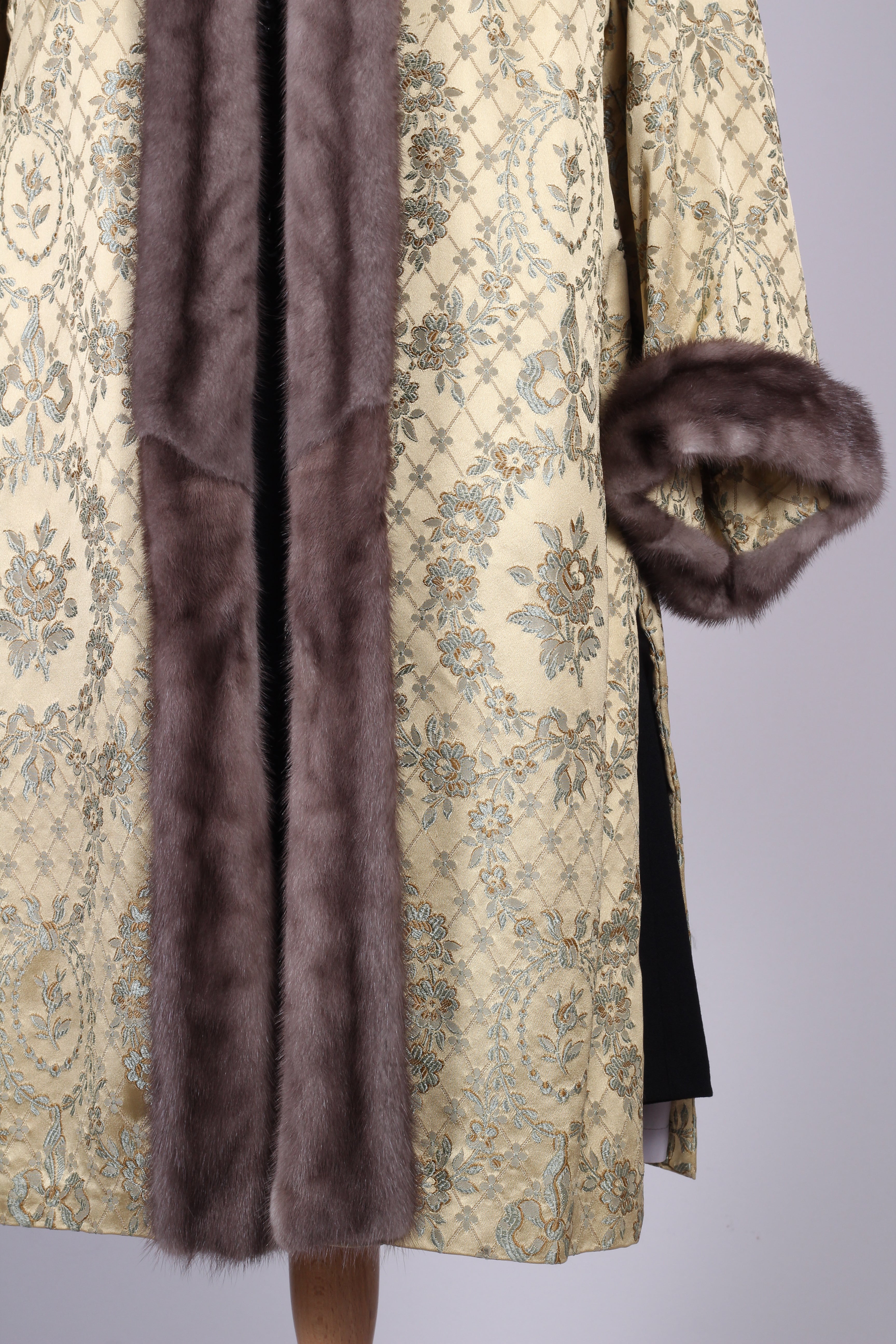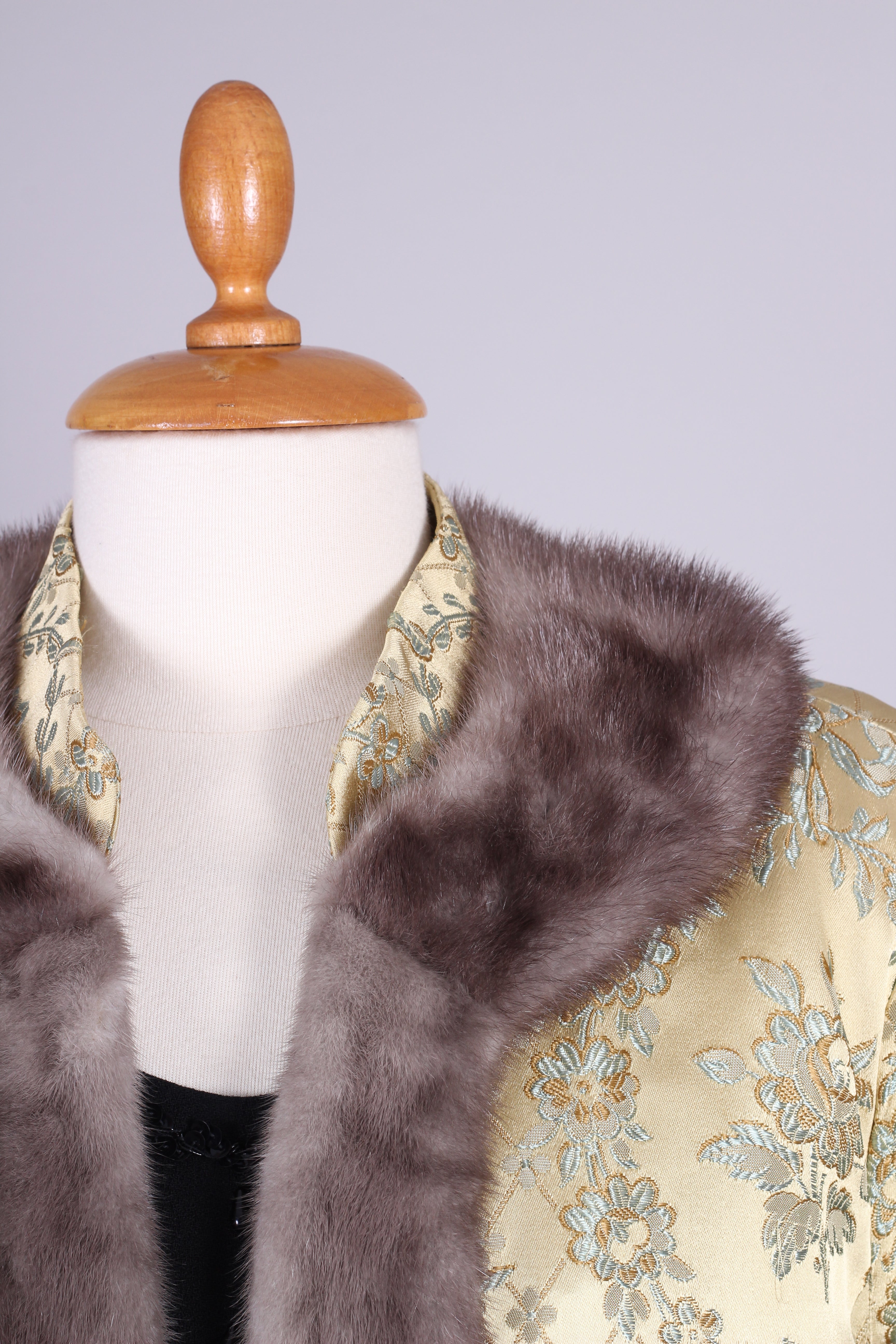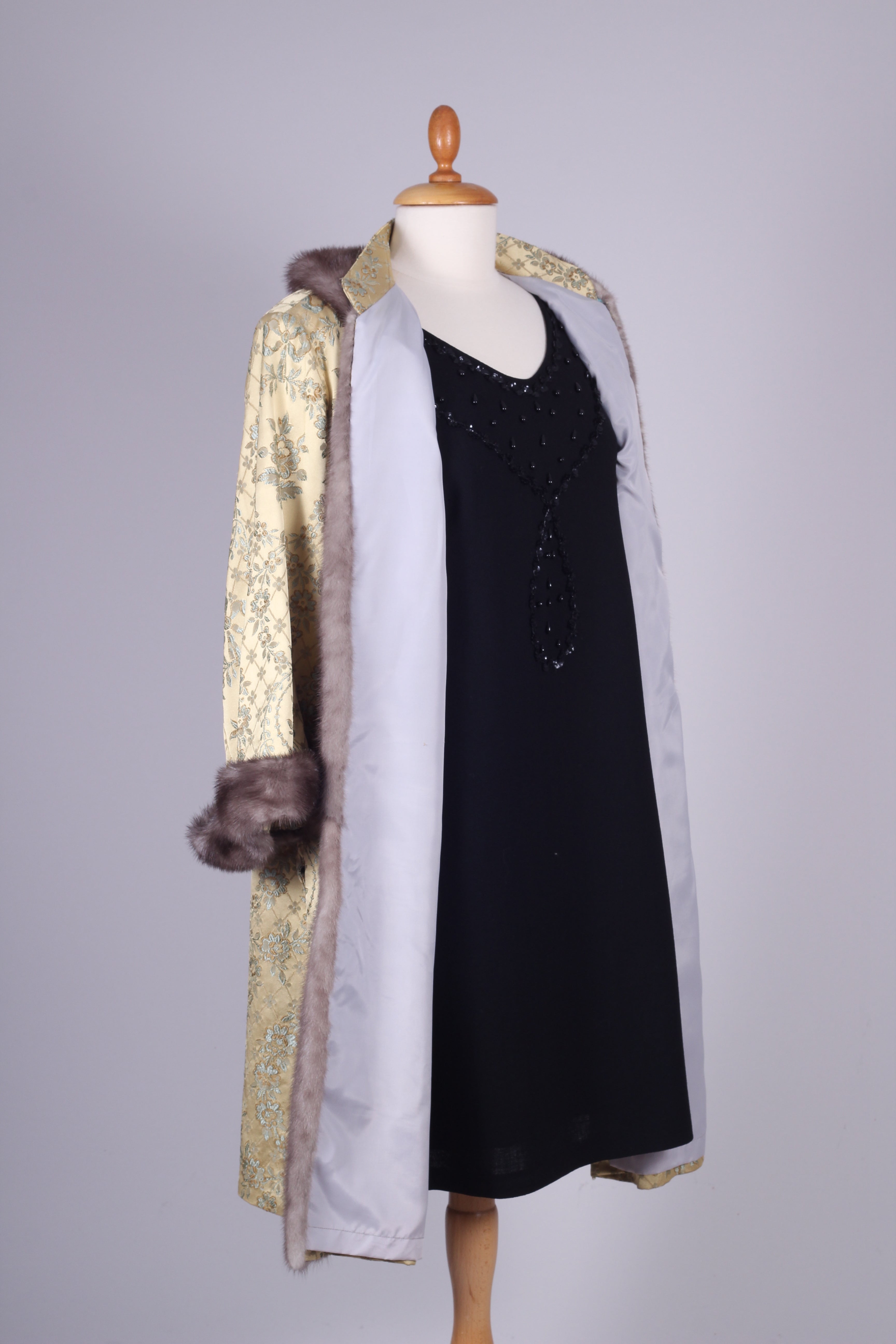 Virkelig smuk kåbe fra beg. af 1960'ene syet i gylden brokade og med påsatte kanter af mink. Kåben er foret med acetat. Oprindelig syet af bundtmager fra Grenaa.