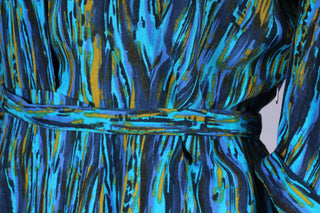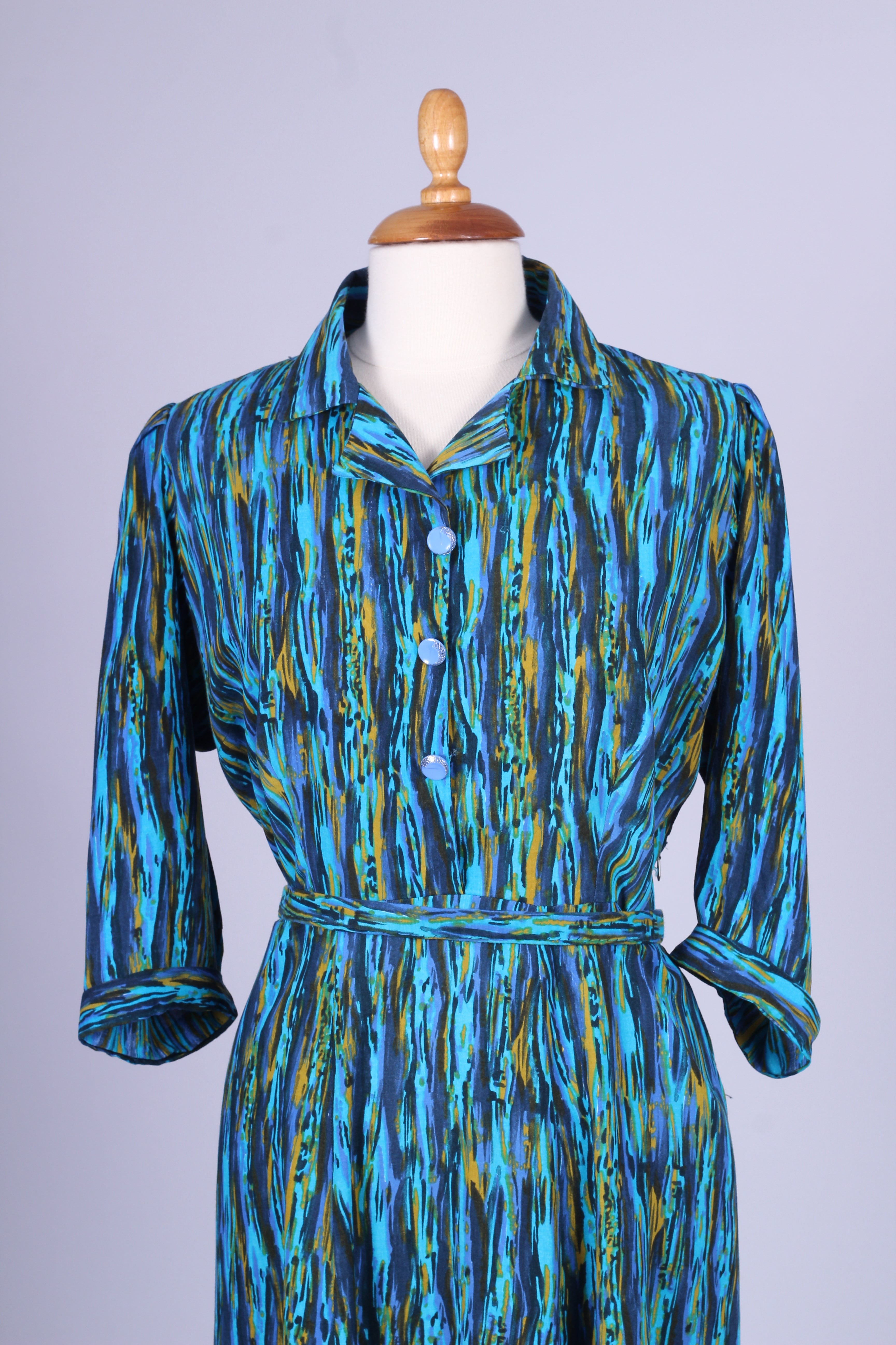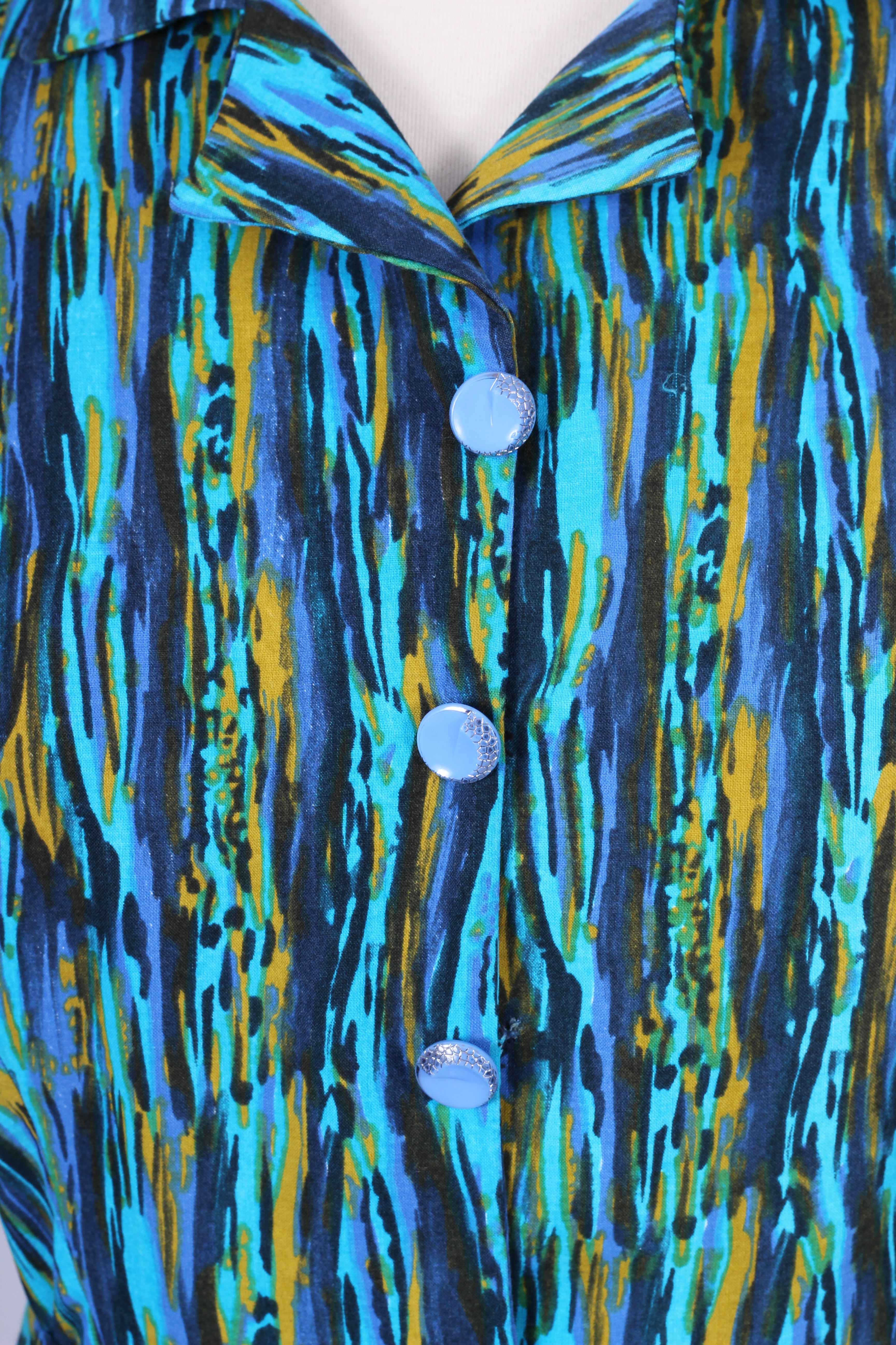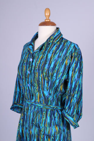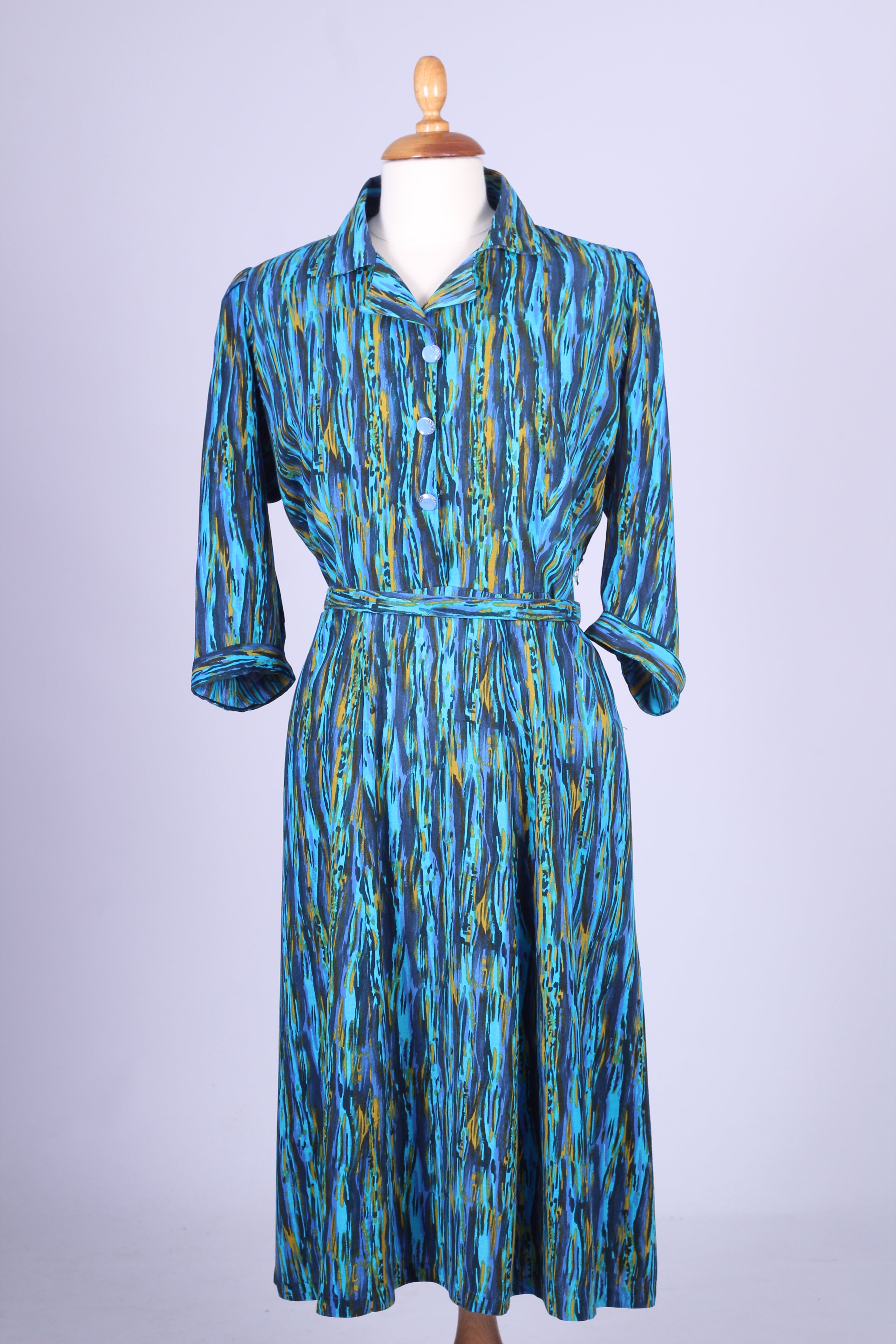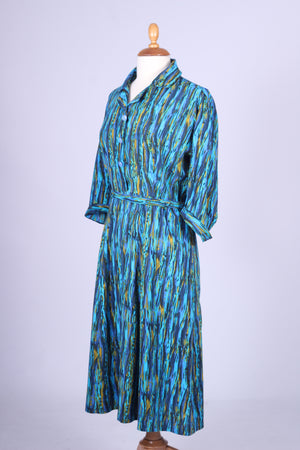 Unik vintage hverdagskjole fra 1950'erne syet i viskose med print. Kjolen er fra Danmark og hjemmesyet. Kjolen har tre kvart lange ærmer, knapper fortil samt bælte ved taljen og lynlås i siden.