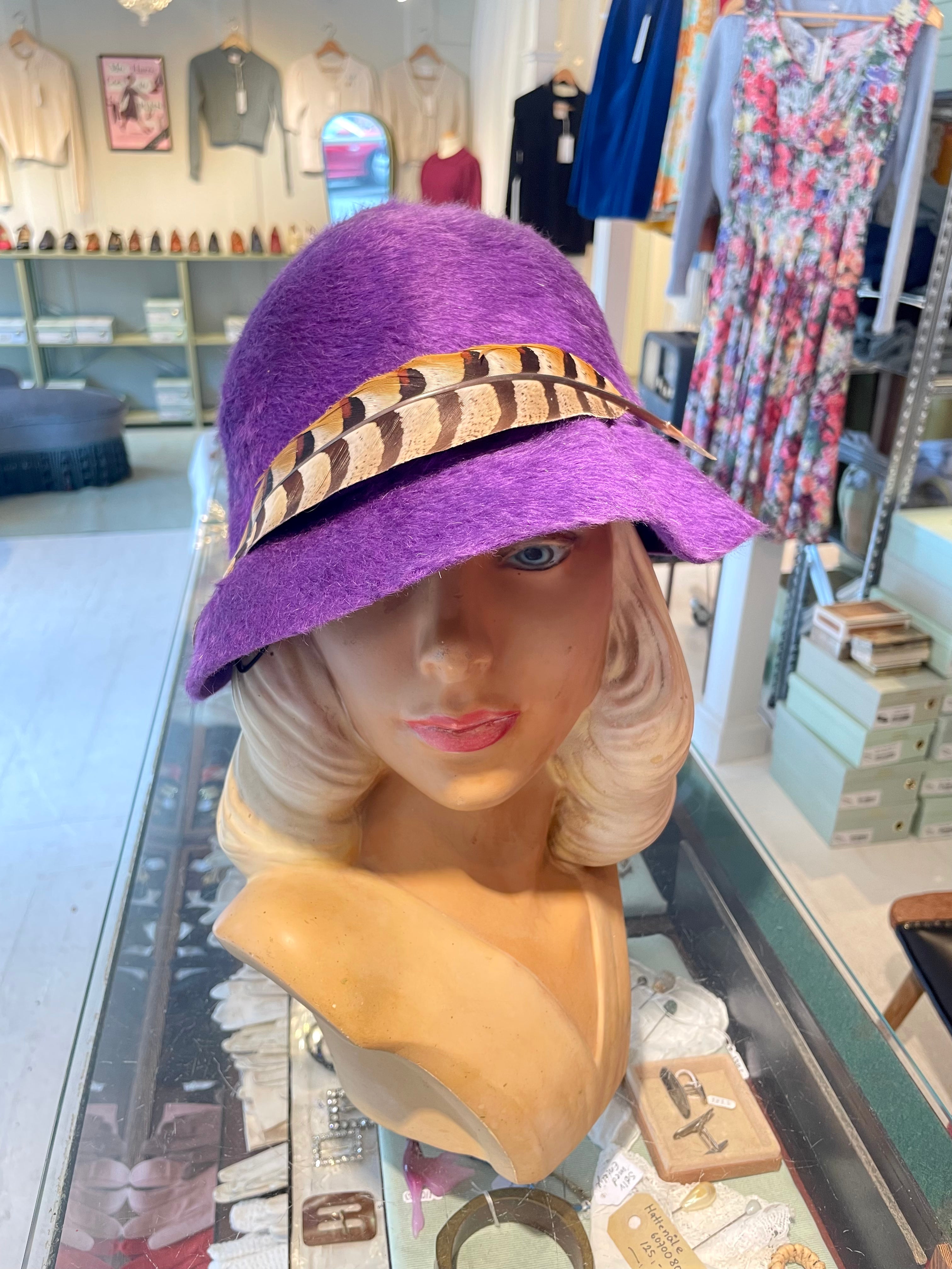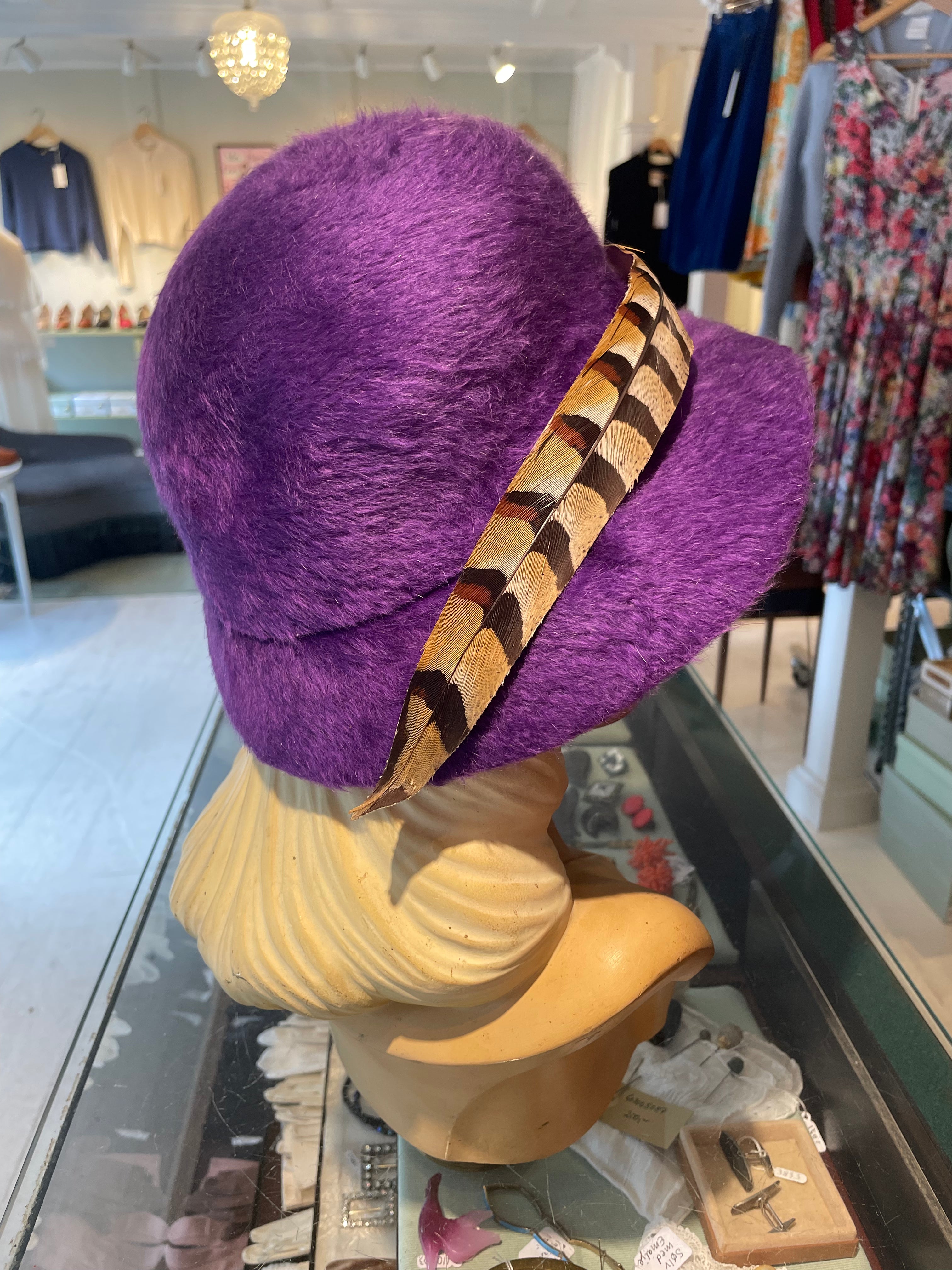 Beskrivelse: Flot lilla filthat i fur felt med fasanfjer på skyggen.