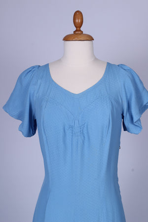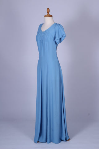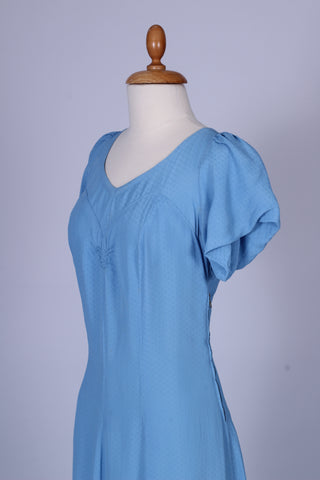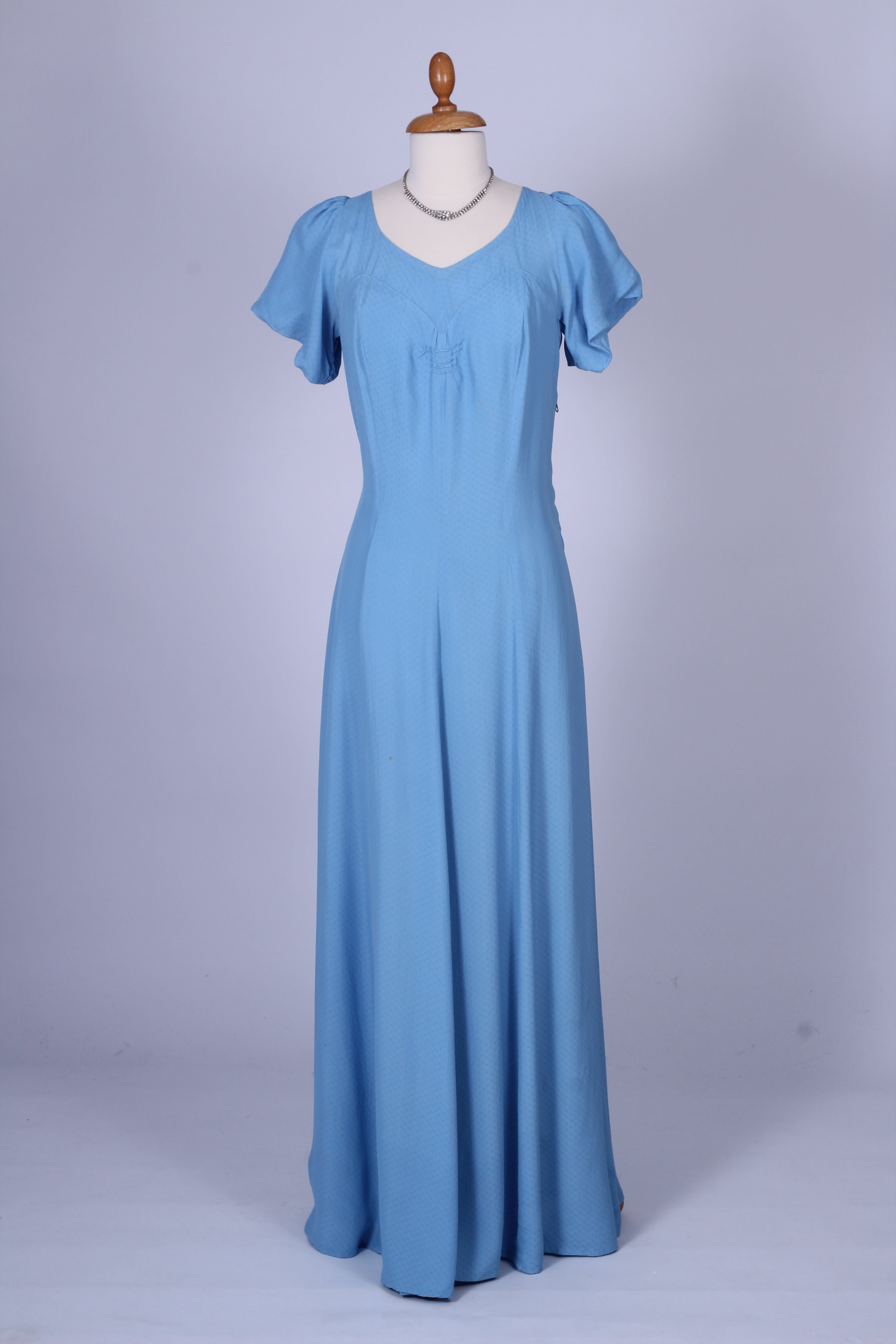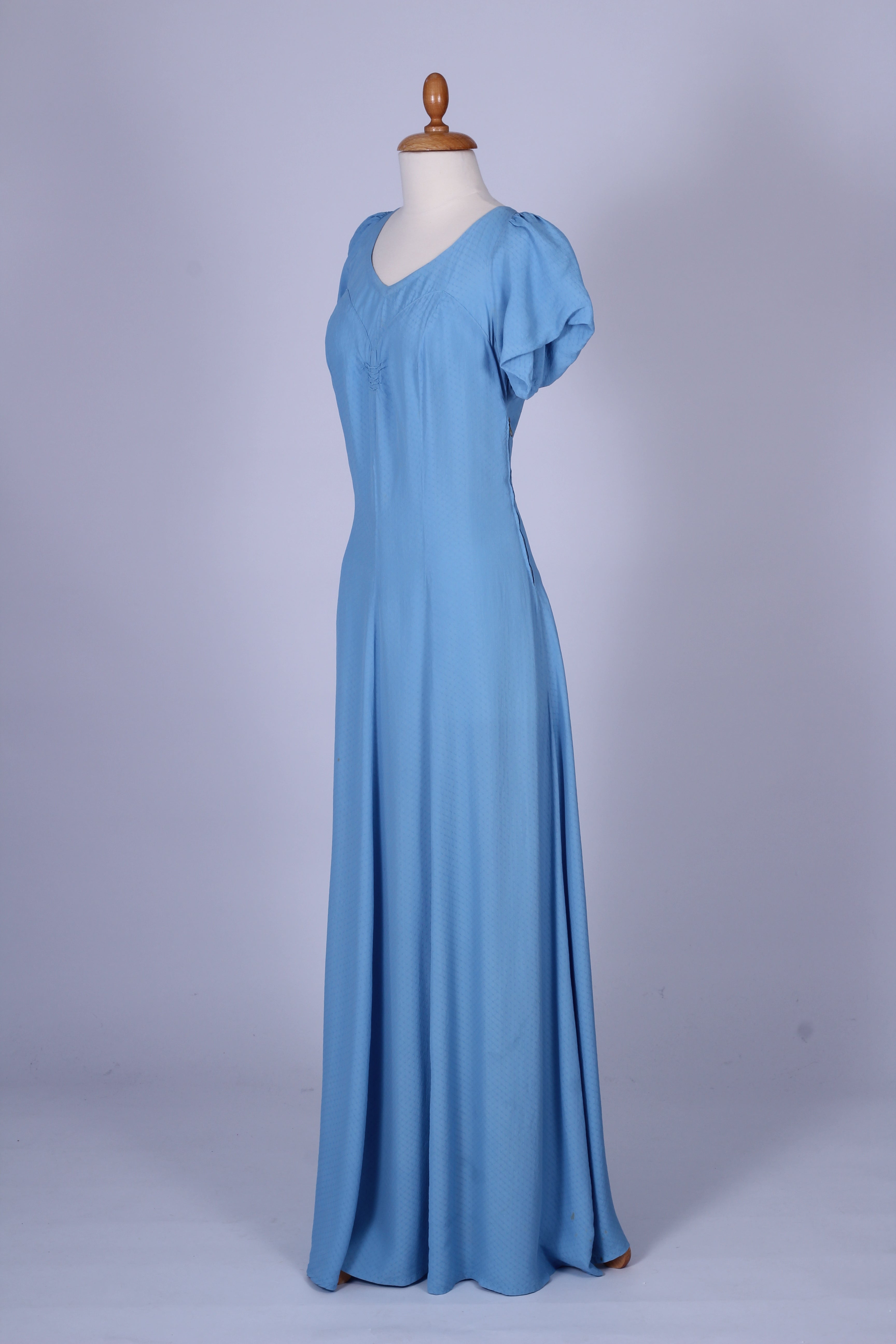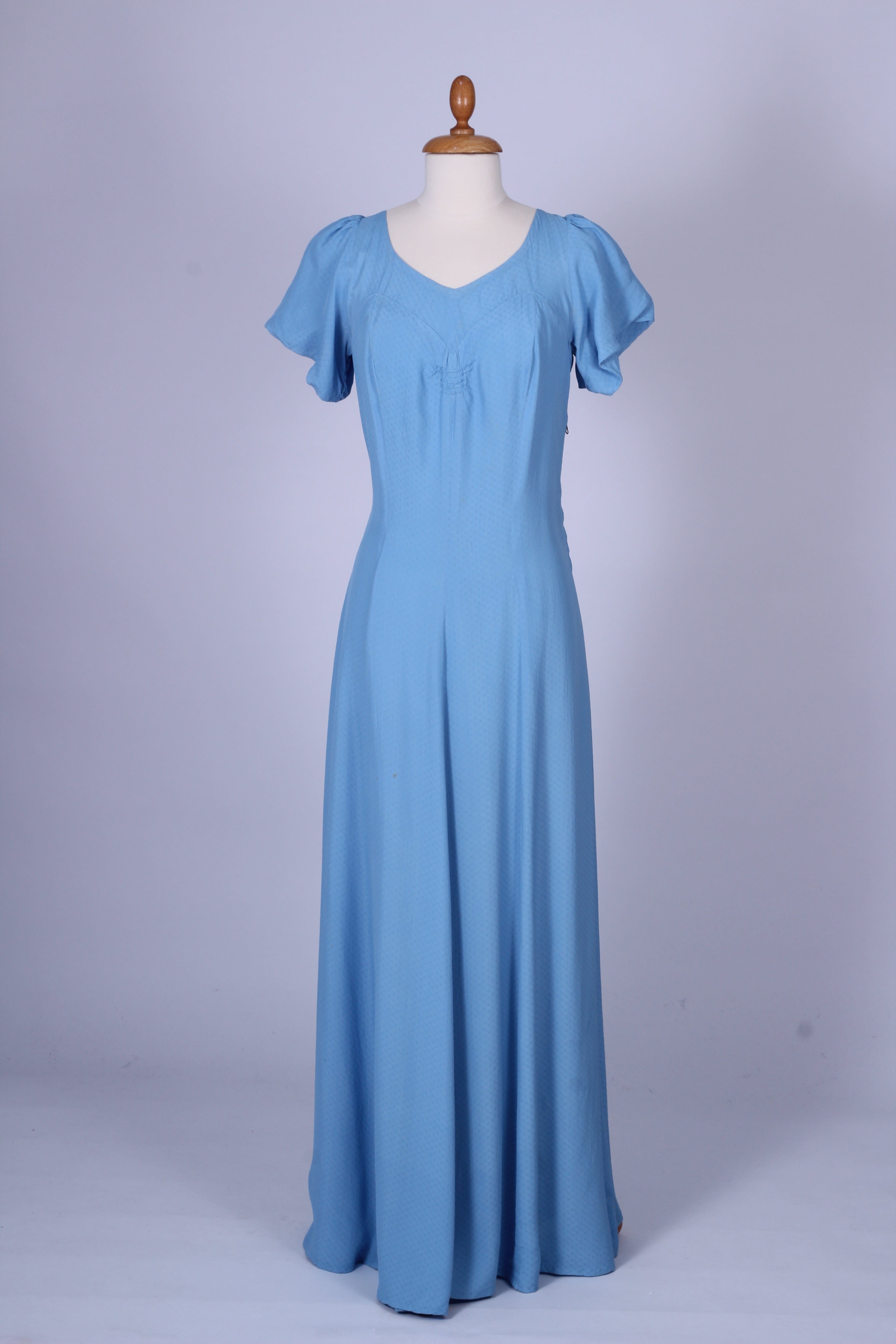 Lyseblå vintage aftenkjole / gallakjole fra 1930'erne syet i silke. Kjolen er taget på skrå, har pufærmer og fine detaljer. Kjolen er fra Danmark. Kjolen smyger sig om kroppen og er typisk for perioden.