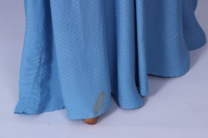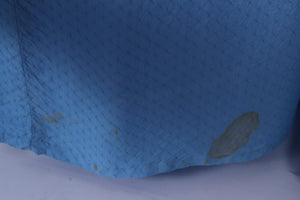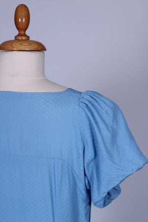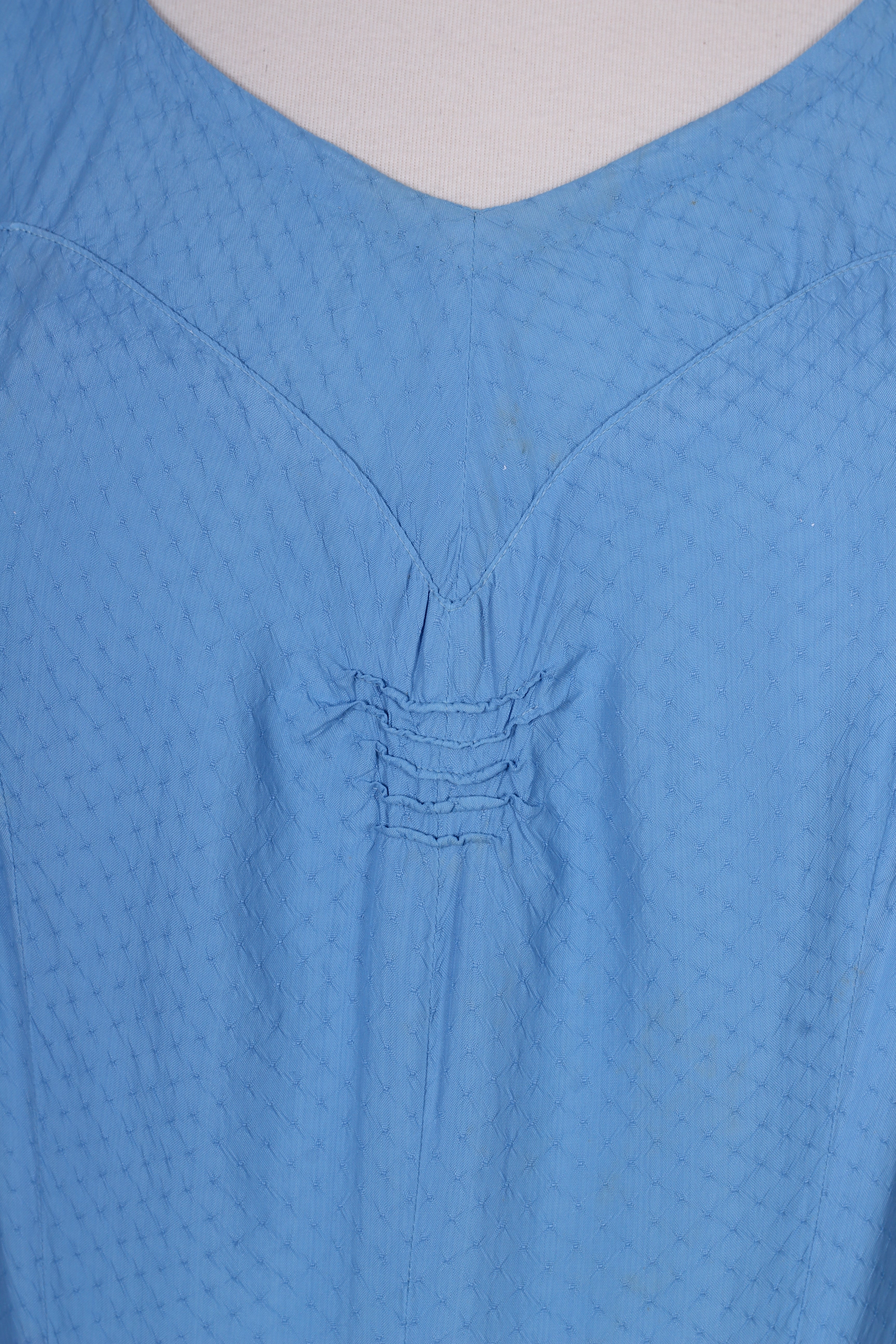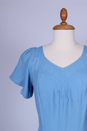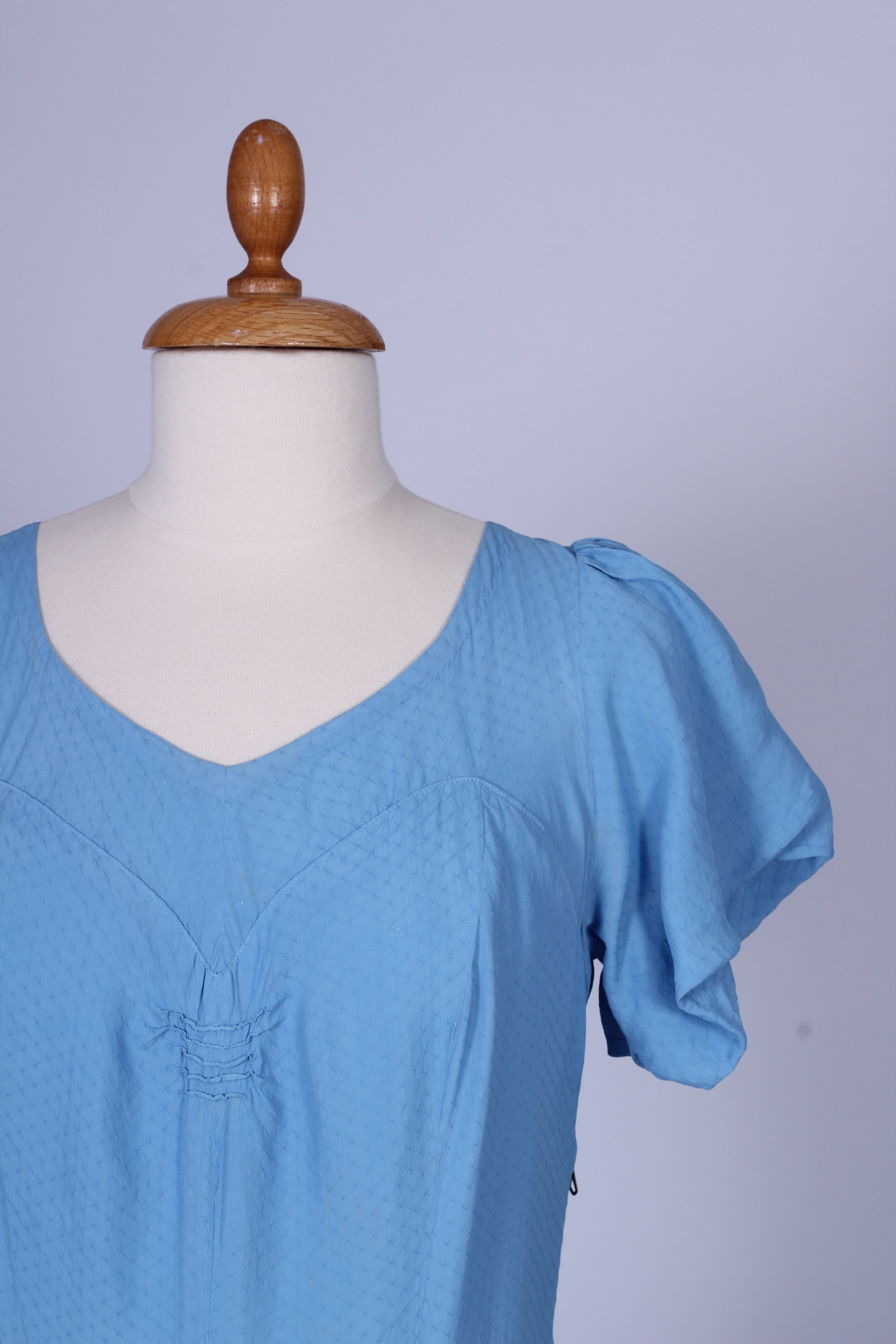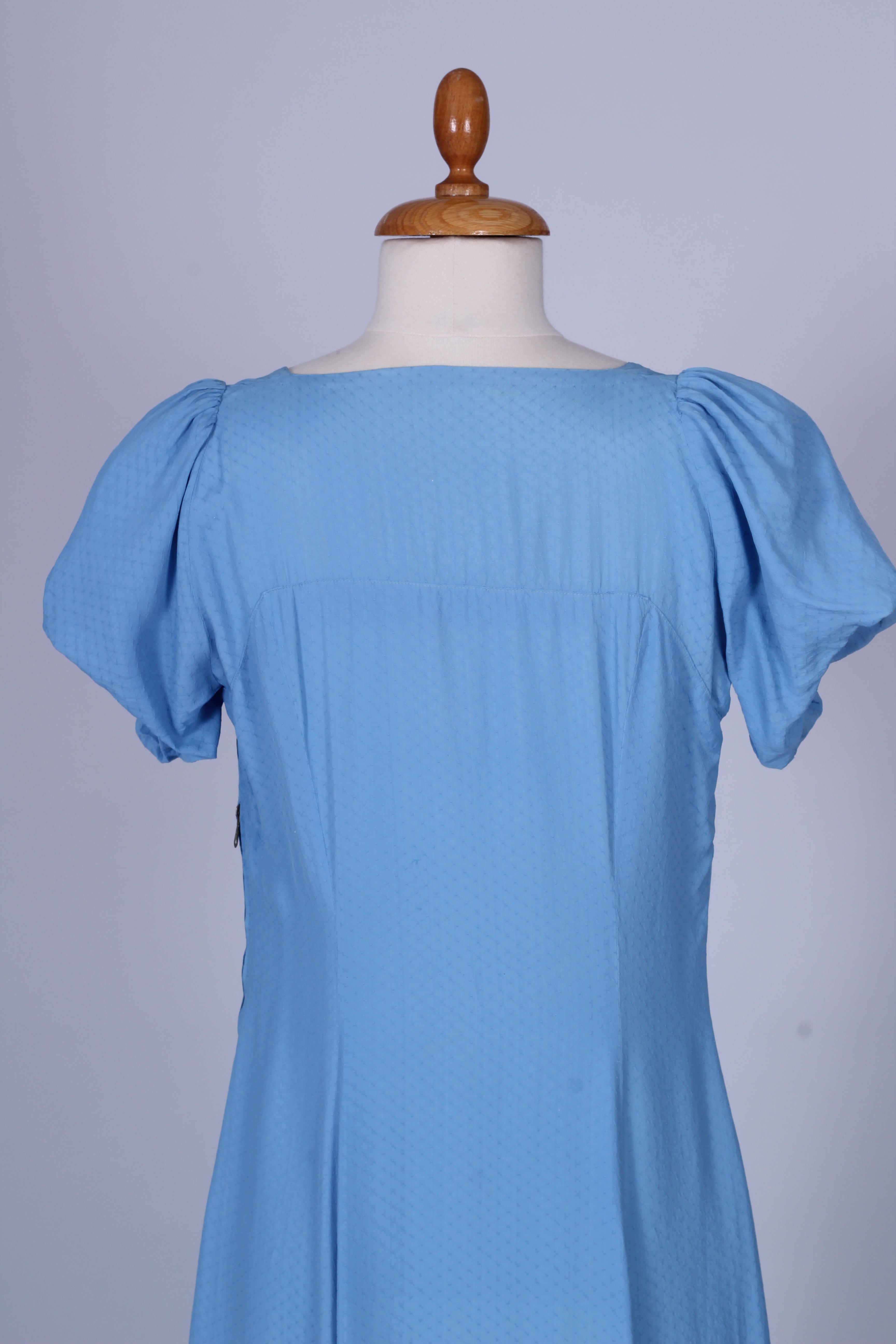 Lyseblå vintage aftenkjole / gallakjole fra 1930'erne syet i silke. Kjolen er taget på skrå, har pufærmer og fine detaljer. Kjolen er fra Danmark. Kjolen smyger sig om kroppen og er typisk for perioden.