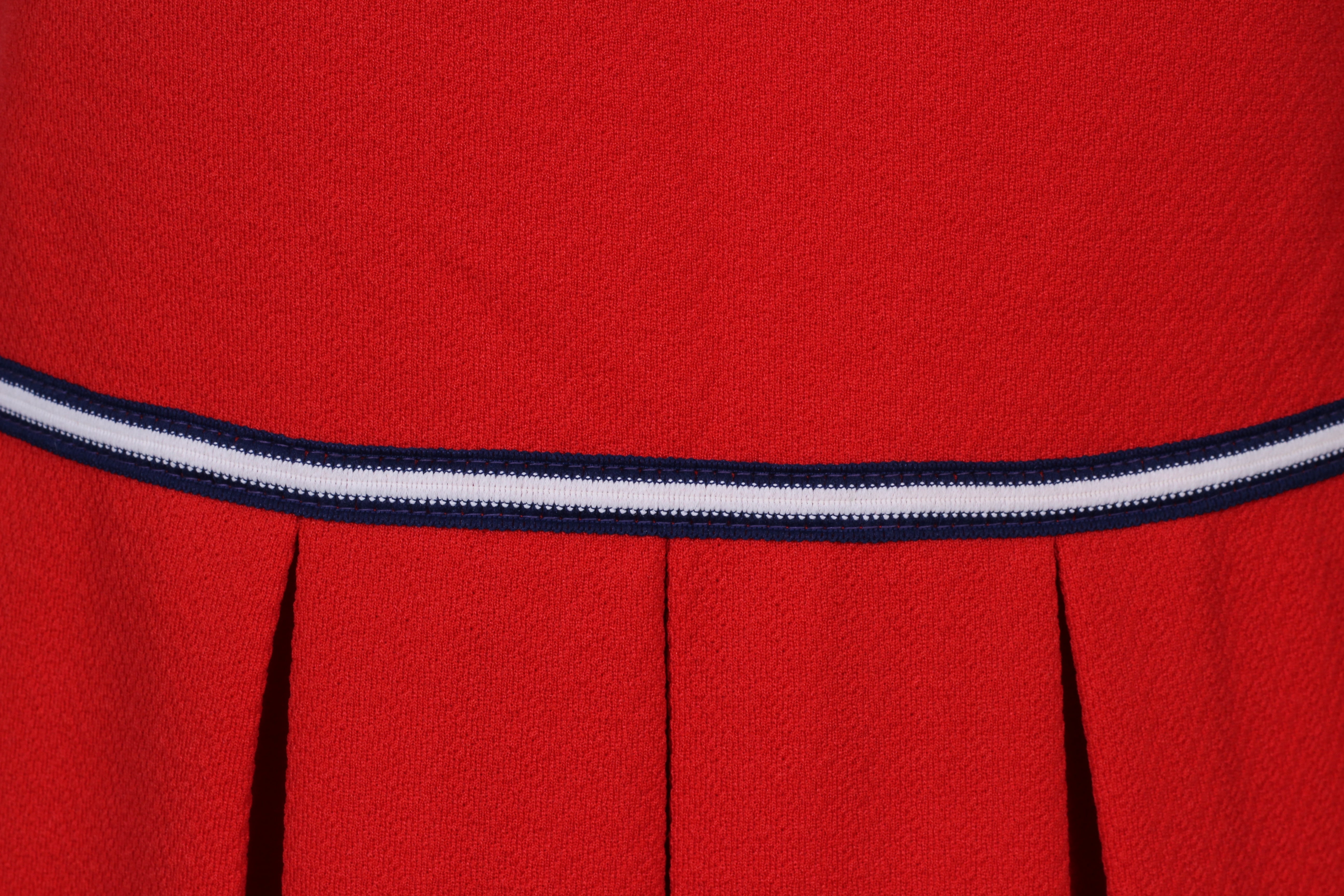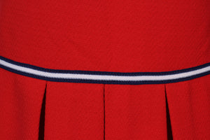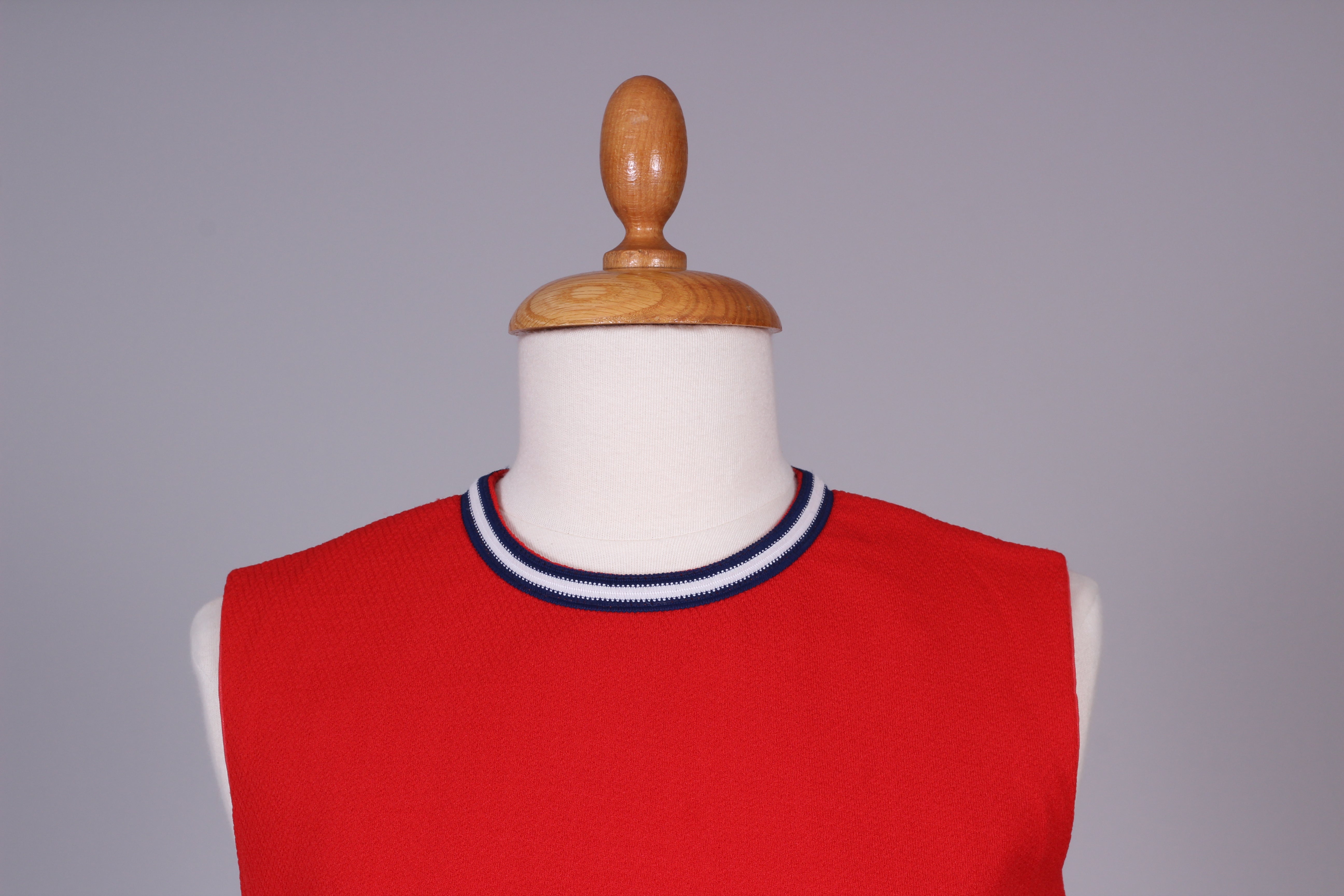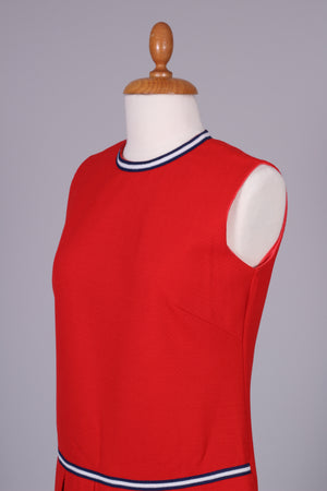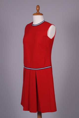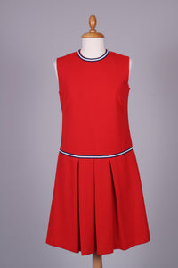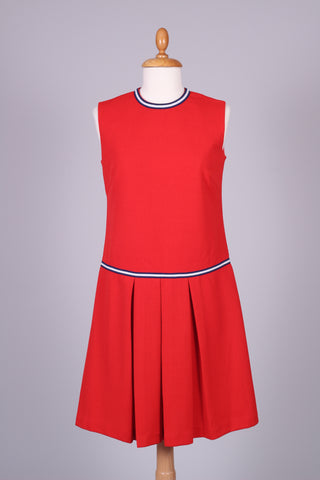 Vintage 'swinging London' sommerkjole syet i rødt spinlon. Kjolen er helt enkel uden ærmer og med a-linie skørt.
