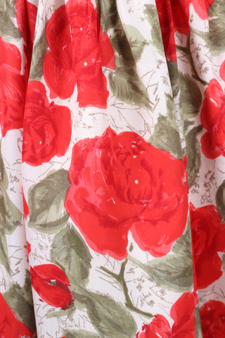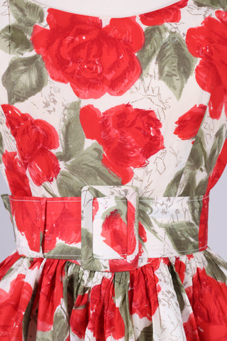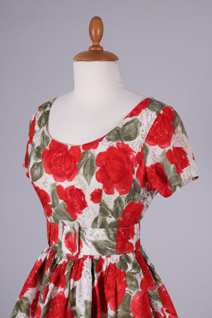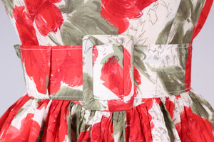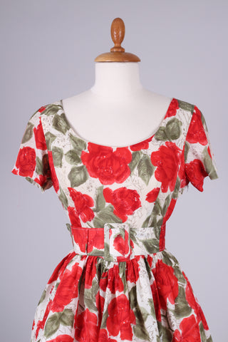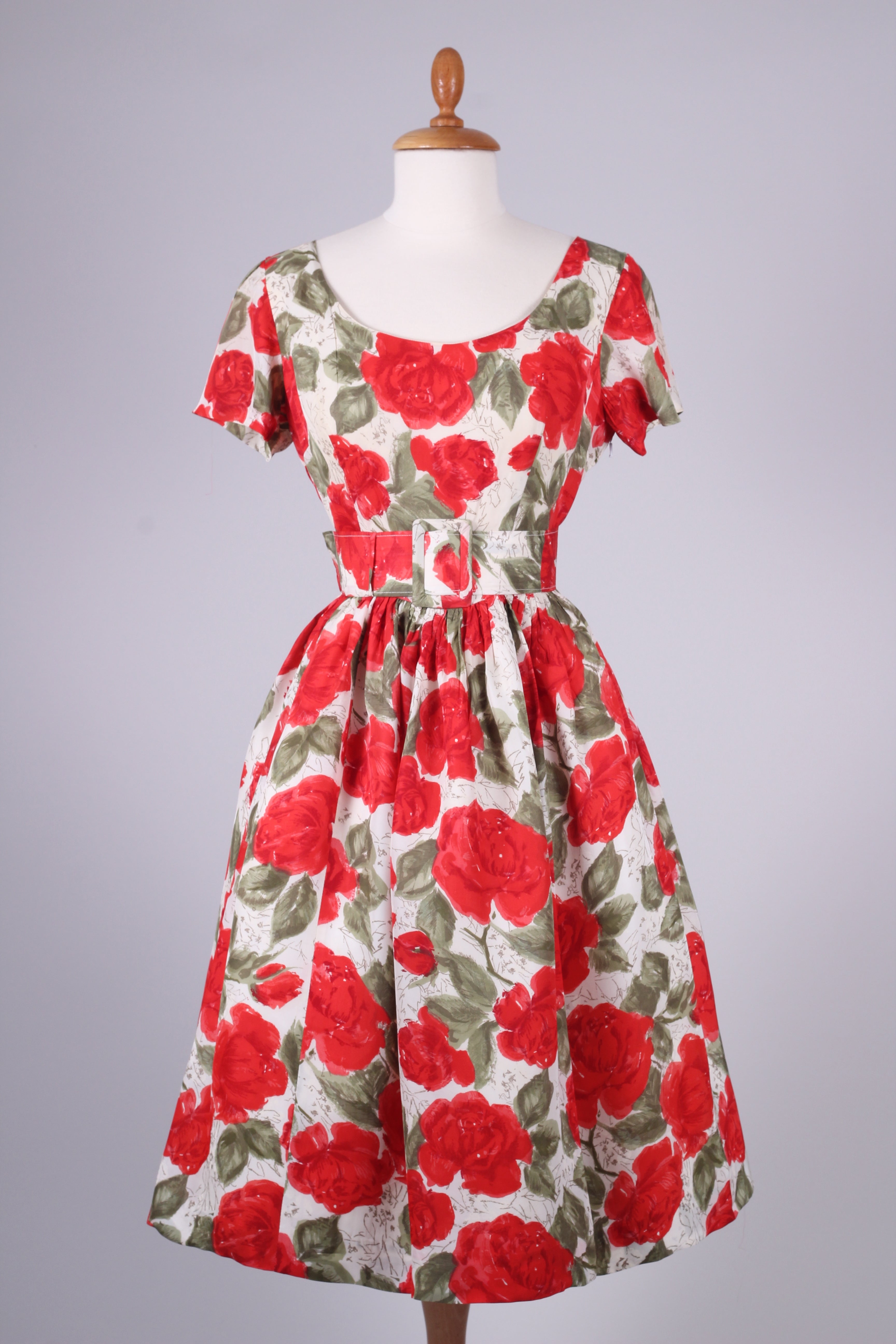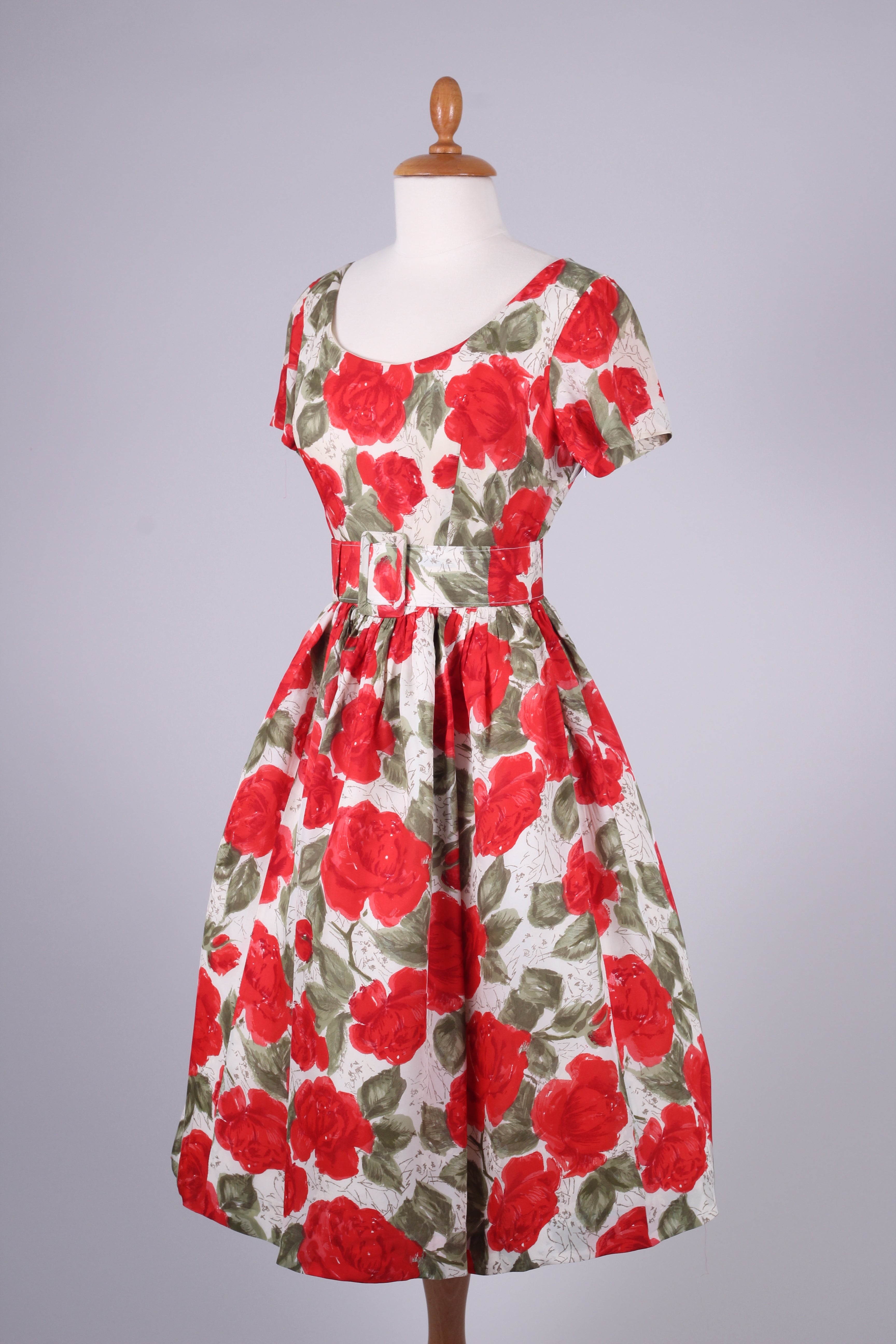 Virkelig fin vintage selskabskjole / sommerkjole fra slut. 1950'erne syet i tyndt satin med blomsterprint. Kjolen er med bredt originalt bælte, er skåret ved taljen med rynket skørt (og underskørt af bomuldslærred) og lukkes i siden med lynlås.
