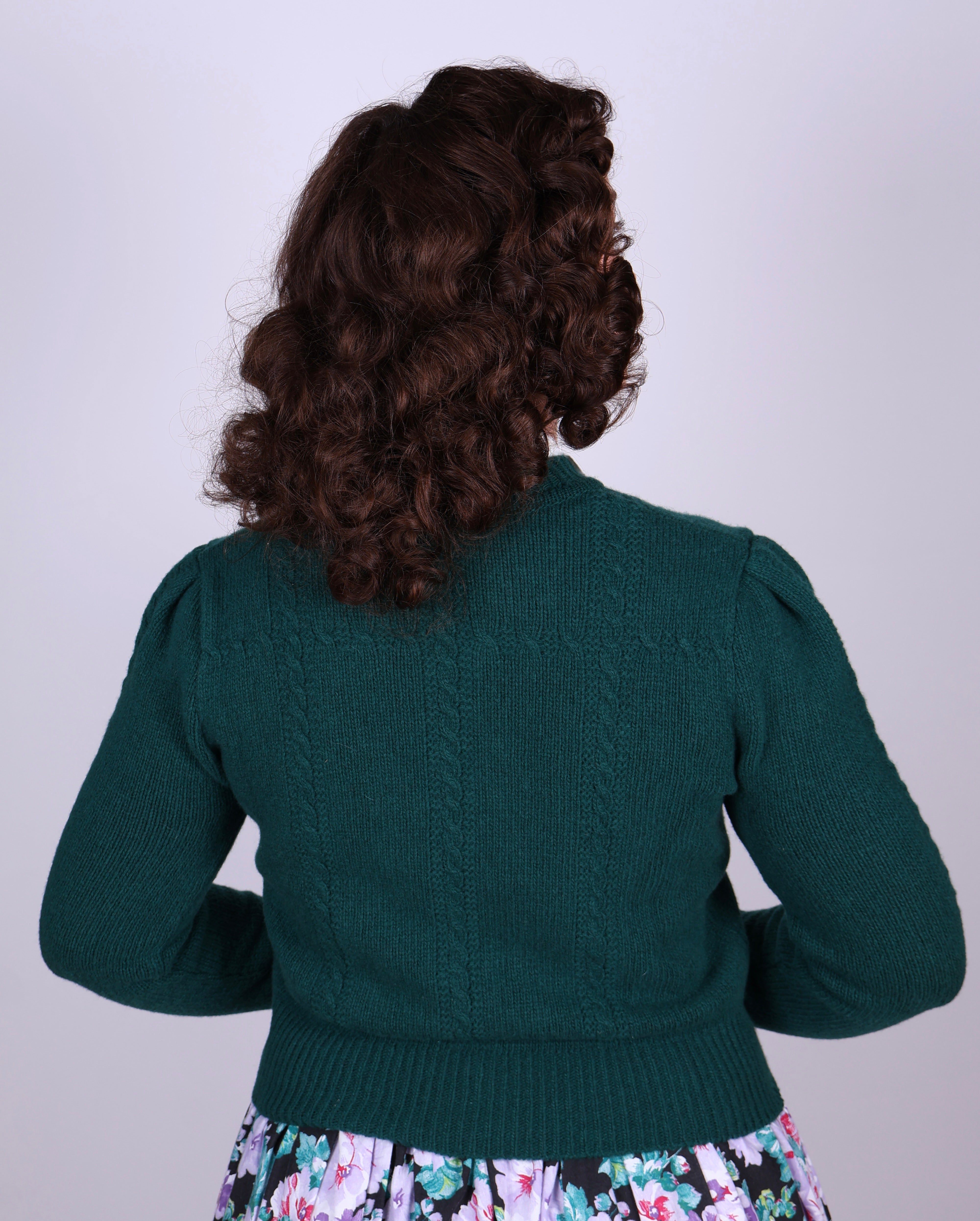 Et fint kabelstrikmønster fremhæves af en flatterende V-udskæring samt en kropsnær pasform i talje og bryst, hvilket skaber en elegant silhuet. Slanke, let puffede ærmer med ribkanter tilføjer et romantisk præg, mens syv fine akrylknapper giver et diskret strejf af vintage-charme.
