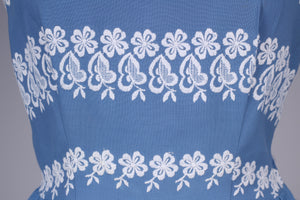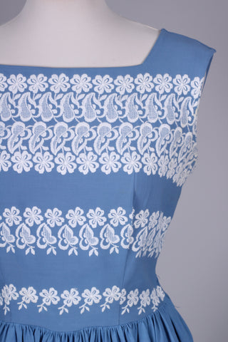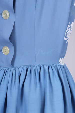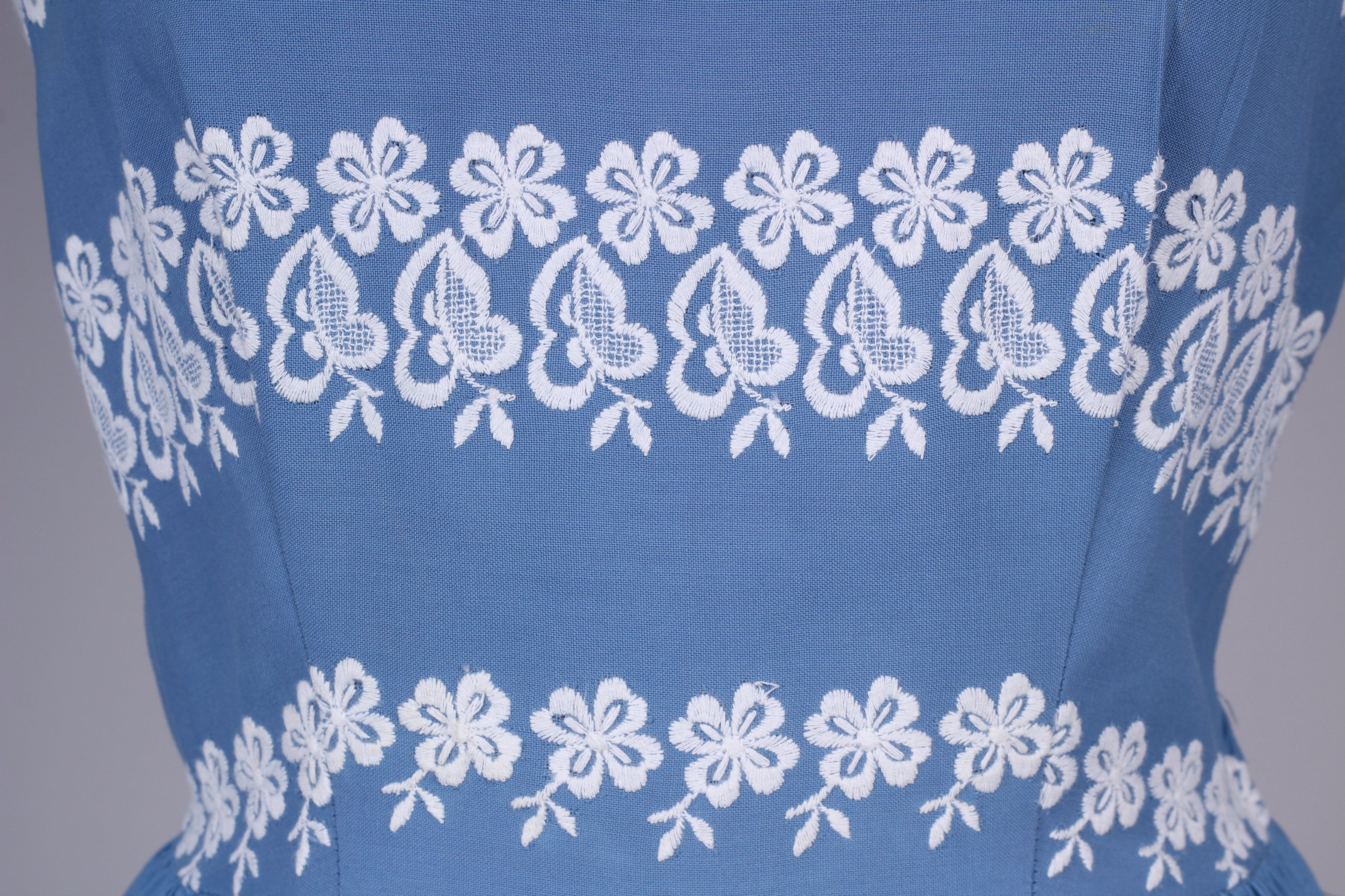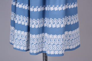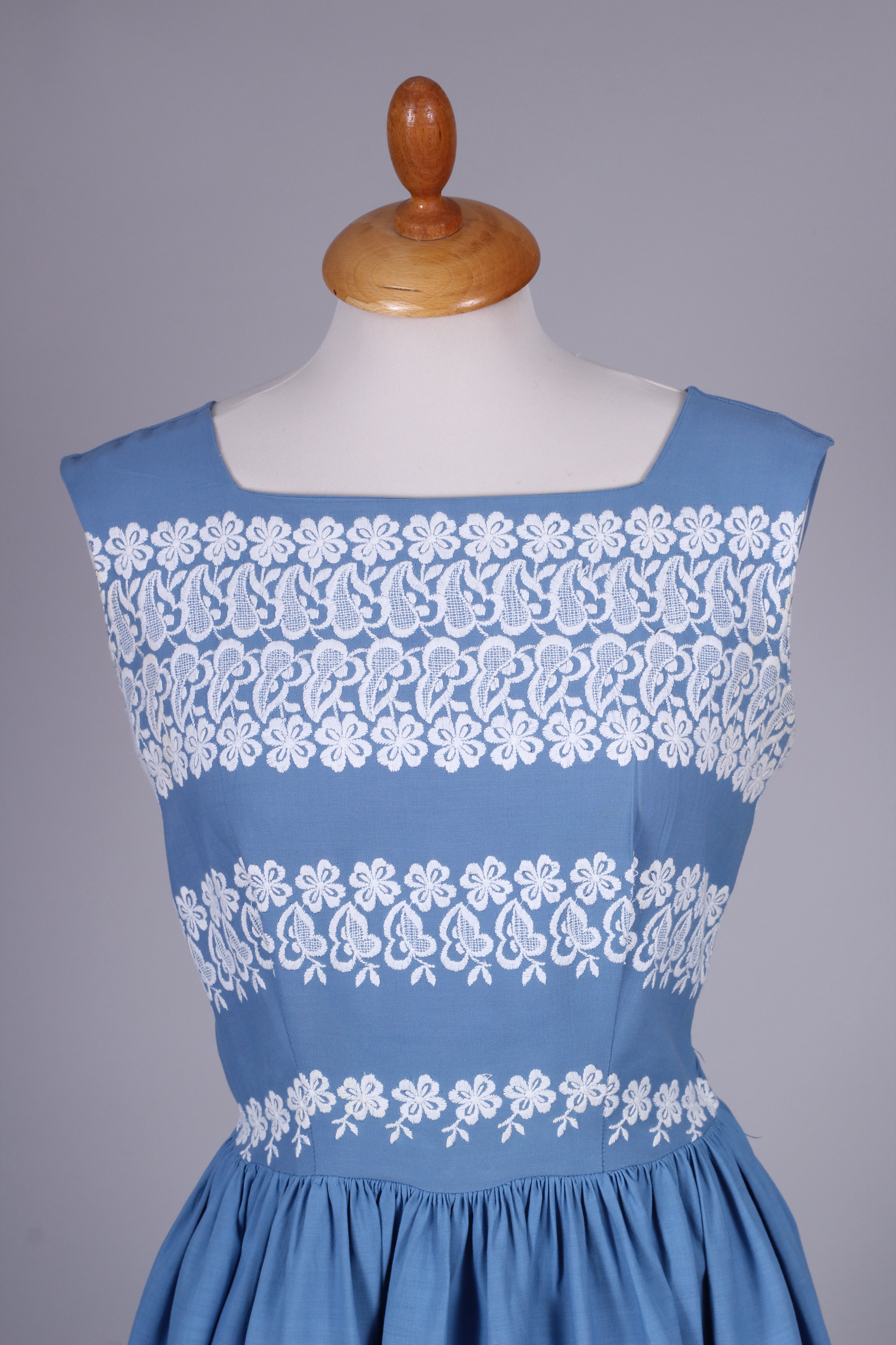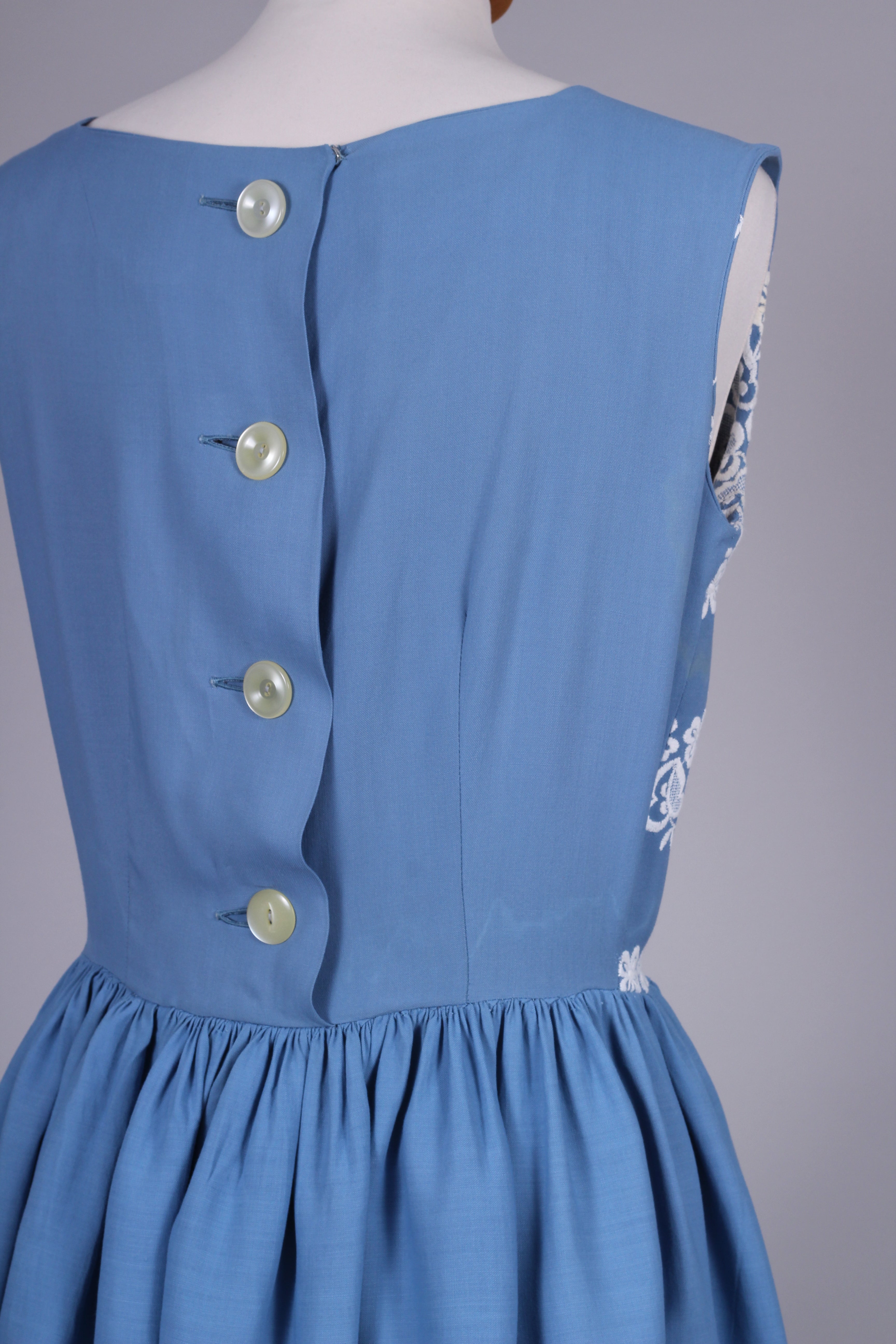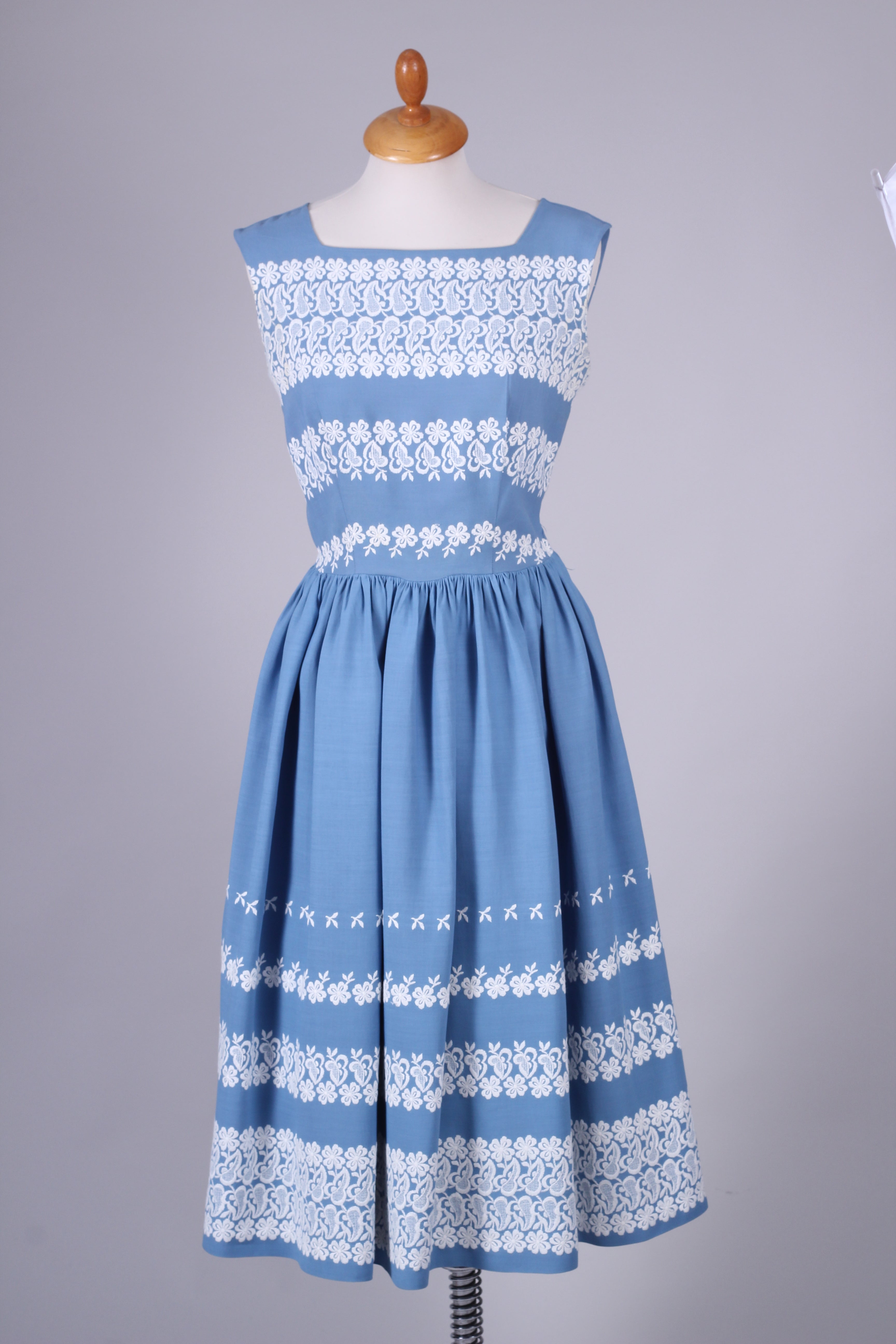 Utrolig fin støvet blå vintage sommerkjole fra 50'erne syet i viskose med hvidt mønster. Kjolen er skåret ved taljen med rynket skørt, har lynlås i siden og knapper bagpå samt feminin 50'er halsudskæring.