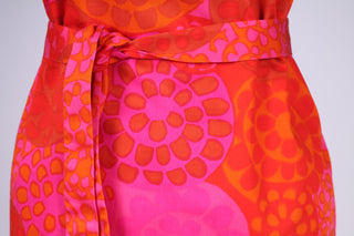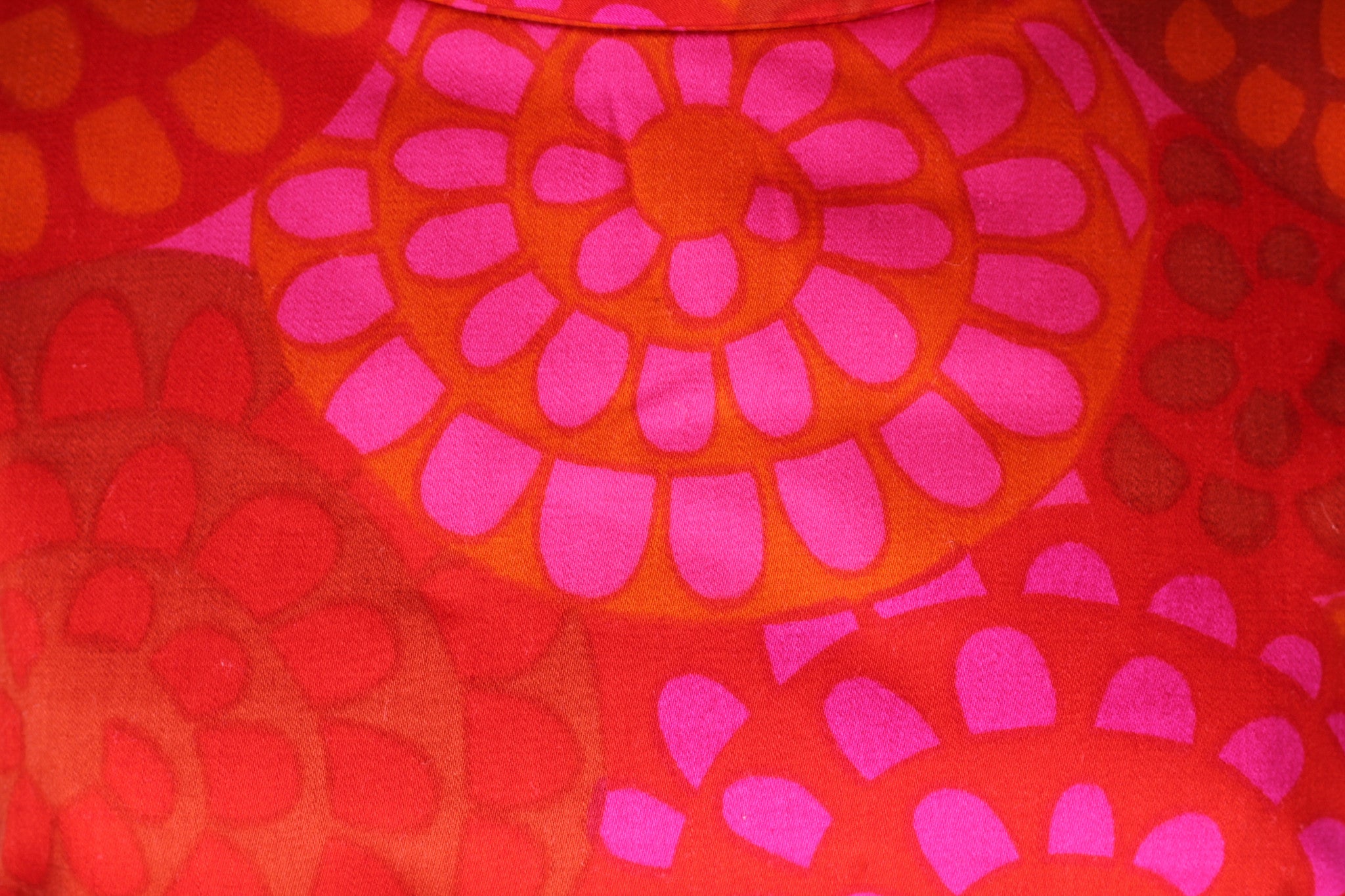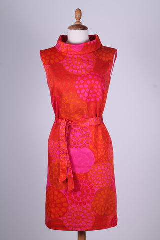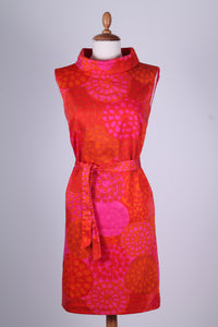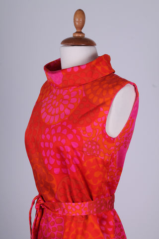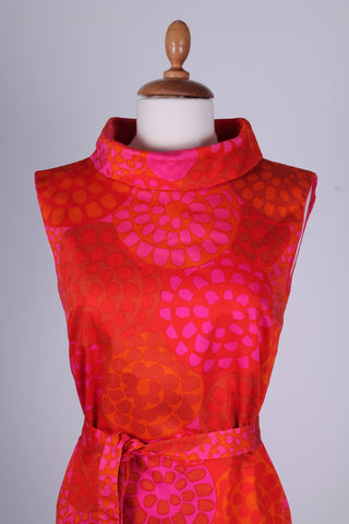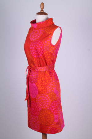 Enkel vintage sommerkjole fra 1960'erne syet i bomuldsstof med flot grafisk print (Marimekko, Design Marjatta Metsovaara) i pink og orange farver. Kjolen er helt enkel uden ærmer, har "turtle neck", går "lige op og ned" og har bindebånd ved taljen. Der er ingen lynlås, så kjolen skal trækkes ned over hovedet.