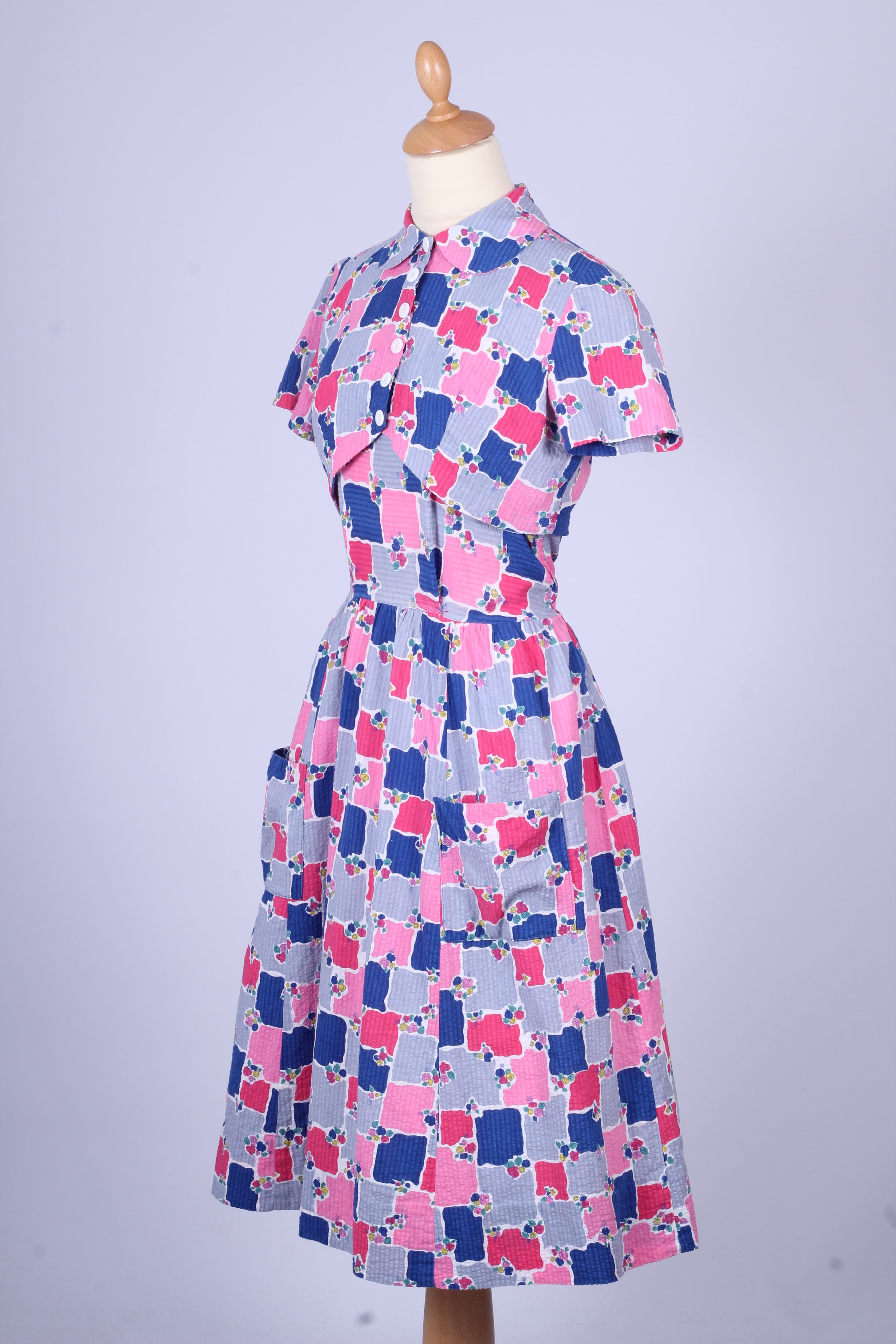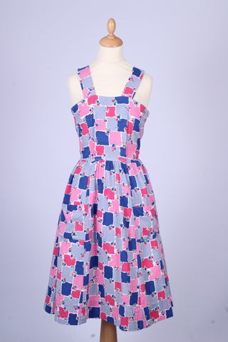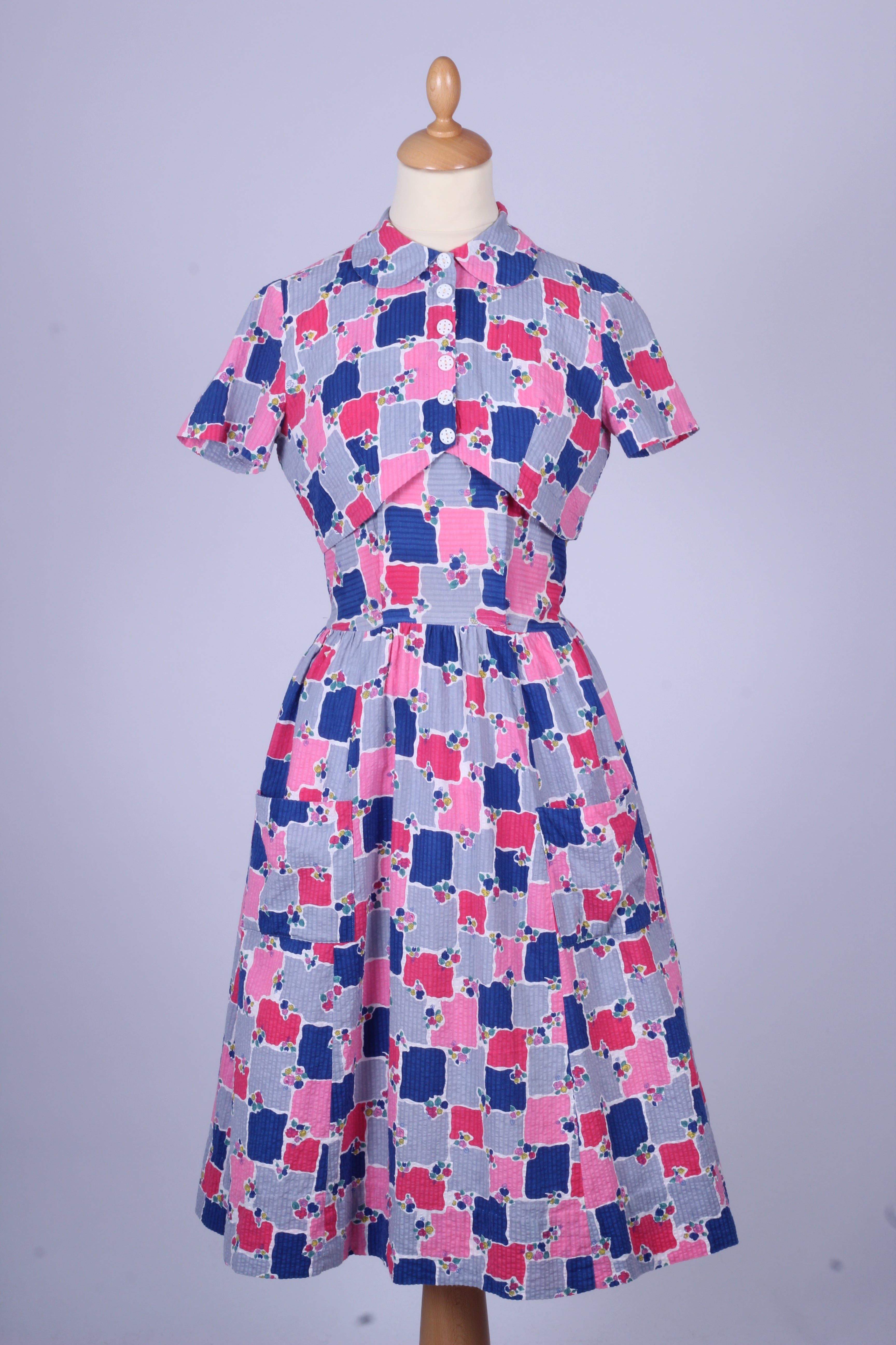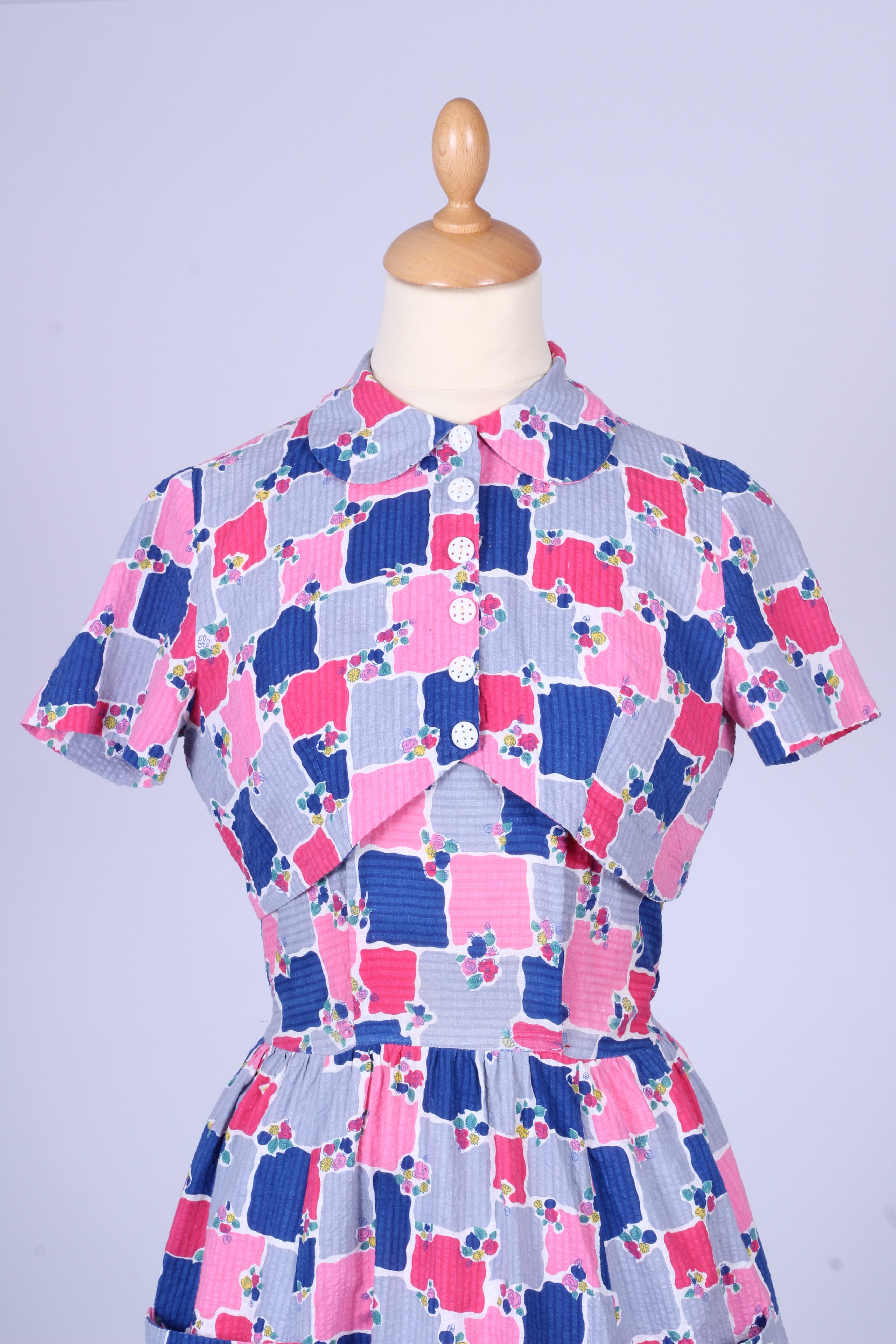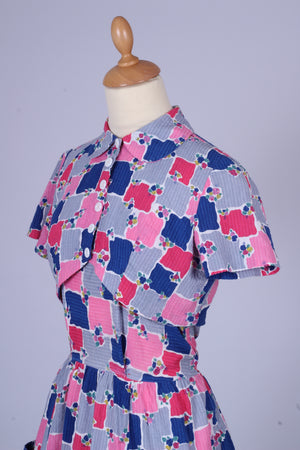 Sød teenage pige vintage sommerkjole fra 1950'erne med tilhørende bolero syet i bæk og bølge (bomuld) med print. Kjolen har brede skulderstropper, er skåret ved taljen. Boleroen har Peter Pan krave, pynteknapper og lukkes med tryklåse.