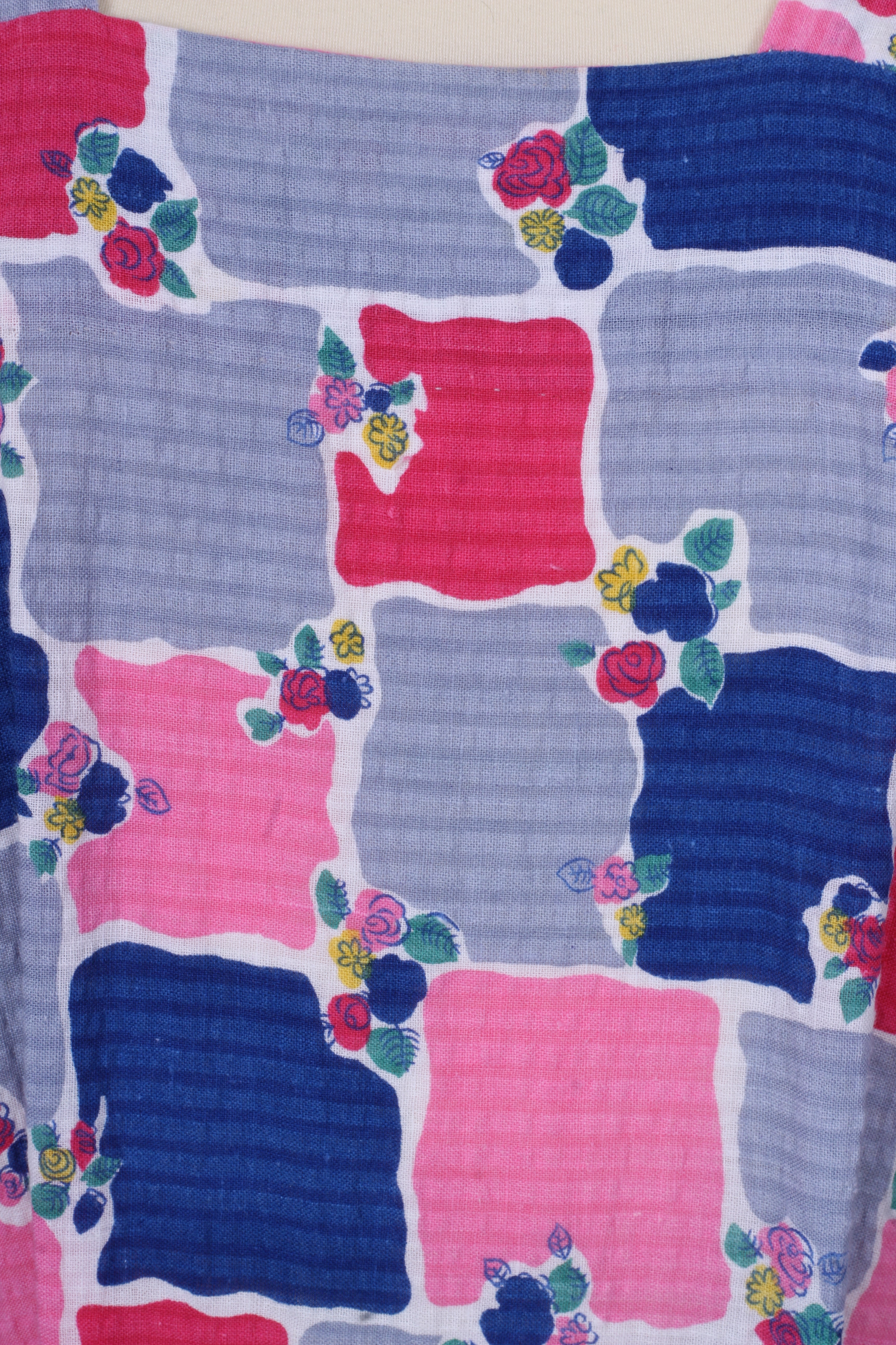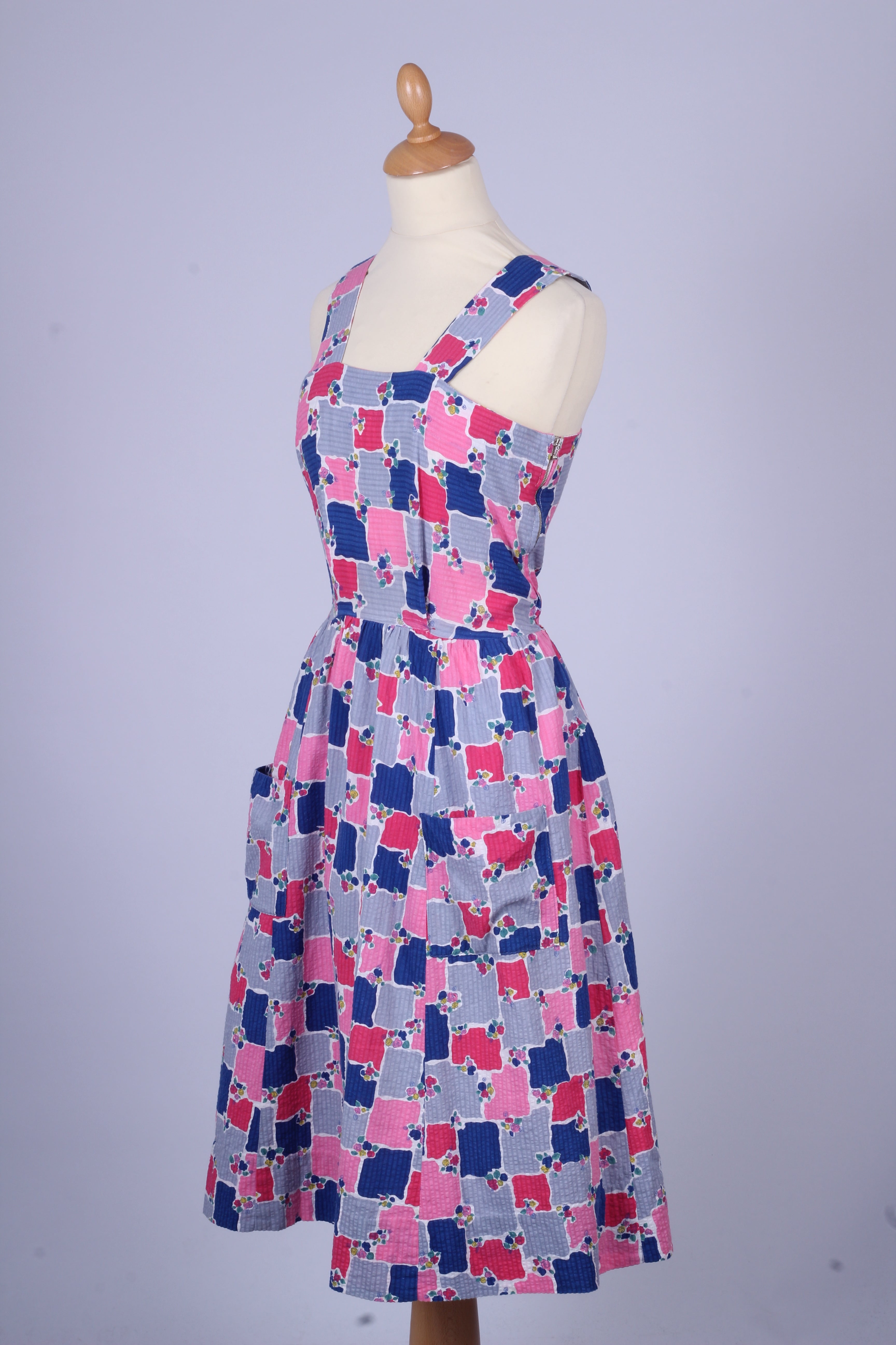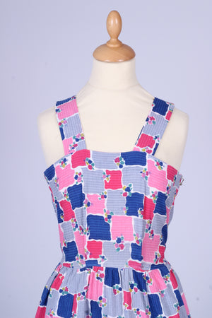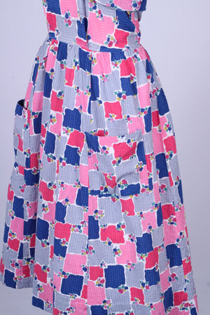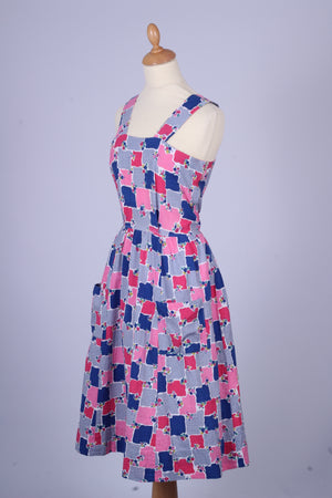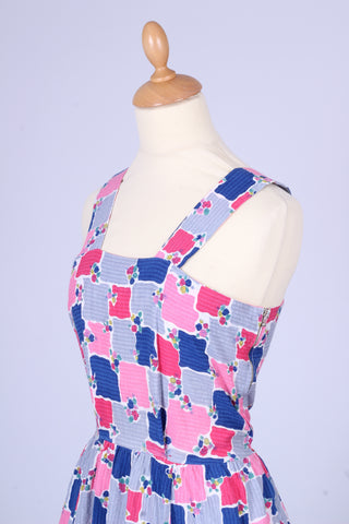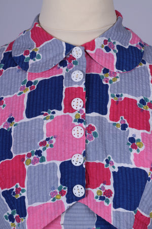Sød teenage pige vintage sommerkjole fra 1950'erne med tilhørende bolero syet i bæk og bølge (bomuld) med print. Kjolen har brede skulderstropper, er skåret ved taljen. Boleroen har Peter Pan krave, pynteknapper og lukkes med tryklåse.