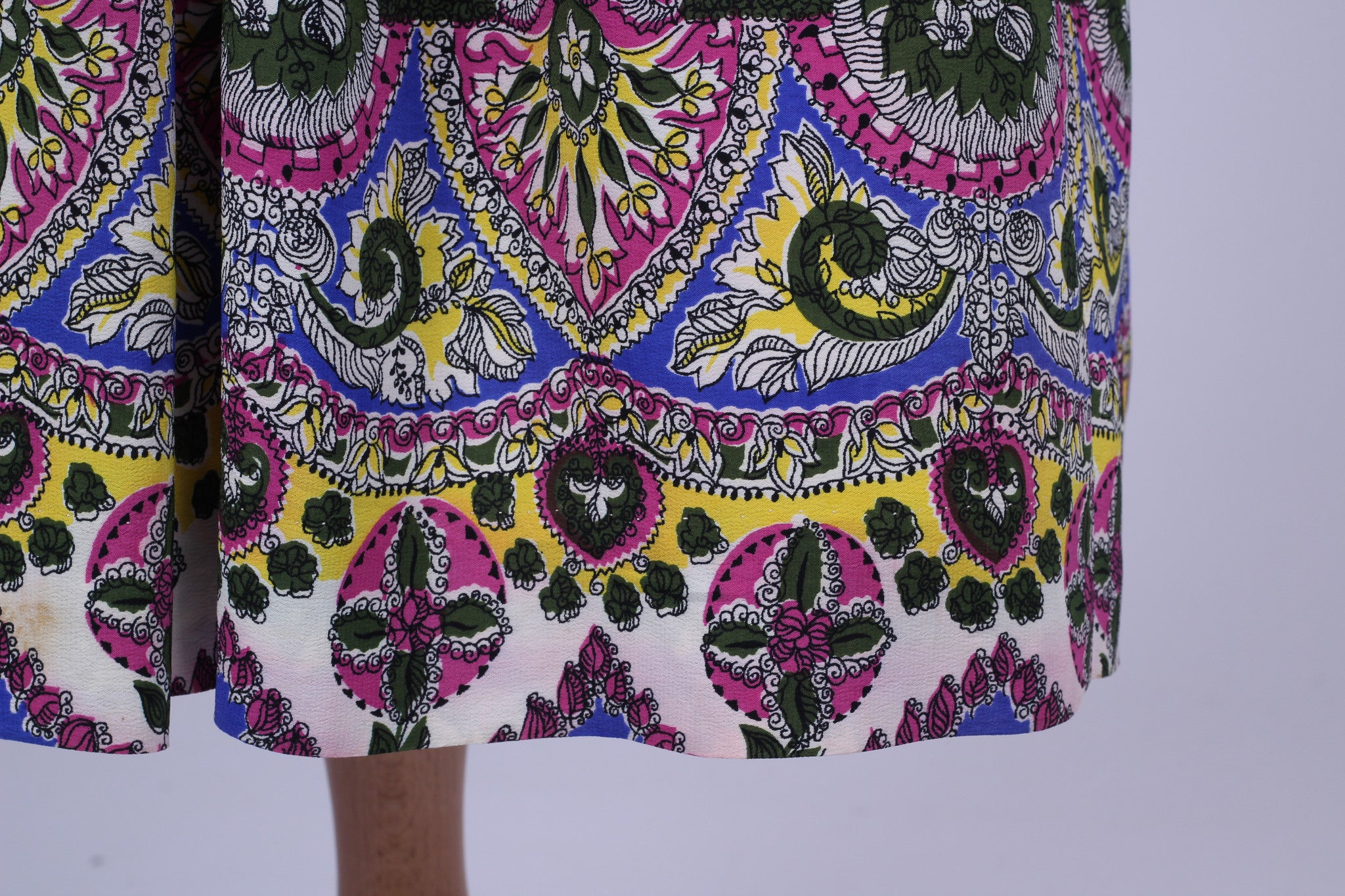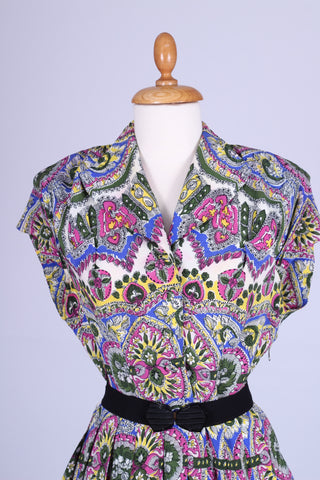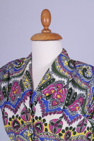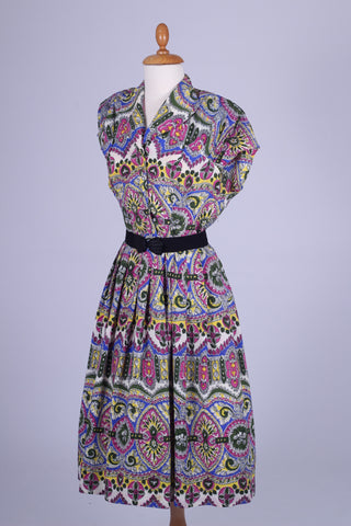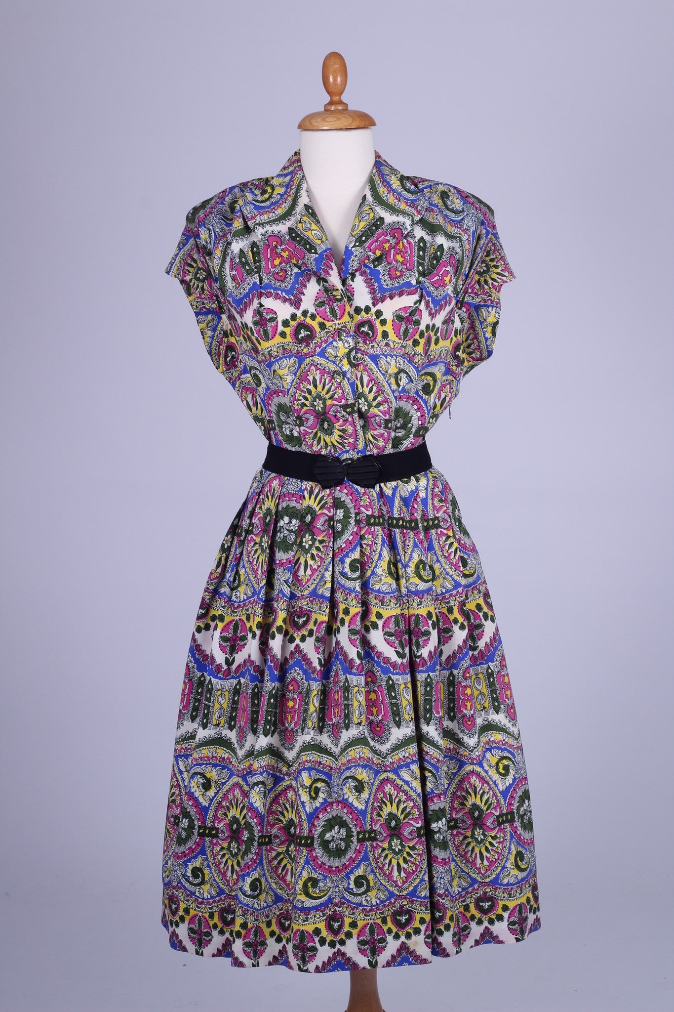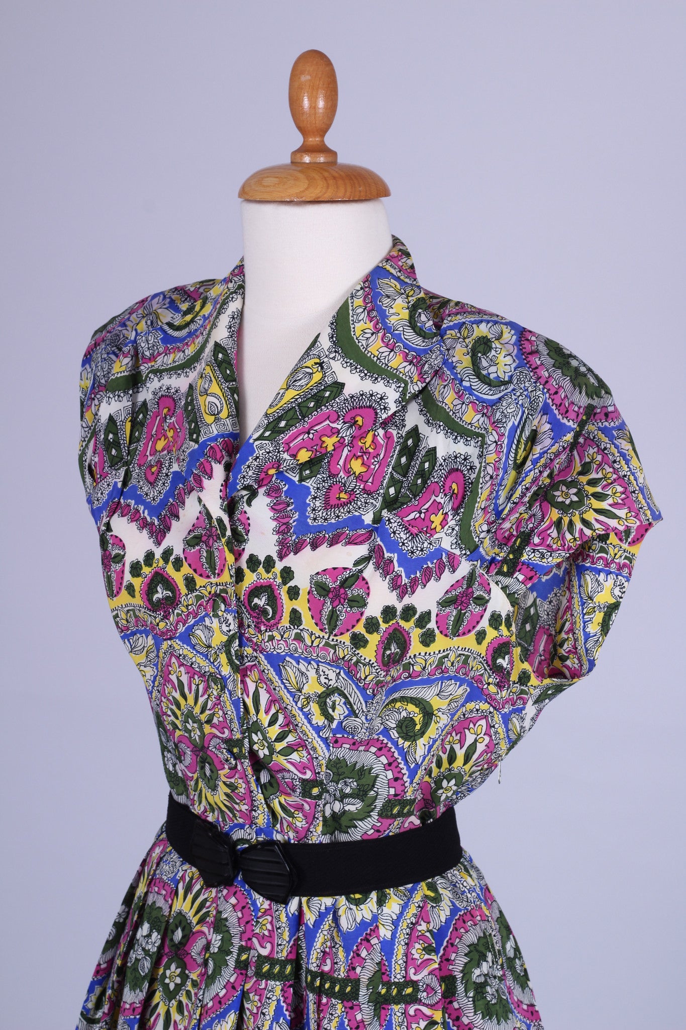 Sød vintage sommerkjole fra slut. 1940'erne syet i tyndt rayon med det smukkeste farvestrålende print. Kjolen har markerede skuldre med skulderpuder, har kimonoærmer, er skåret ved taljen, har skørt med brede læg hele vejen rundt og lukkes i siden med lynlås.