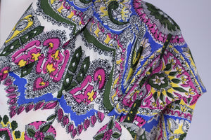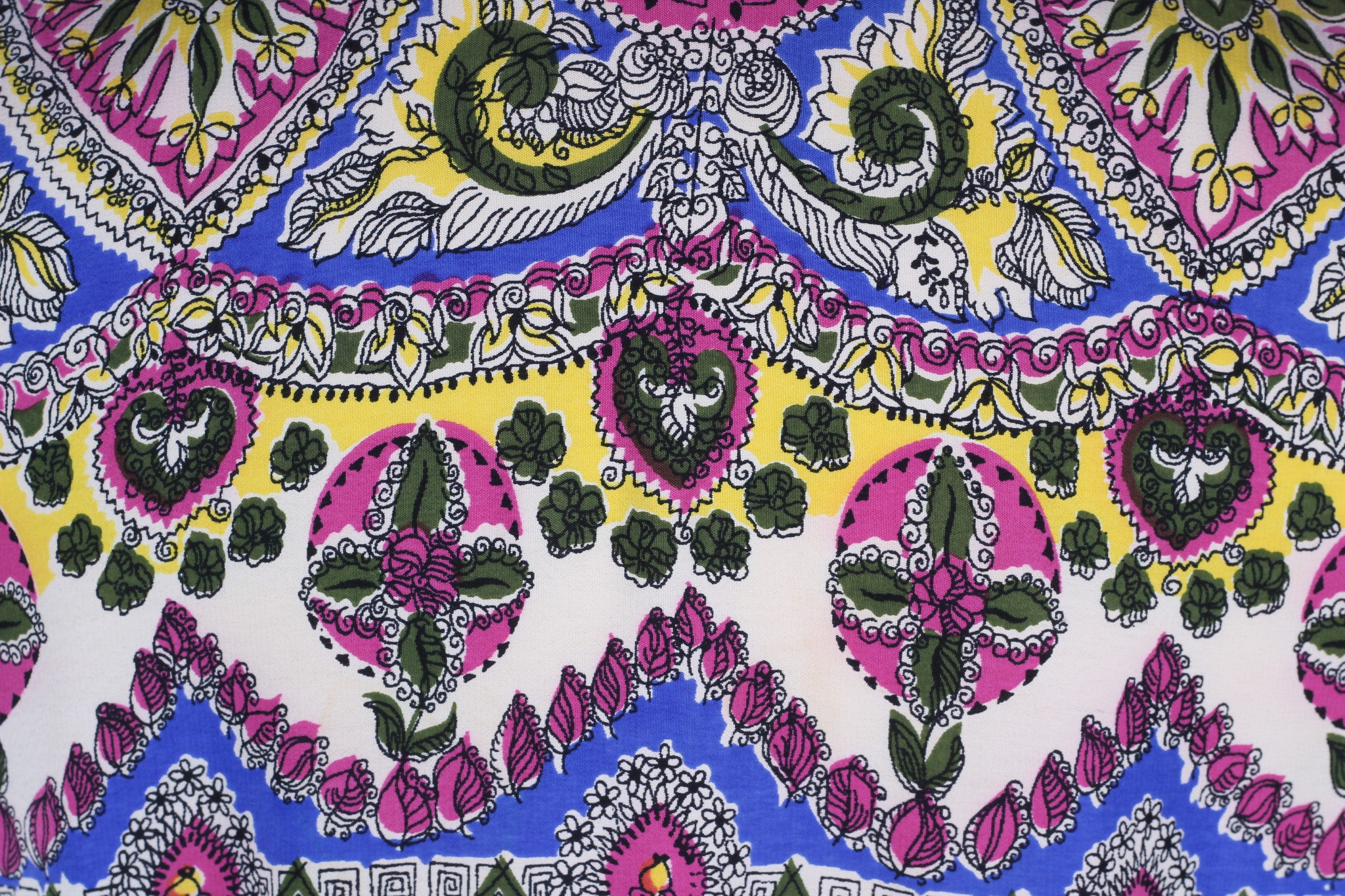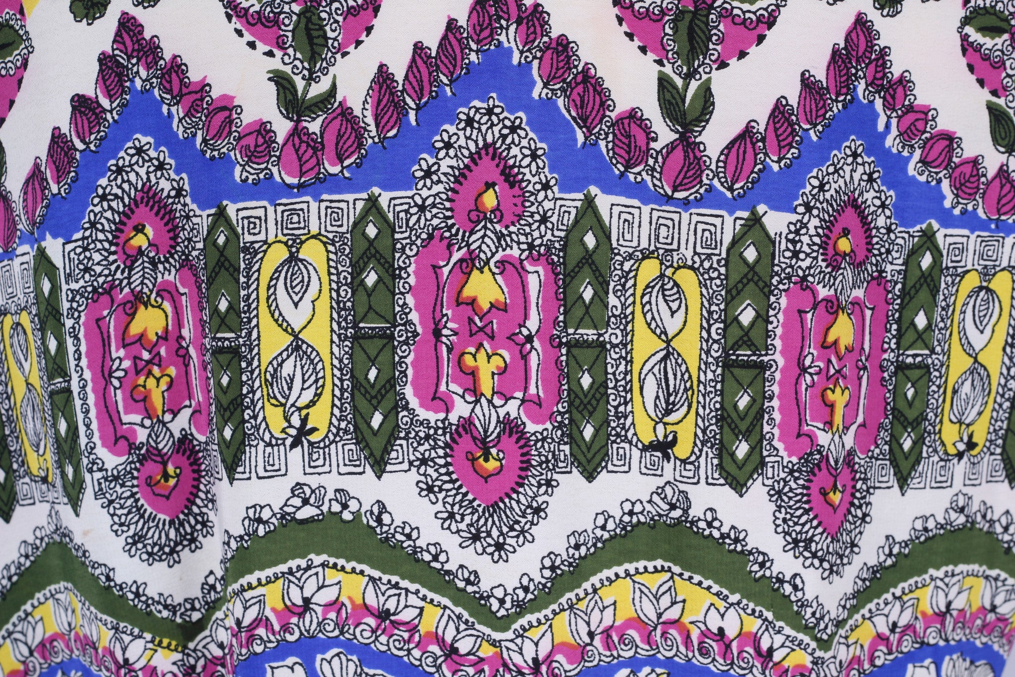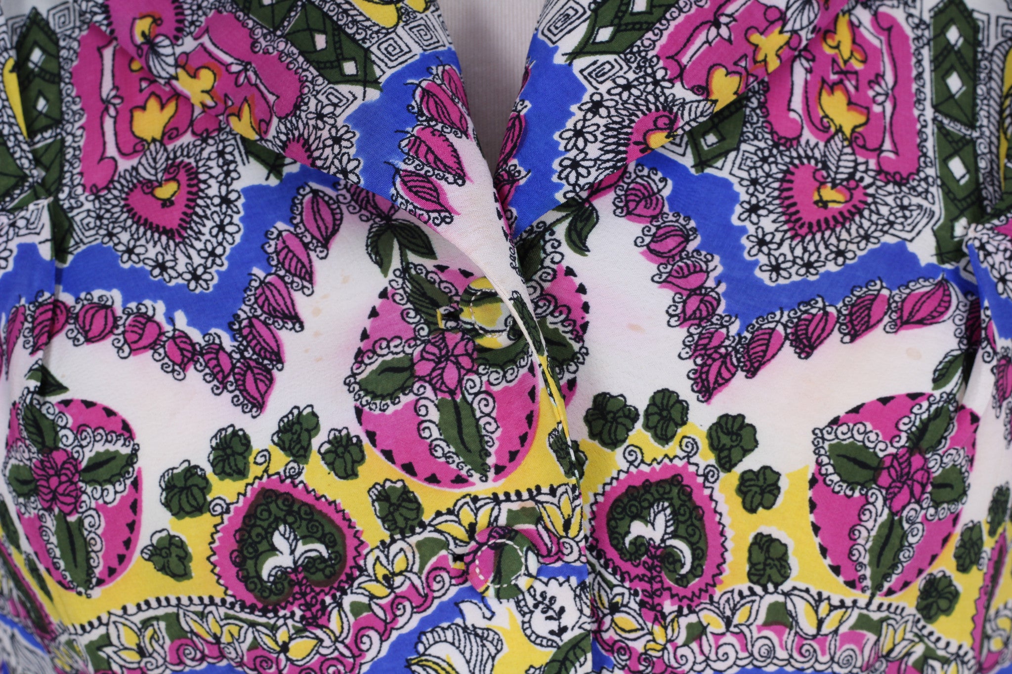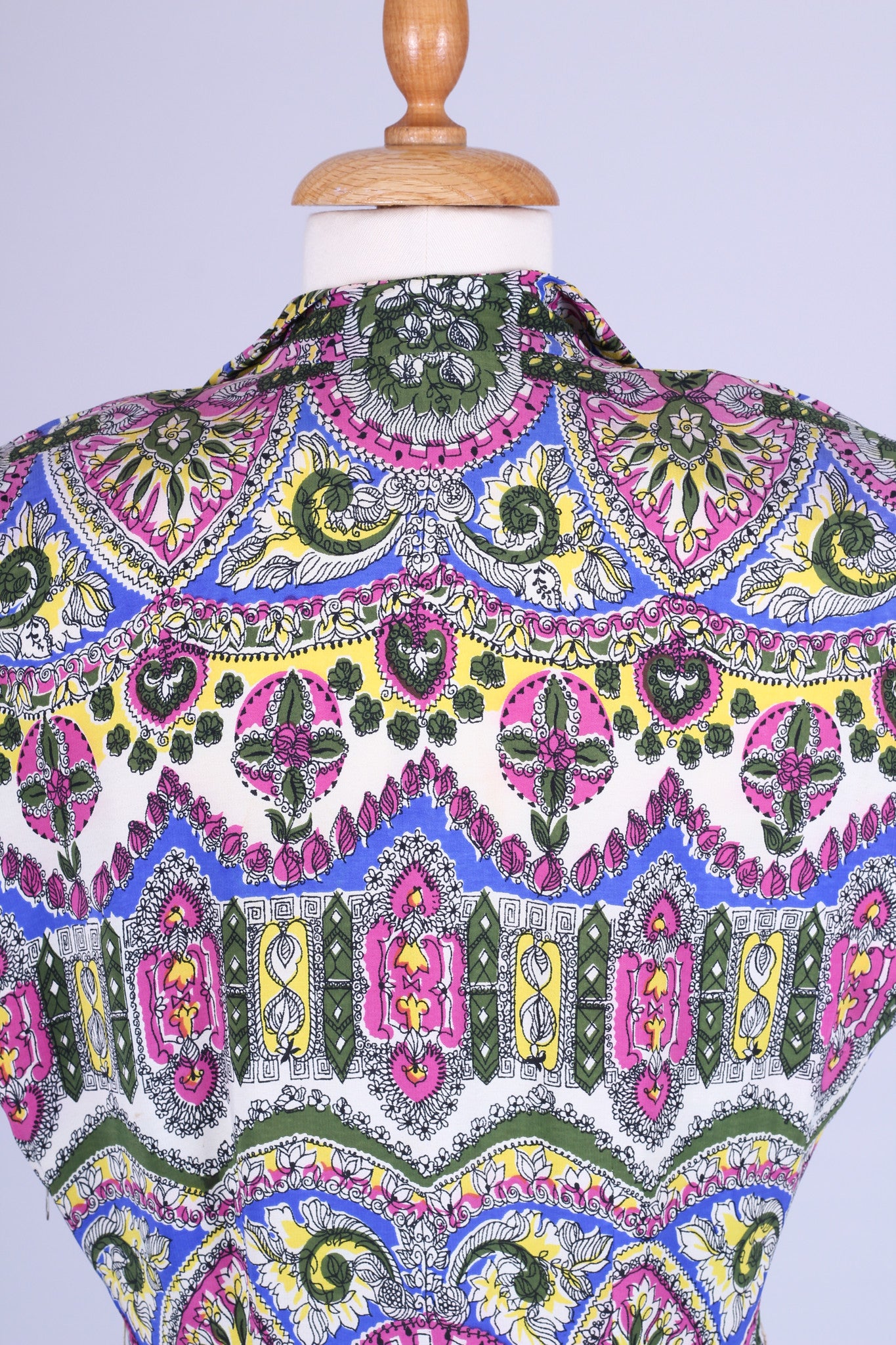 Sød vintage sommerkjole fra slut. 1940'erne syet i tyndt rayon med det smukkeste farvestrålende print. Kjolen har markerede skuldre med skulderpuder, har kimonoærmer, er skåret ved taljen, har skørt med brede læg hele vejen rundt og lukkes i siden med lynlås.