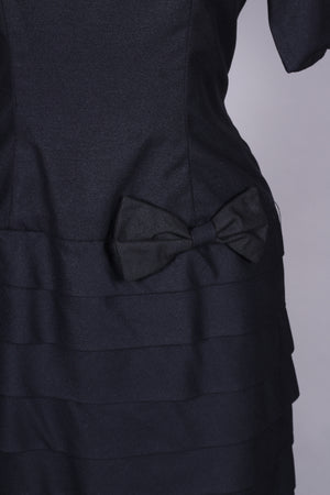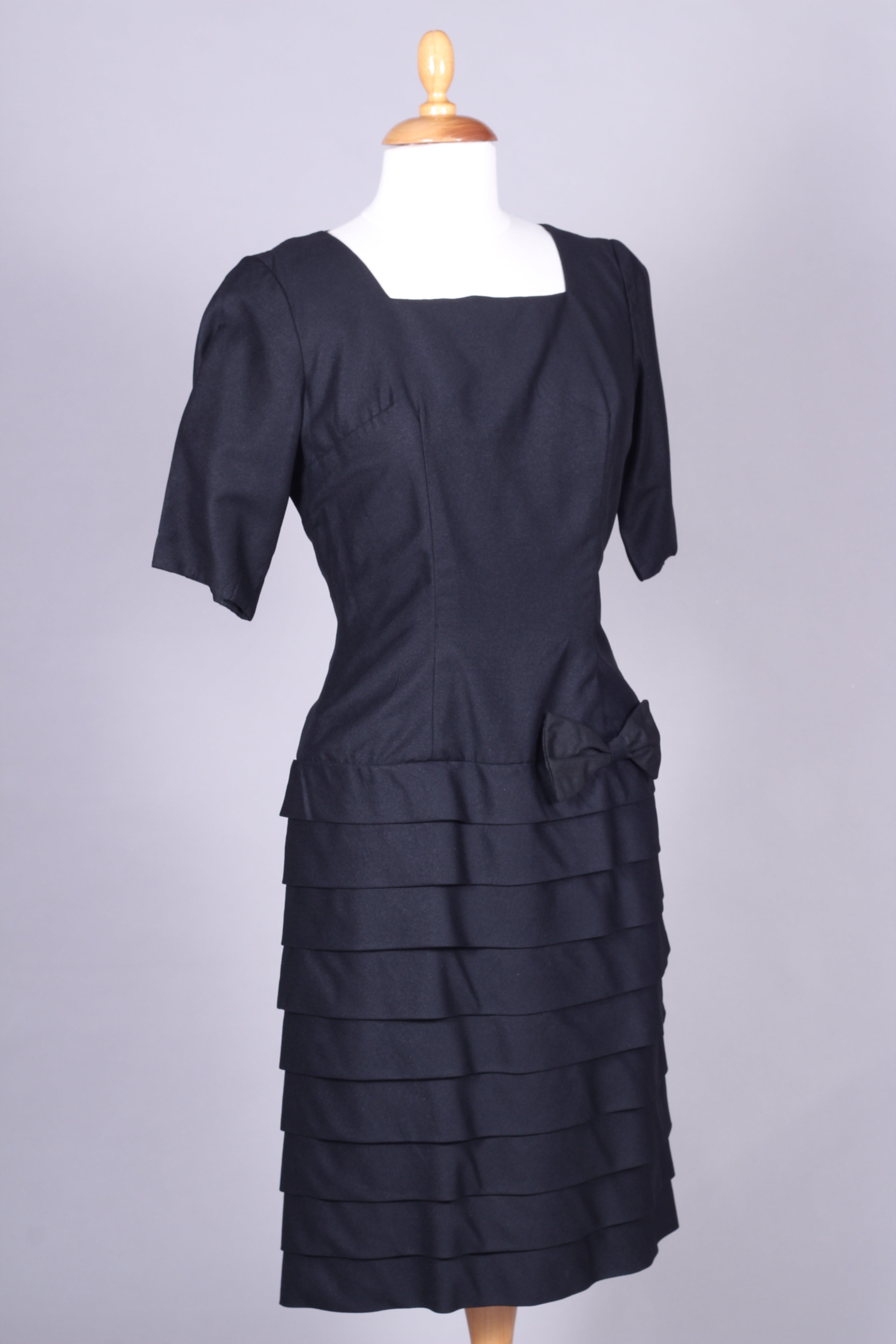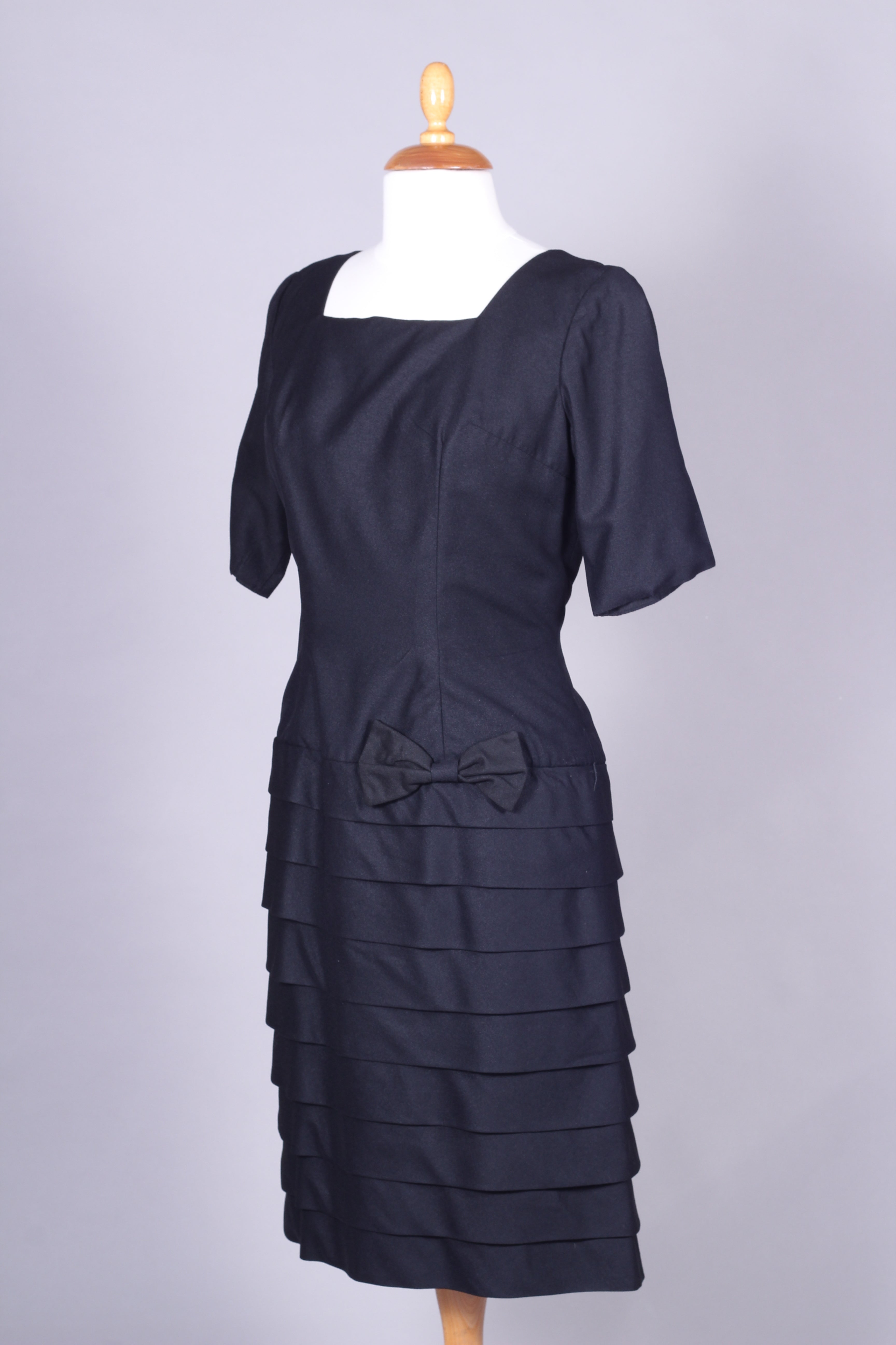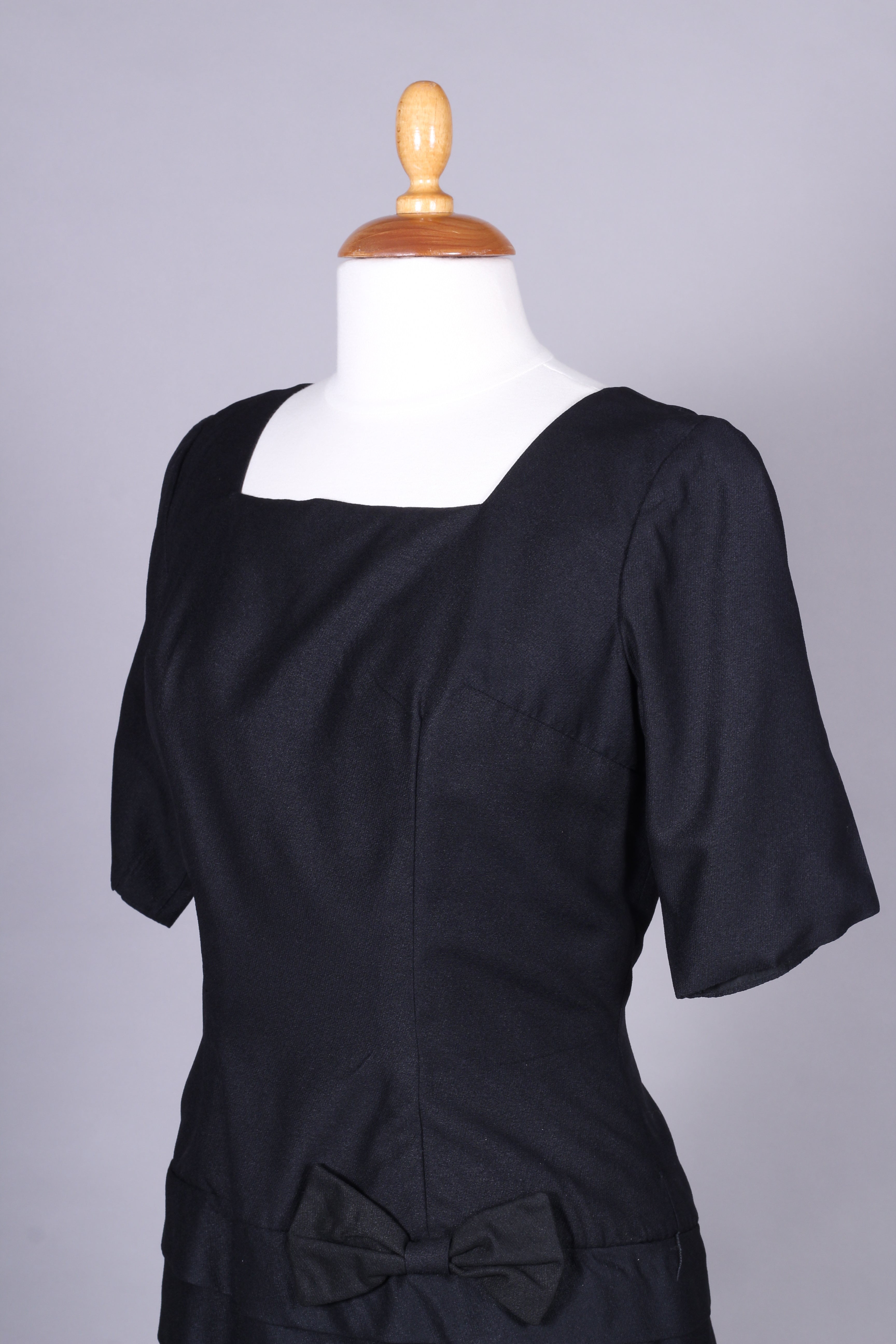 Sort figursyet cocktailkjole fra beg. af 1960'erne. Kjolen er figursyet, har små flæser på skørtet samt sløjfe og halv lange korte ærmer.