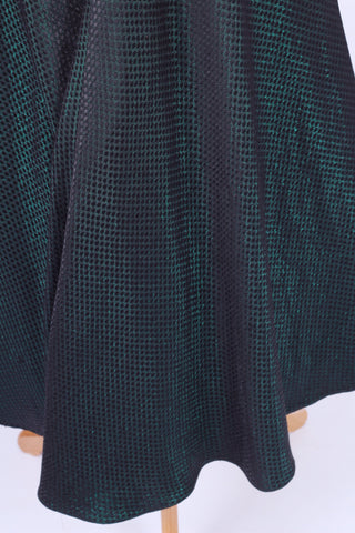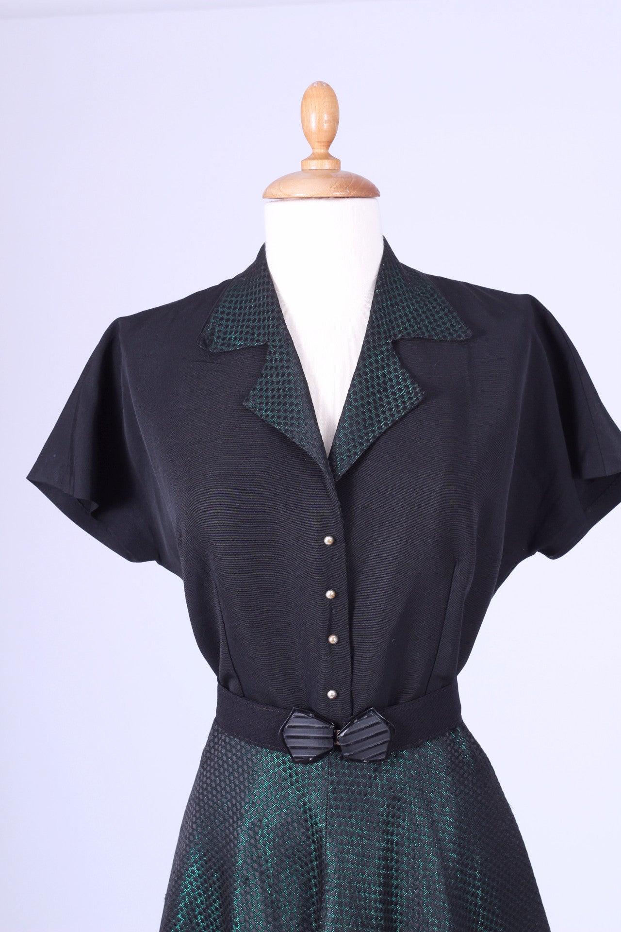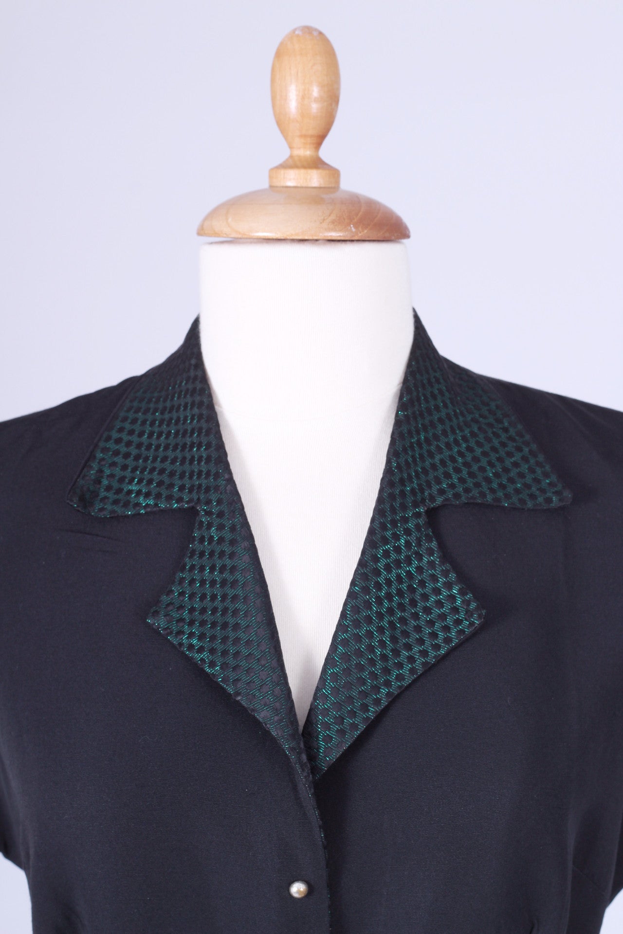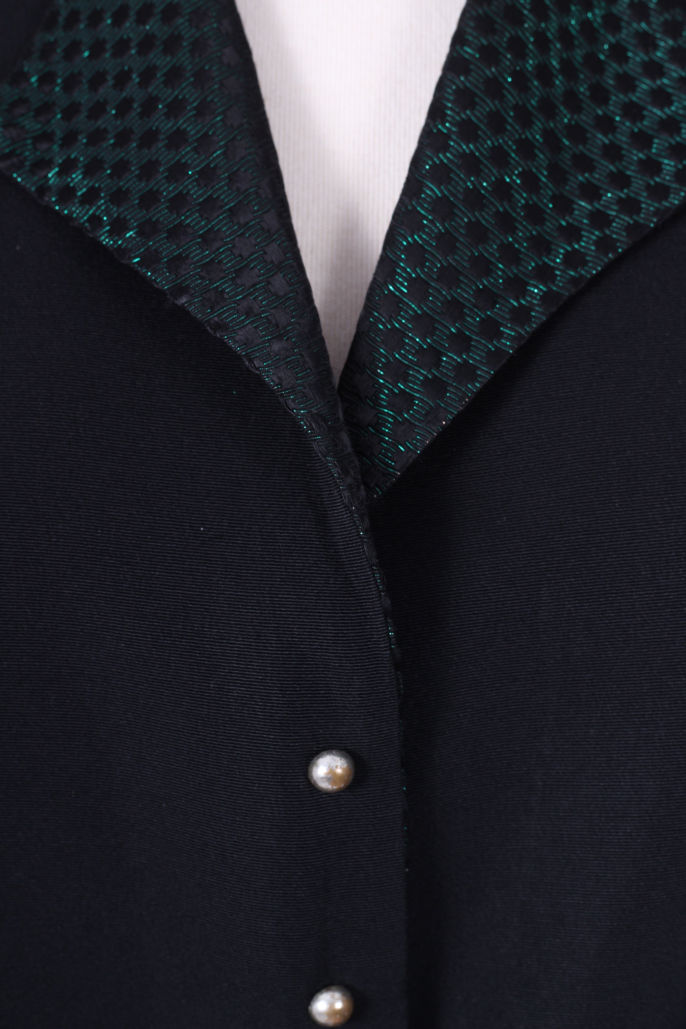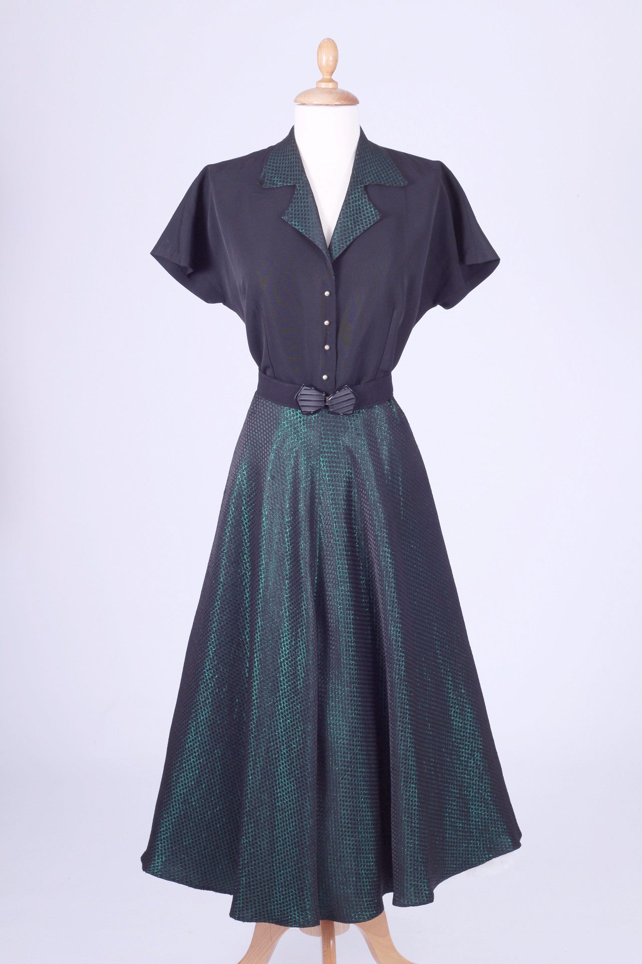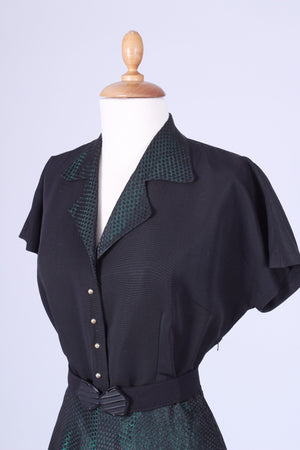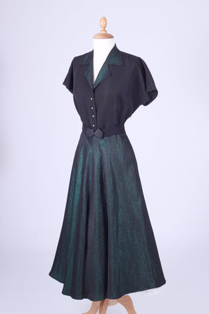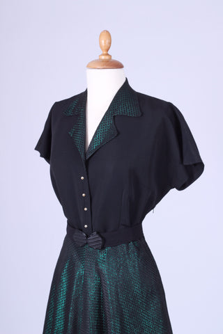 Fin vintage selskabskjole / festkjole fra slut. 1940'erne / beg. af 1950'erne syet i sort silkerebs og grøn blankt brokadestof. Kjolen har kimono ærmer, krave, lukkes med tryklåse og pynteknapper ned fortil, er skåret ved taljen og har skørt med lidt vidde.