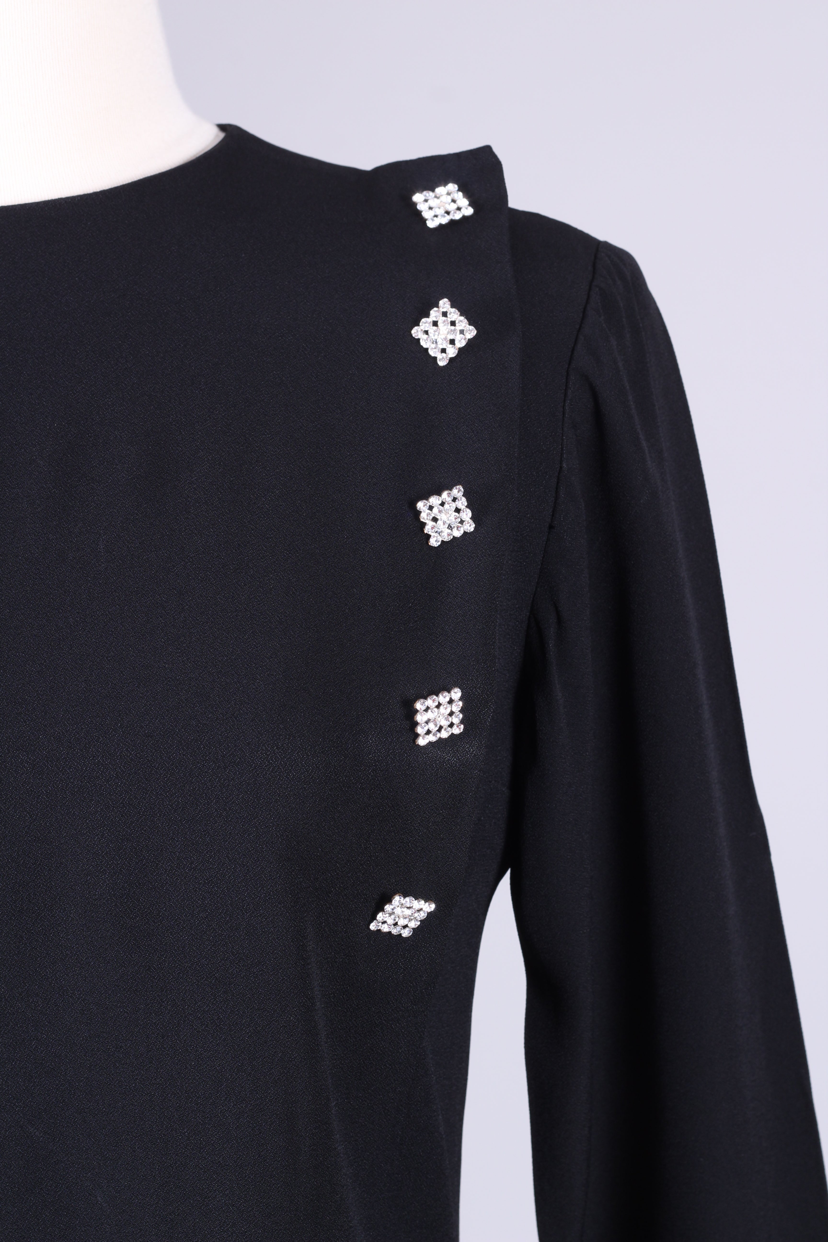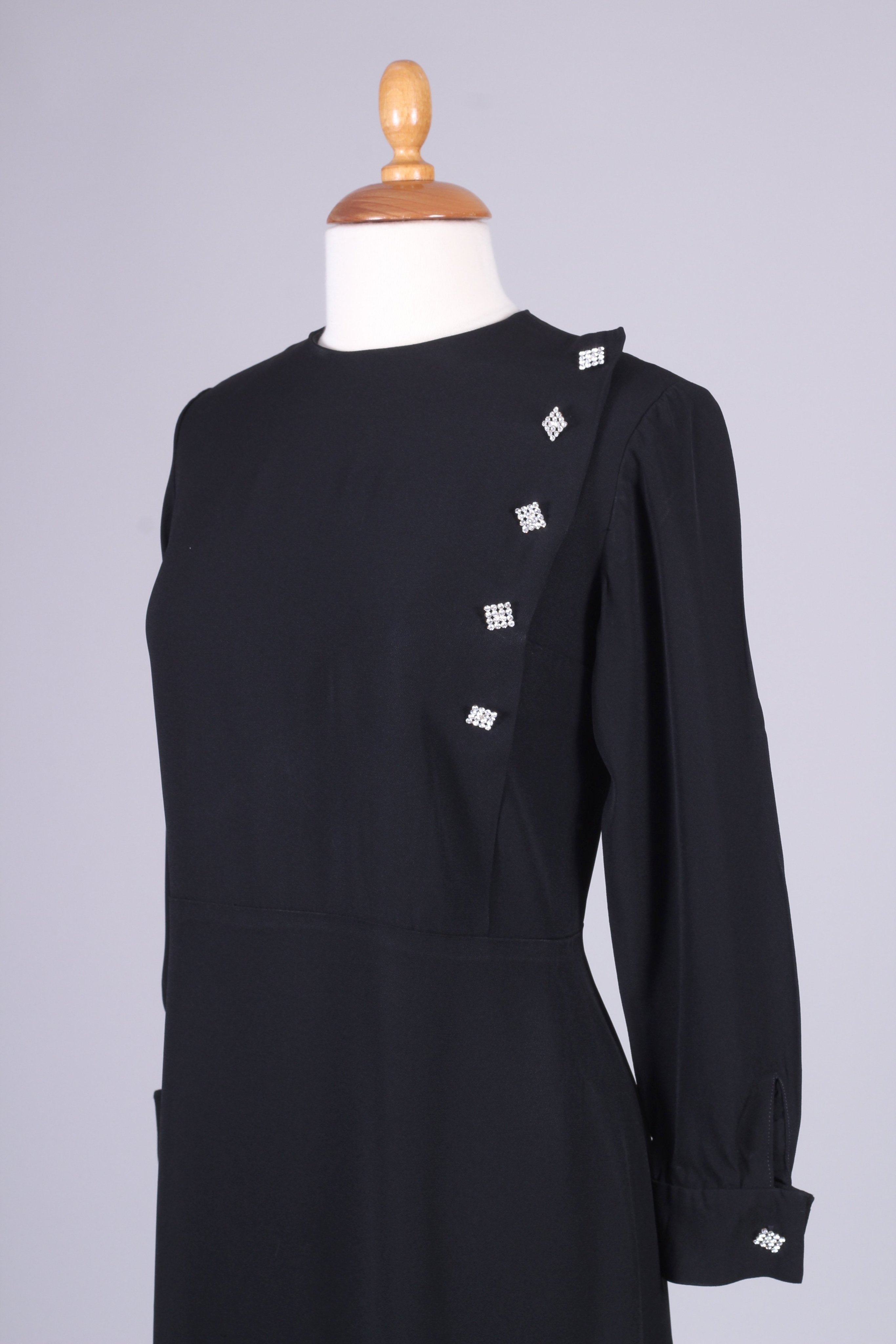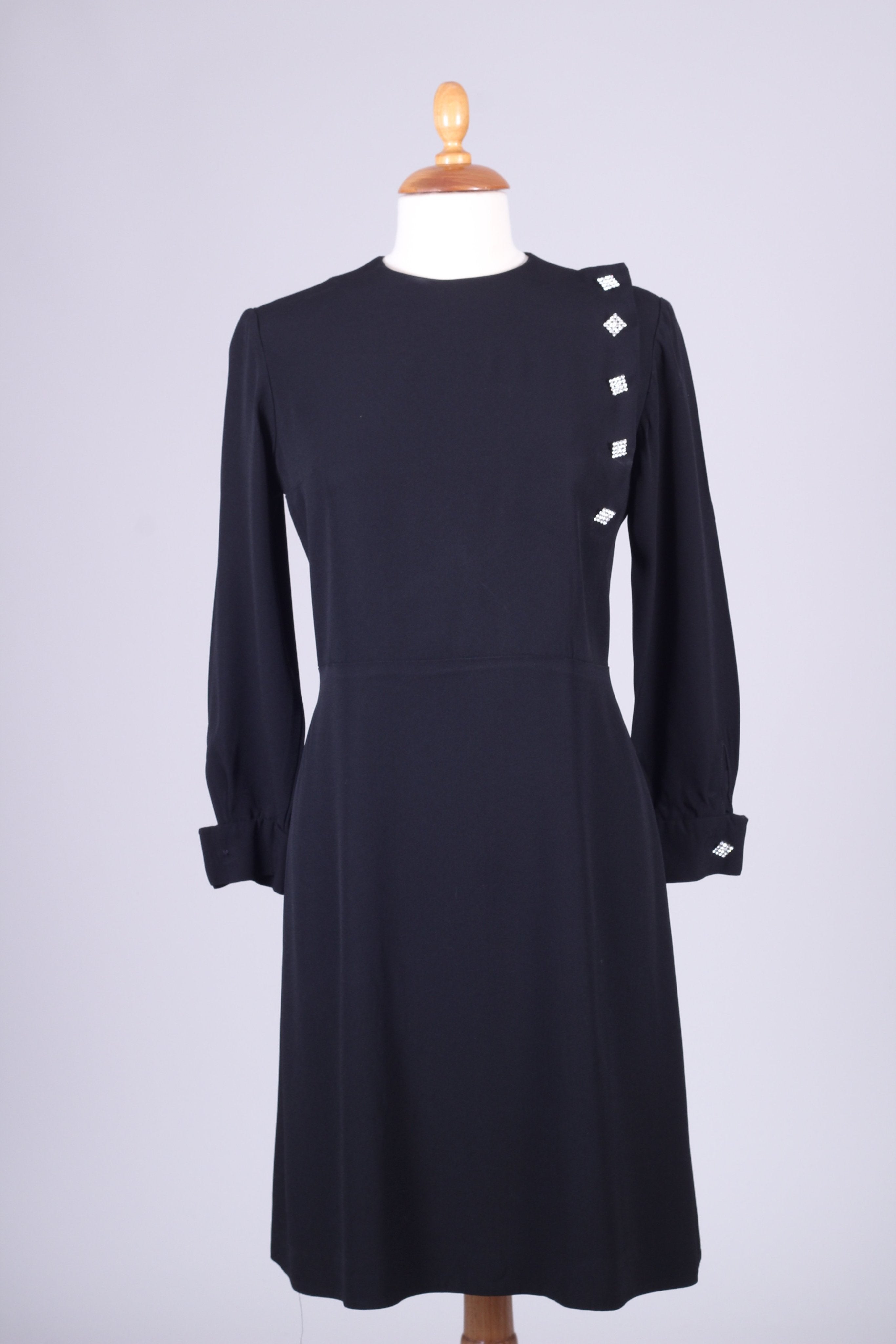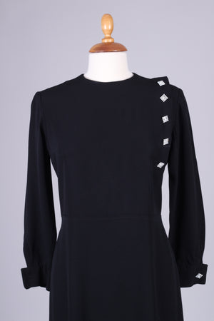 Sort vintagekjole fra Paris, 1960'erne med lange ærmer, manchetter og de fineste similibesatte pynteknapper. Kjolen lukkes i ryggen med lynlås. Viskose el. silke.