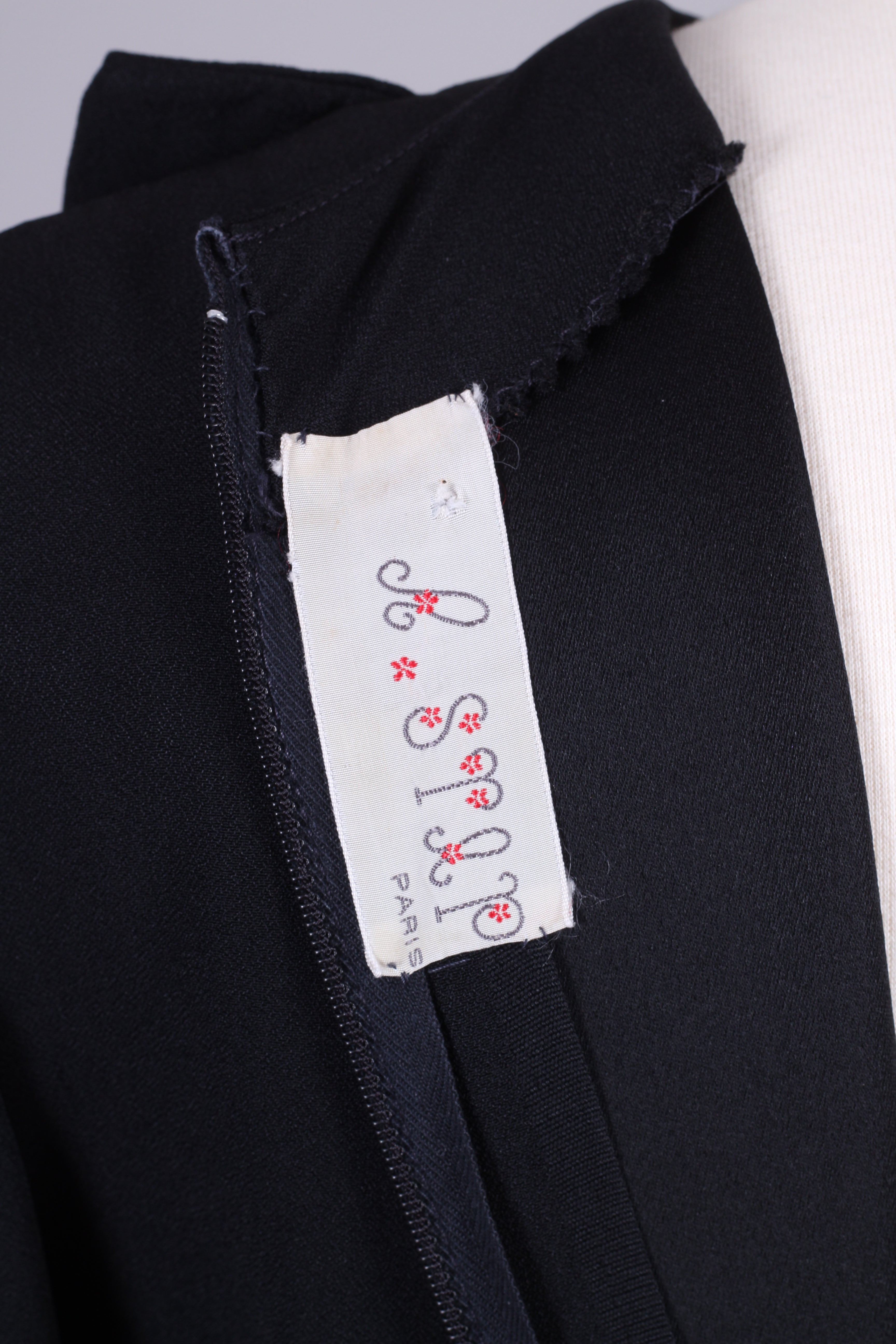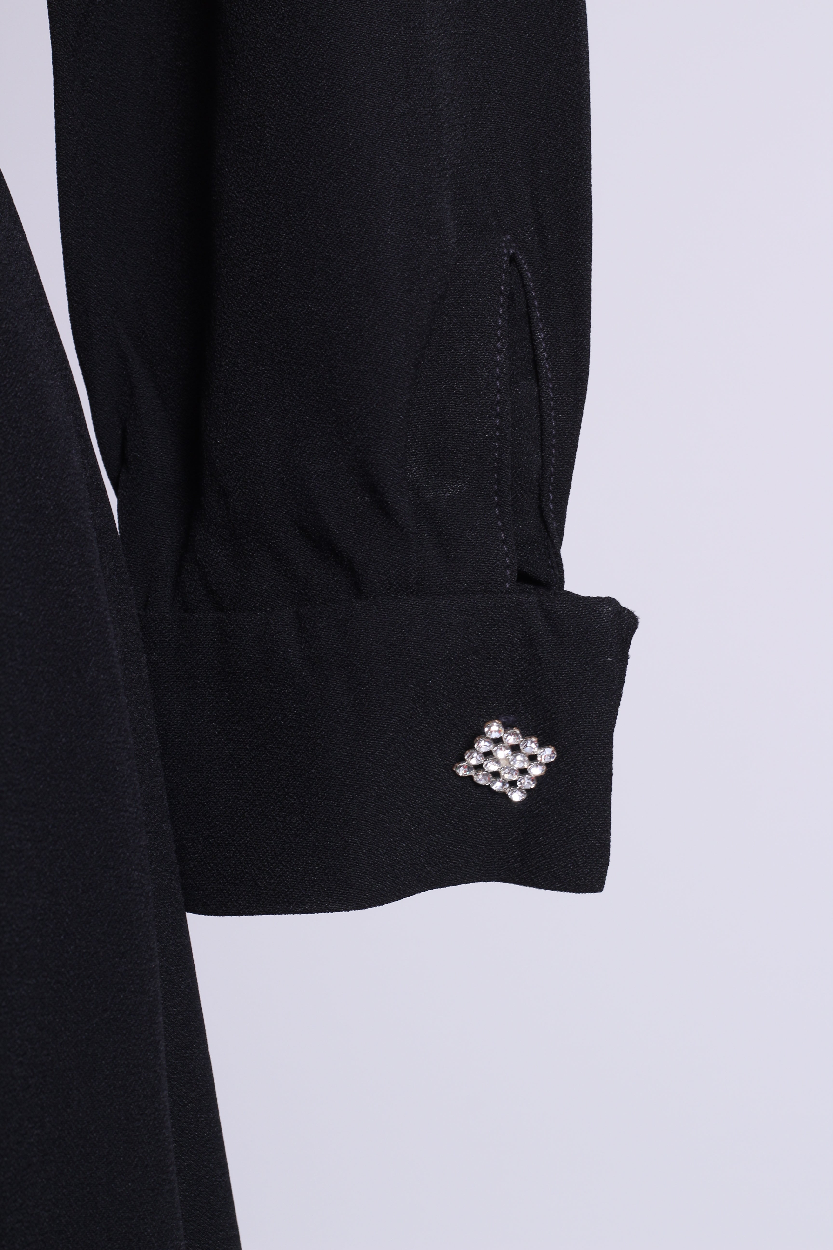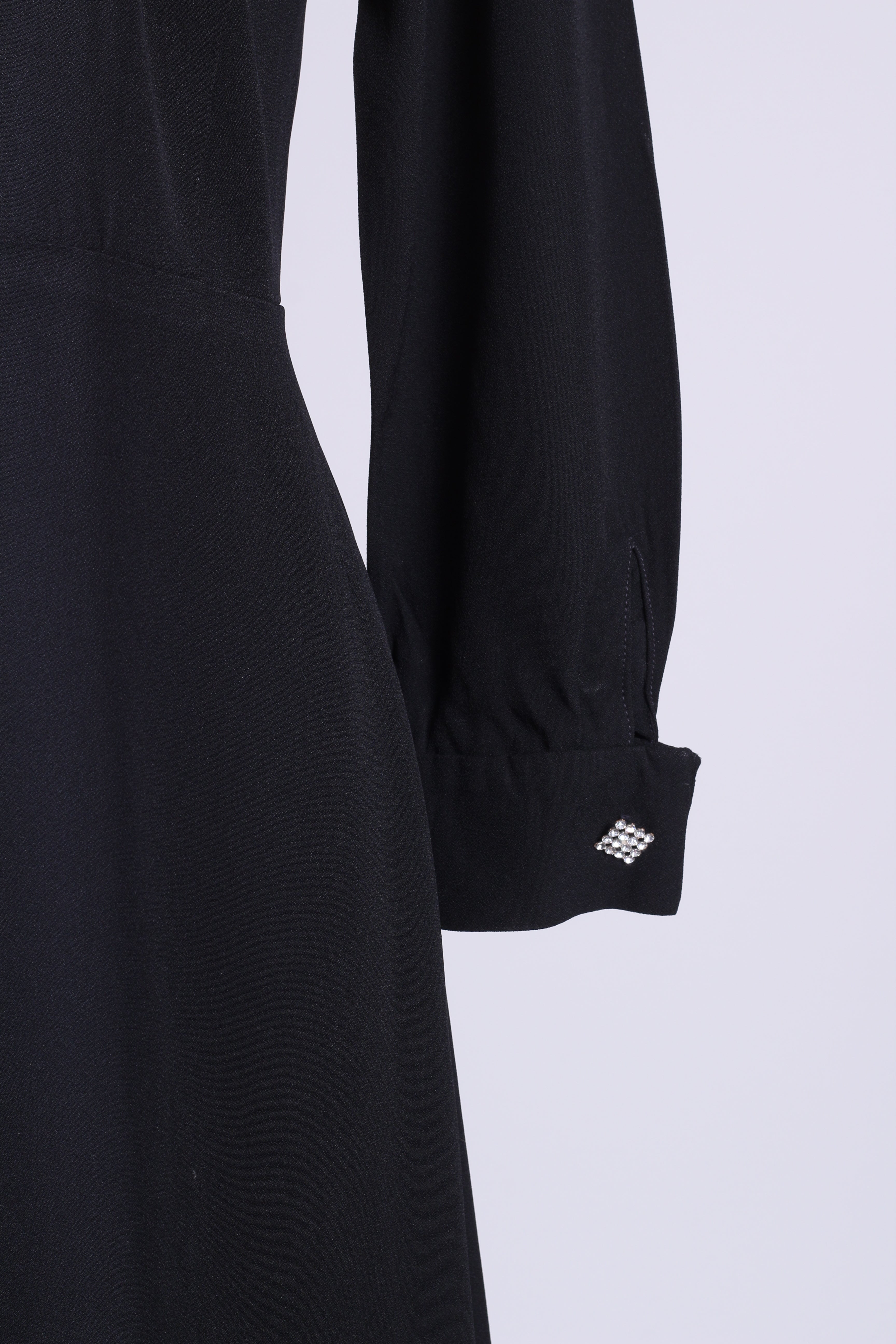 Sort vintagekjole fra Paris, 1960'erne med lange ærmer, manchetter og de fineste similibesatte pynteknapper. Kjolen lukkes i ryggen med lynlås. Viskose el. silke.